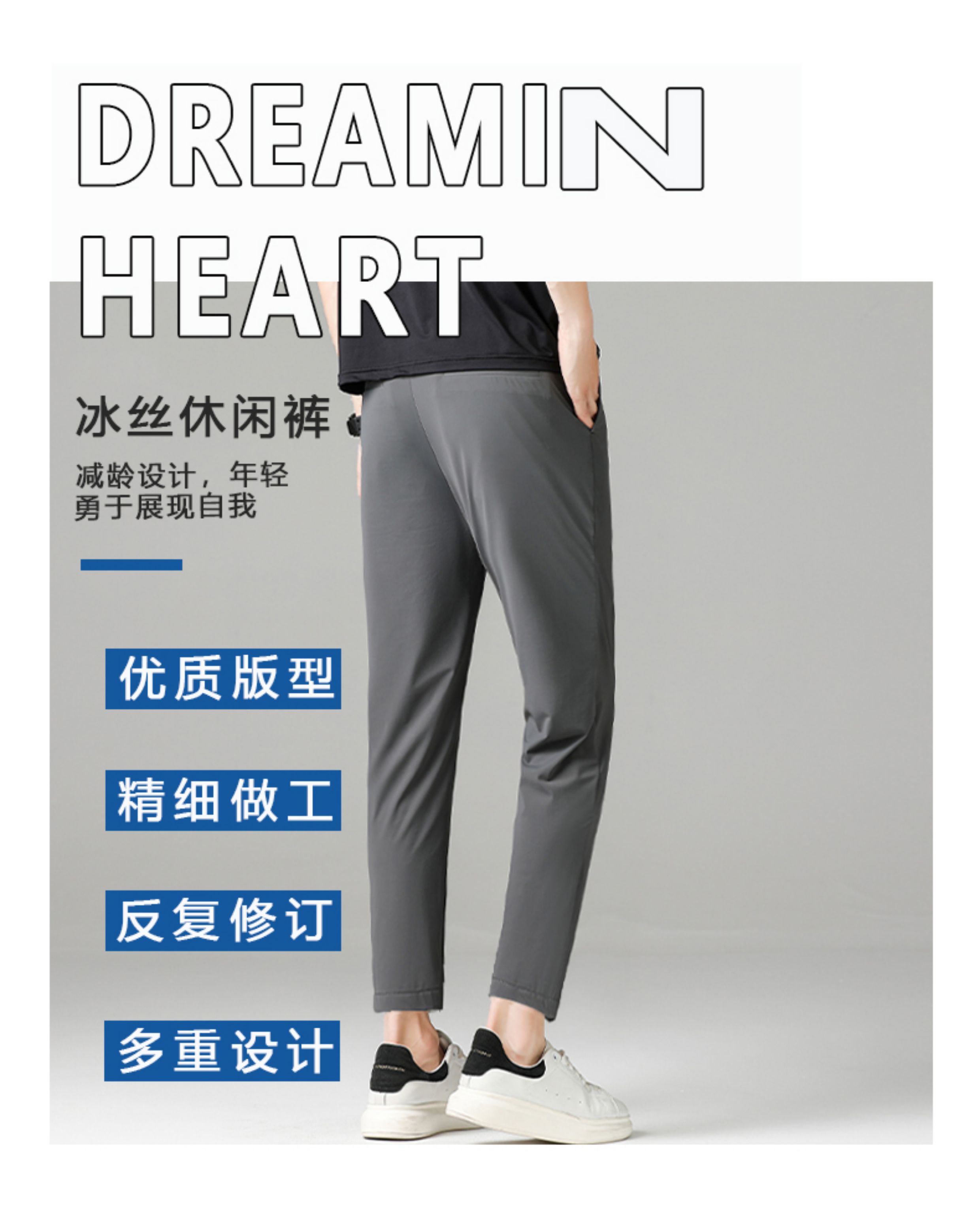 Romon Men's Nine-Point Pants Summer Ice Silk Thin Dress Pants Elastic Straight Loose Men's Sports Quick-Dry Casual Pants