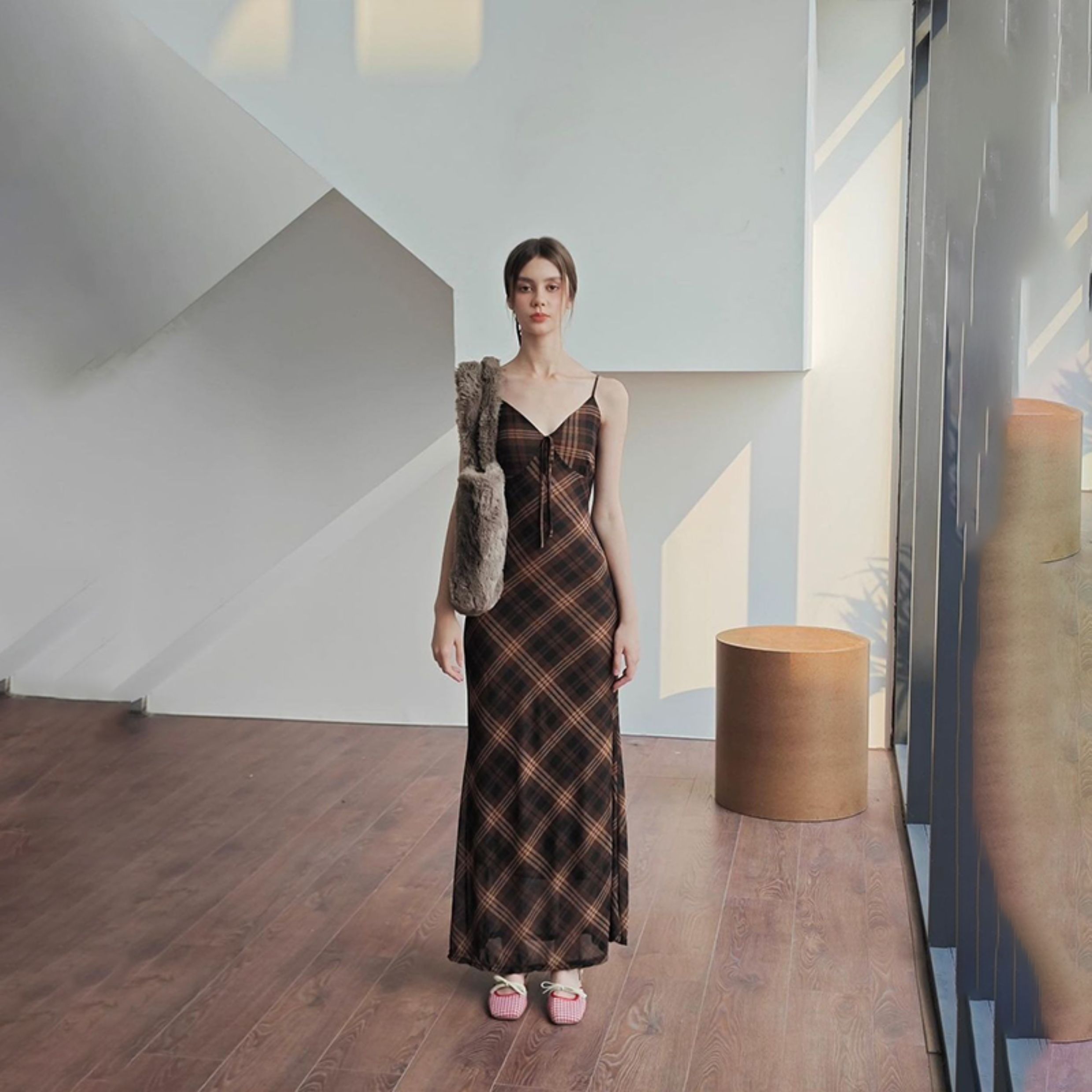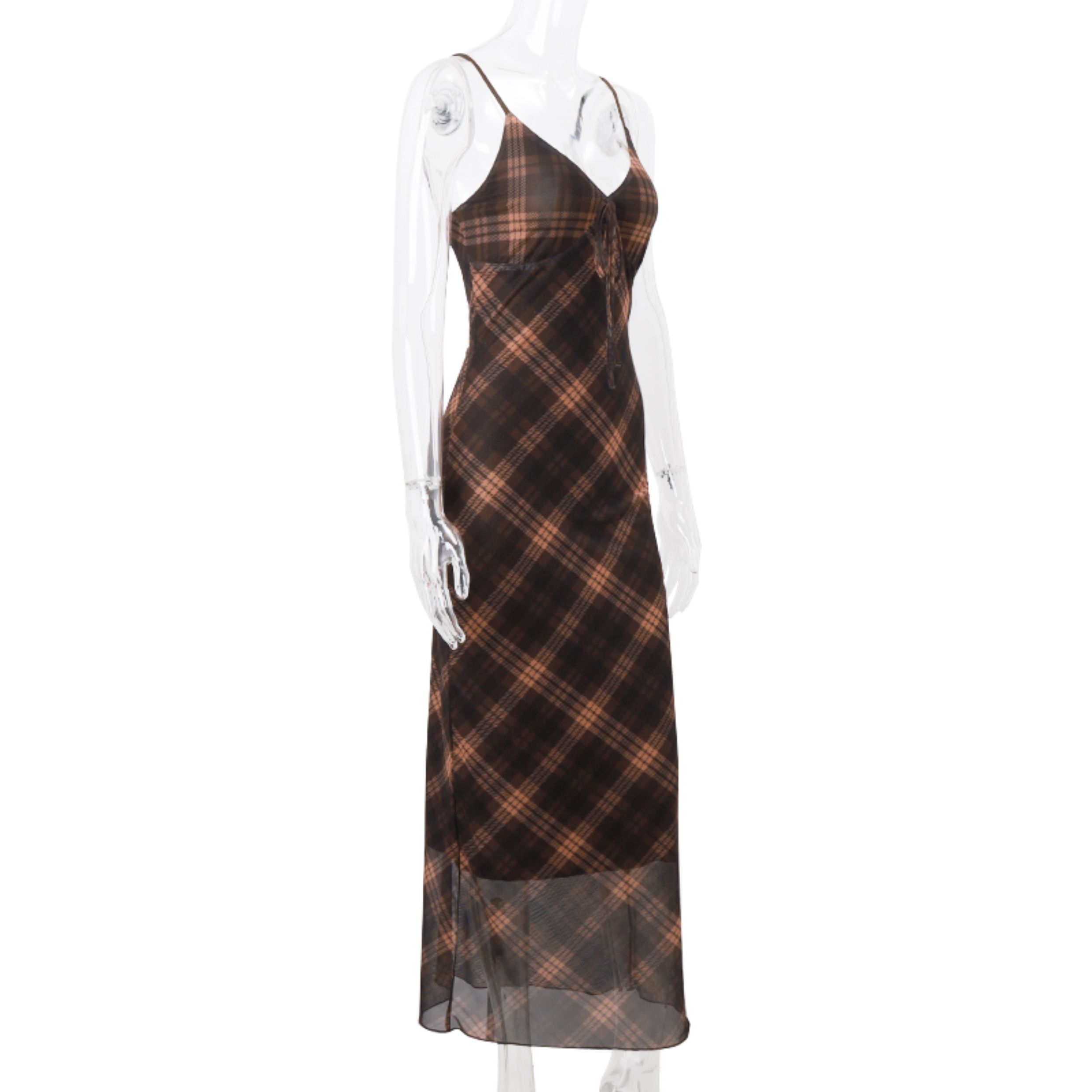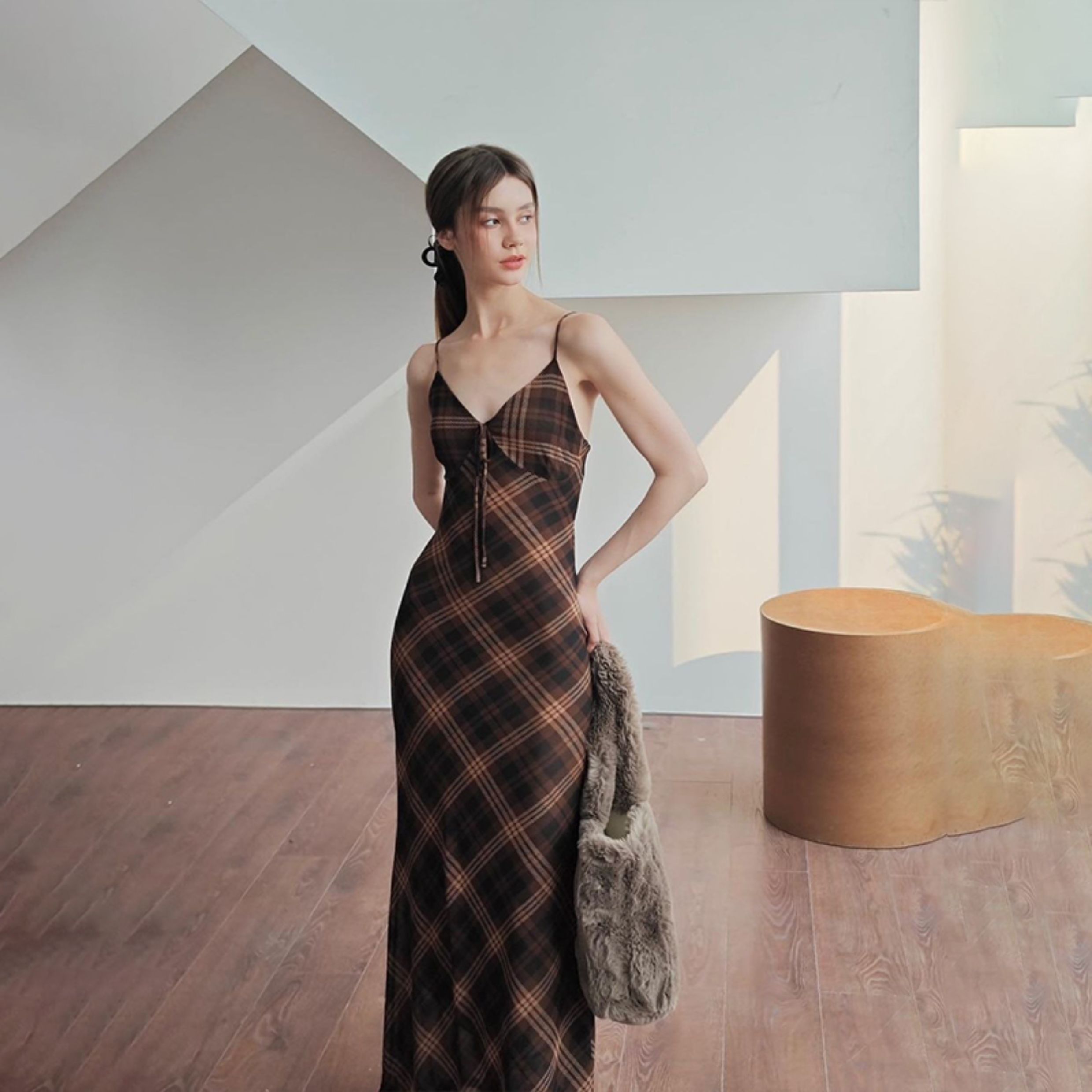 American Retro Style Plaid Print Lace-Up V-Neck Suspender Dress for Women, Winter Hot Girl Slim Fit and Elegant Long Dress