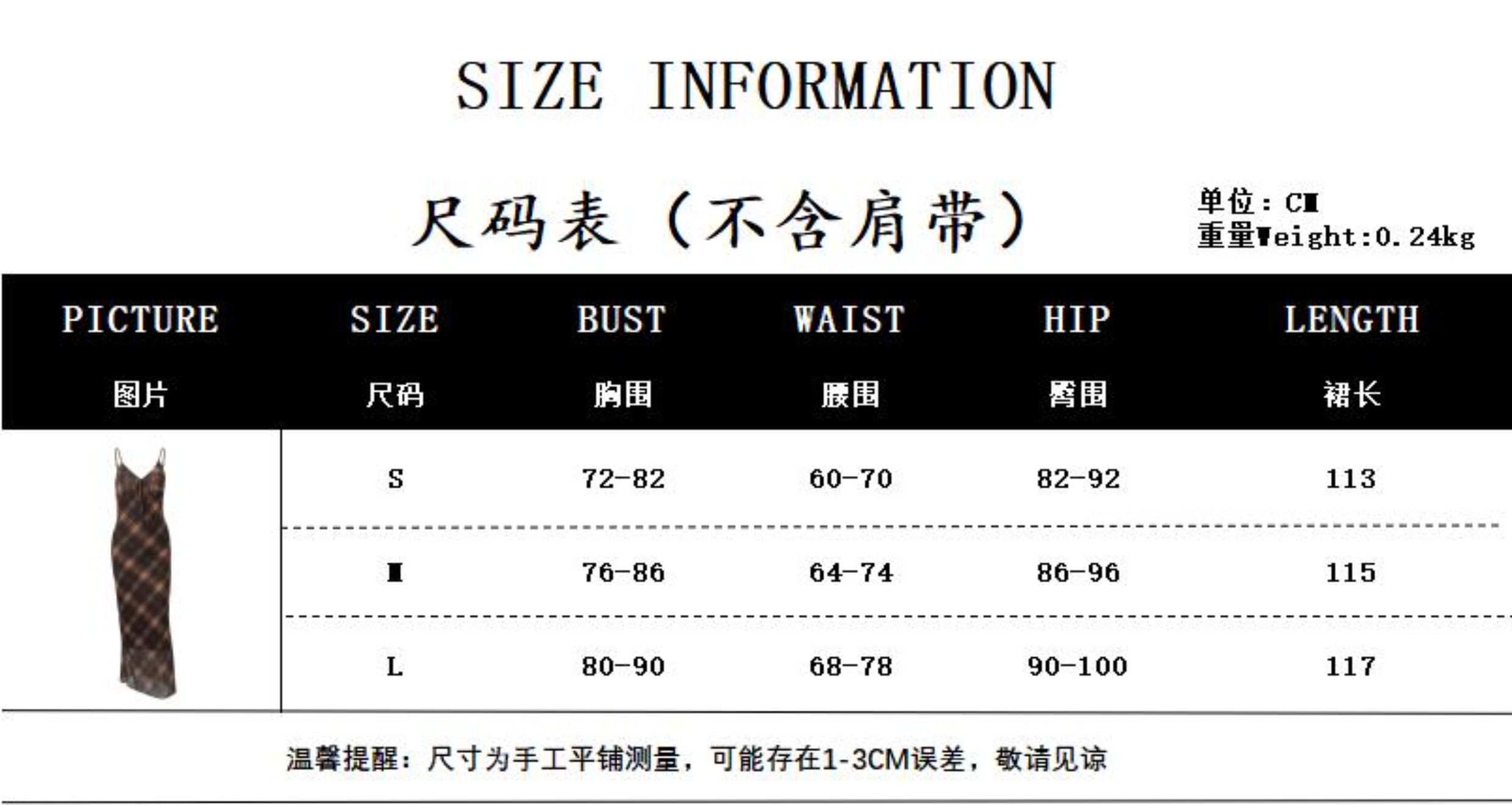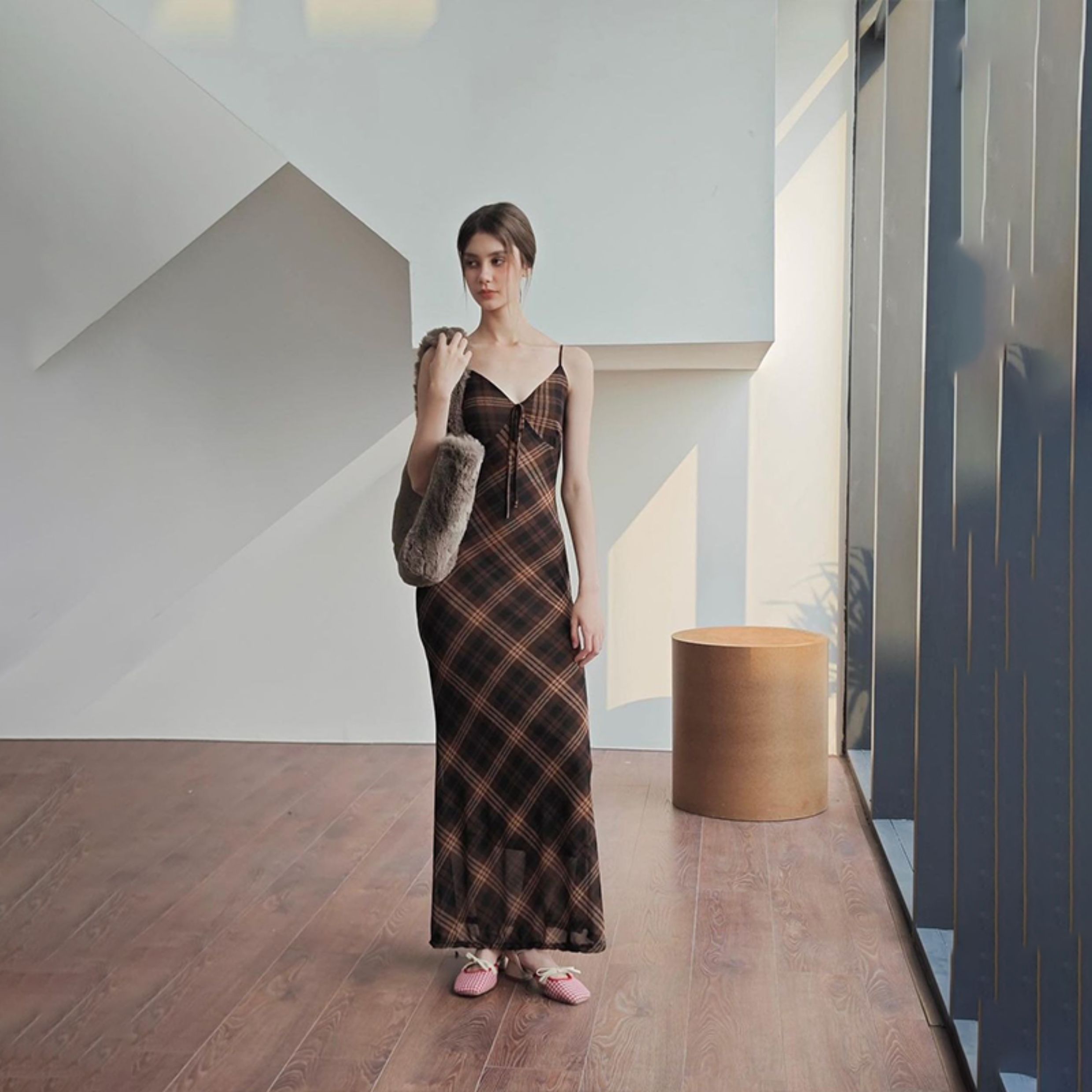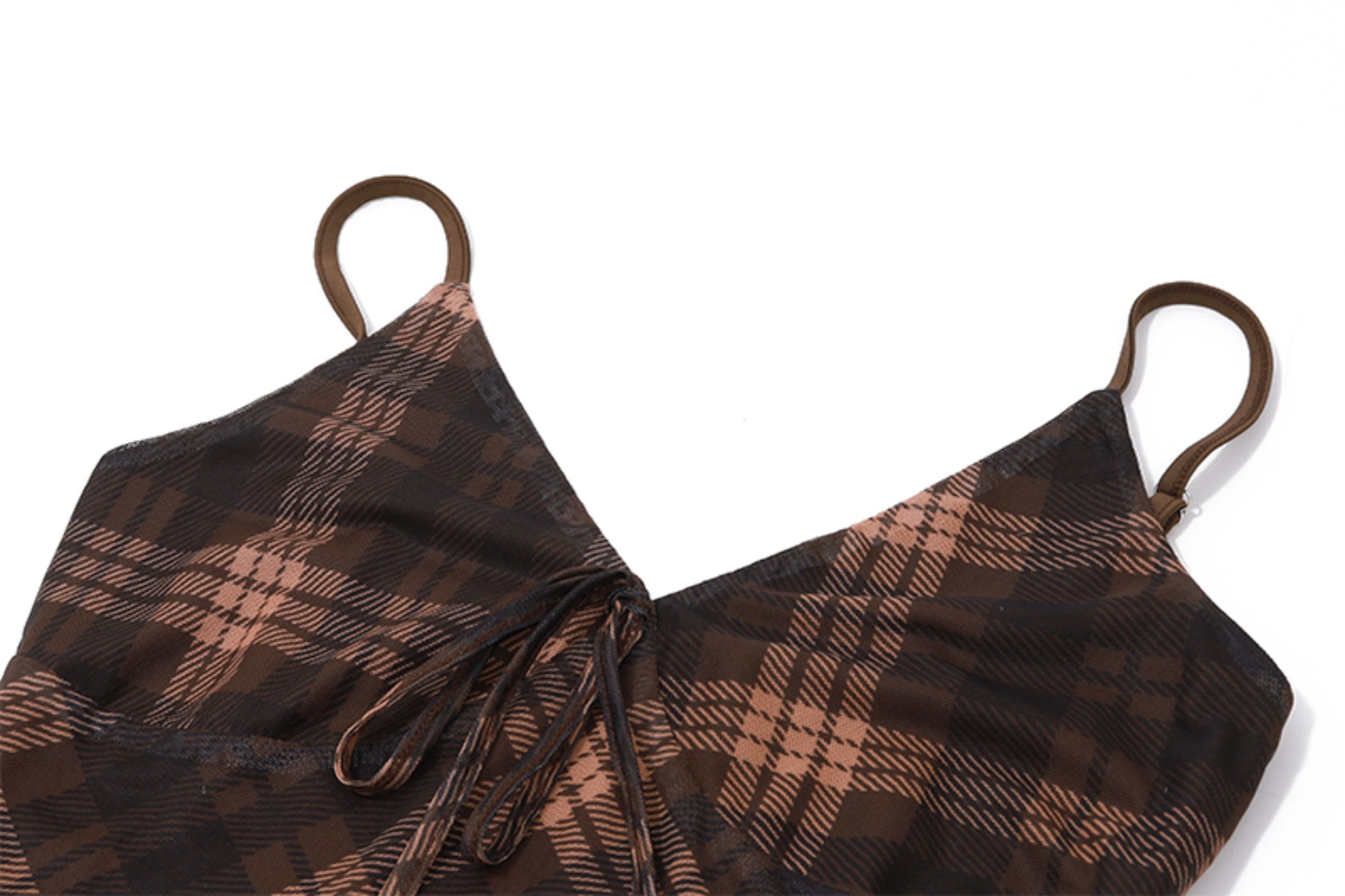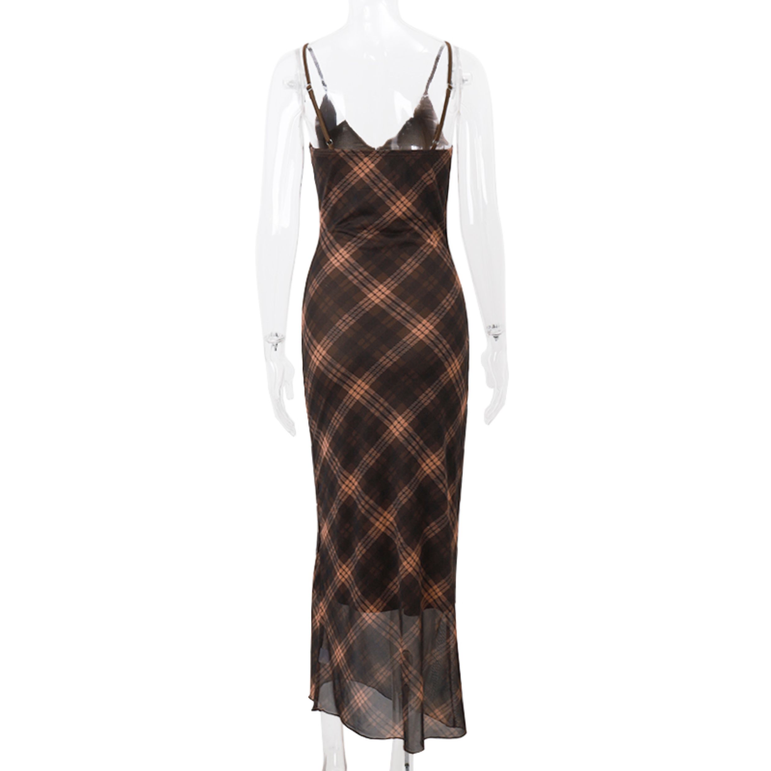 American Retro Style Plaid Print Lace-Up V-Neck Suspender Dress for Women, Winter Hot Girl Slim Fit and Elegant Long Dress