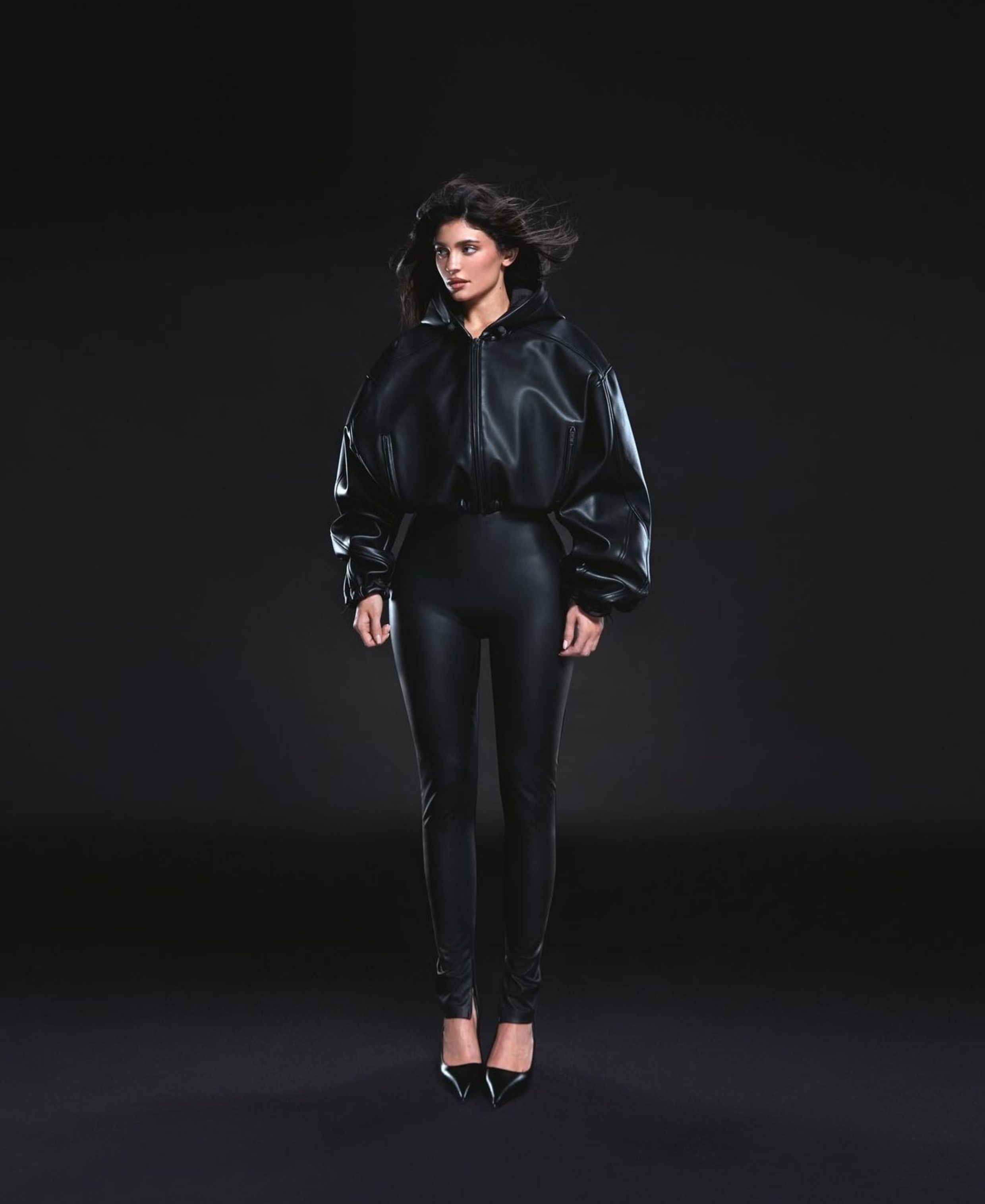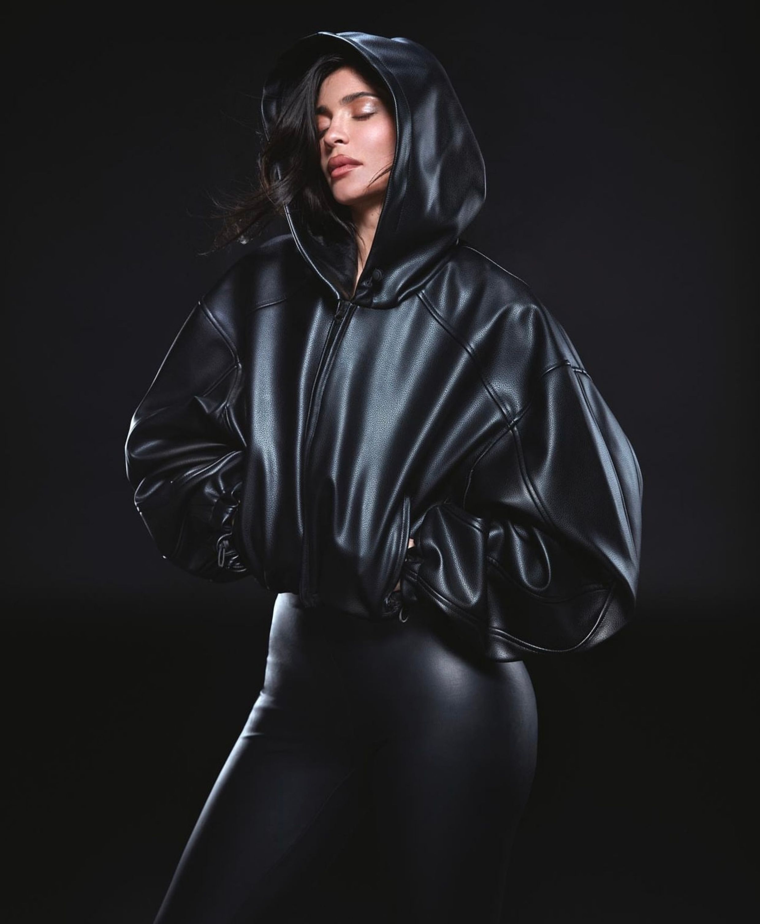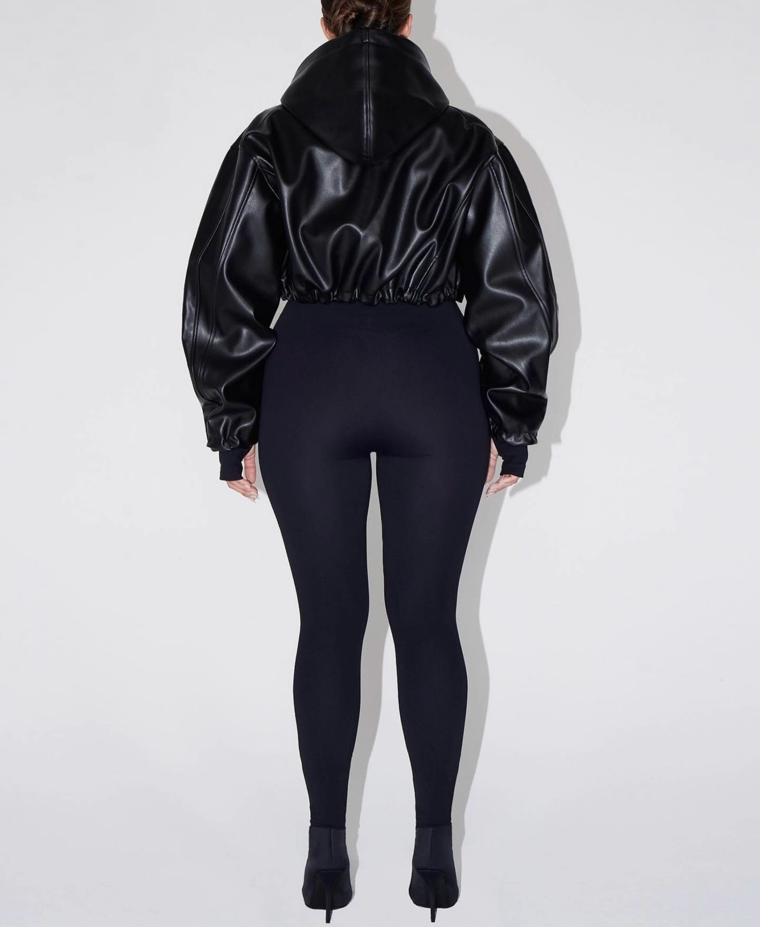 Khy Kylie Same Style Black Hooded Short Leather Jacket Drop001 Series Silhouette Biker Style Jacket