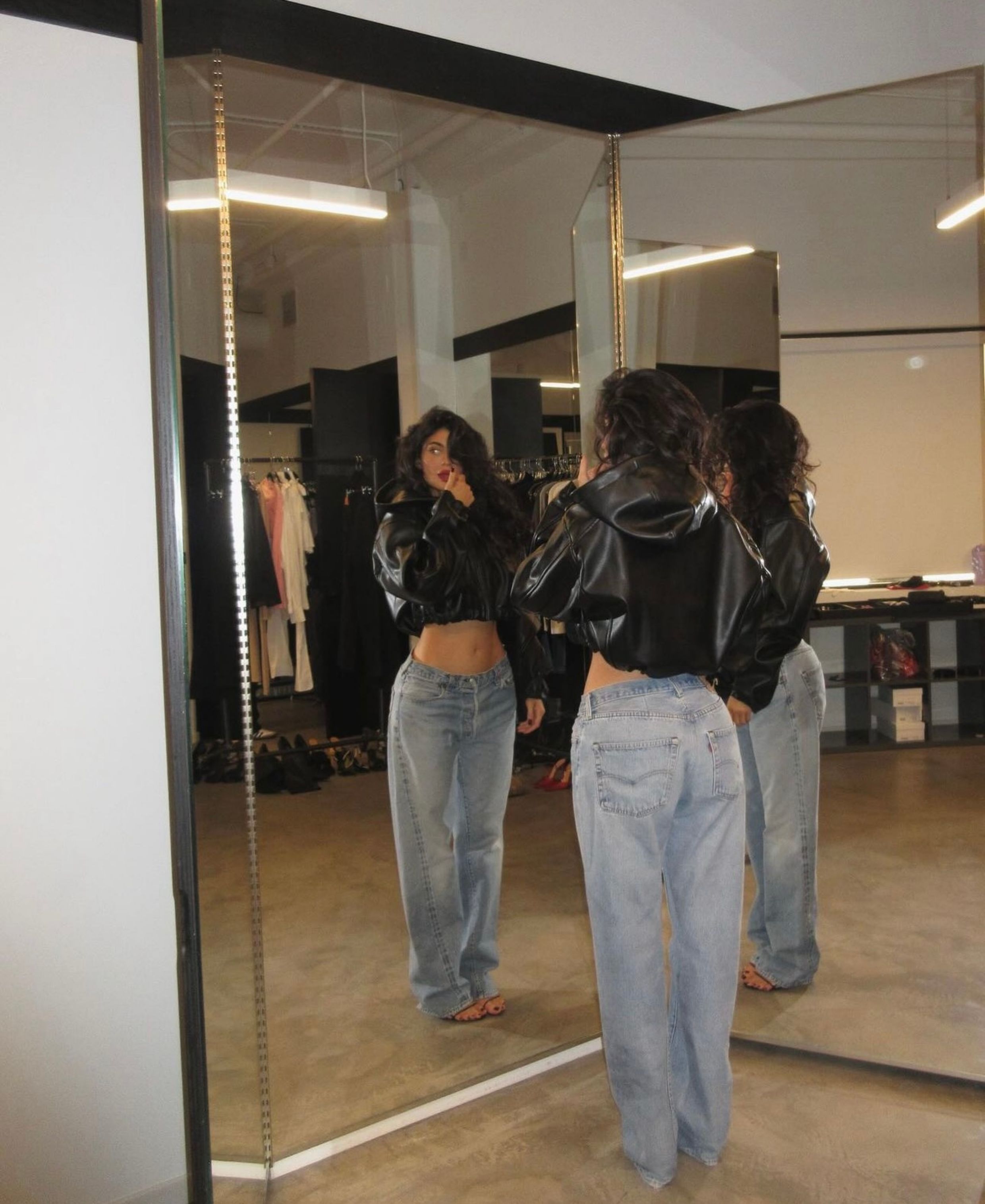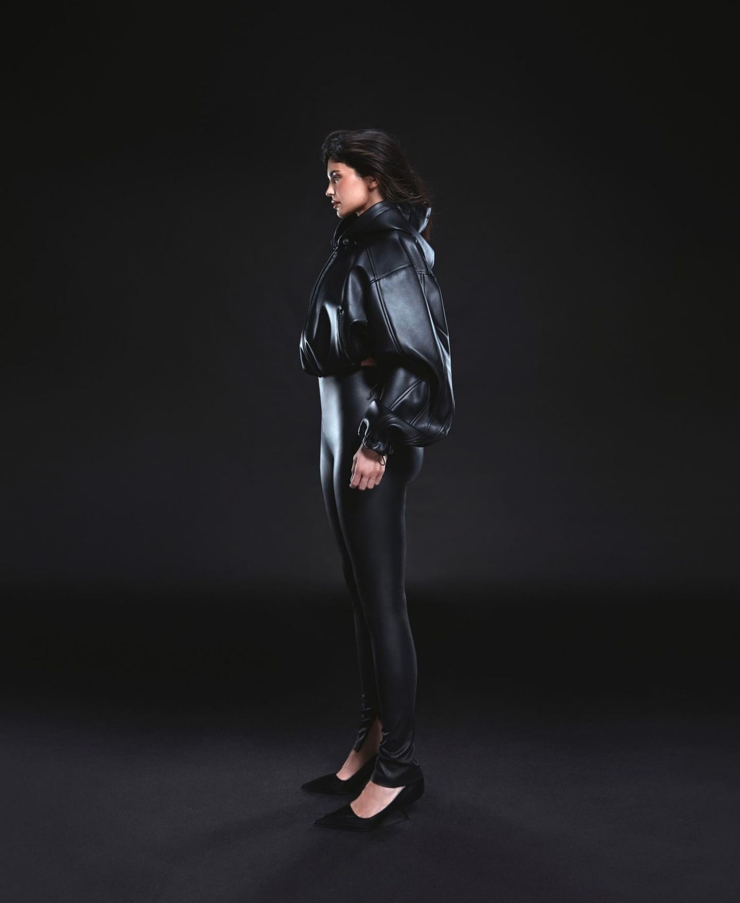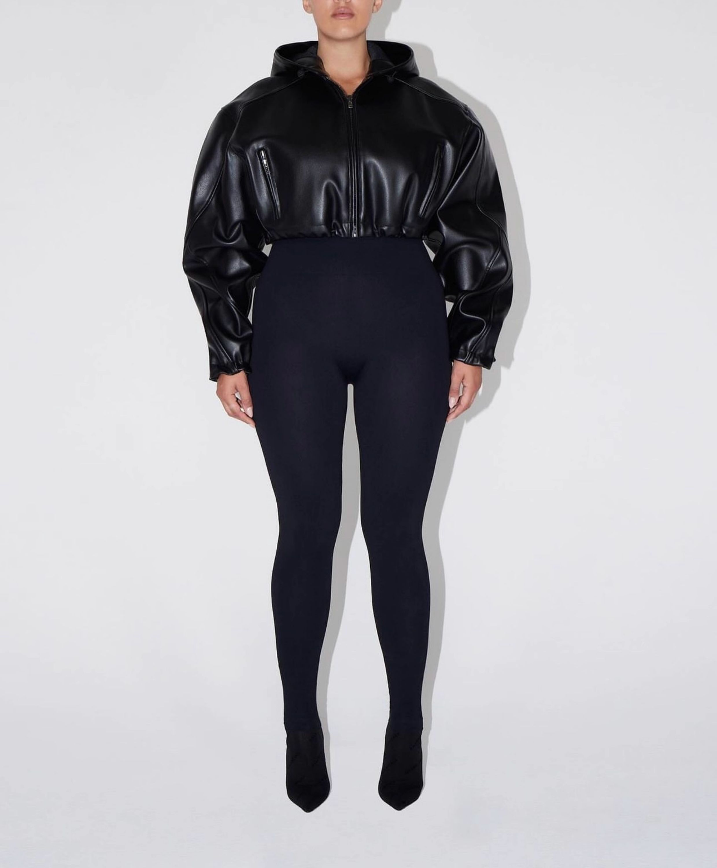 Khy Kylie Same Style Black Hooded Short Leather Jacket Drop001 Series Silhouette Biker Style Jacket