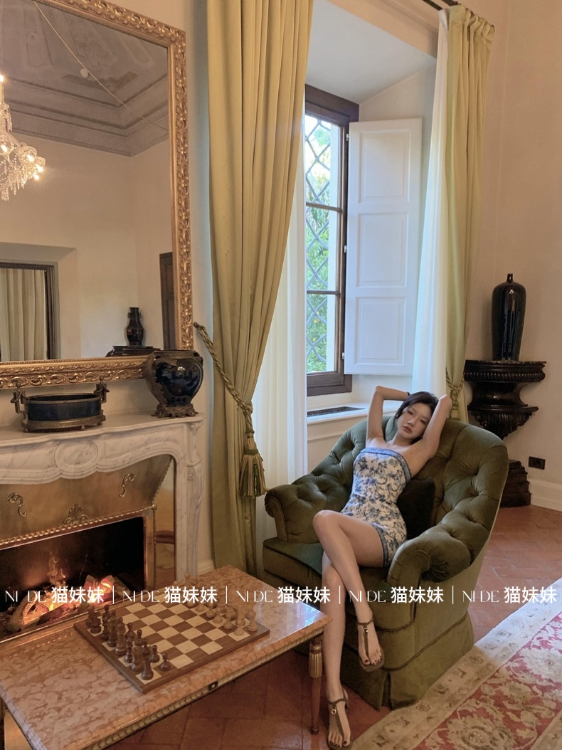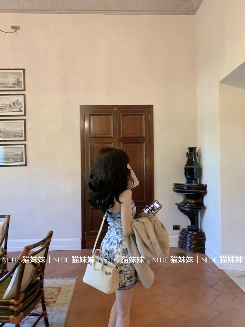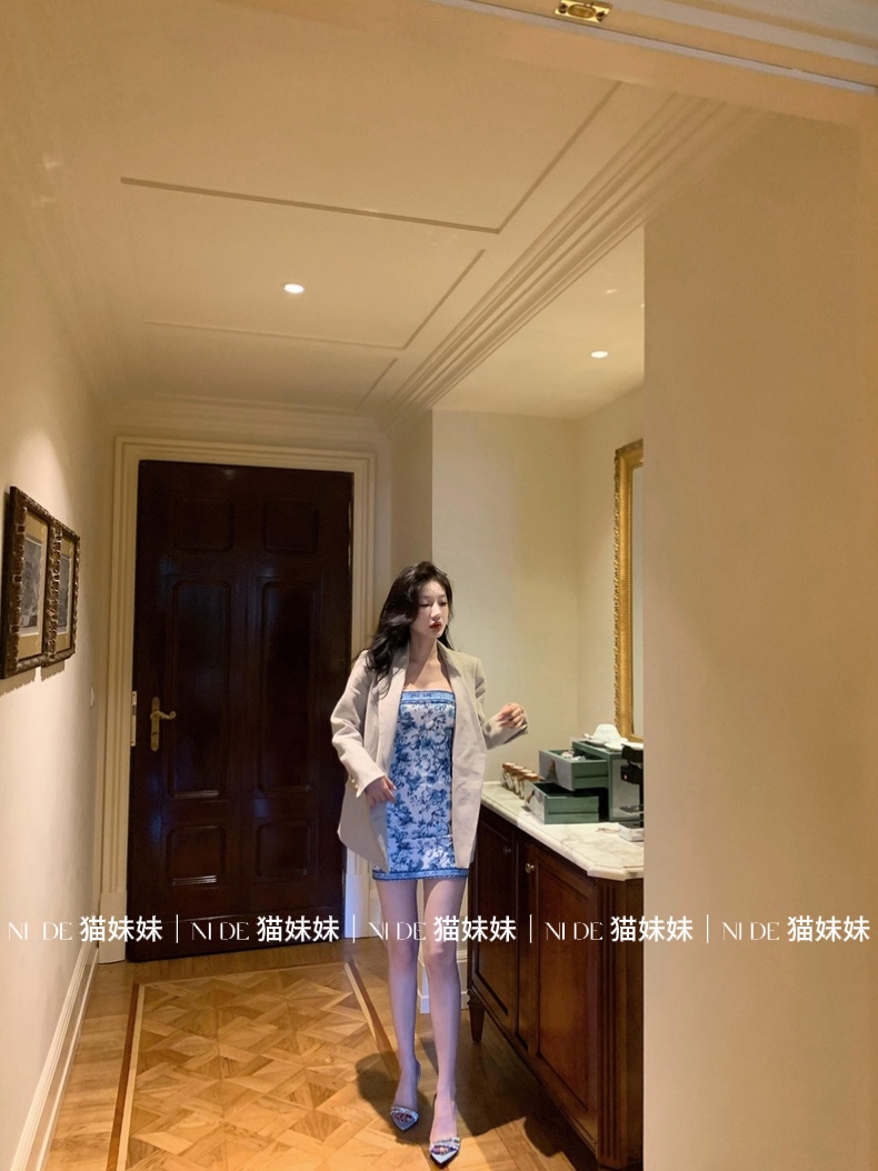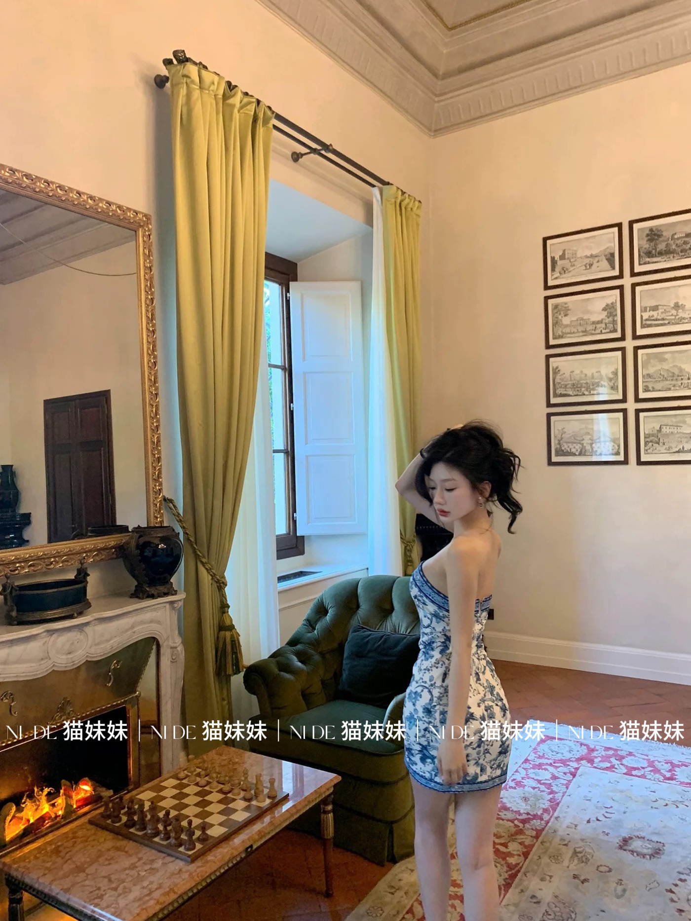 In Stock! Beauty in the Mural New Chinese-Style Blue and White Porcelain Print Strapless Waist-Cinching Slimming Dress