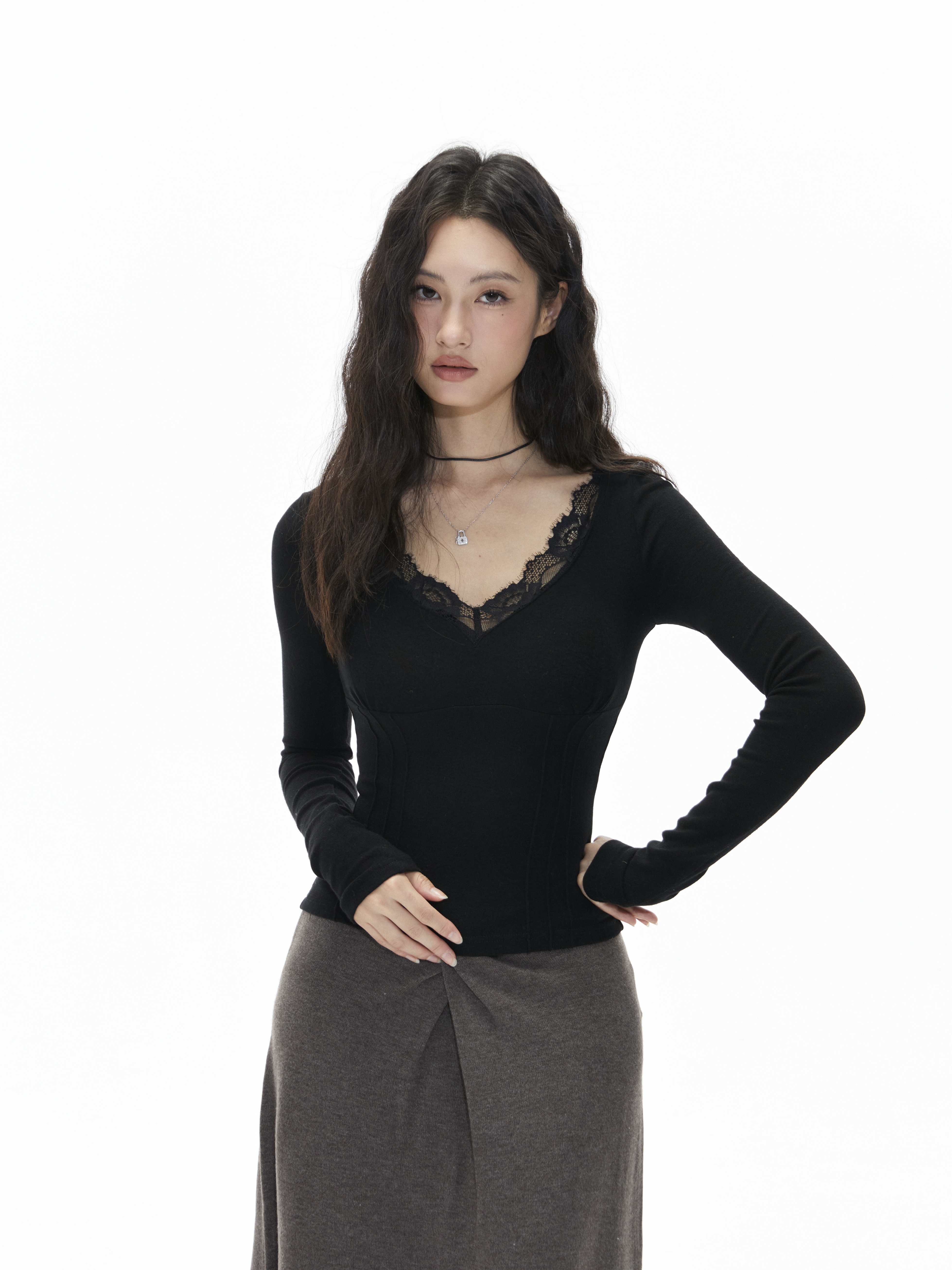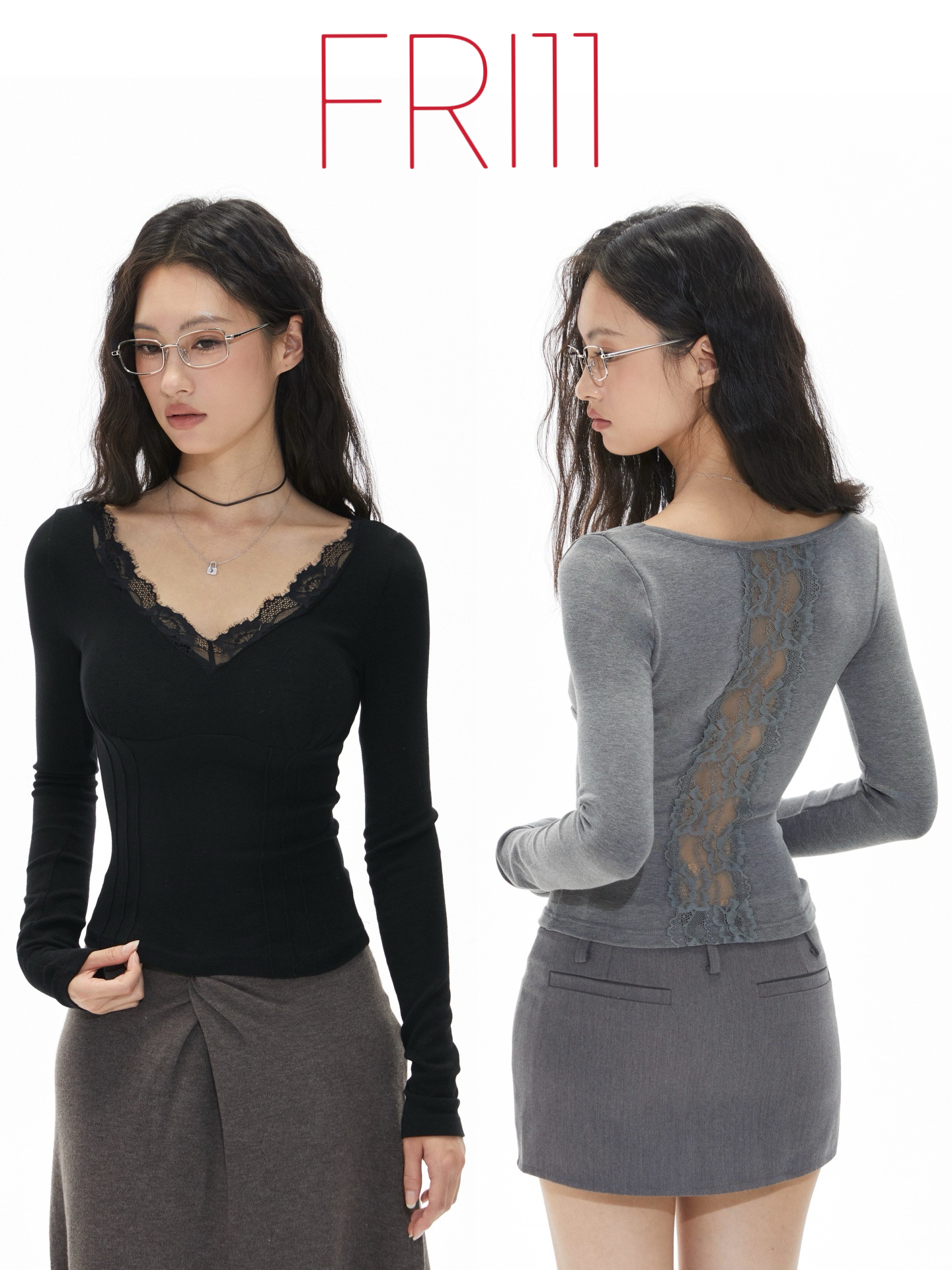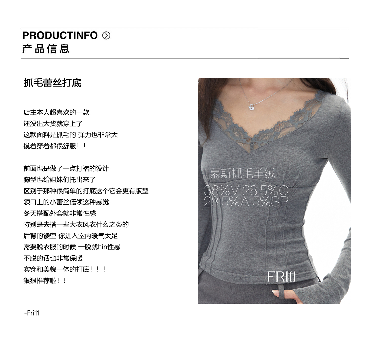 Fri11 Original Design Lace Brushed Fabric Base Layer with Lace V-Neck for Layering in Autumn and Winter