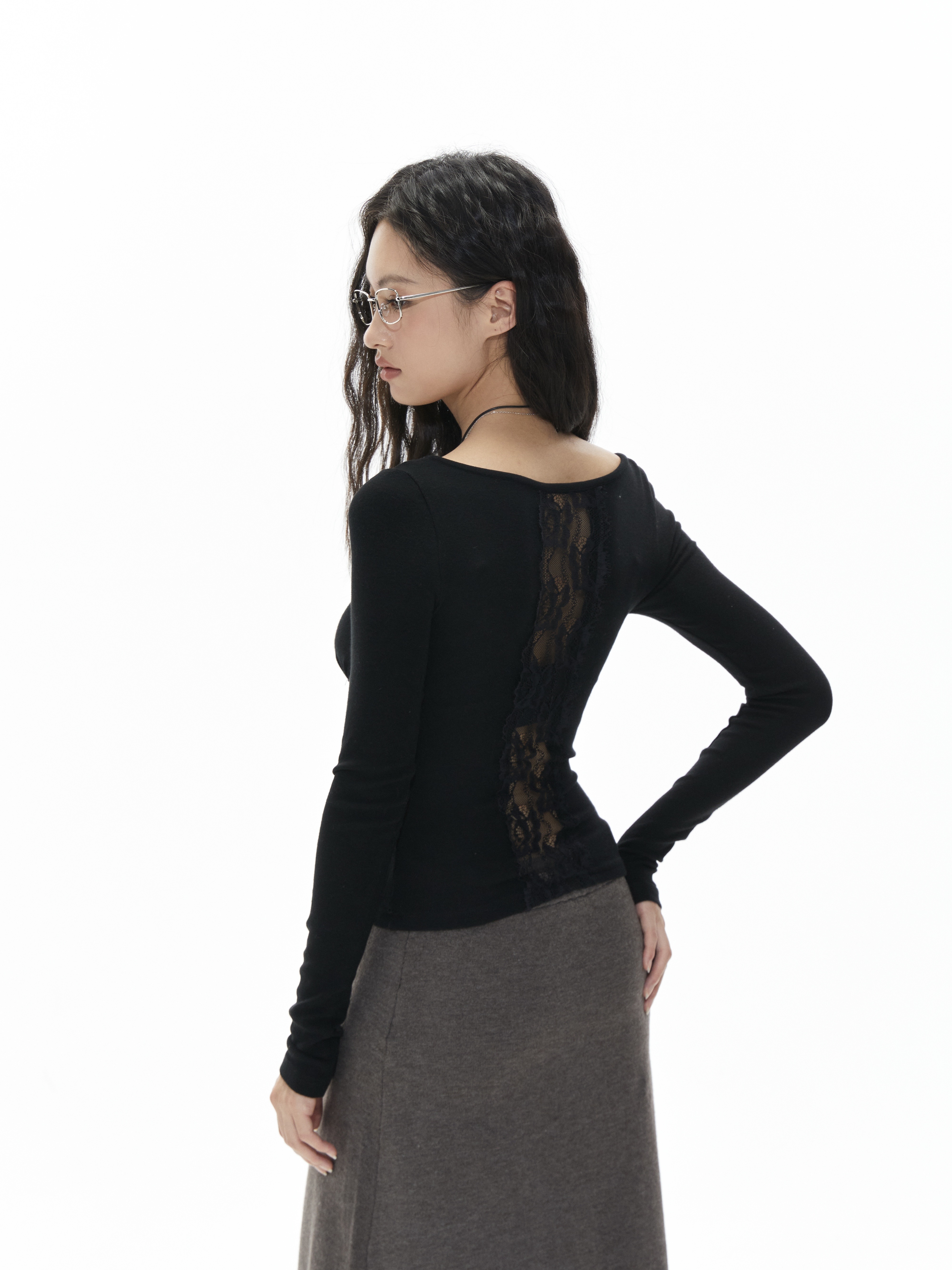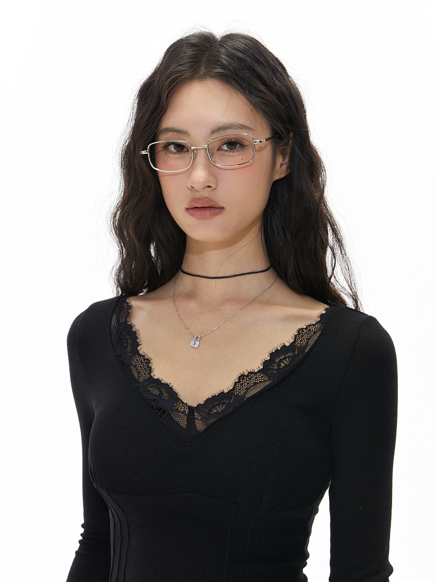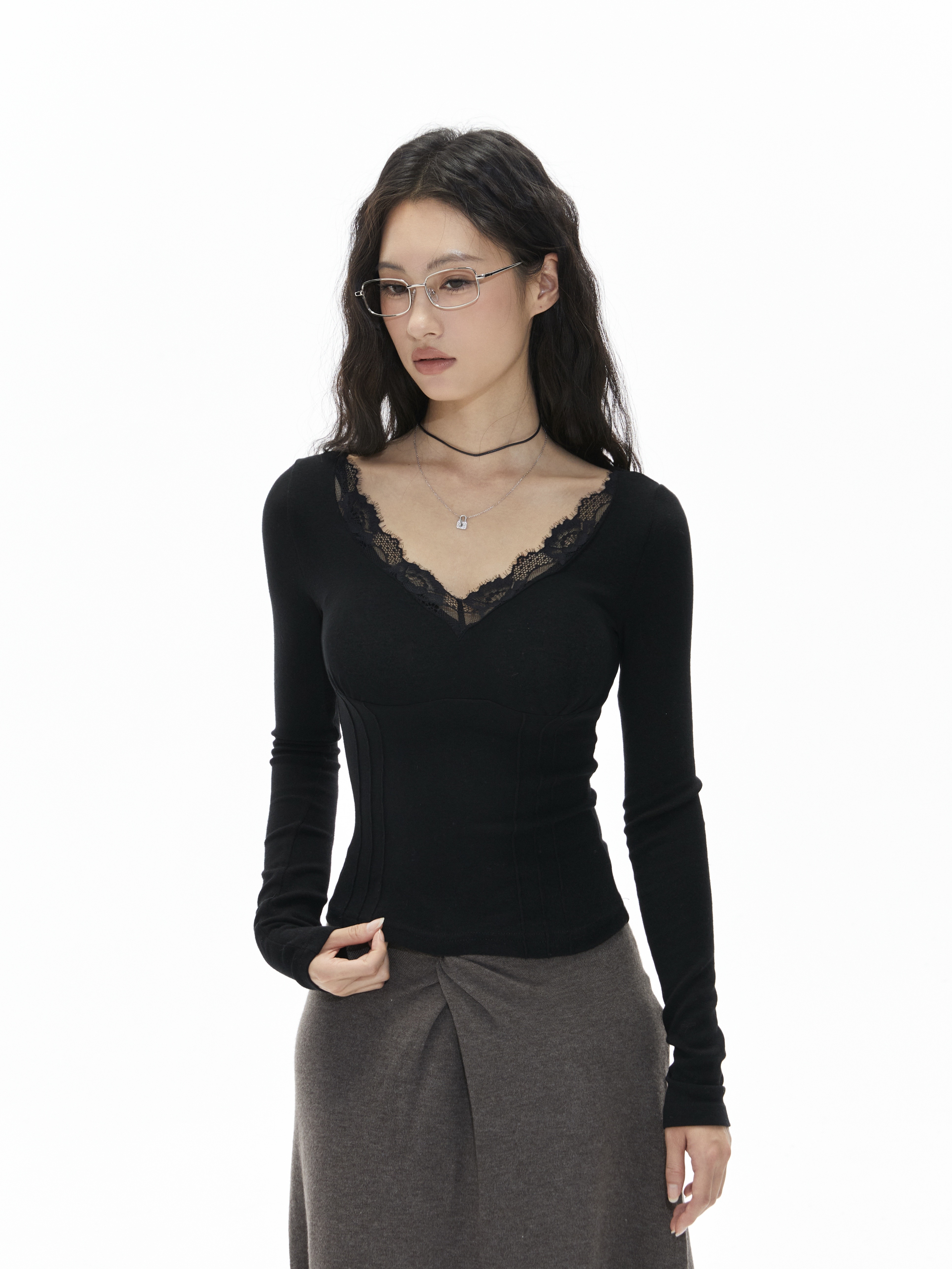 Fri11 Original Design Lace Brushed Fabric Base Layer with Lace V-Neck for Layering in Autumn and Winter
