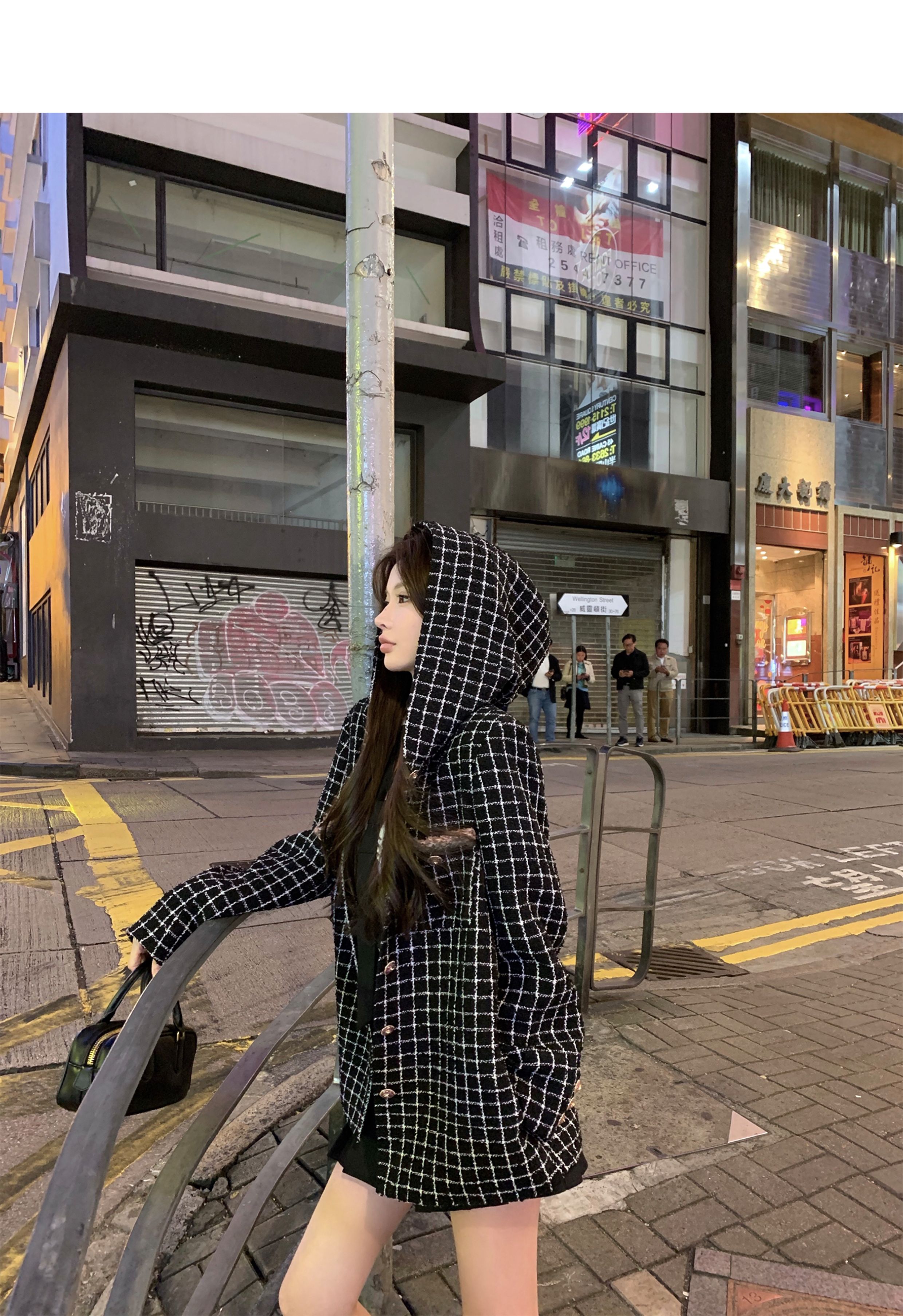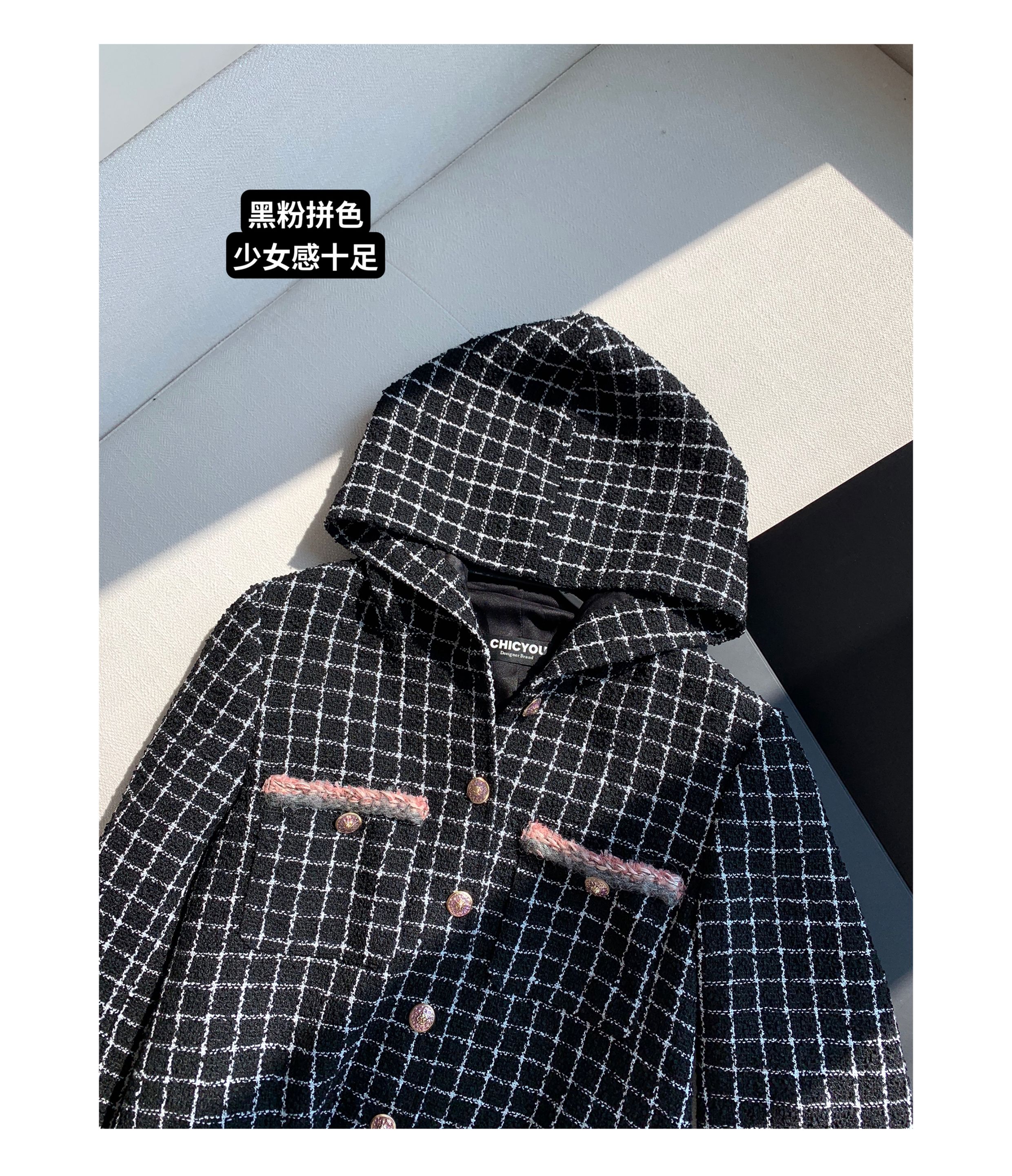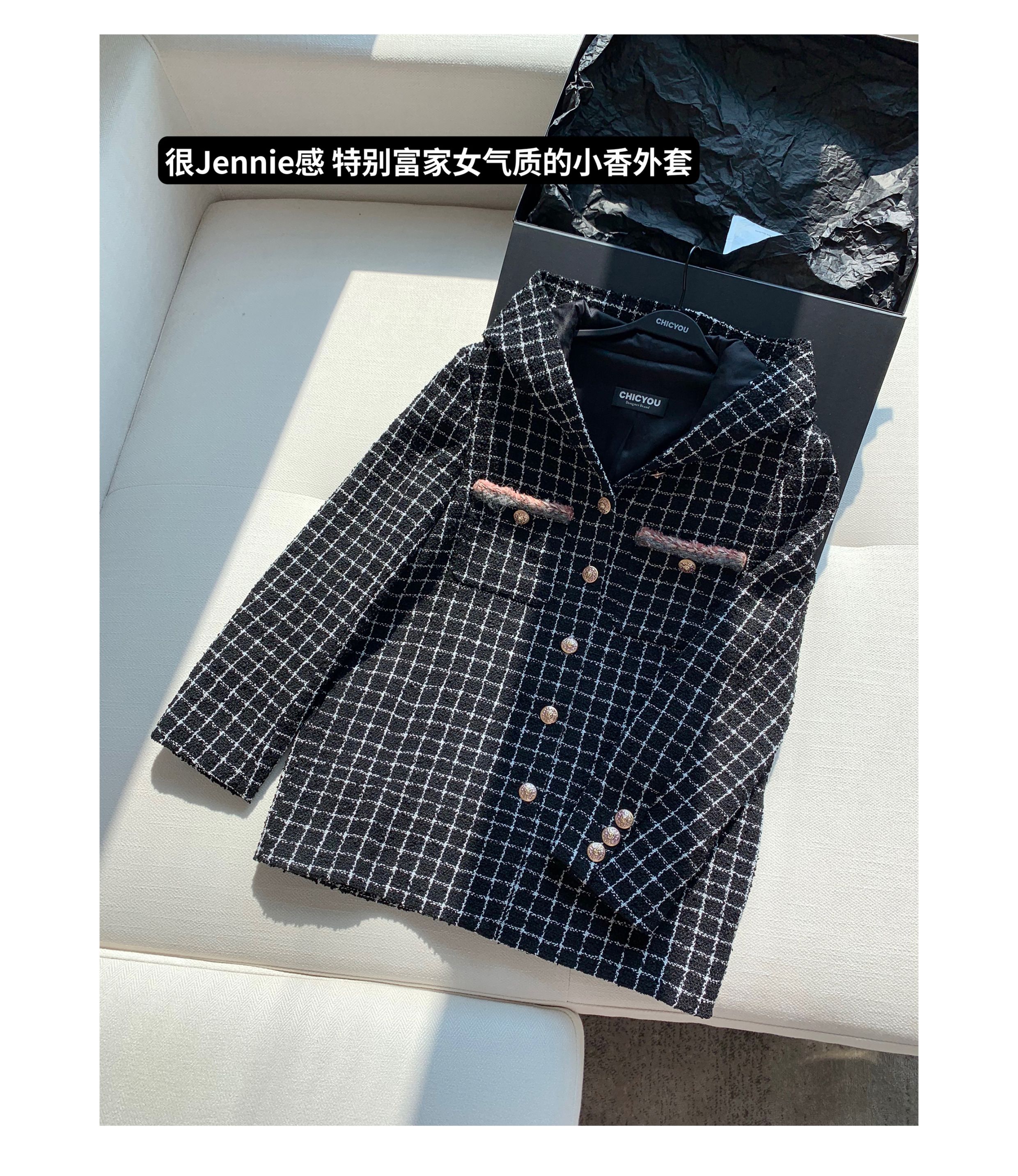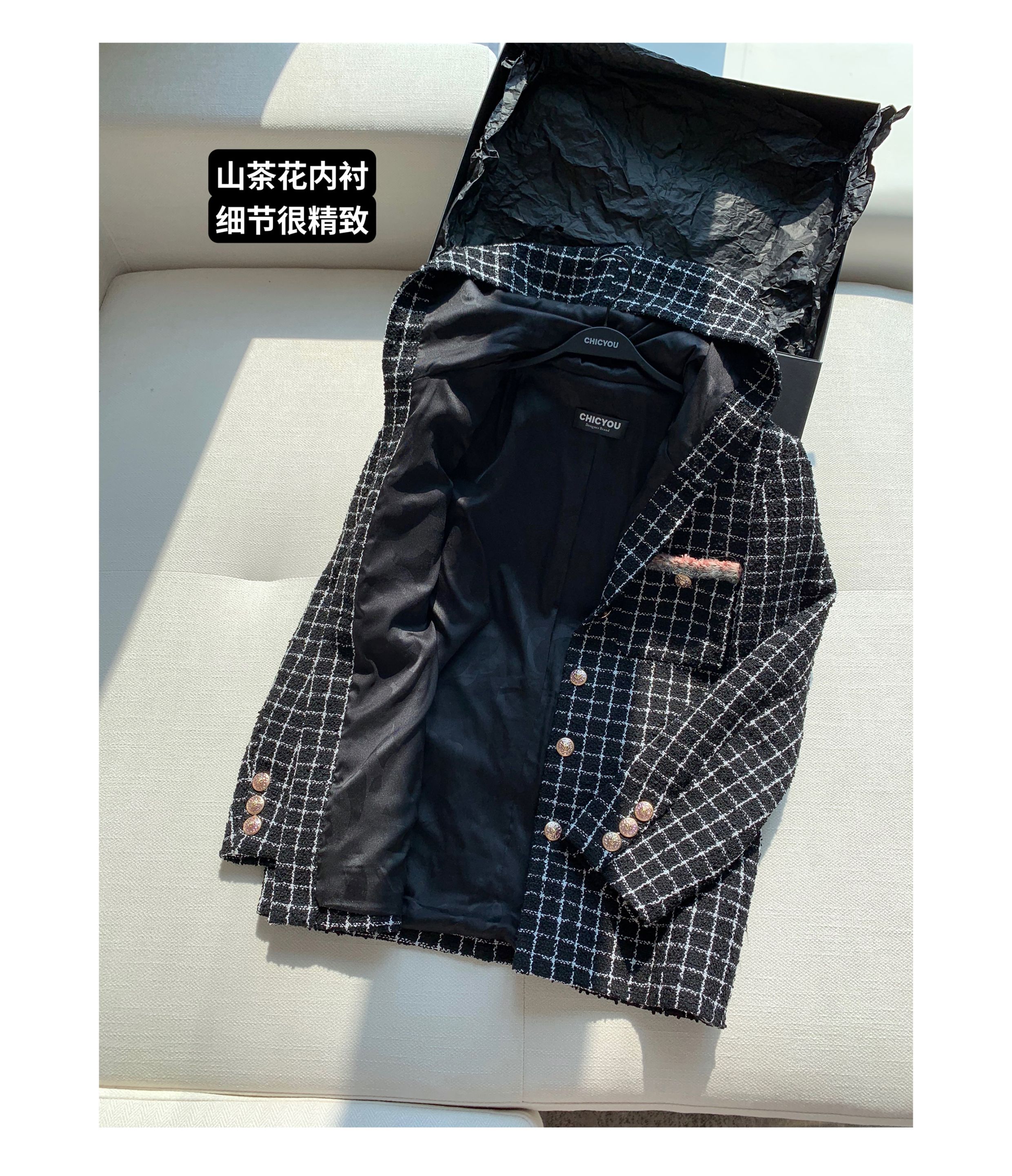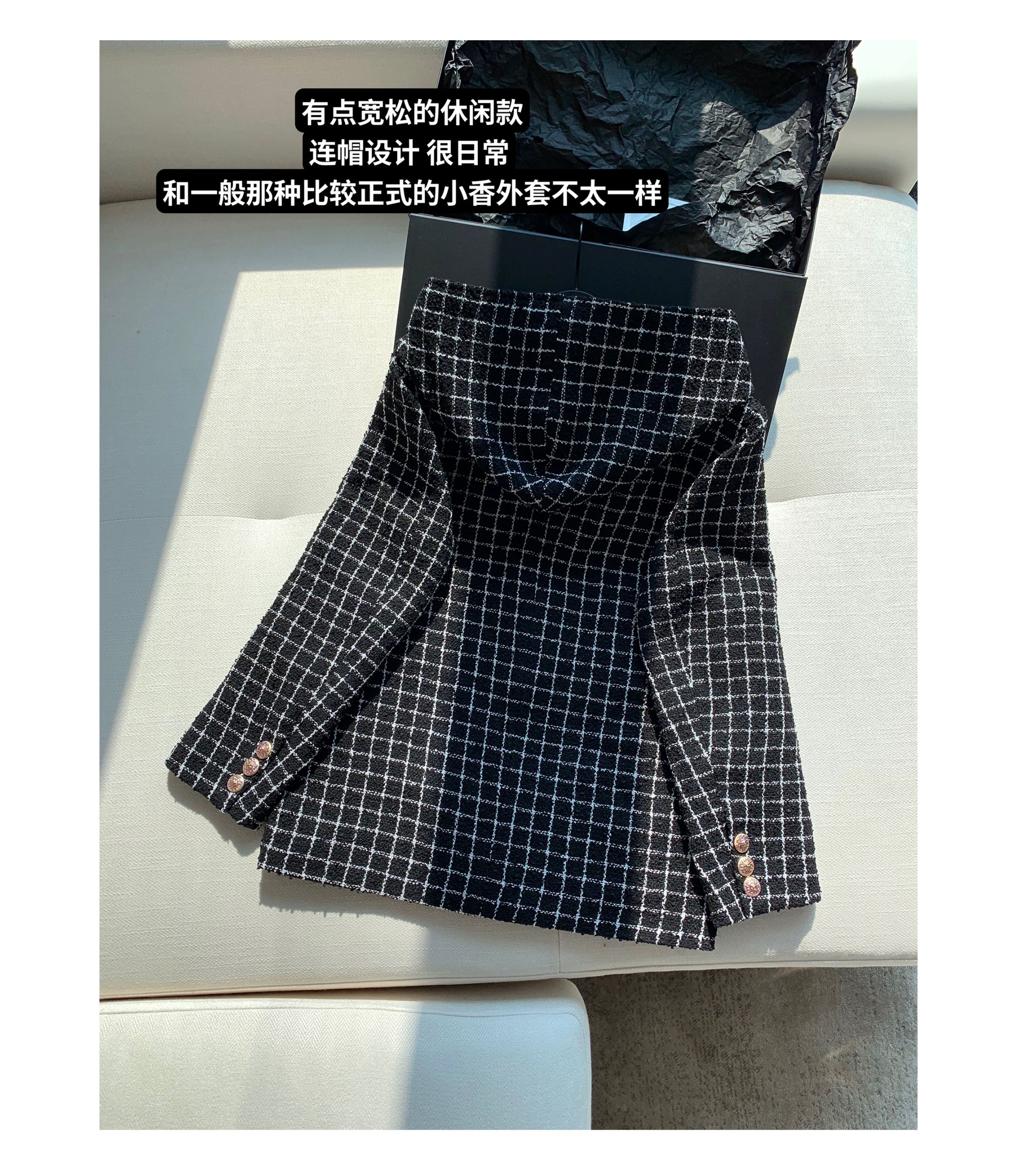 [Small Quantity in Stock] Chicyou Black Plaid Hooded Thin Tweed Versatile Chanel-Style Jacket for Women