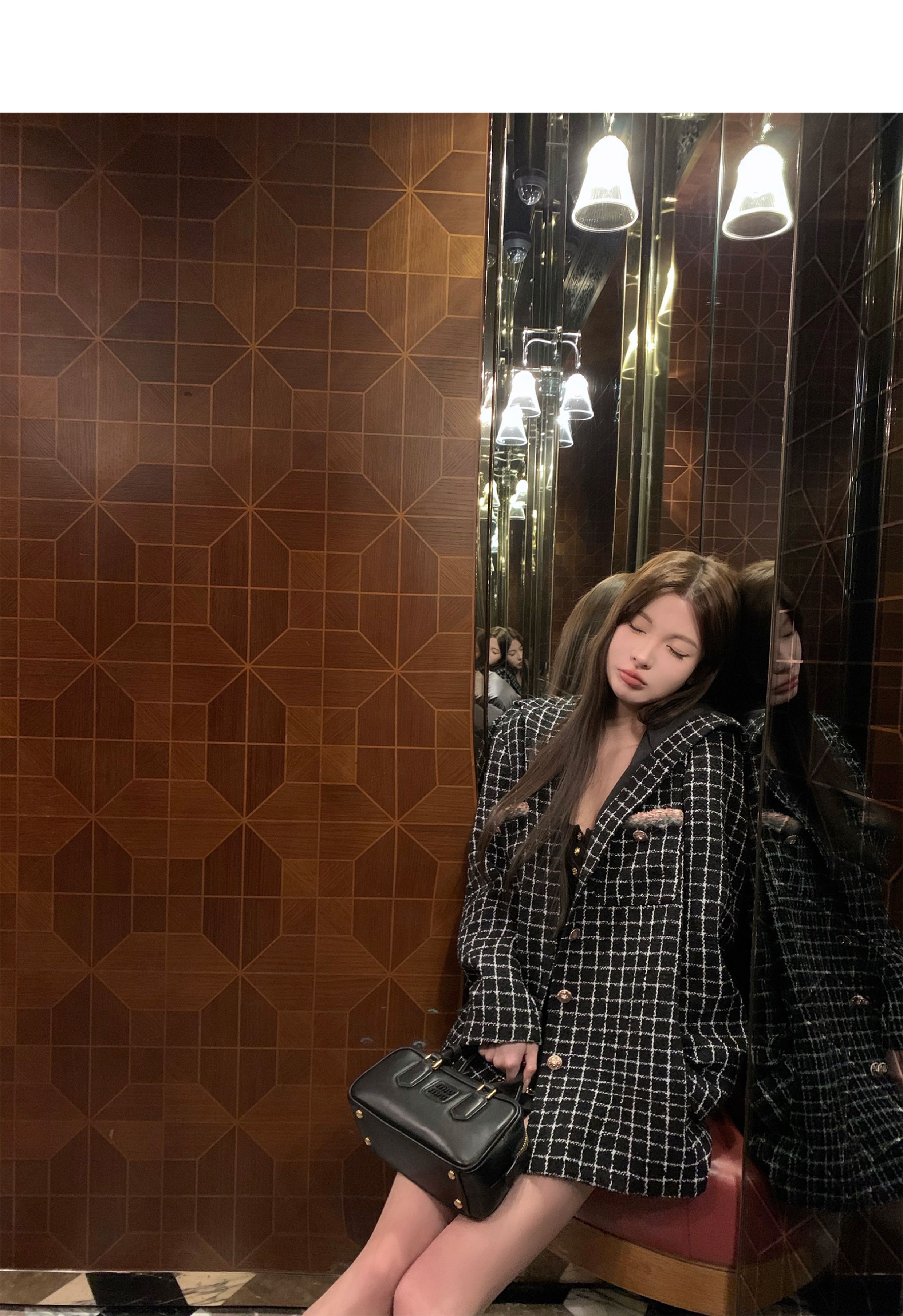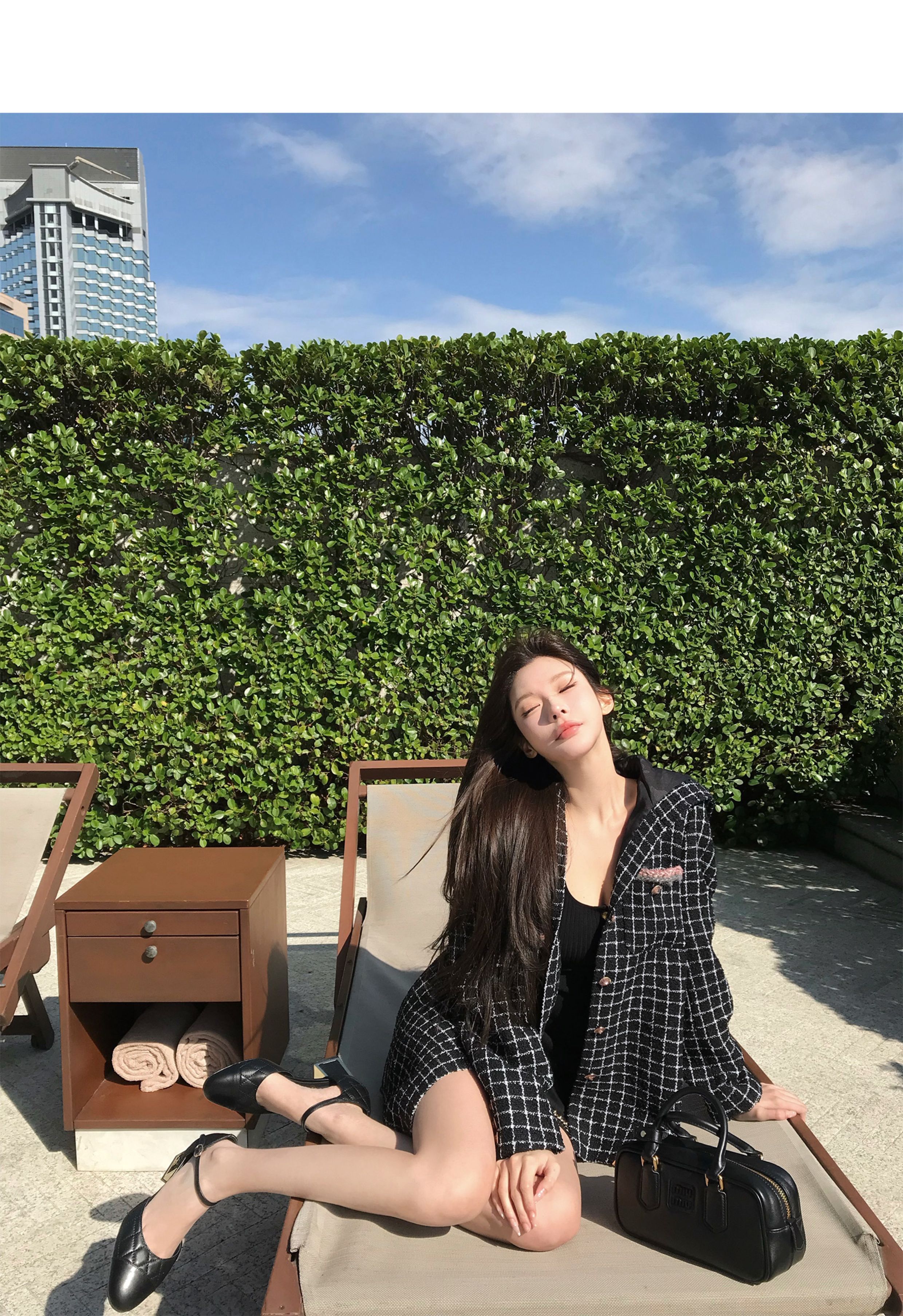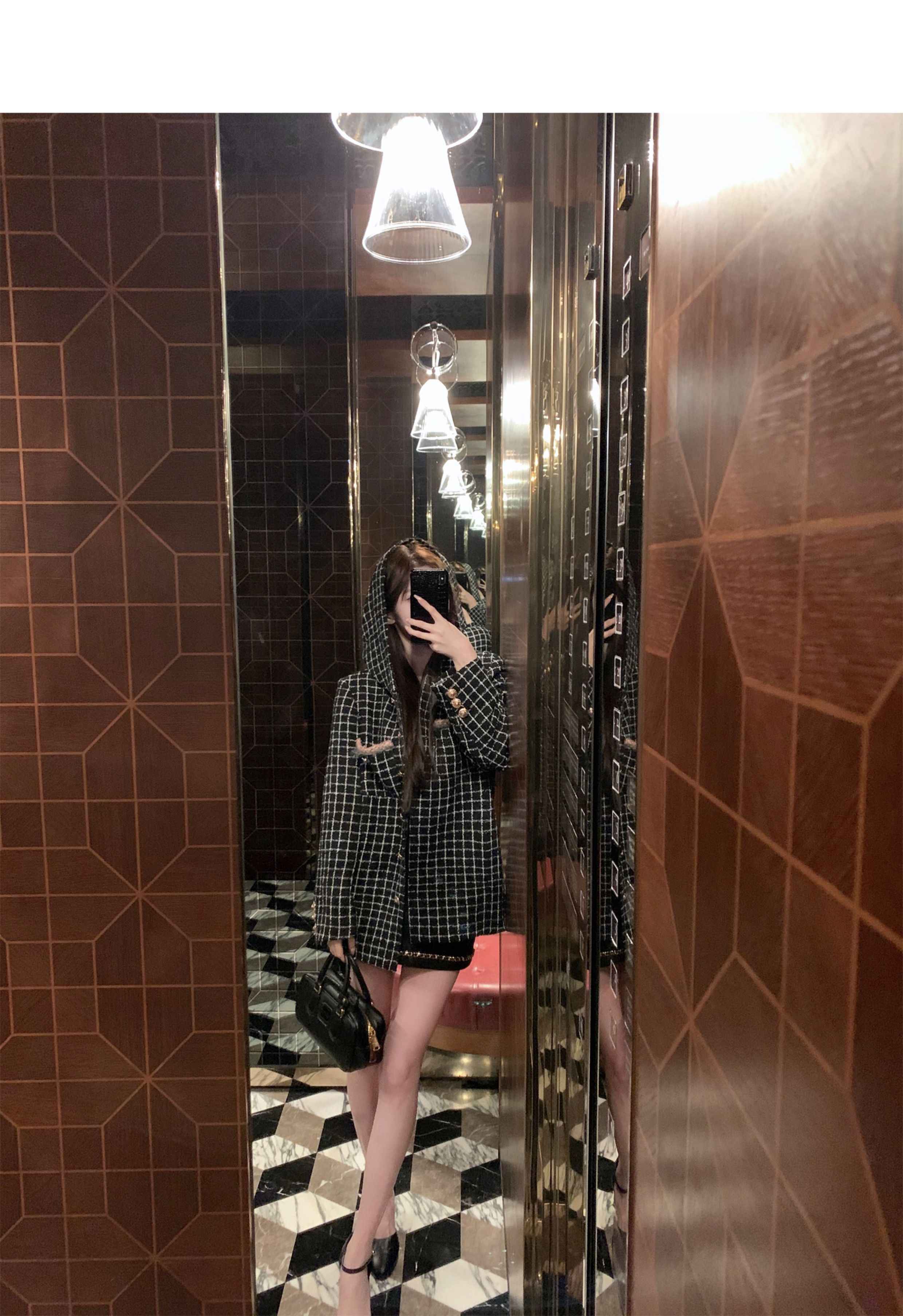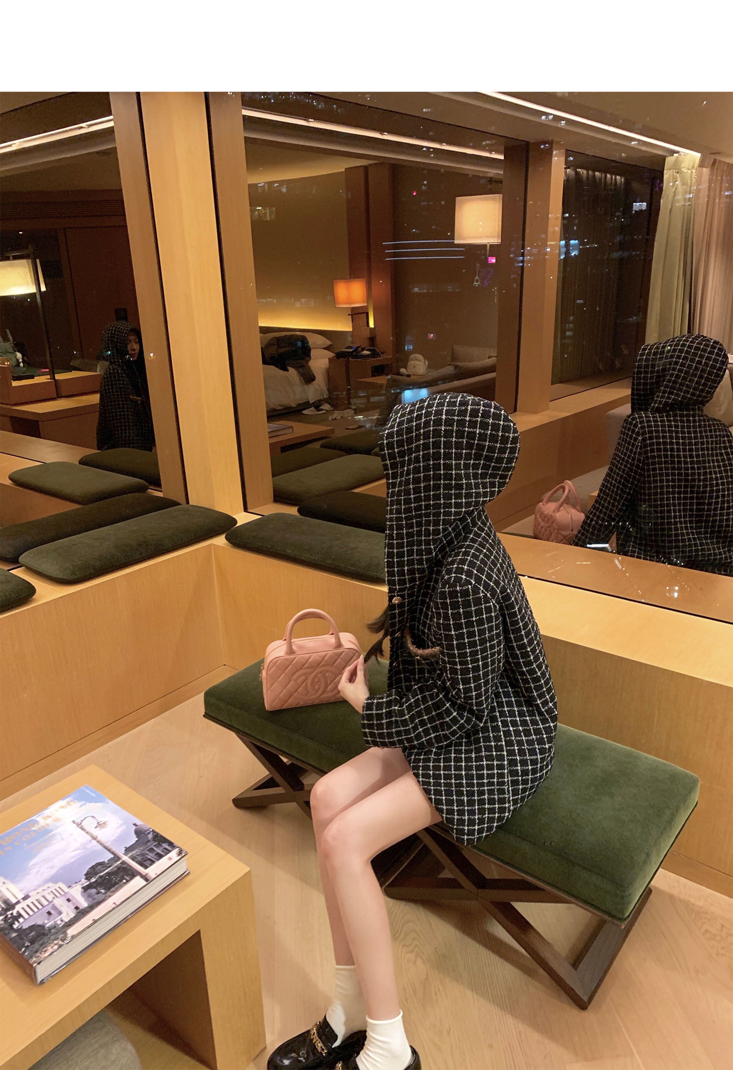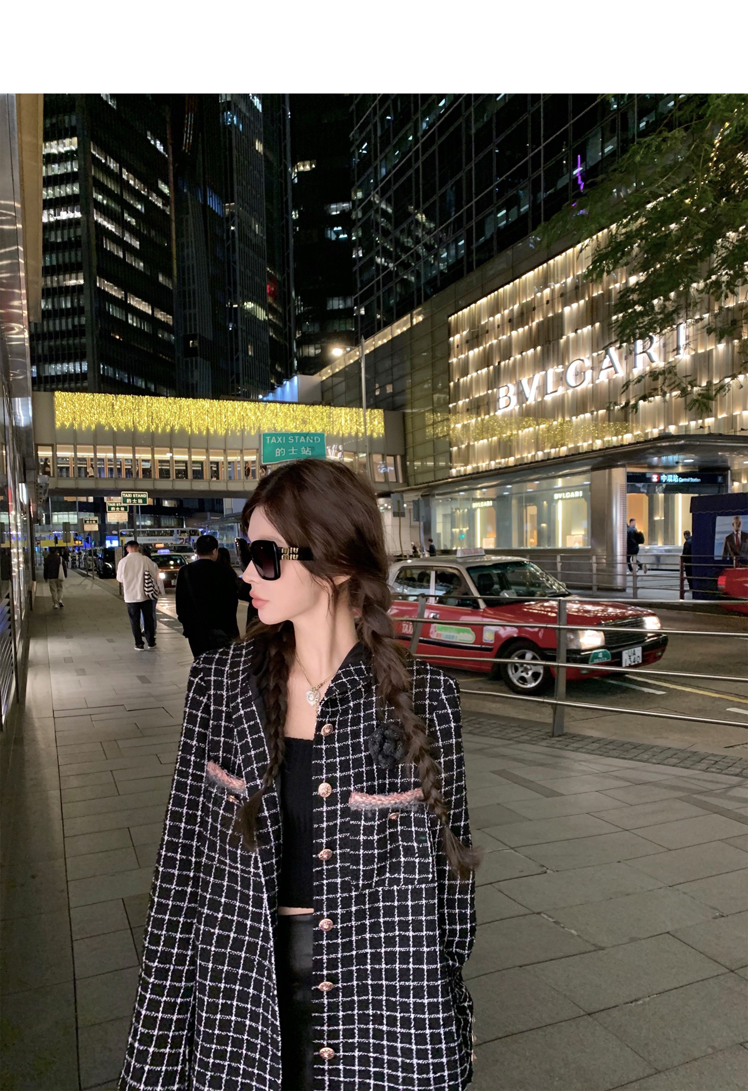 [Small Quantity in Stock] Chicyou Black Plaid Hooded Thin Tweed Versatile Chanel-Style Jacket for Women