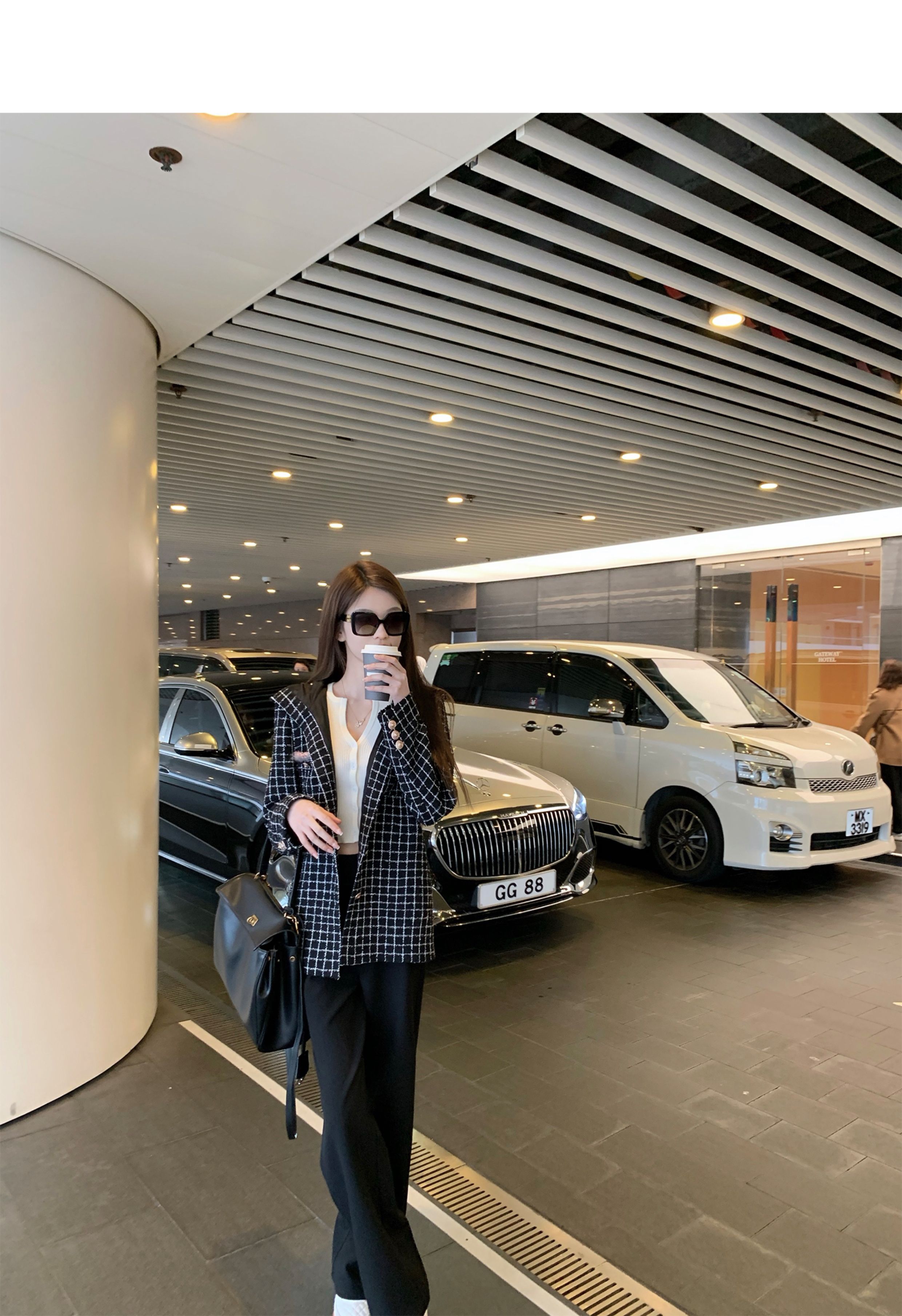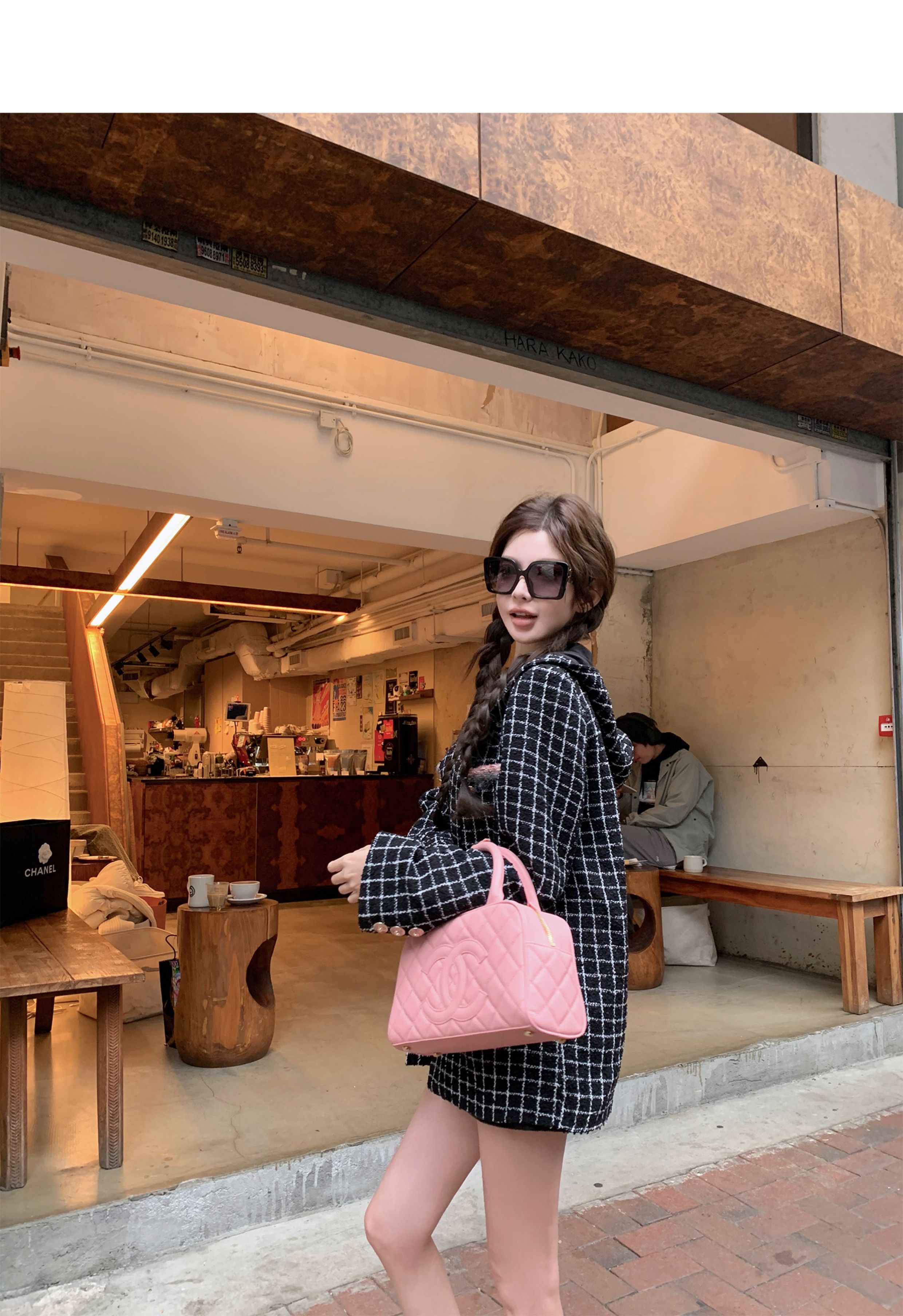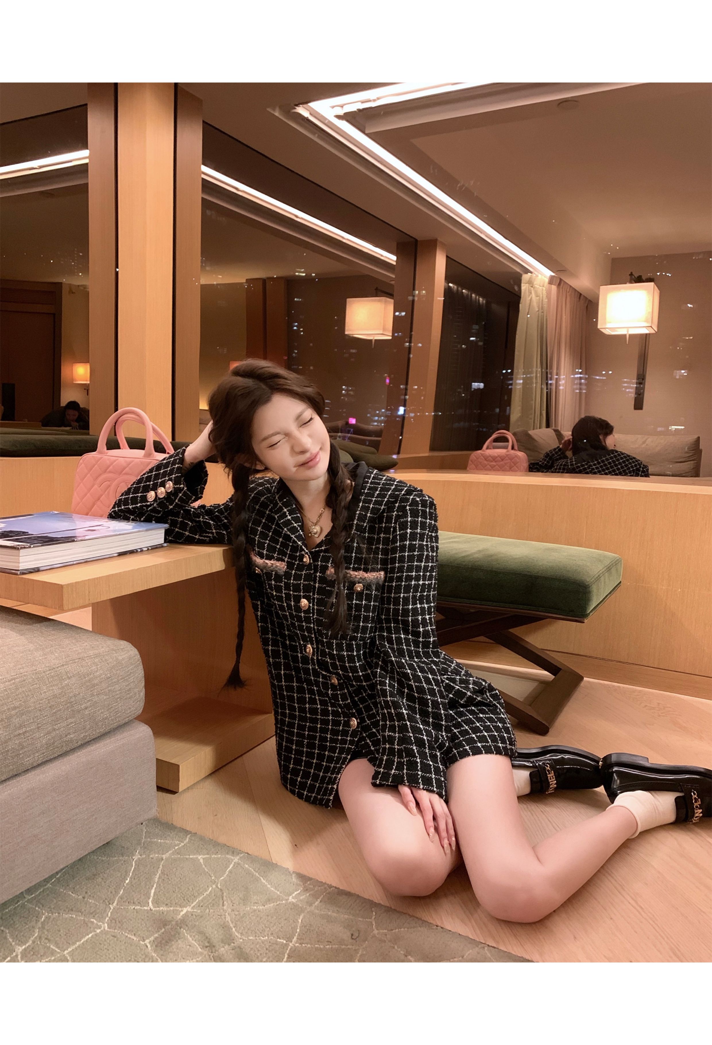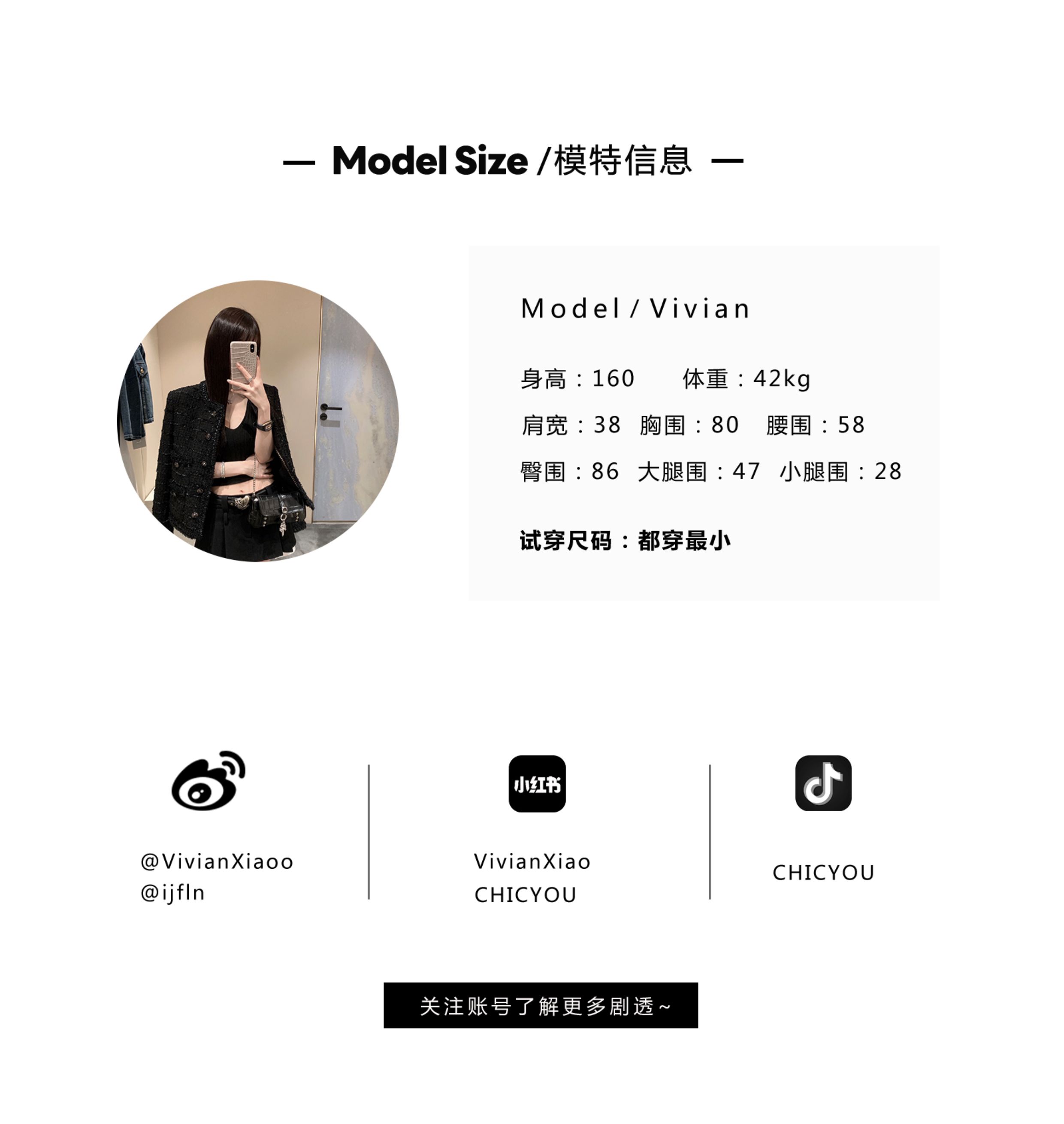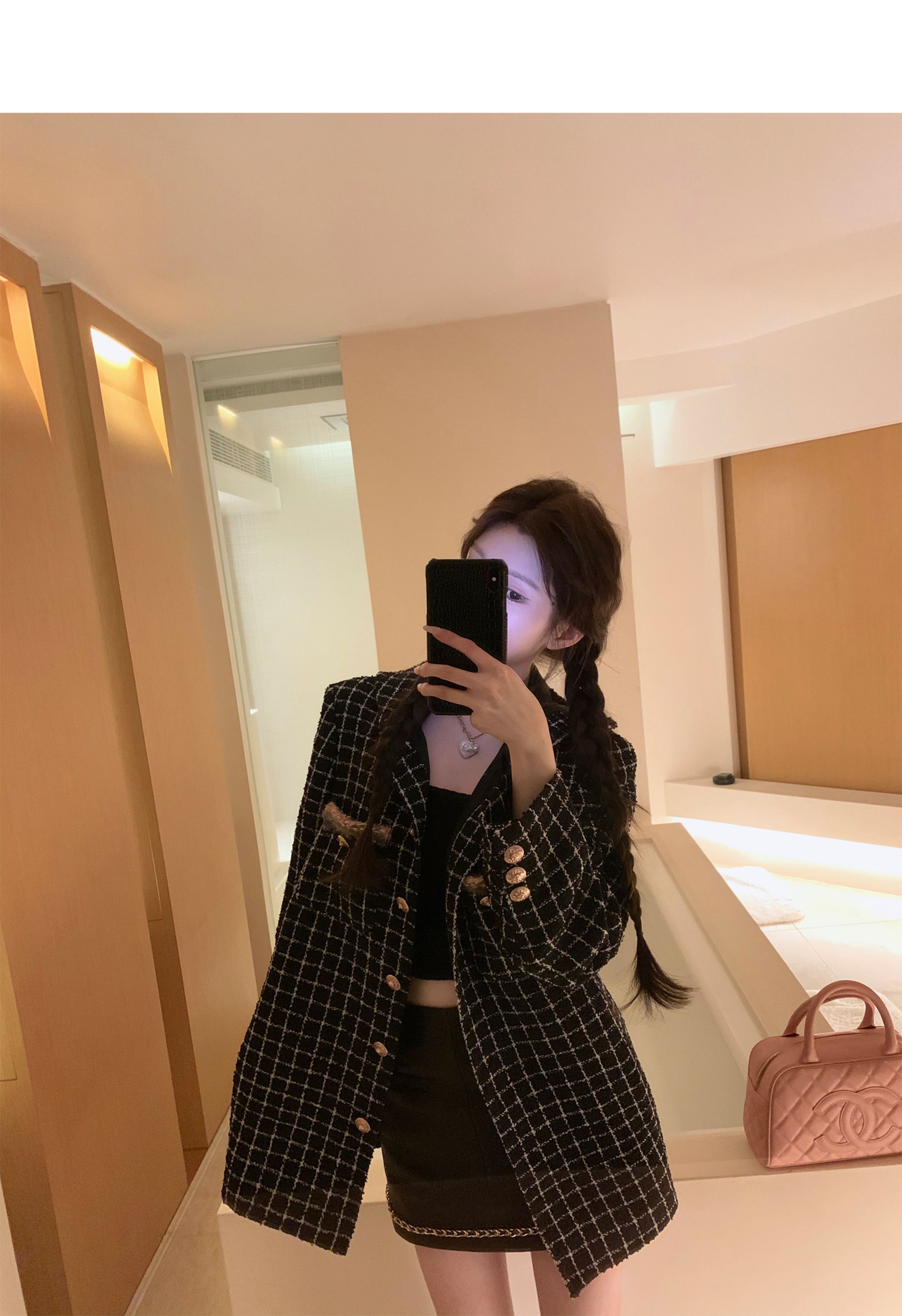 [Small Quantity in Stock] Chicyou Black Plaid Hooded Thin Tweed Versatile Chanel-Style Jacket for Women