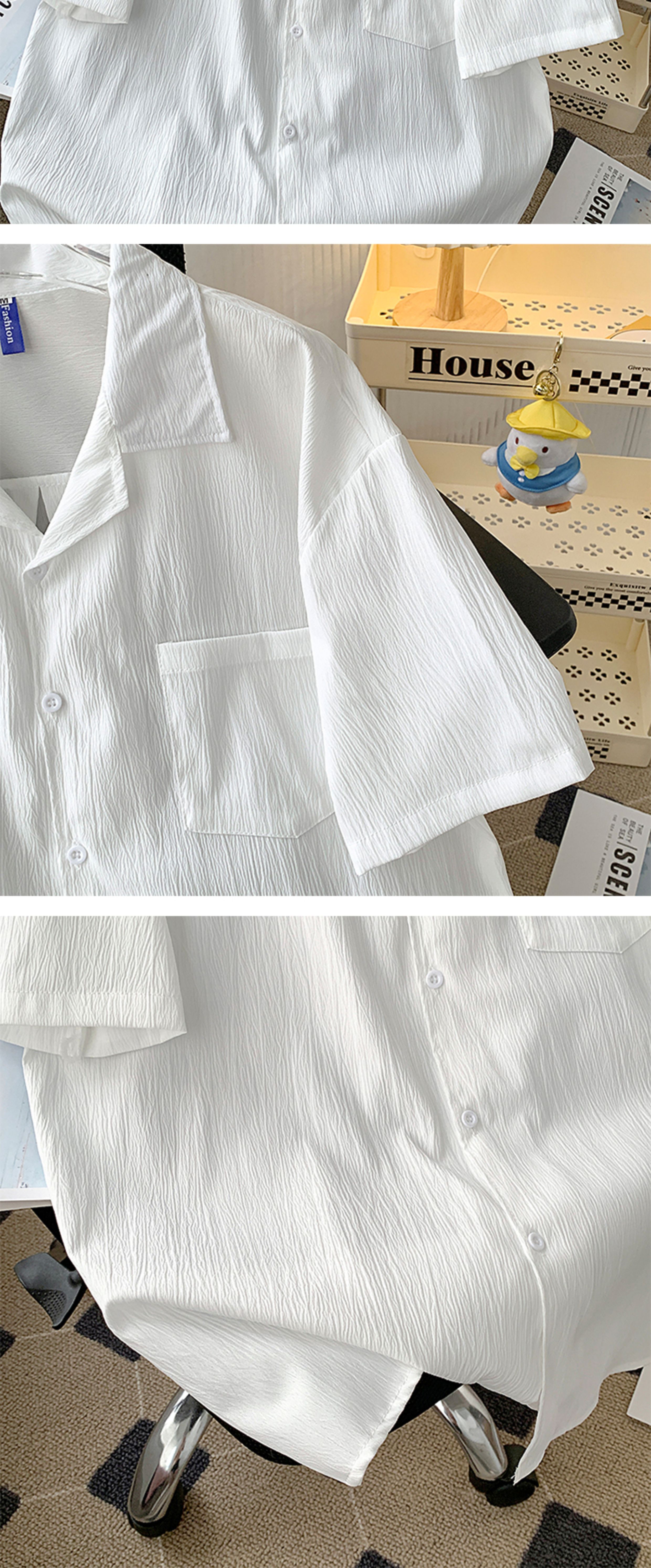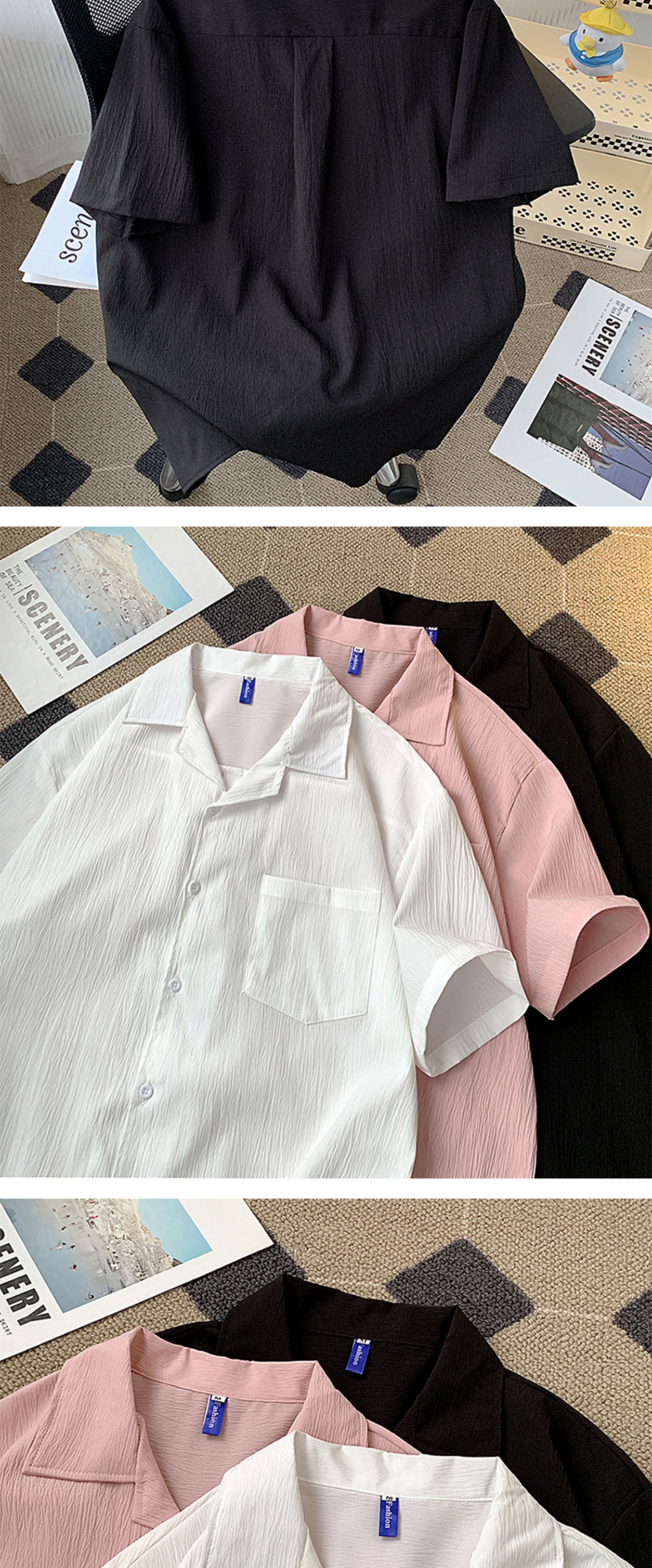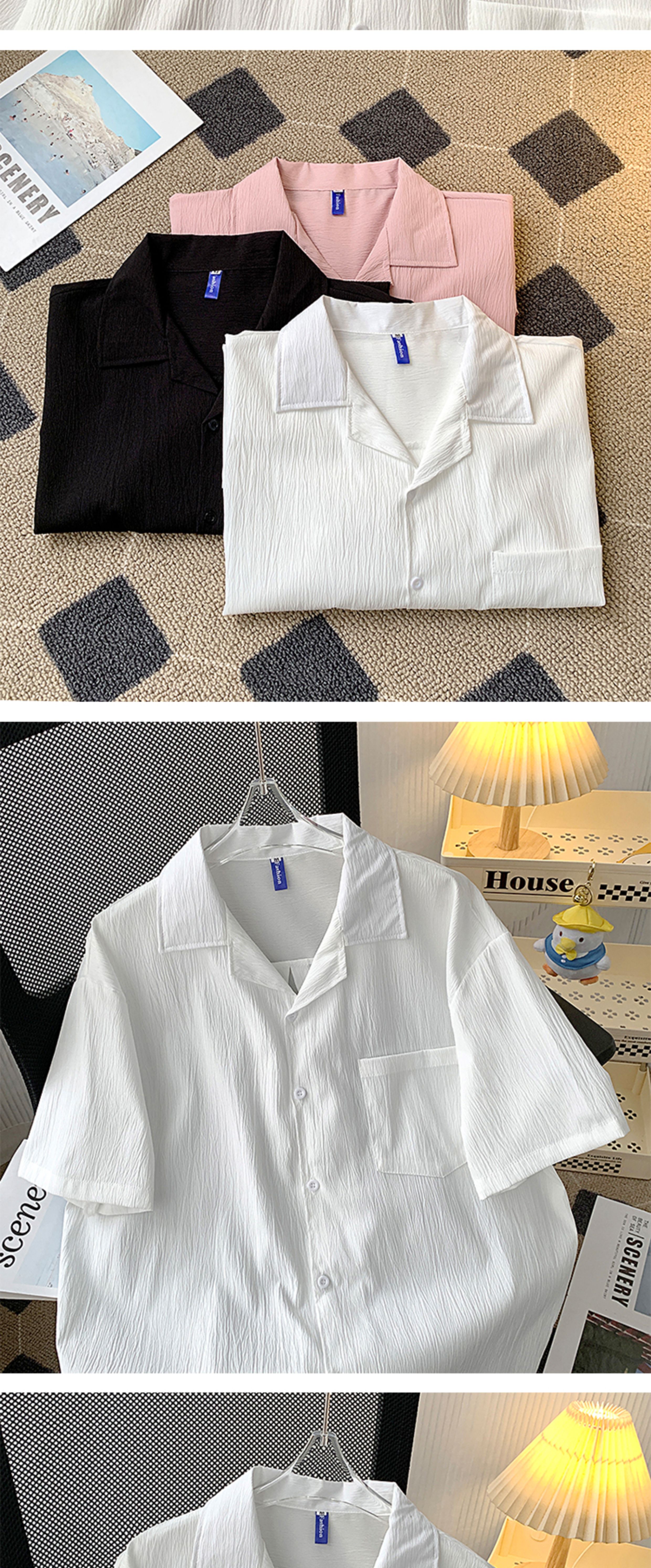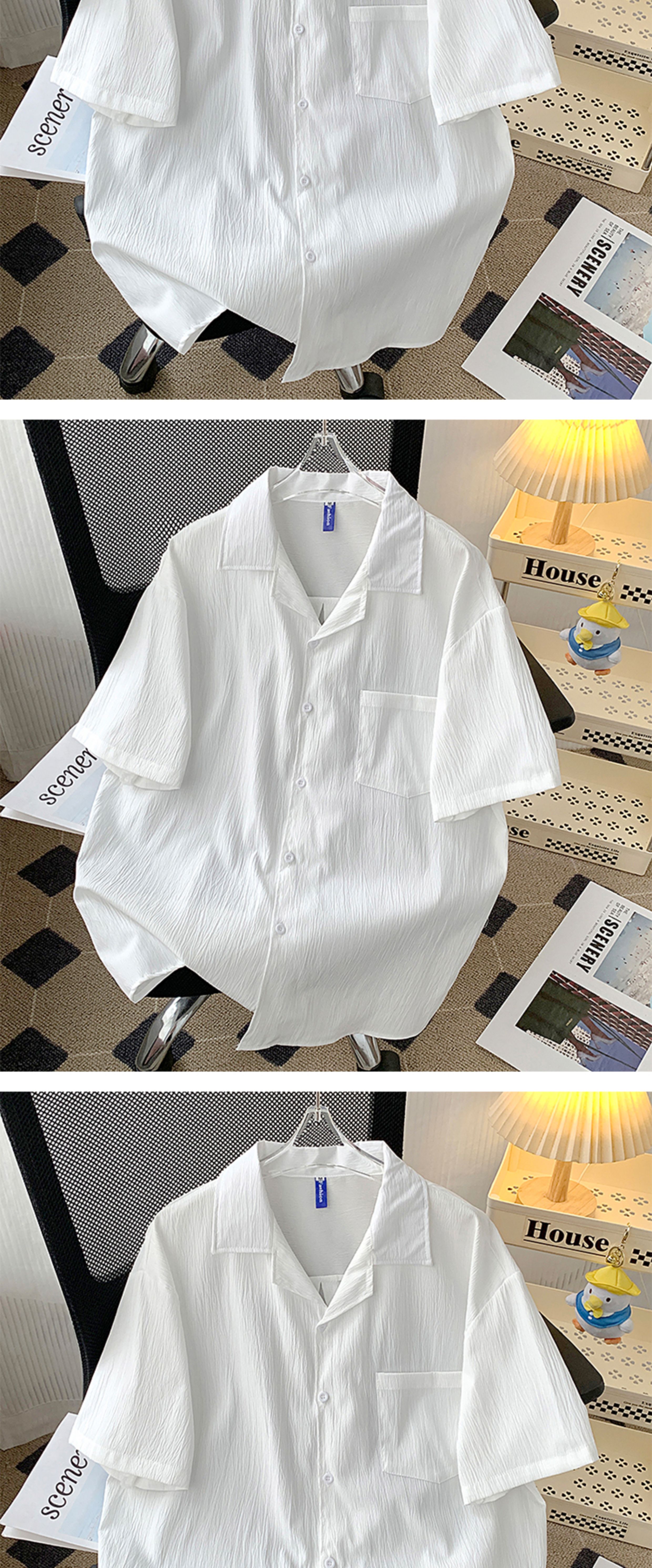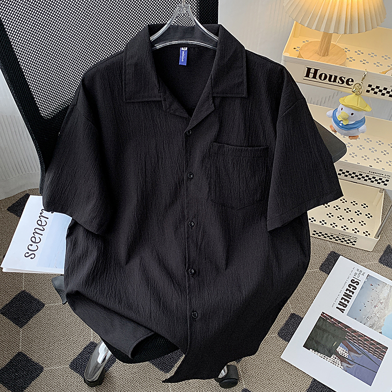 Trendy New Chinese Style Ice Silk Pleated Short-Sleeved Cuban Collar Shirt for Men, Solid Color Summer Cool Half-Sleeve Casual Shirt