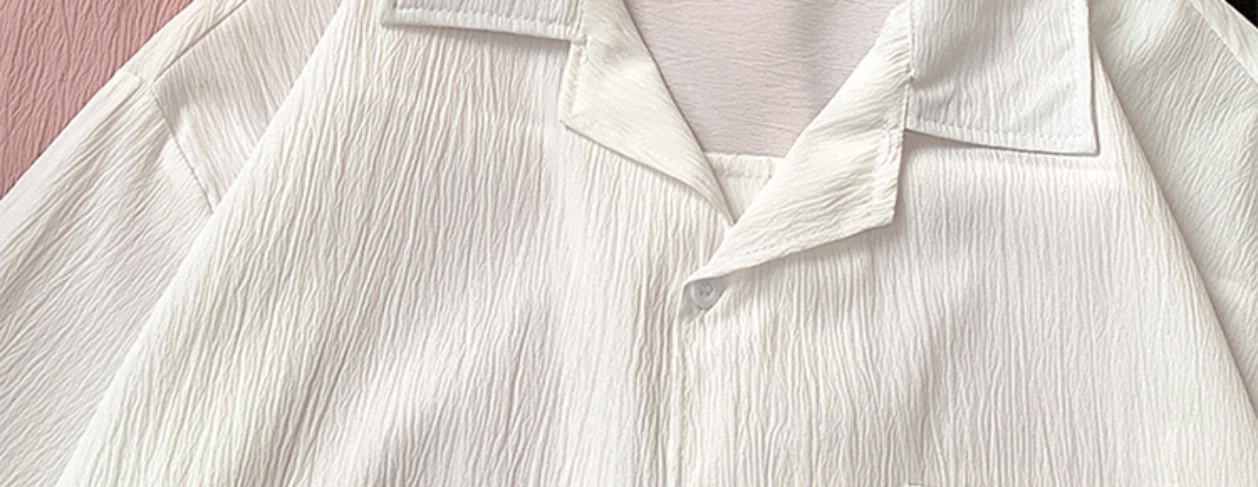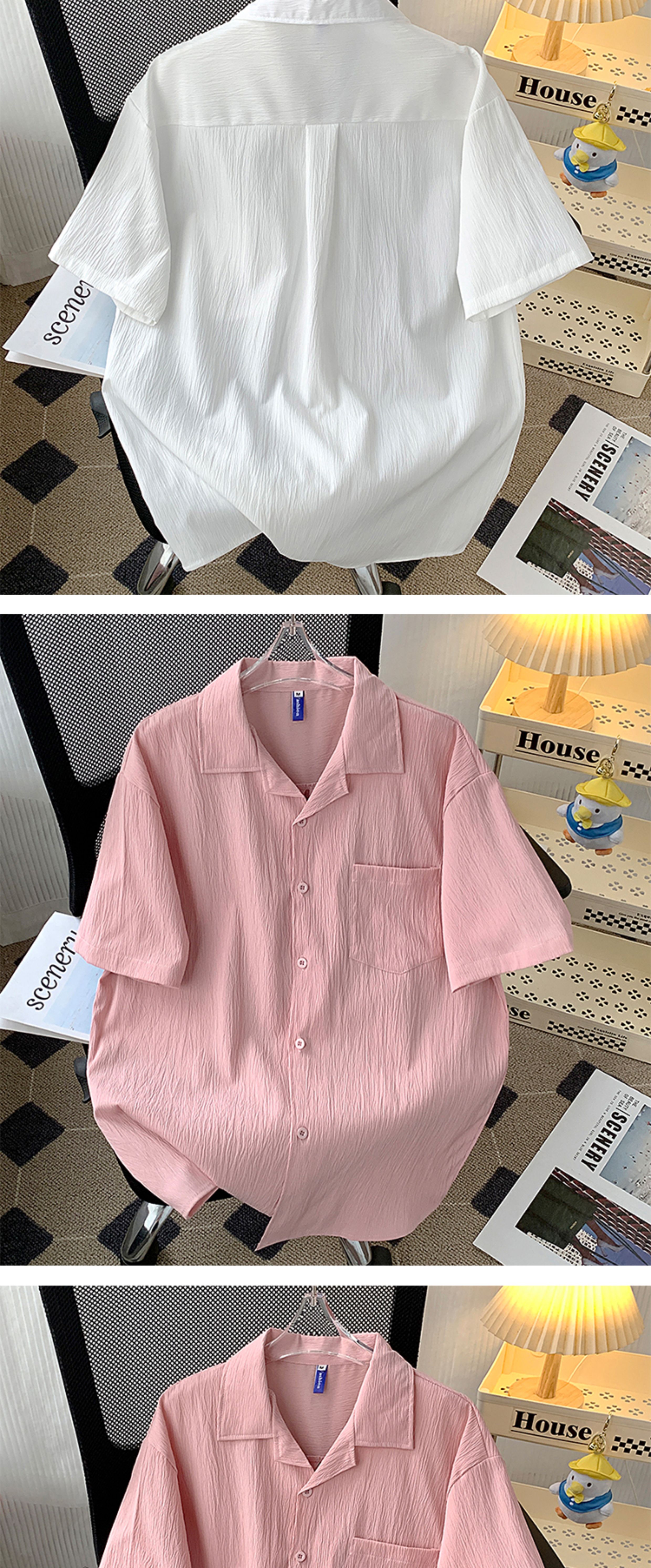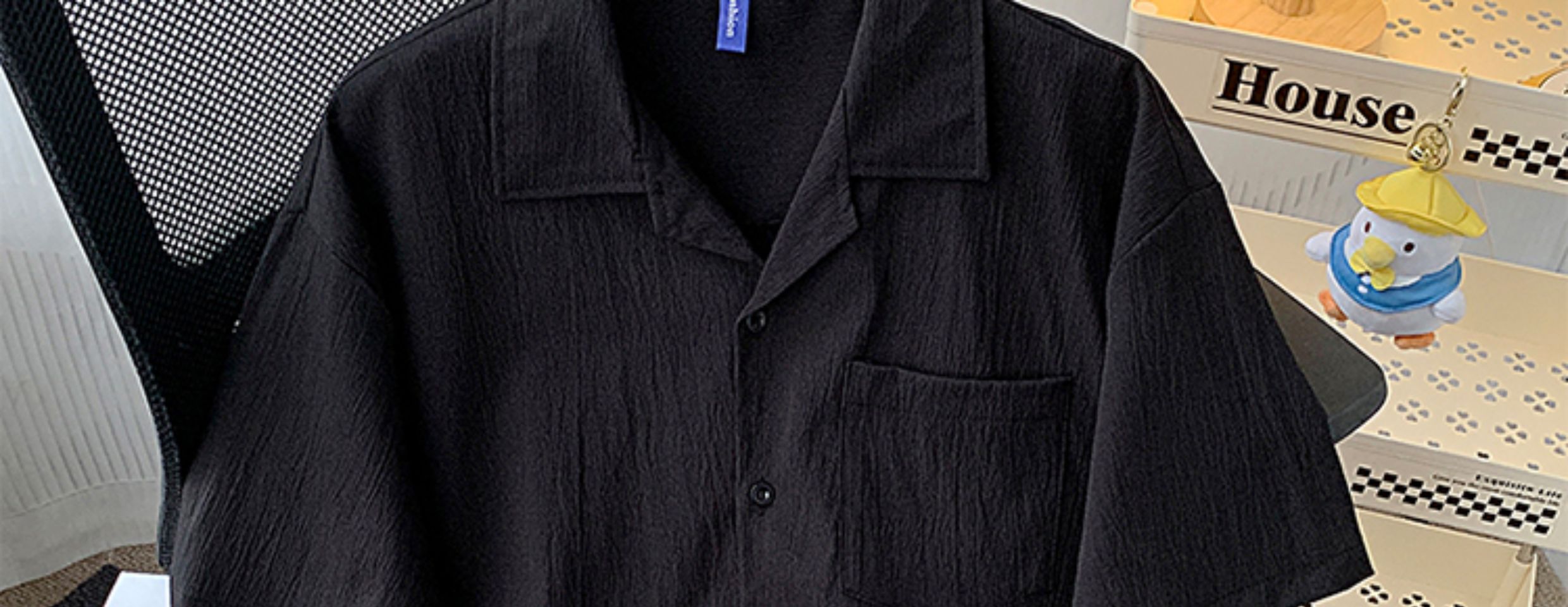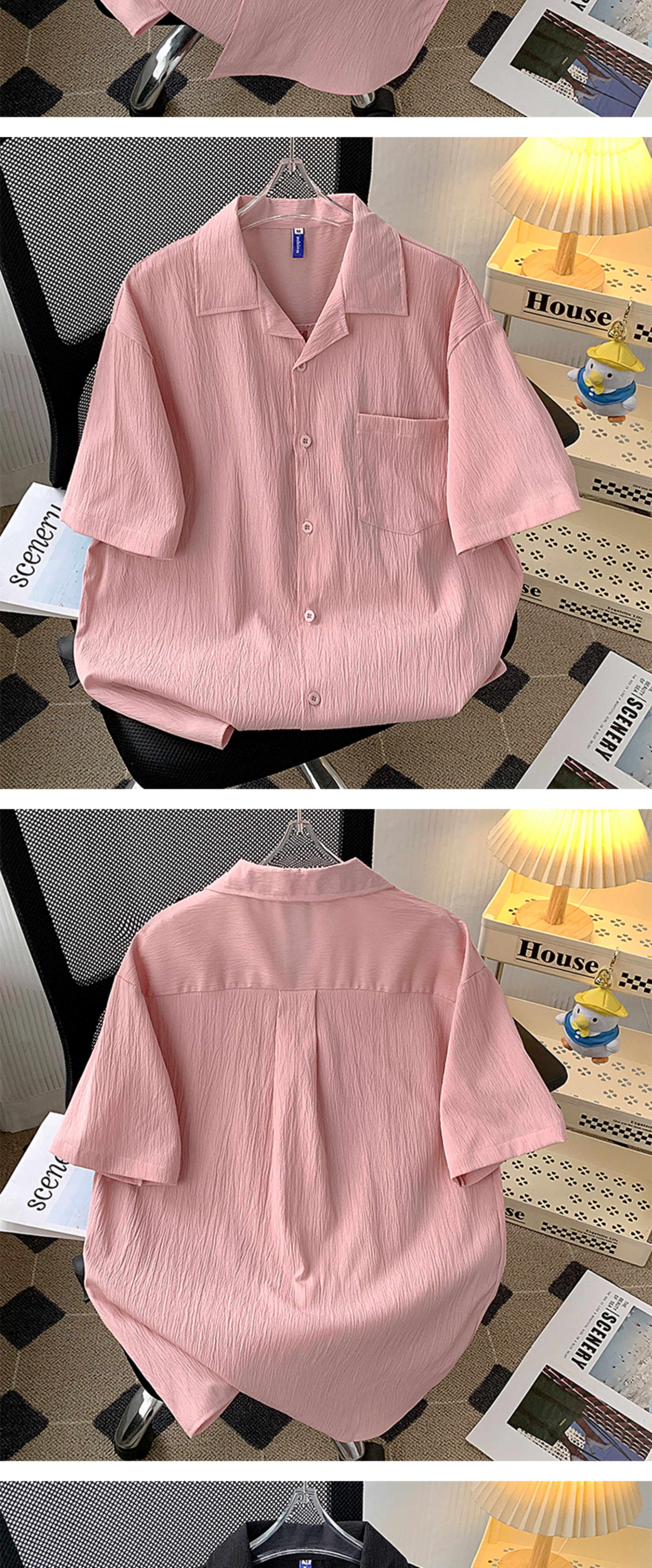 Trendy New Chinese Style Ice Silk Pleated Short-Sleeved Cuban Collar Shirt for Men, Solid Color Summer Cool Half-Sleeve Casual Shirt