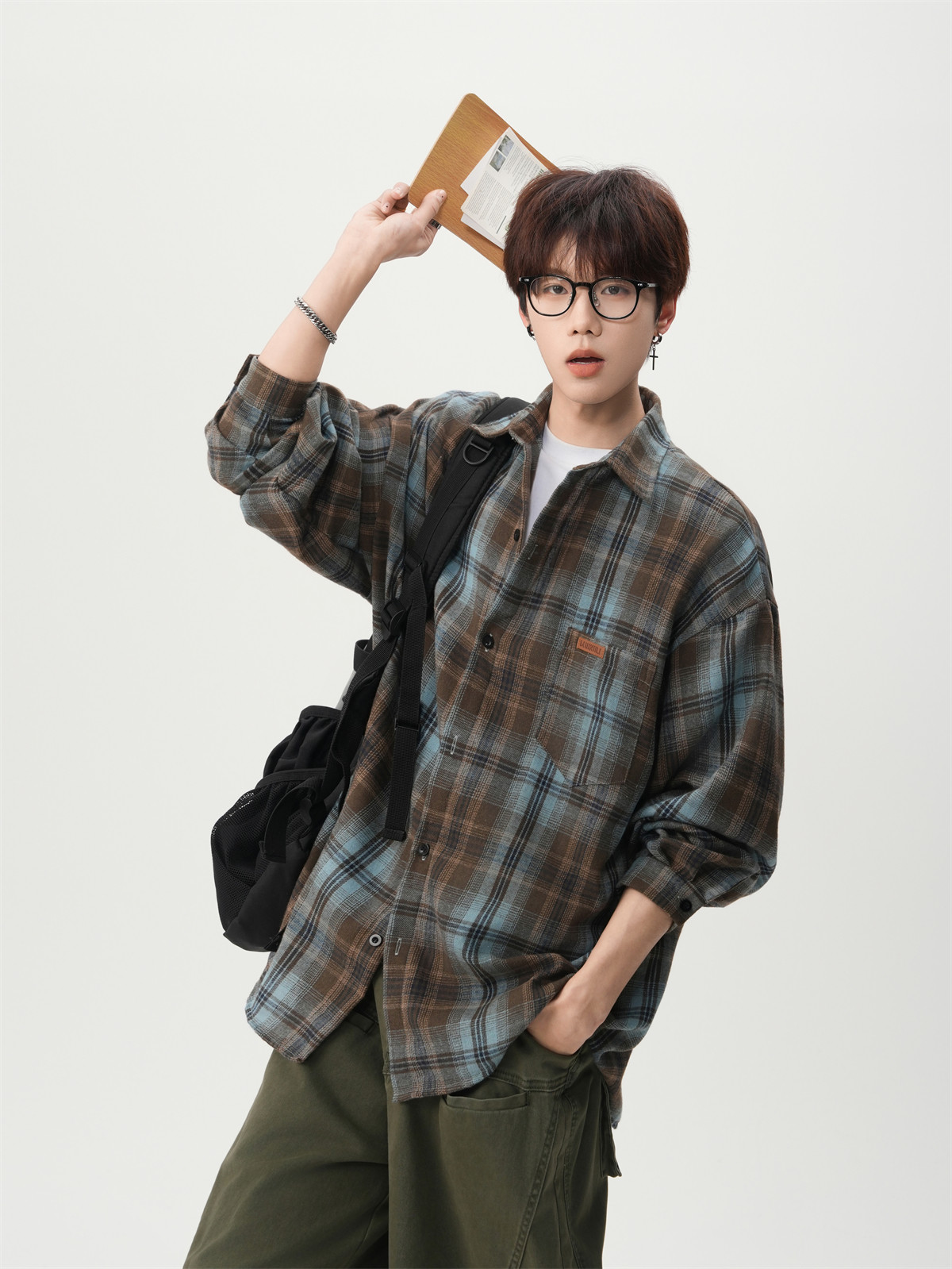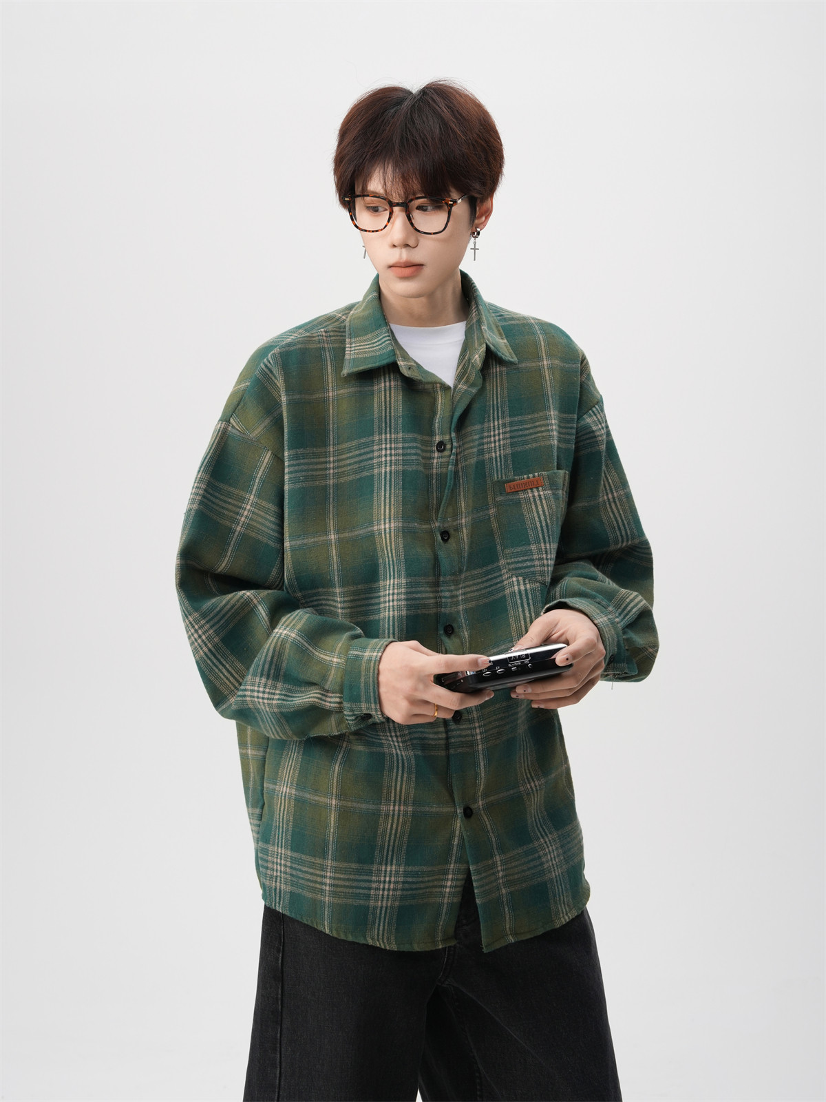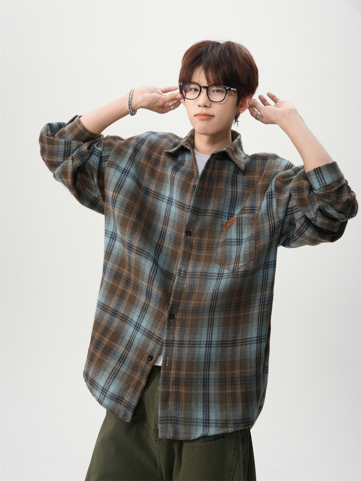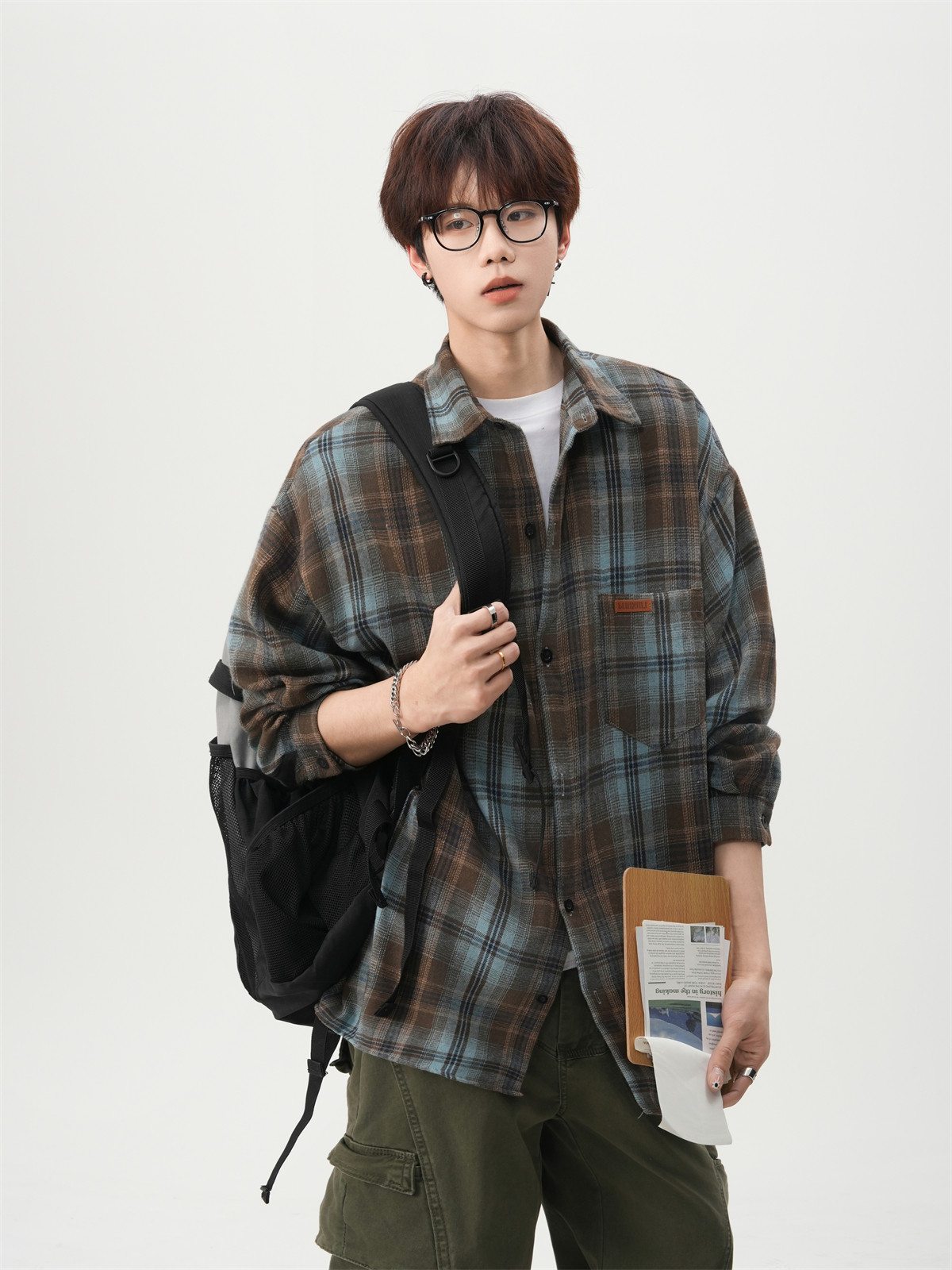 American Retro Color-Block Plaid Shirt for Men, Autumn Trendy Brand Cleanfit, Casual Loose-Fitting Versatile Jacket