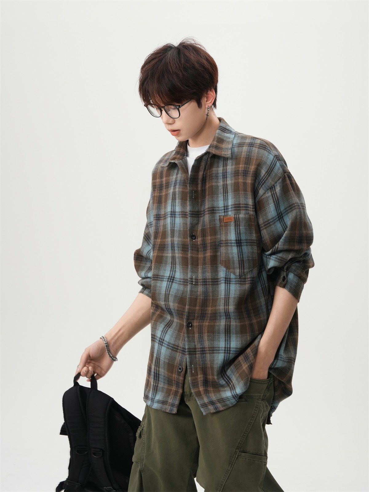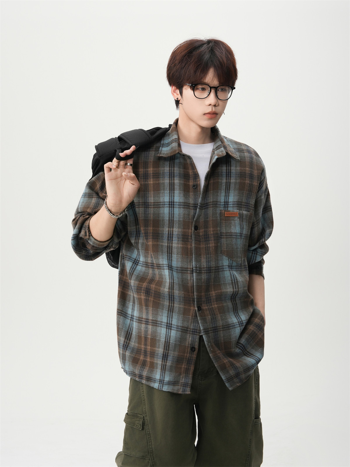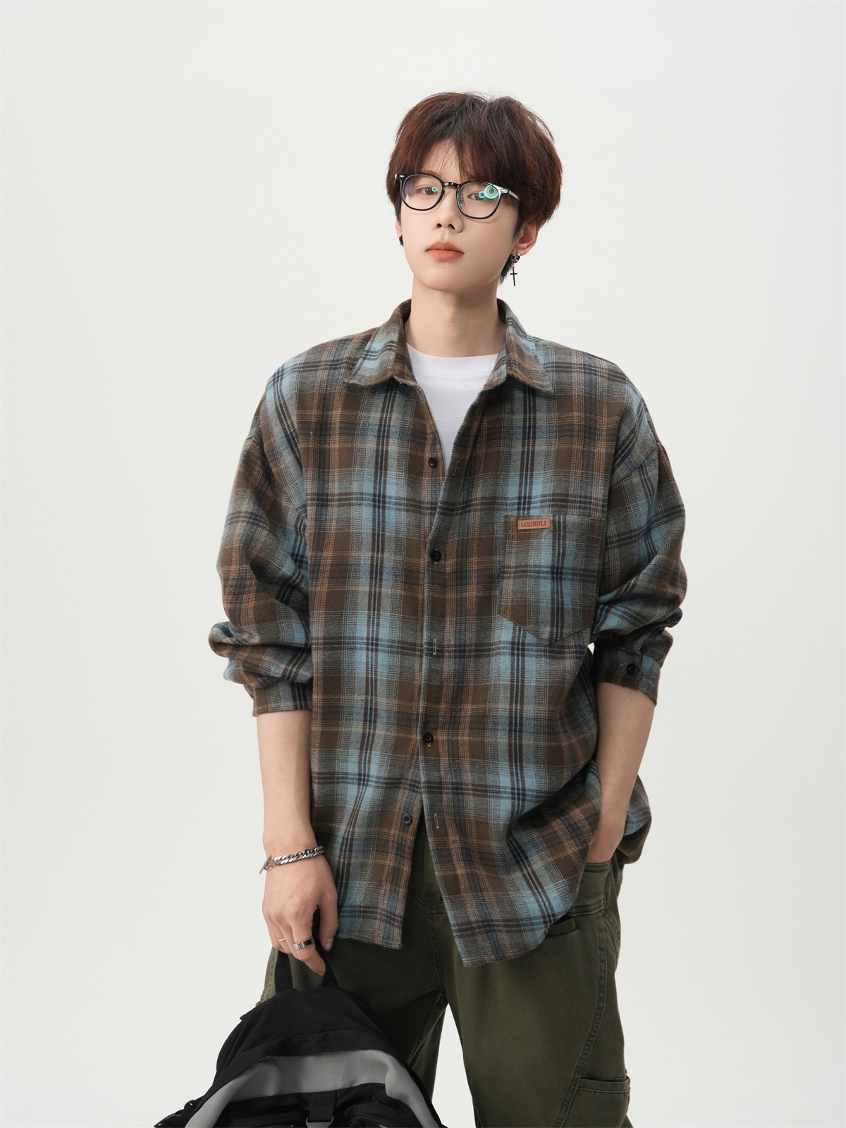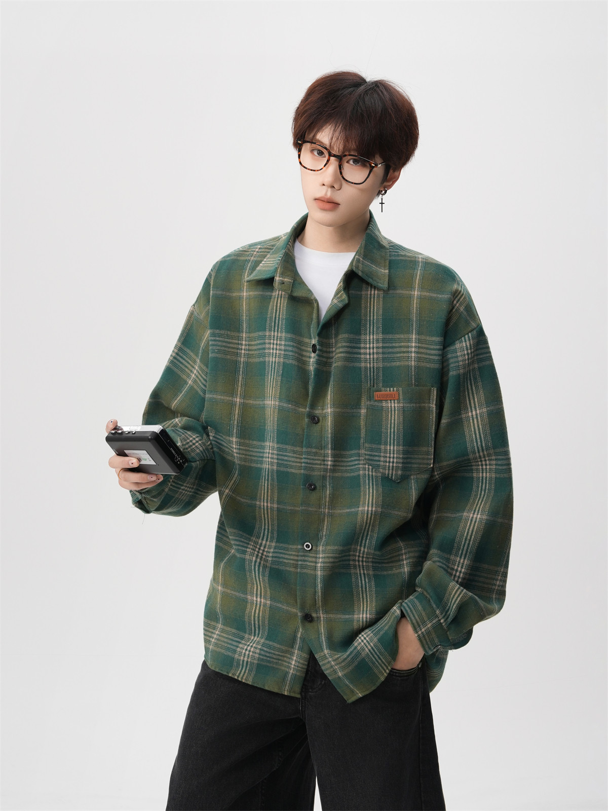 American Retro Color-Block Plaid Shirt for Men, Autumn Trendy Brand Cleanfit, Casual Loose-Fitting Versatile Jacket