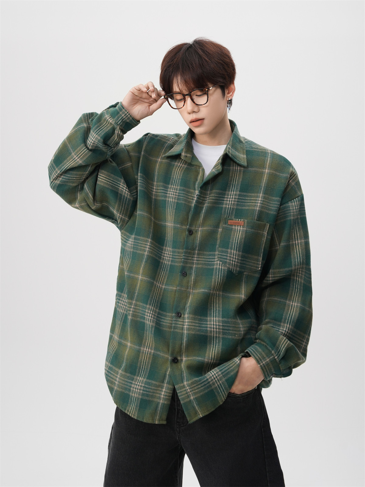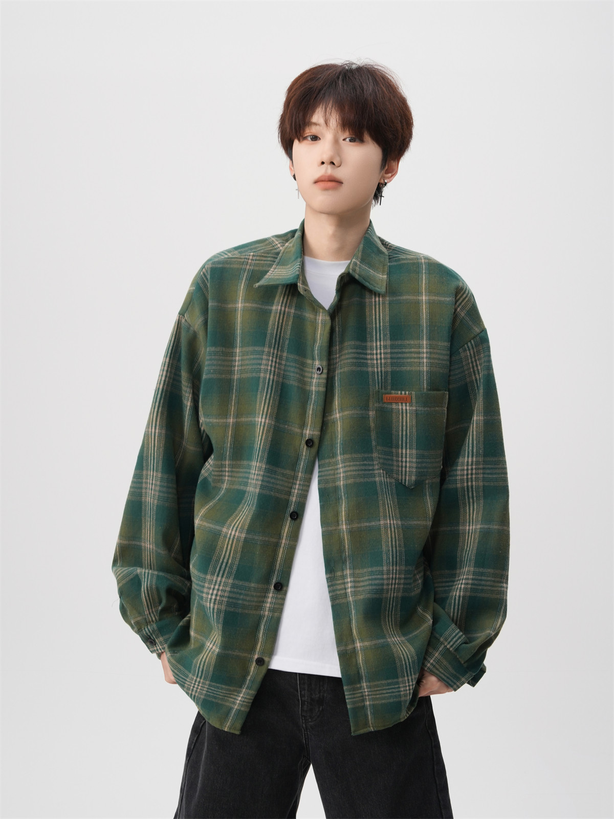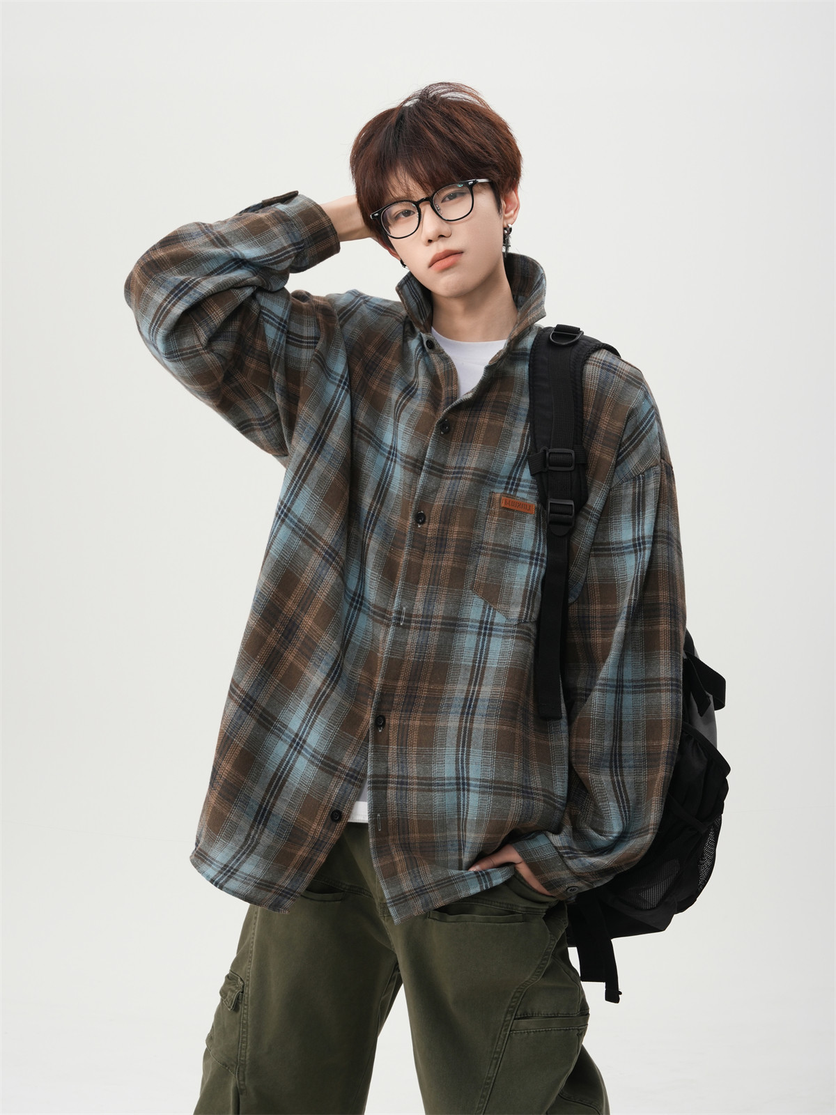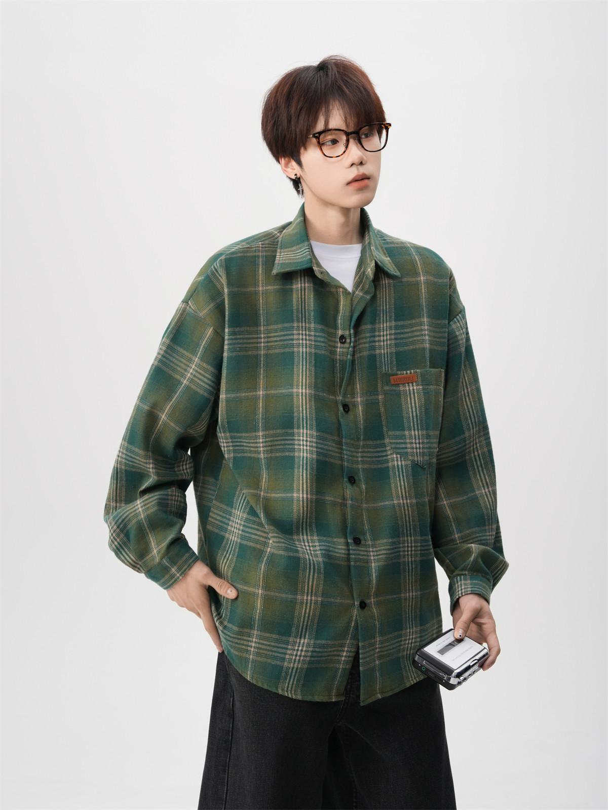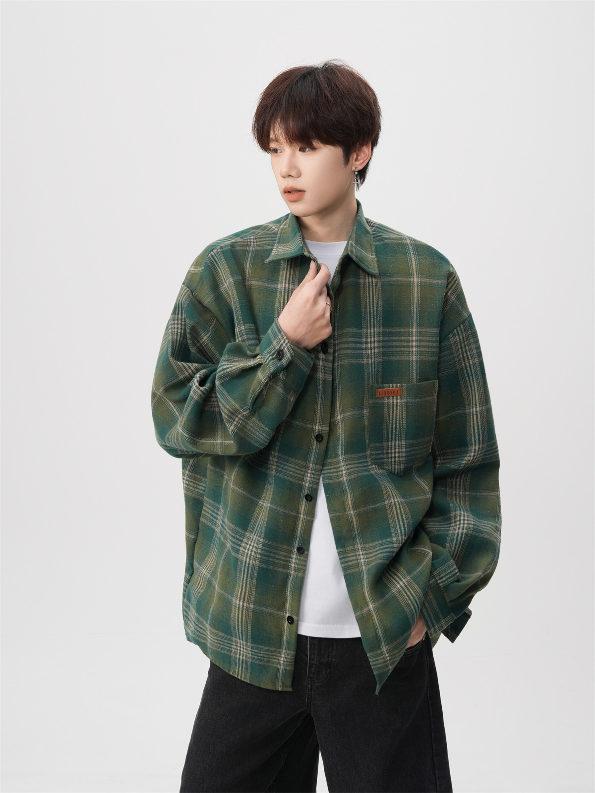 American Retro Color-Block Plaid Shirt for Men, Autumn Trendy Brand Cleanfit, Casual Loose-Fitting Versatile Jacket