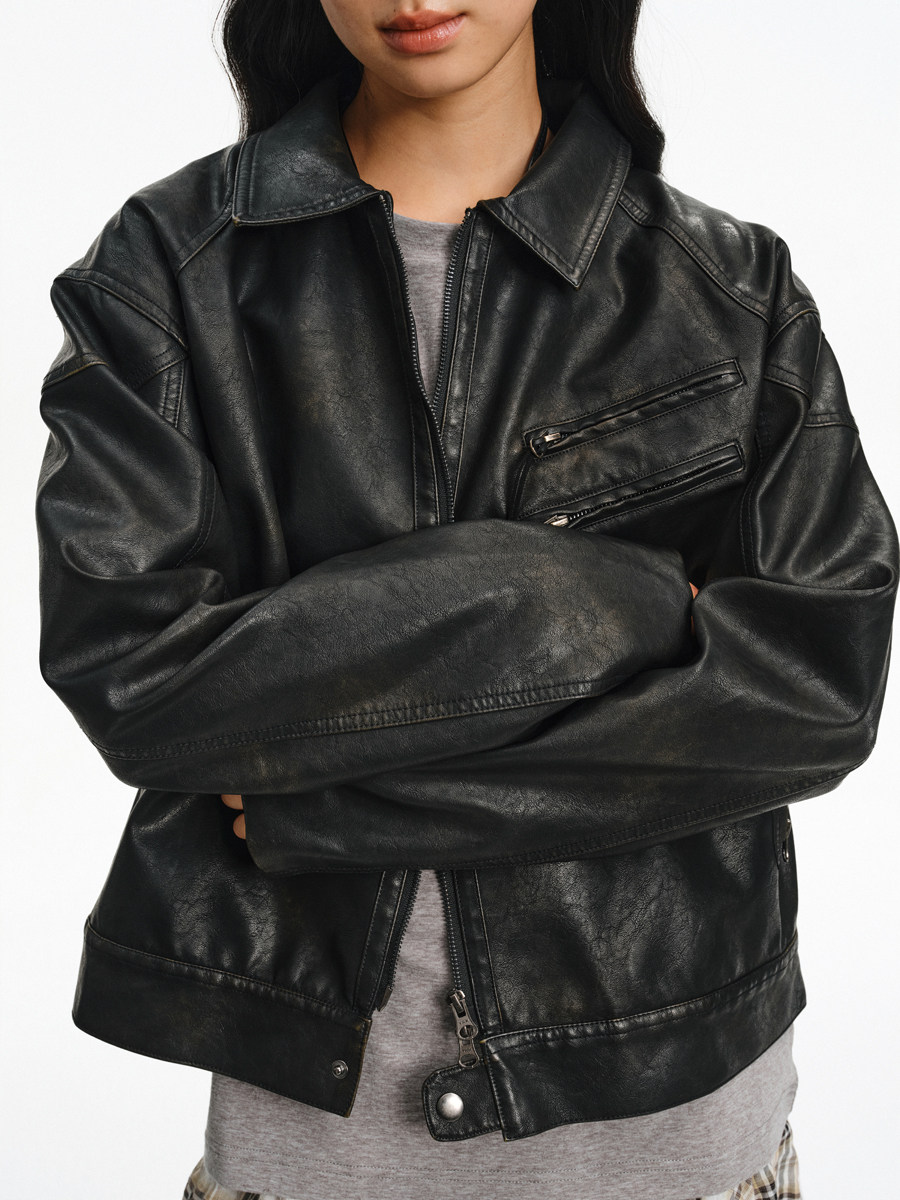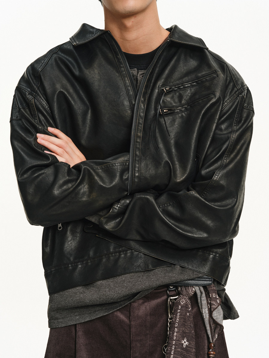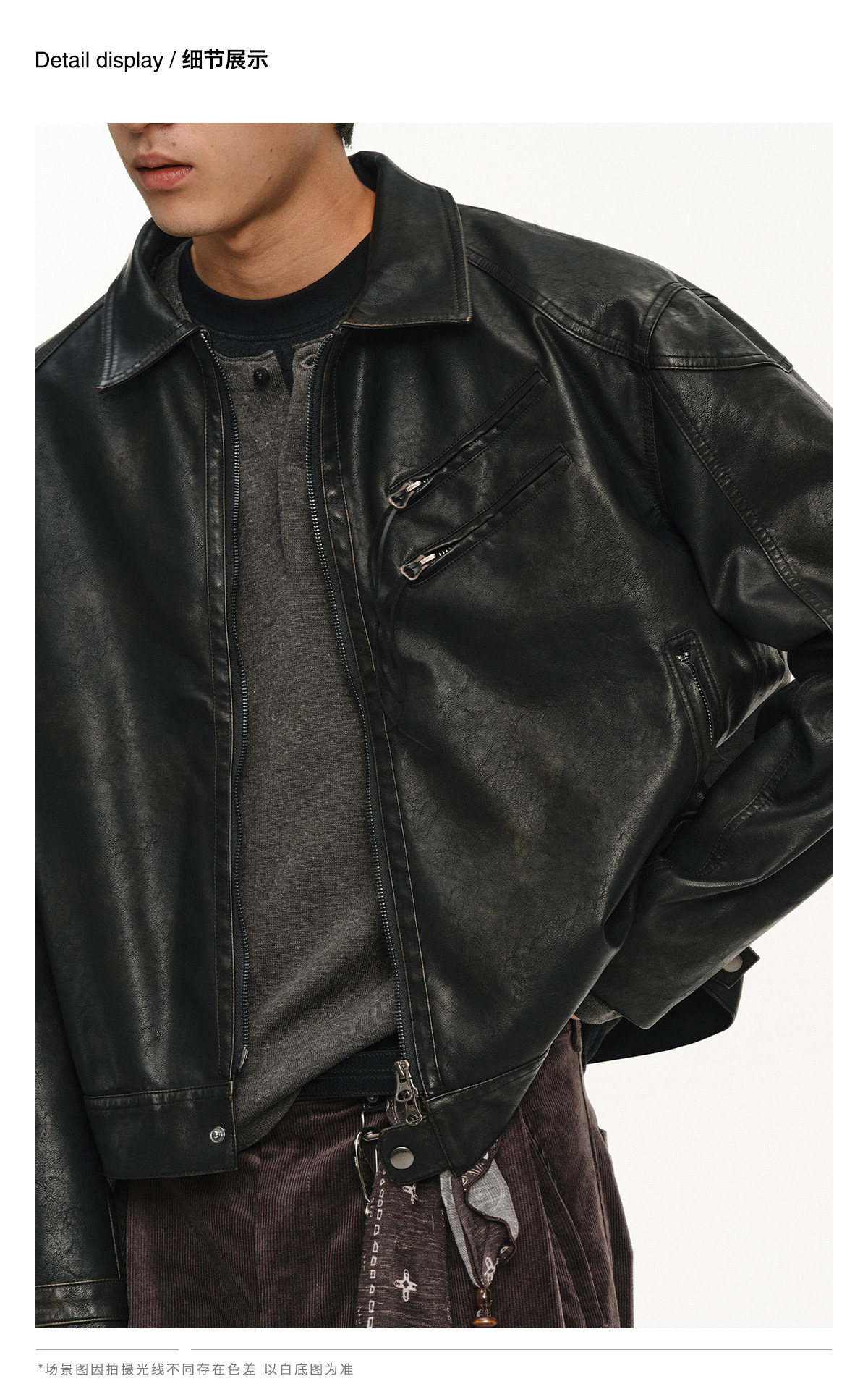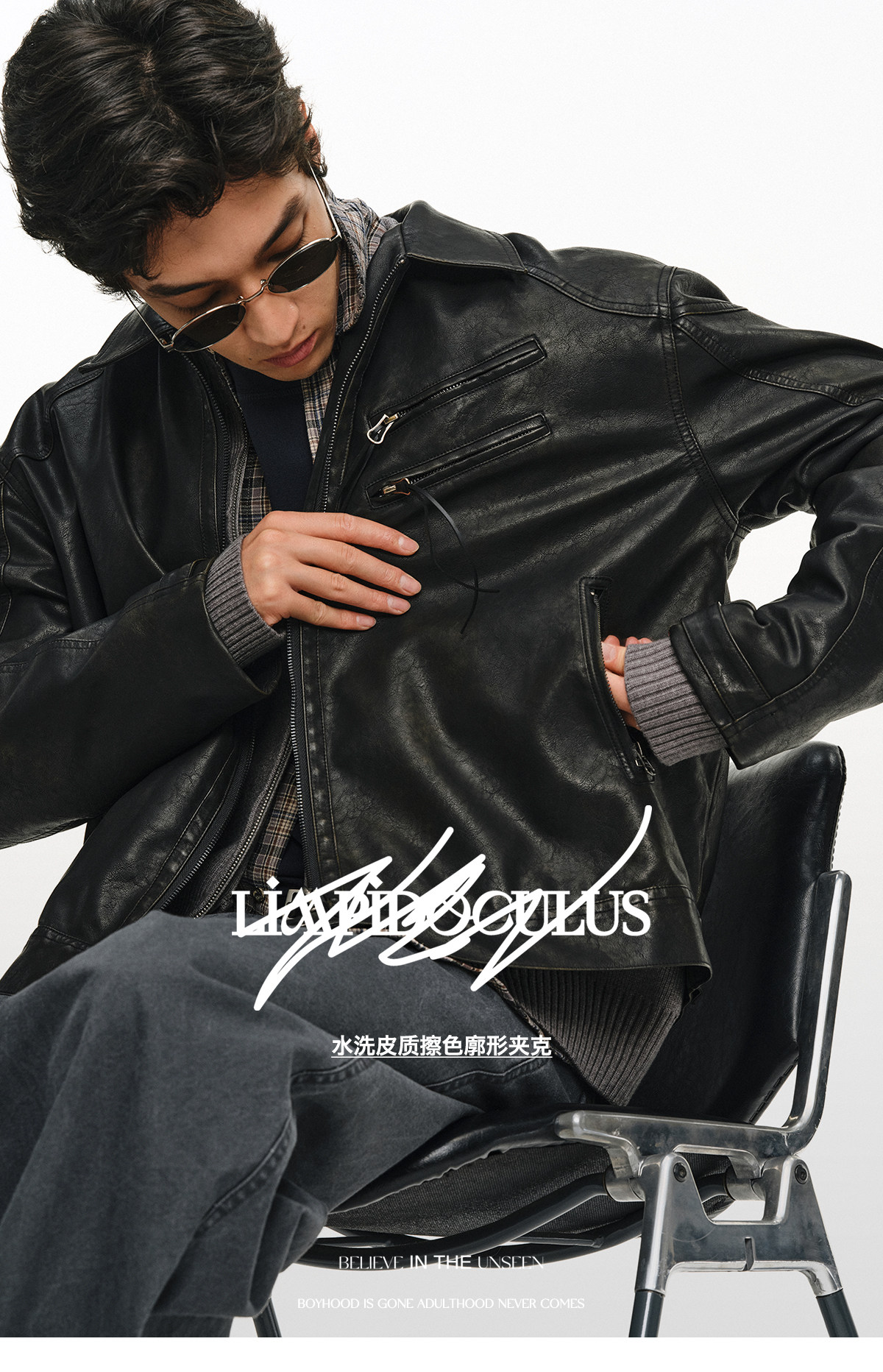 Limpidoculus Multi-Pocket Washed Leather Silhouette Jacket, Color-Washed Leather Jacket