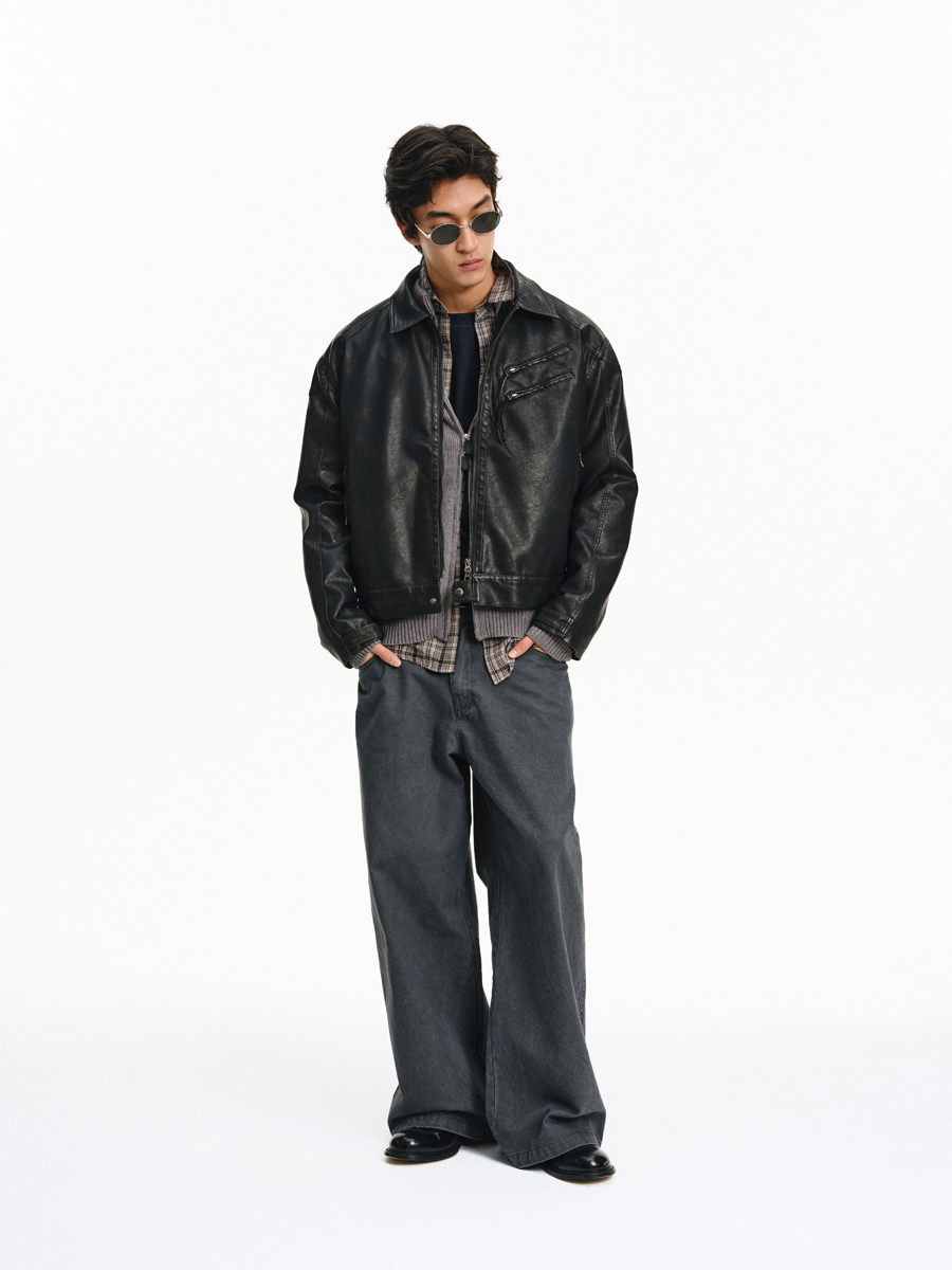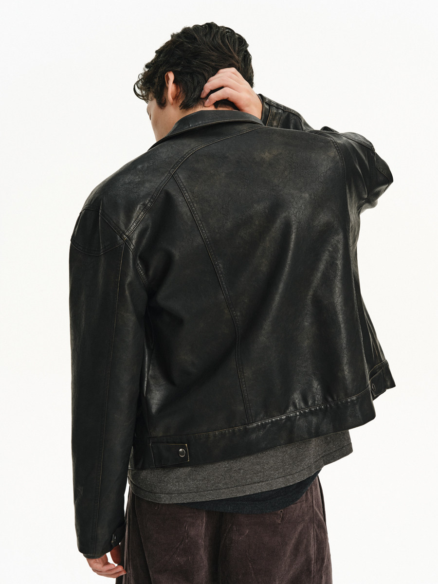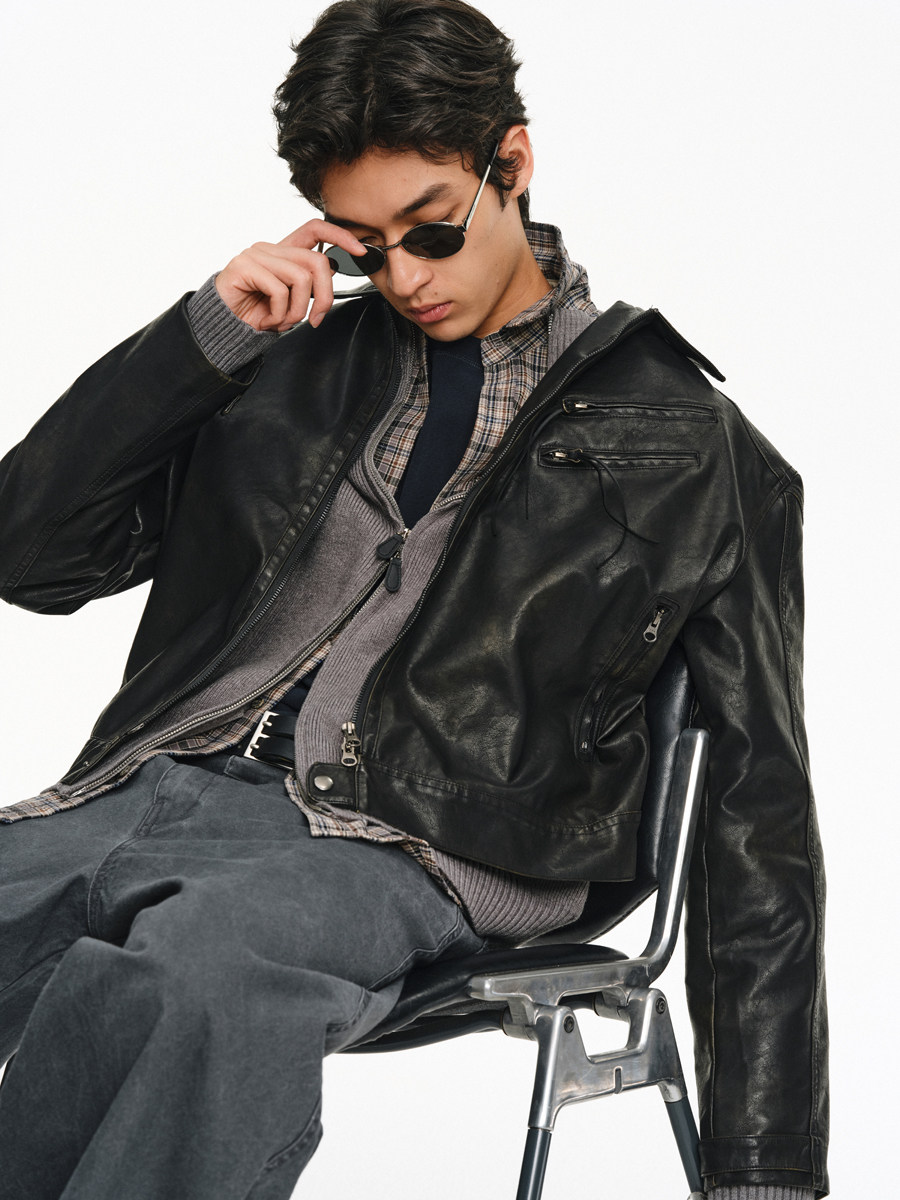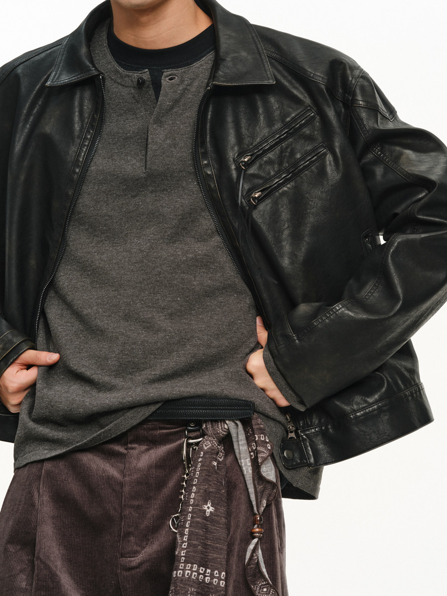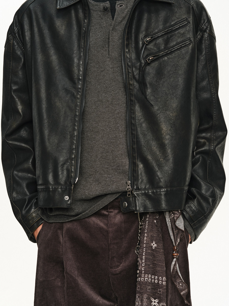 Limpidoculus Multi-Pocket Washed Leather Silhouette Jacket, Color-Washed Leather Jacket