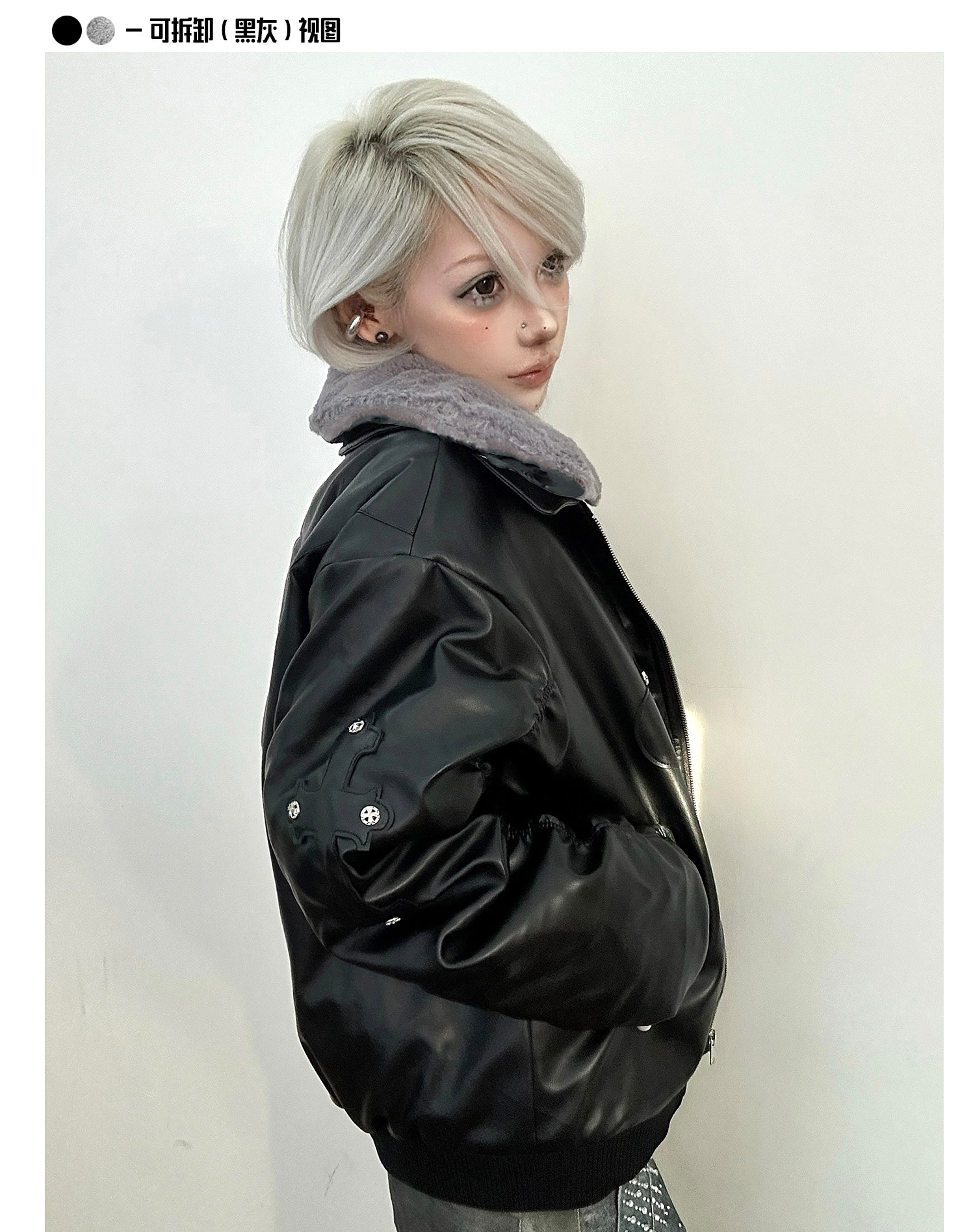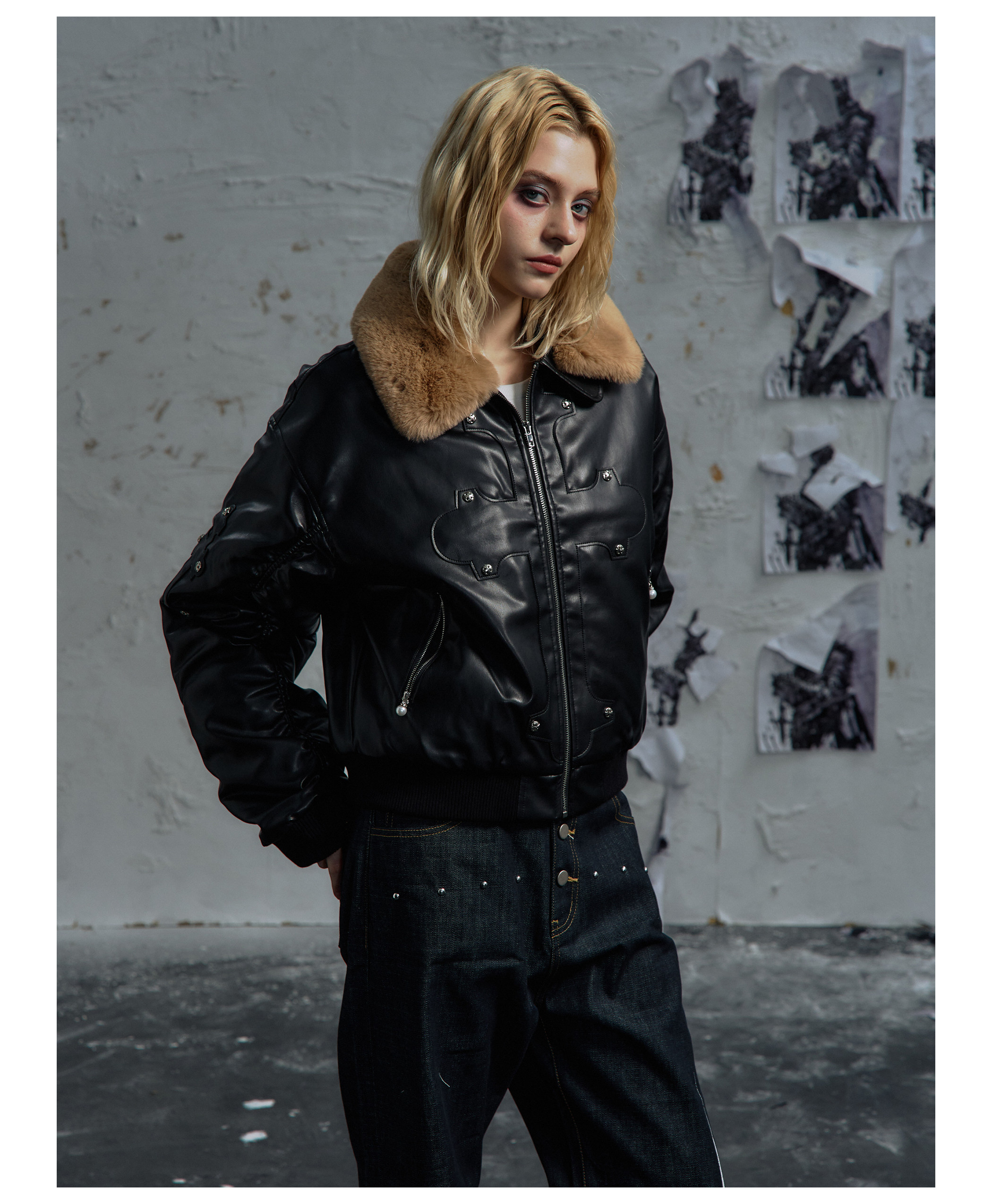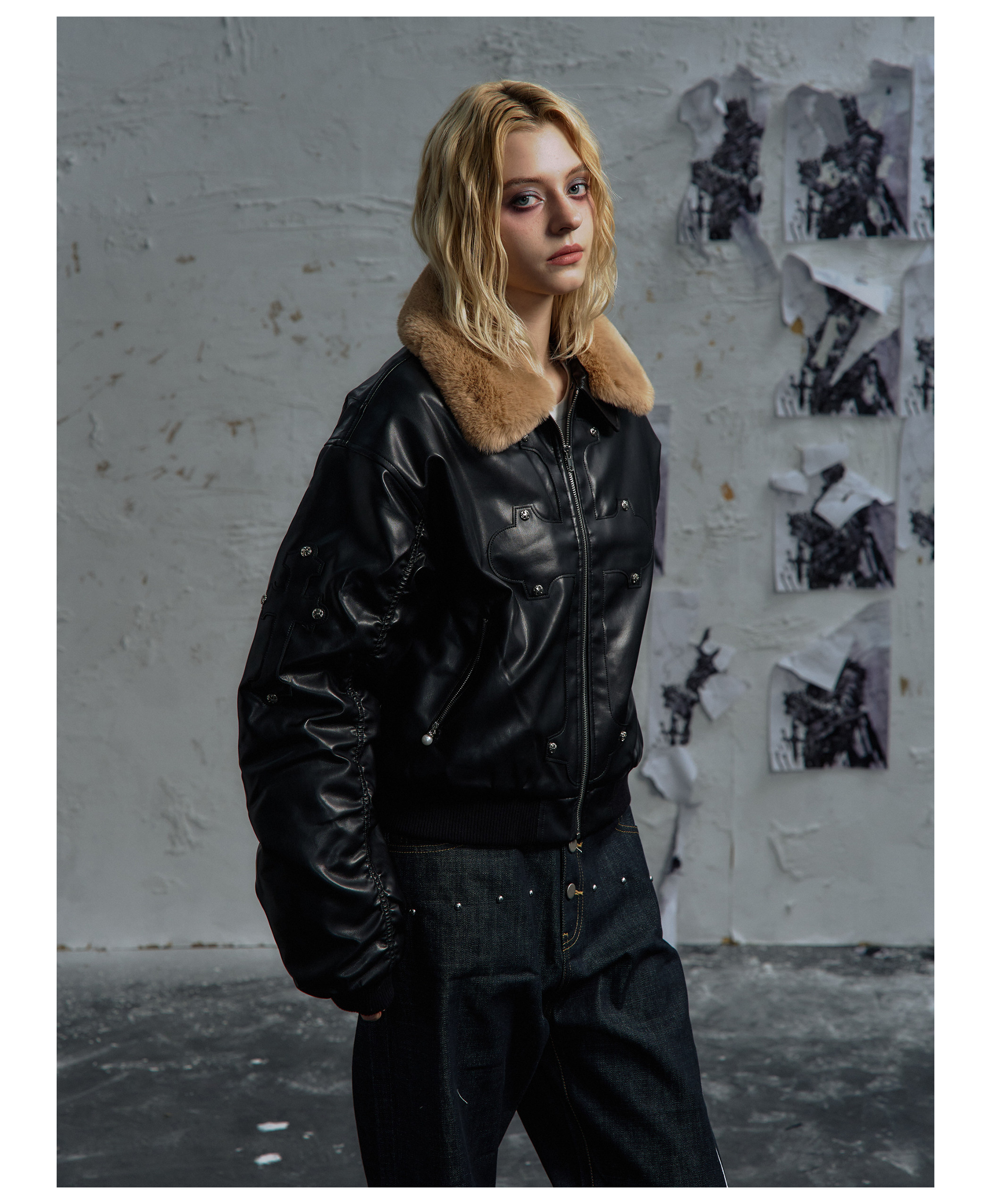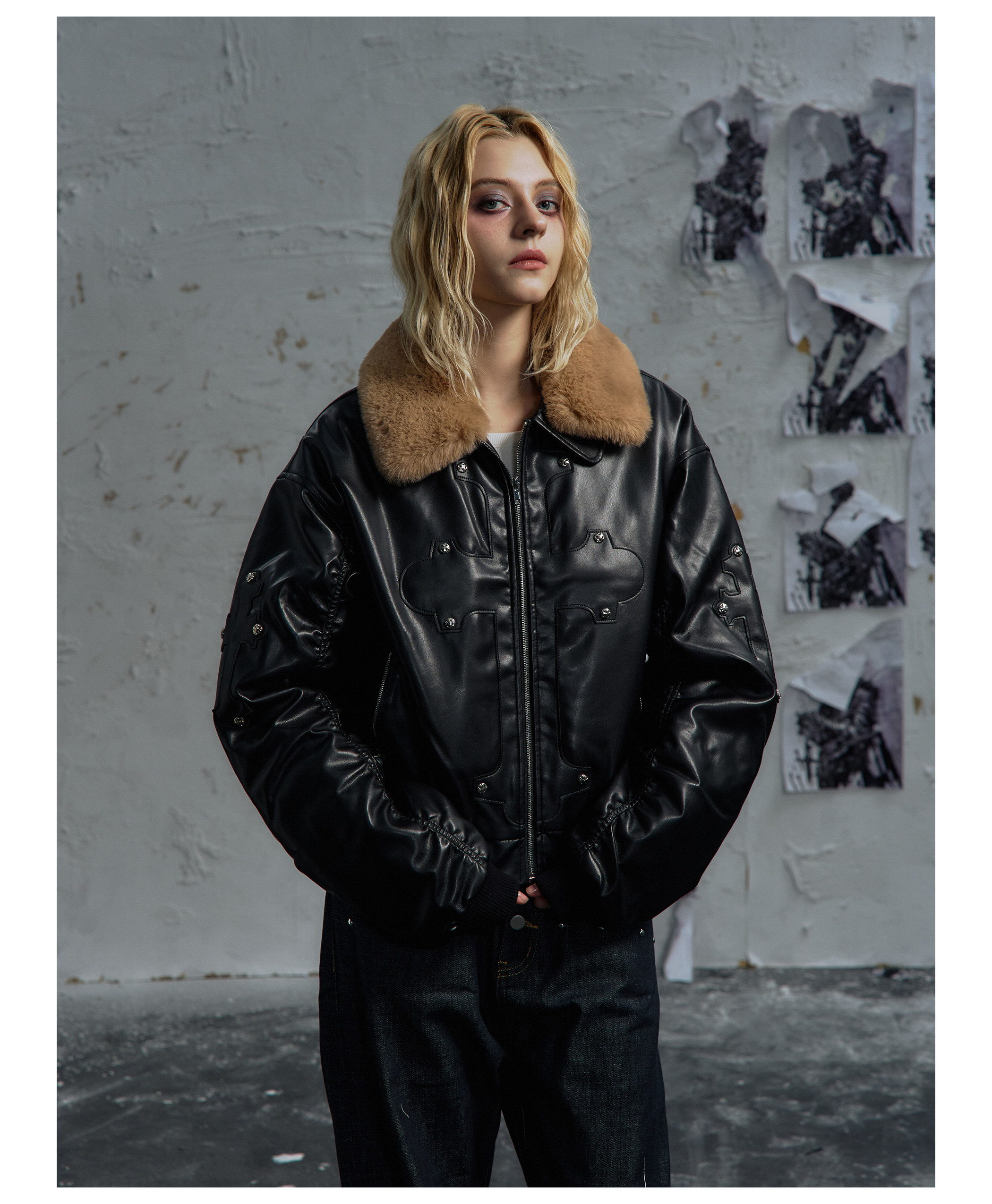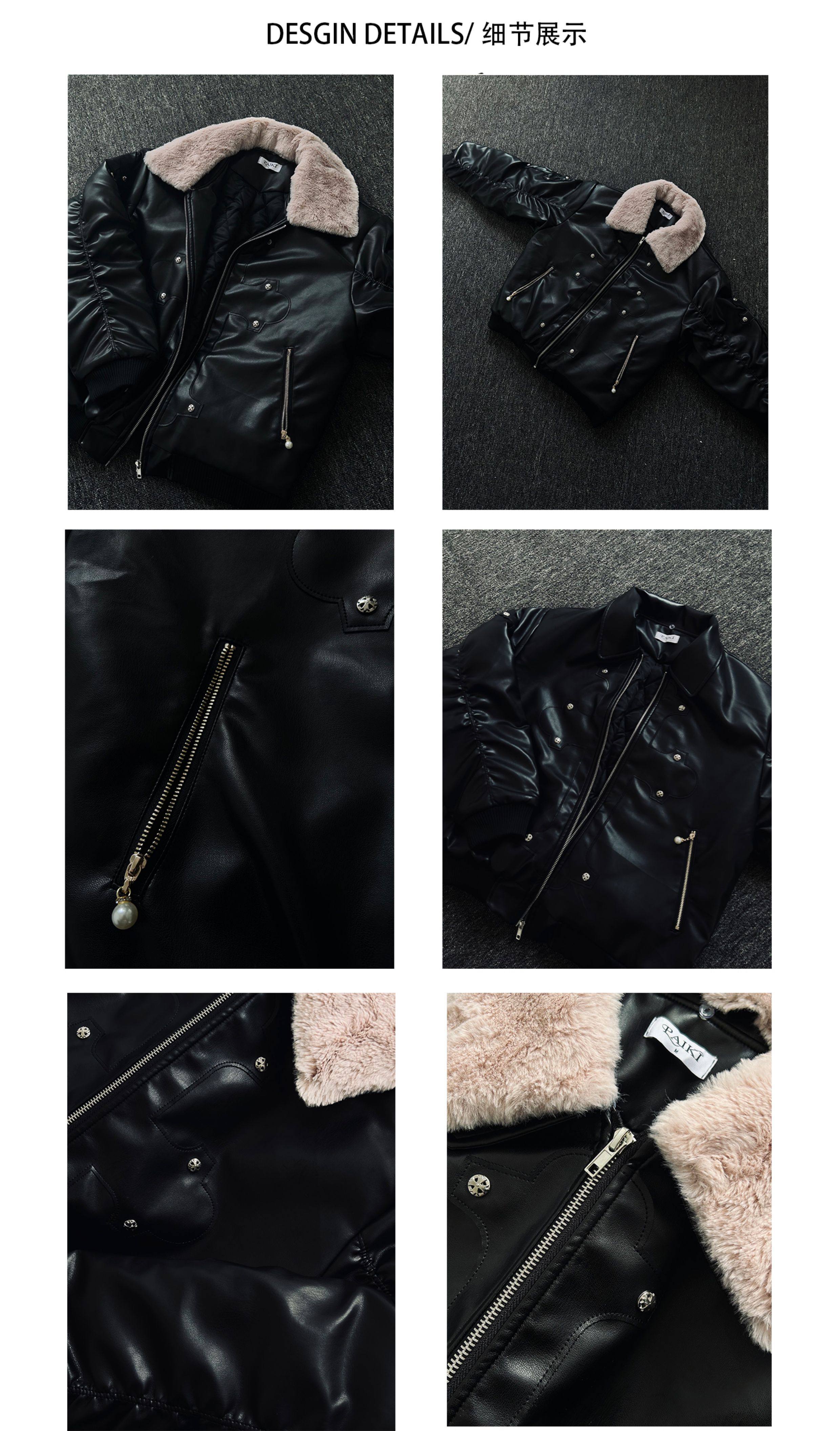 Paiki'Cyrus Empire' Holy Cross Fur Collar Patch Leather Bomber Jacket Air Force Jacket Cotton Coat
