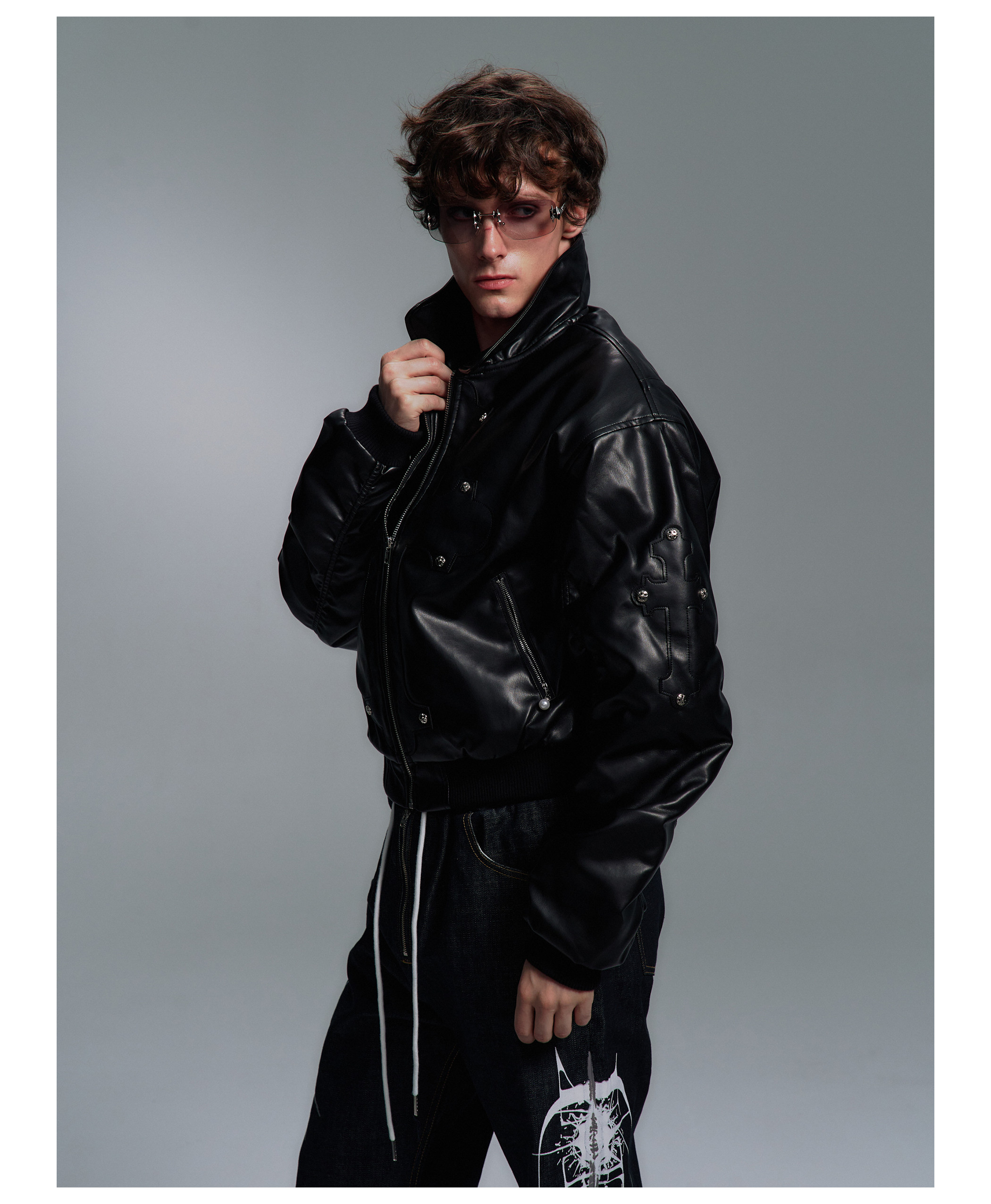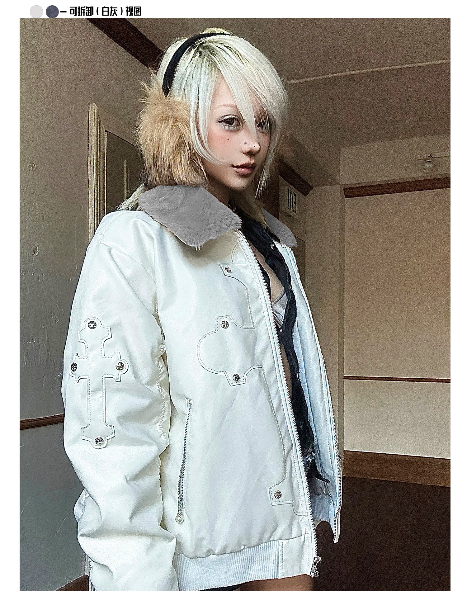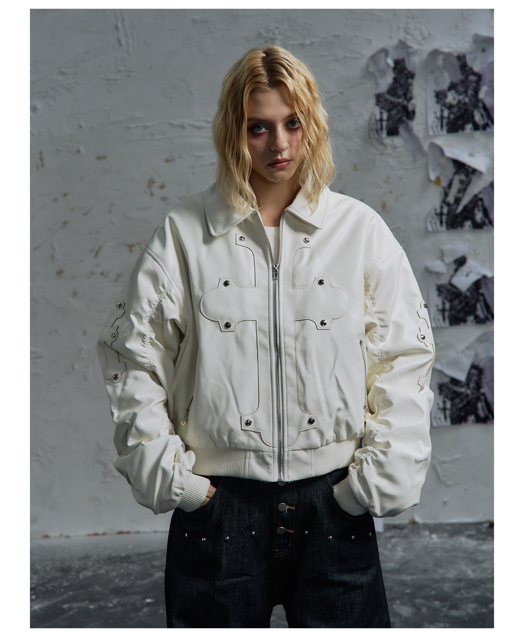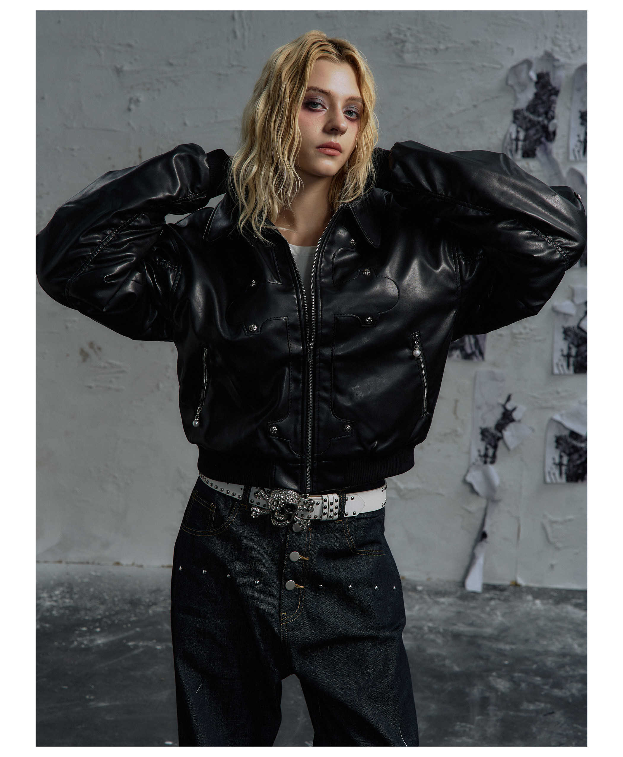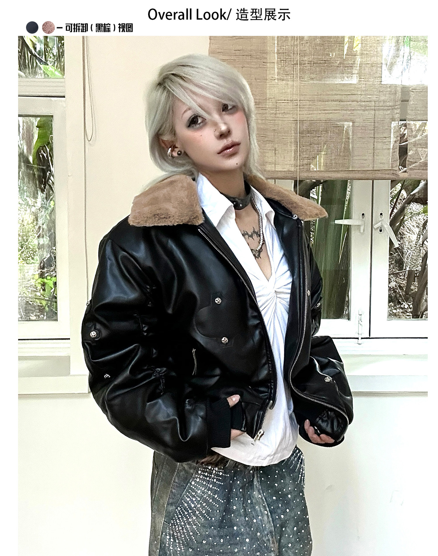 Paiki'Cyrus Empire' Holy Cross Fur Collar Patch Leather Bomber Jacket Air Force Jacket Cotton Coat