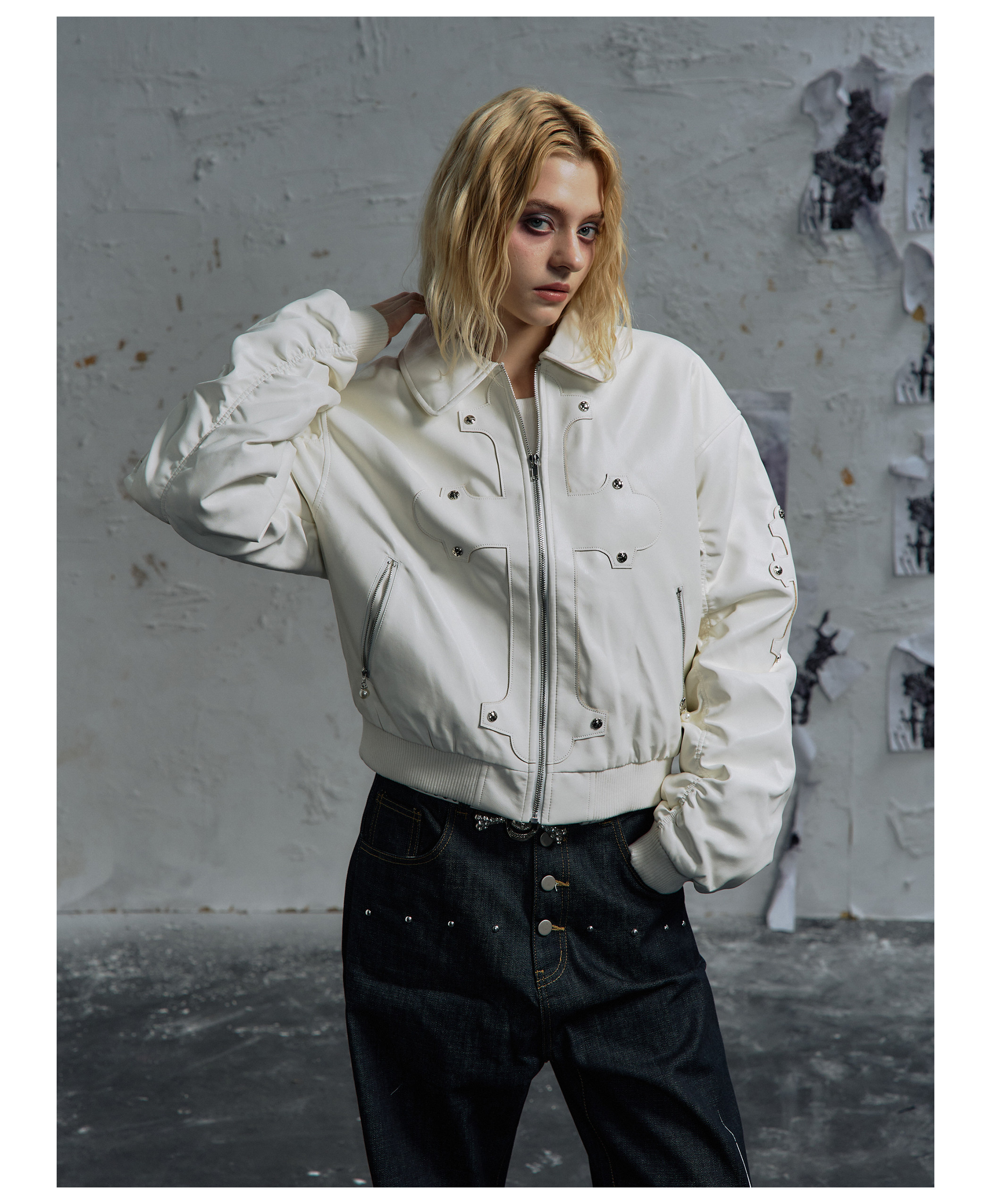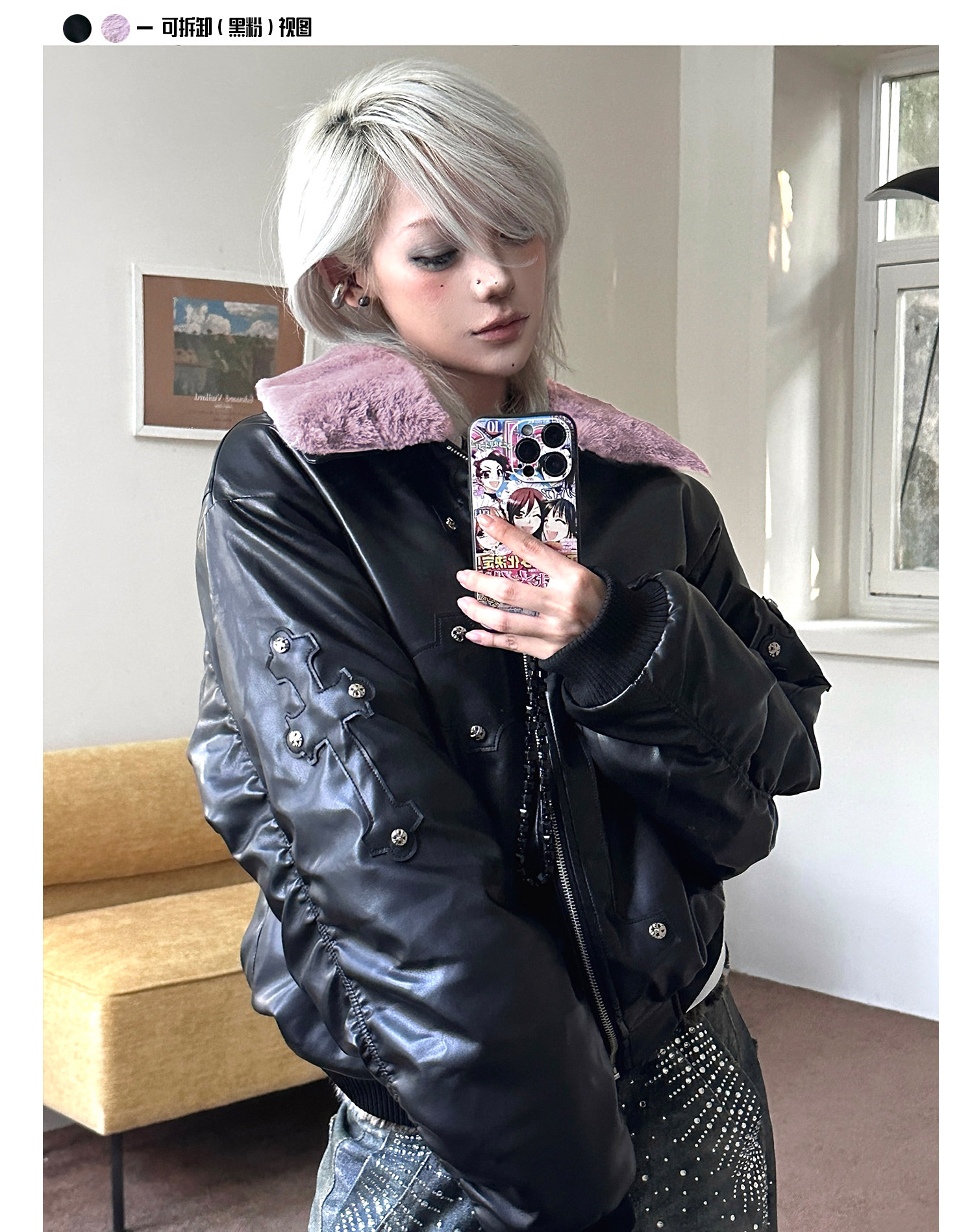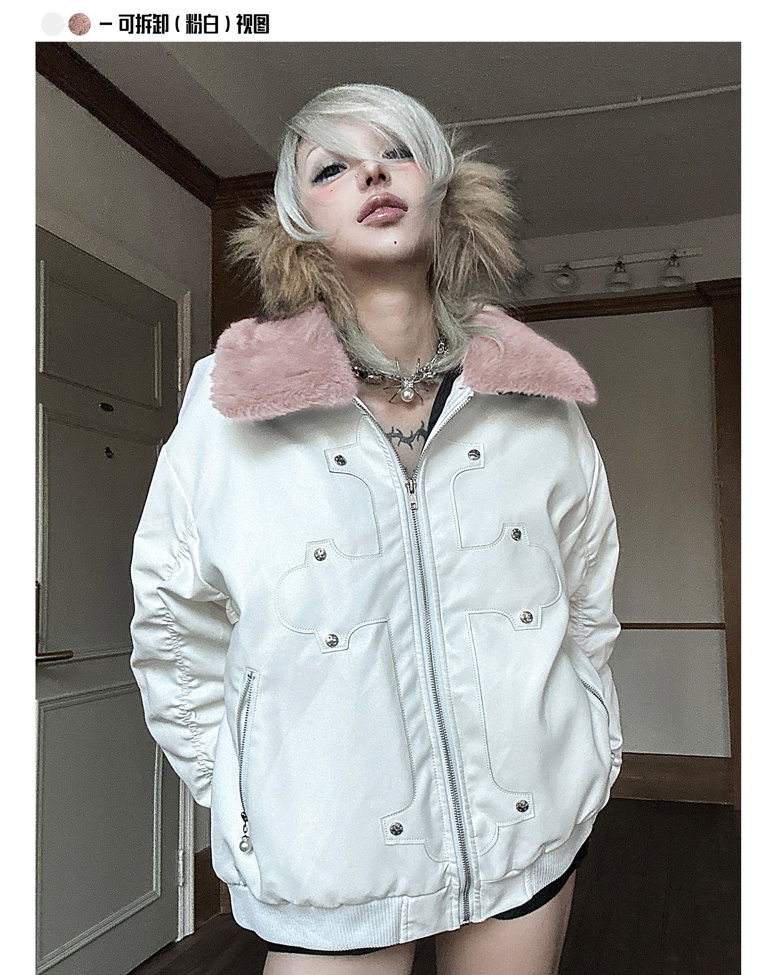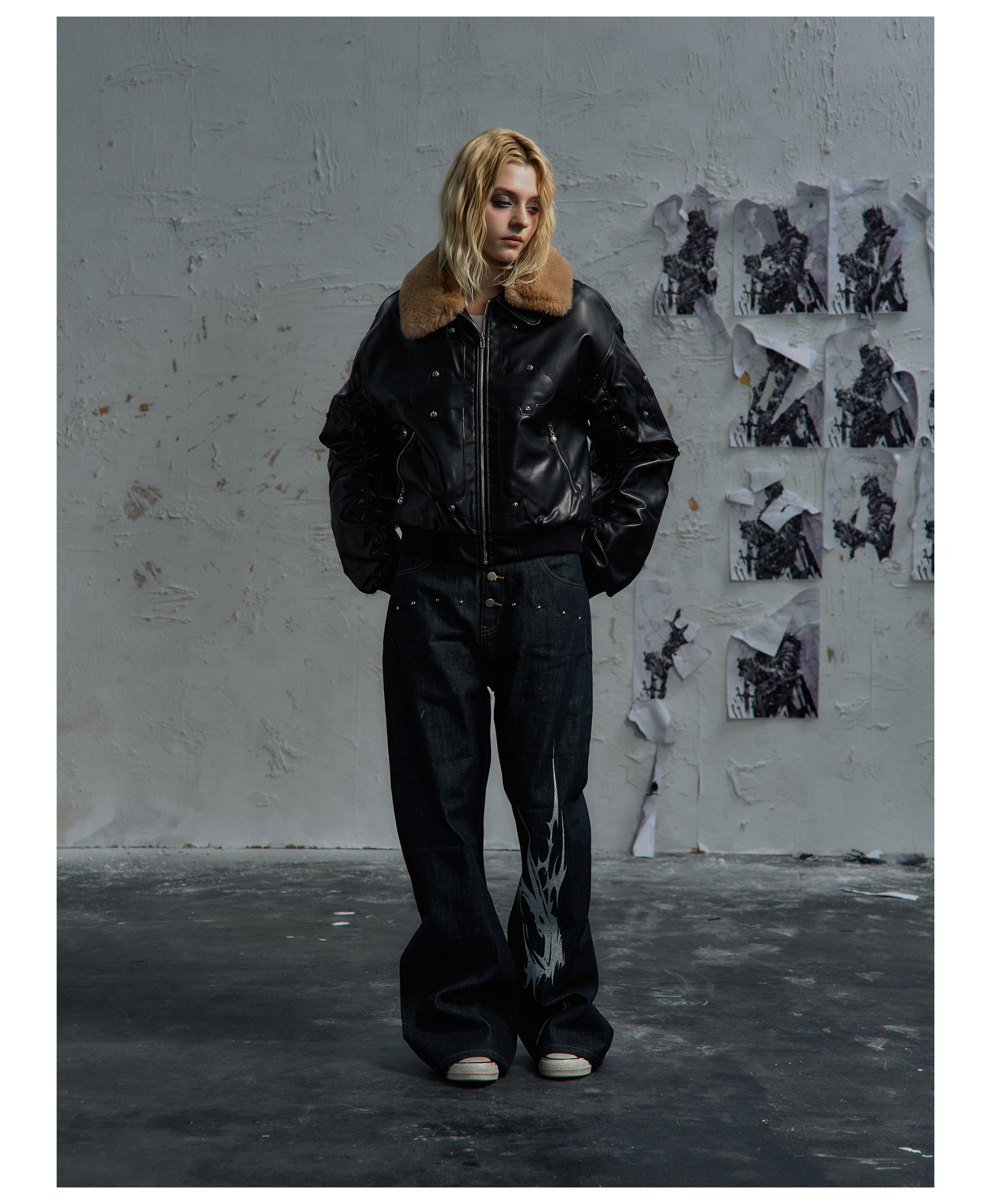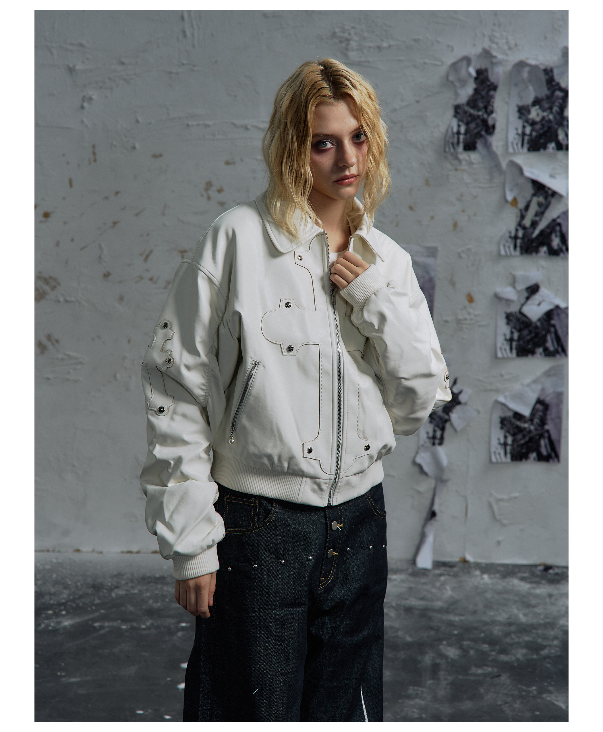 Paiki'Cyrus Empire' Holy Cross Fur Collar Patch Leather Bomber Jacket Air Force Jacket Cotton Coat