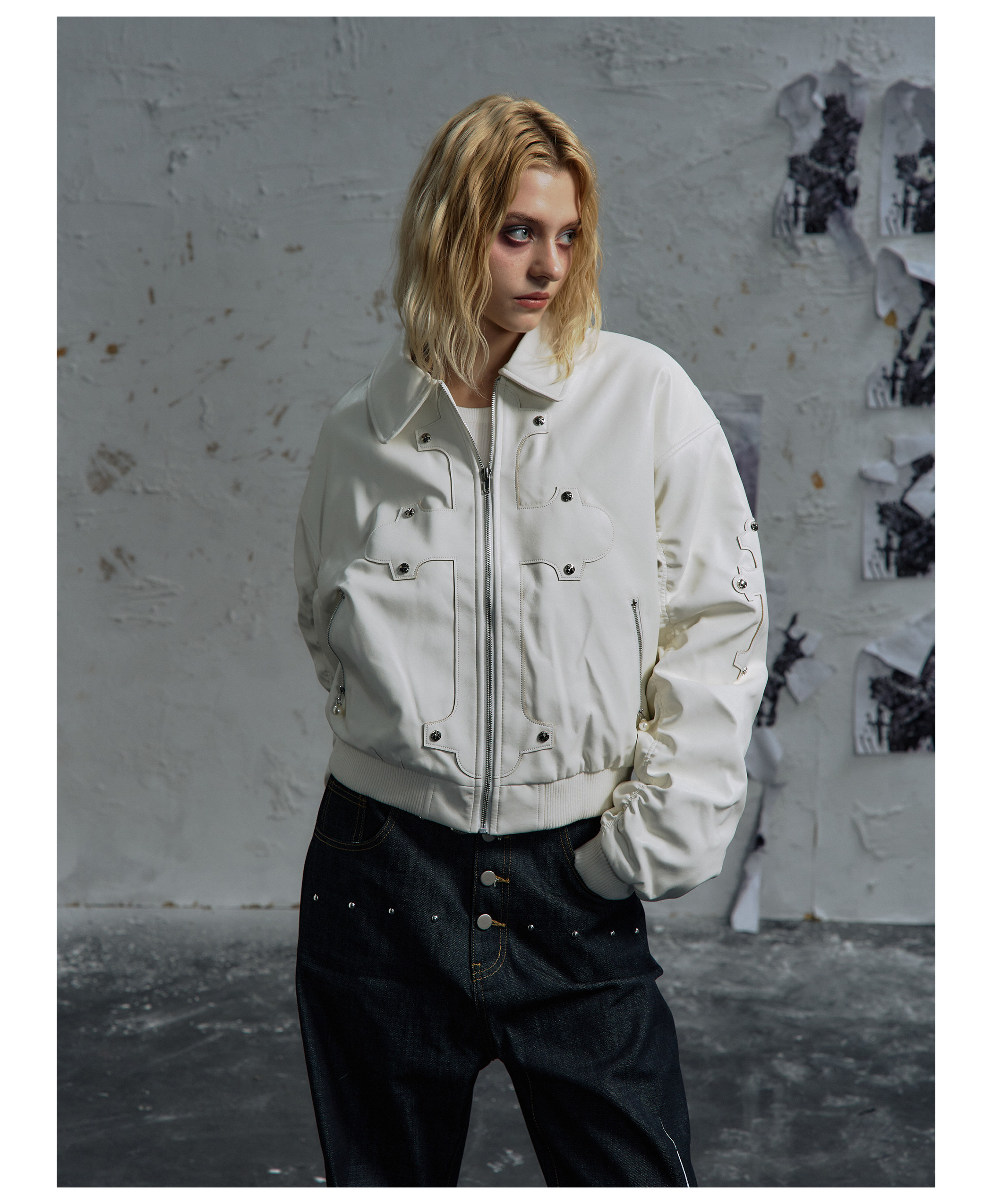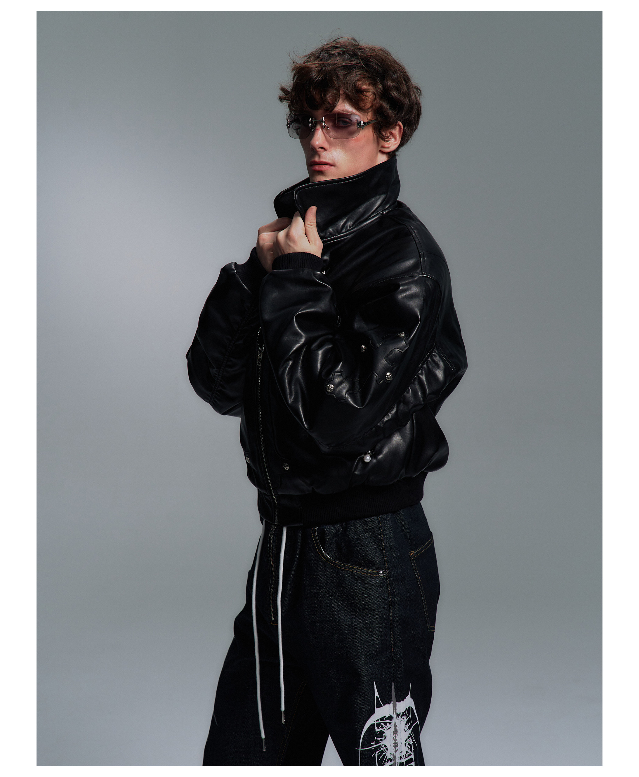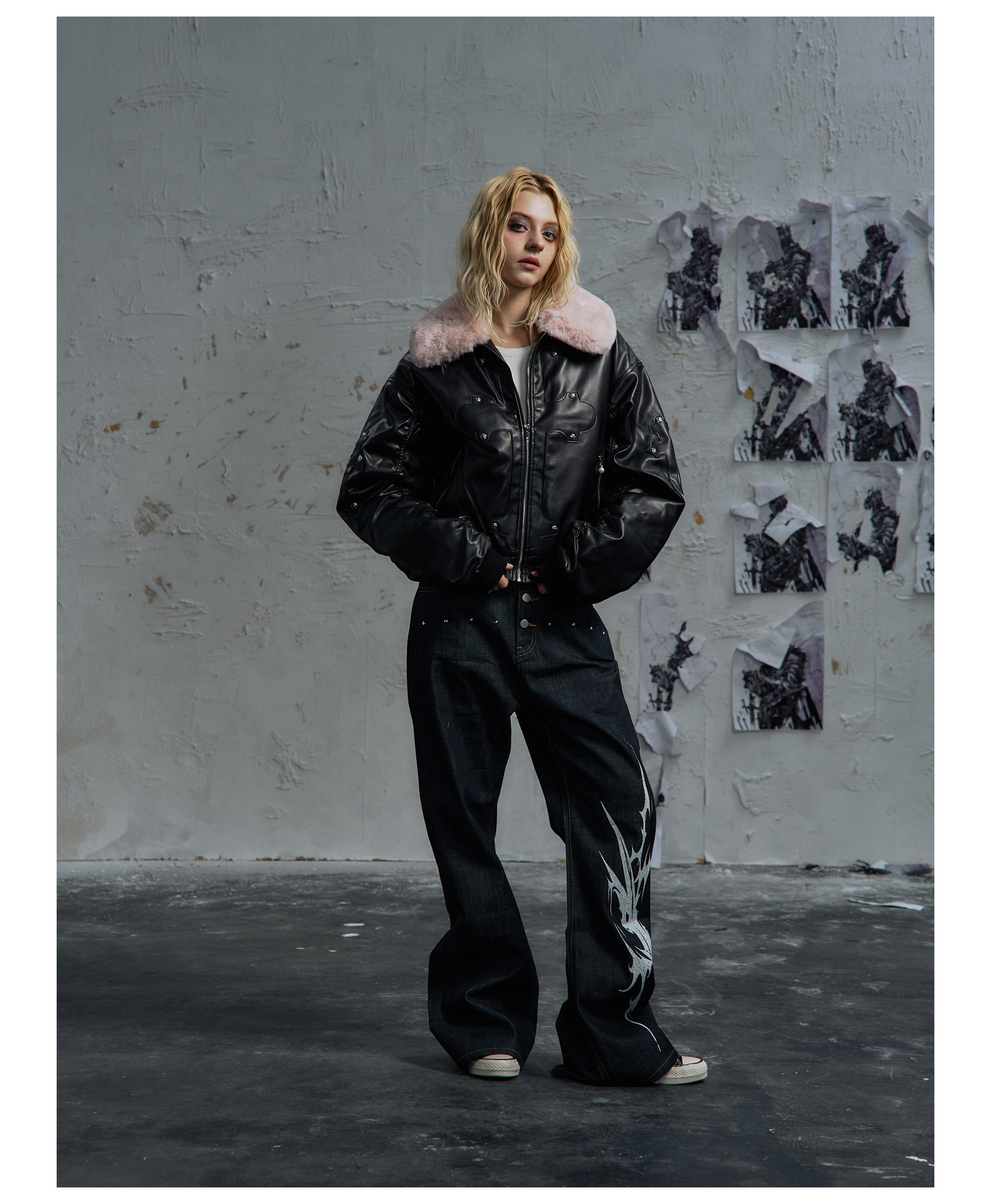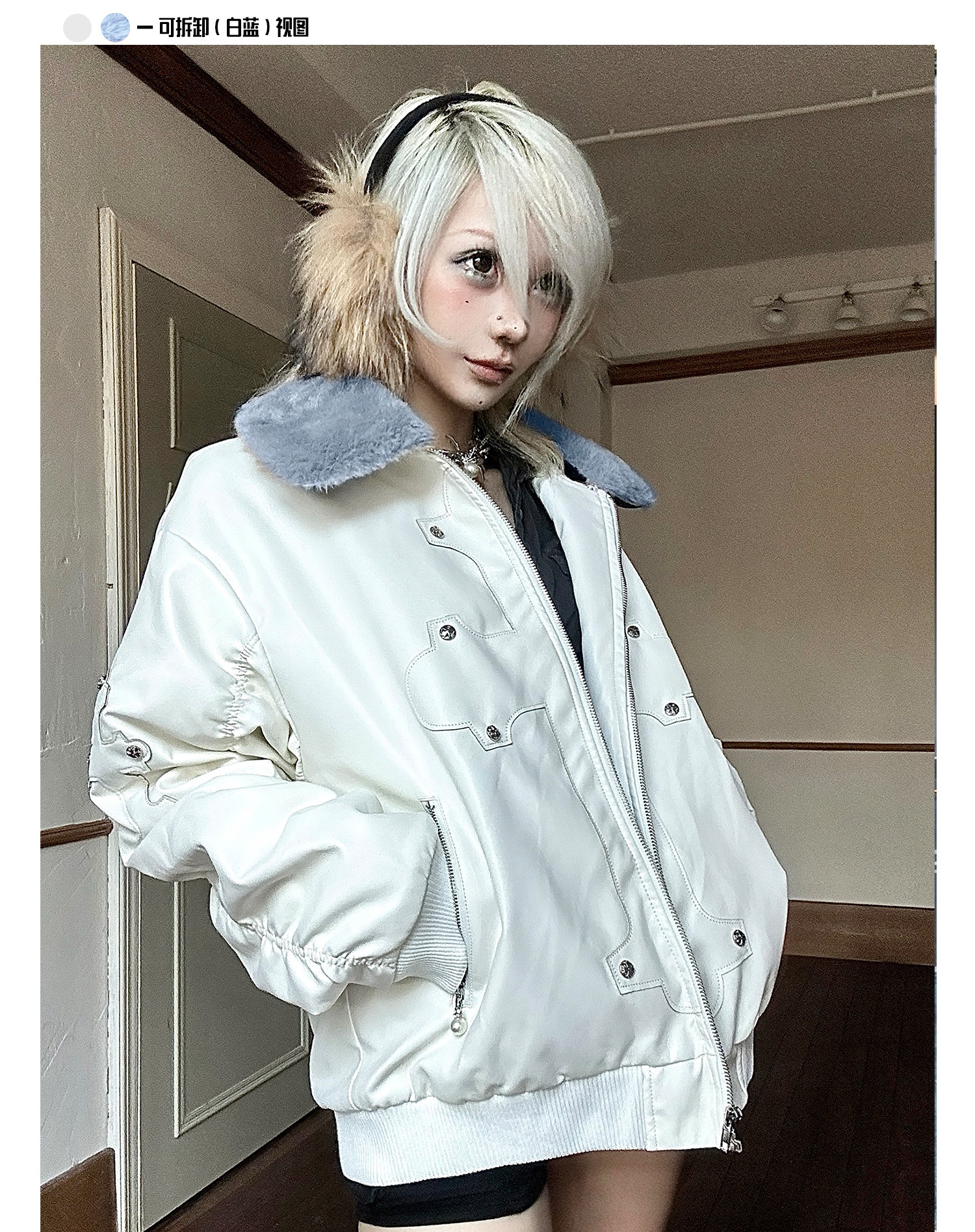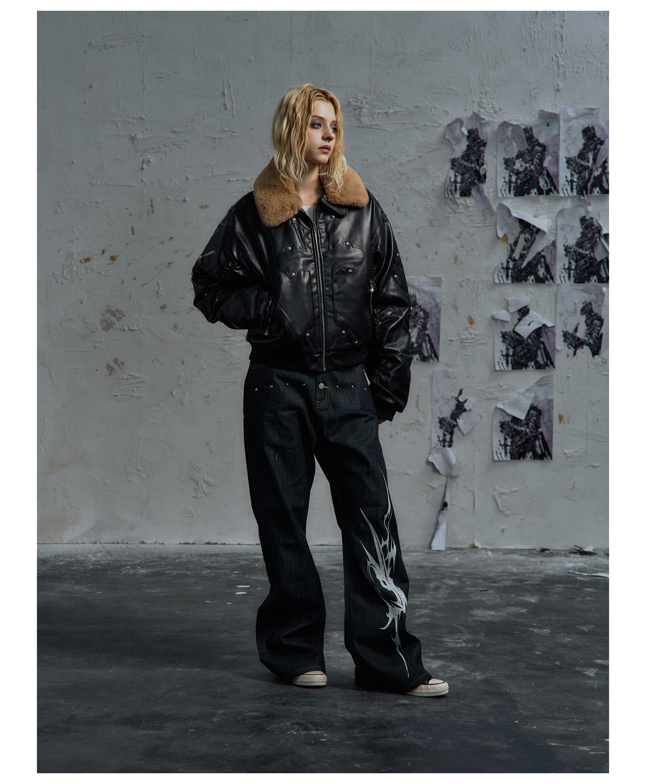 Paiki'Cyrus Empire' Holy Cross Fur Collar Patch Leather Bomber Jacket Air Force Jacket Cotton Coat
