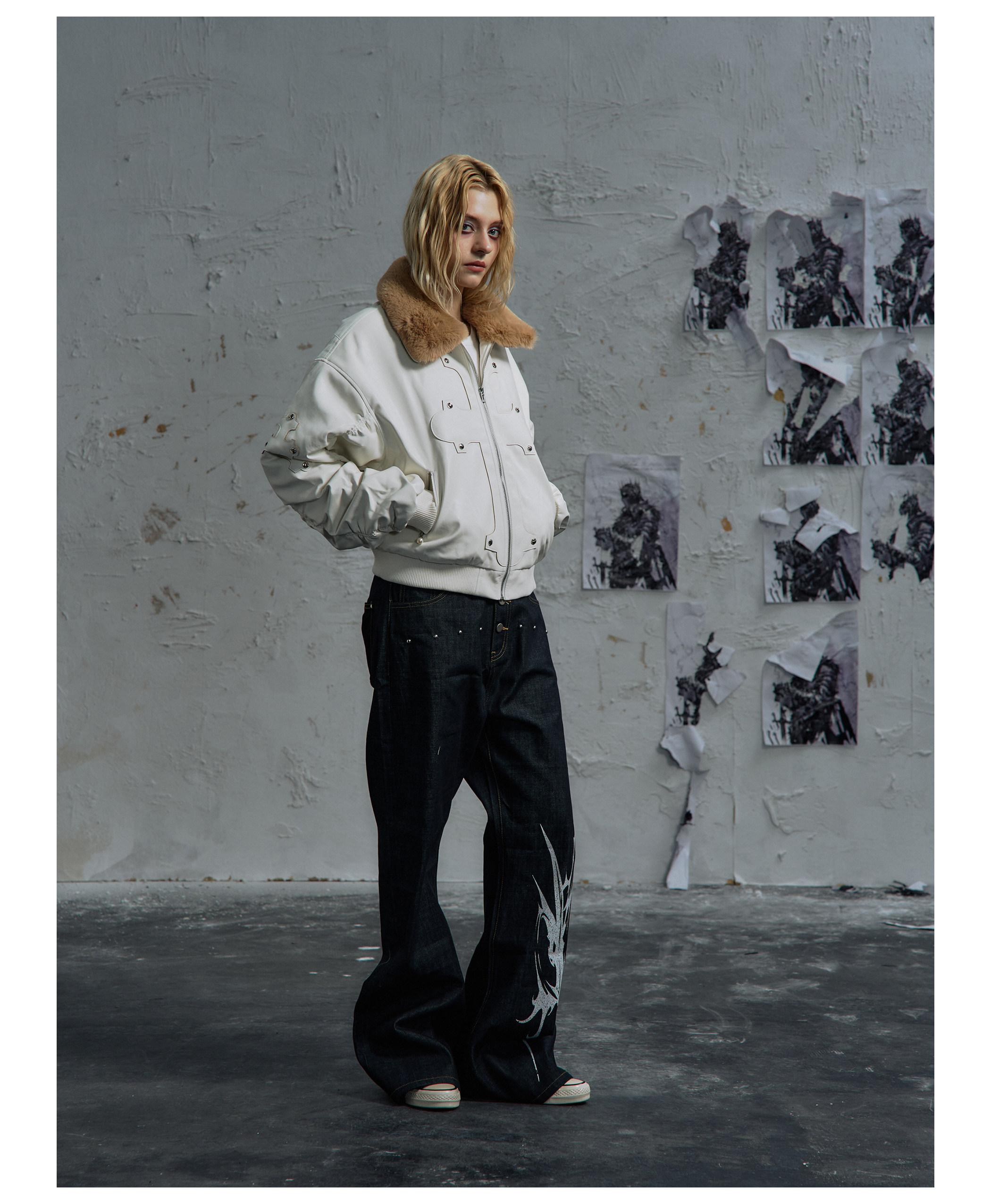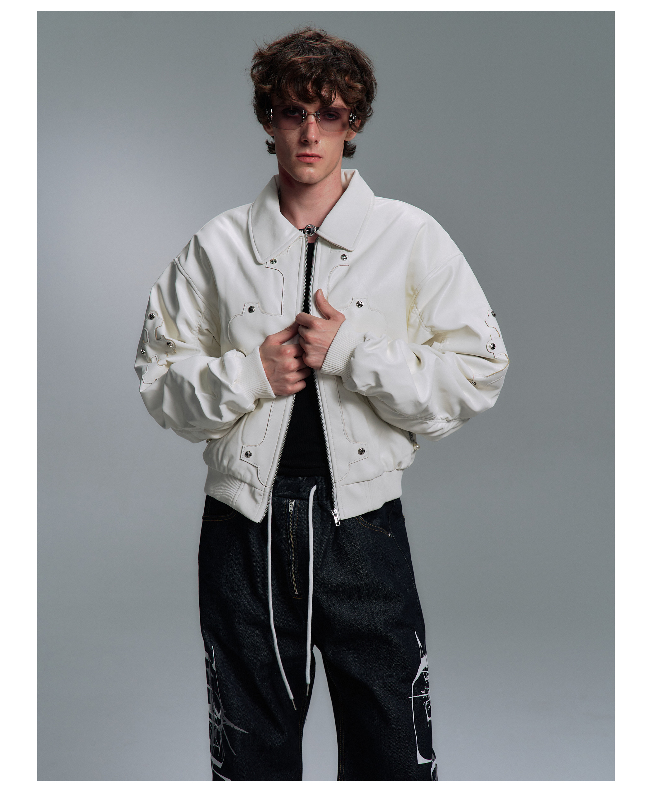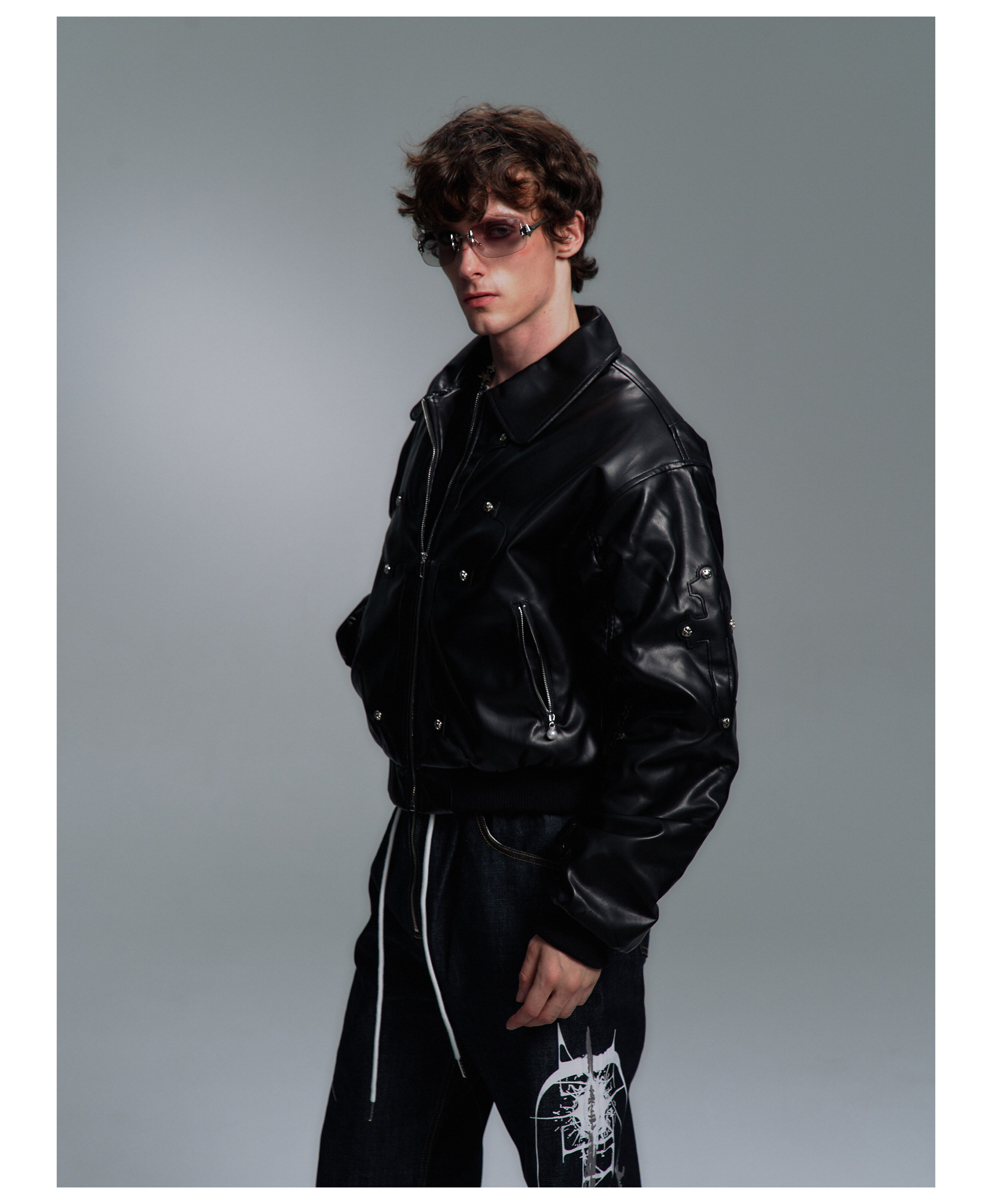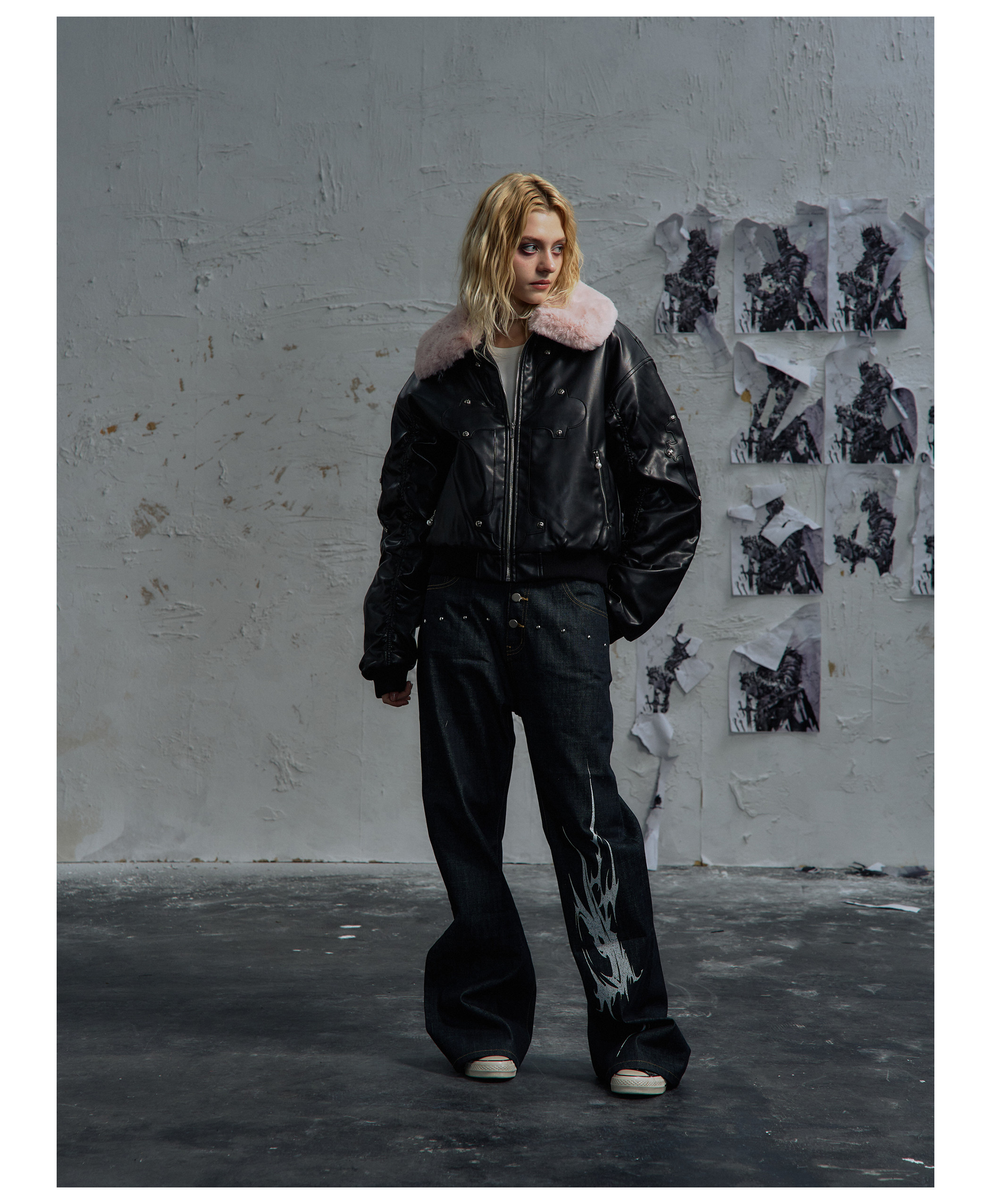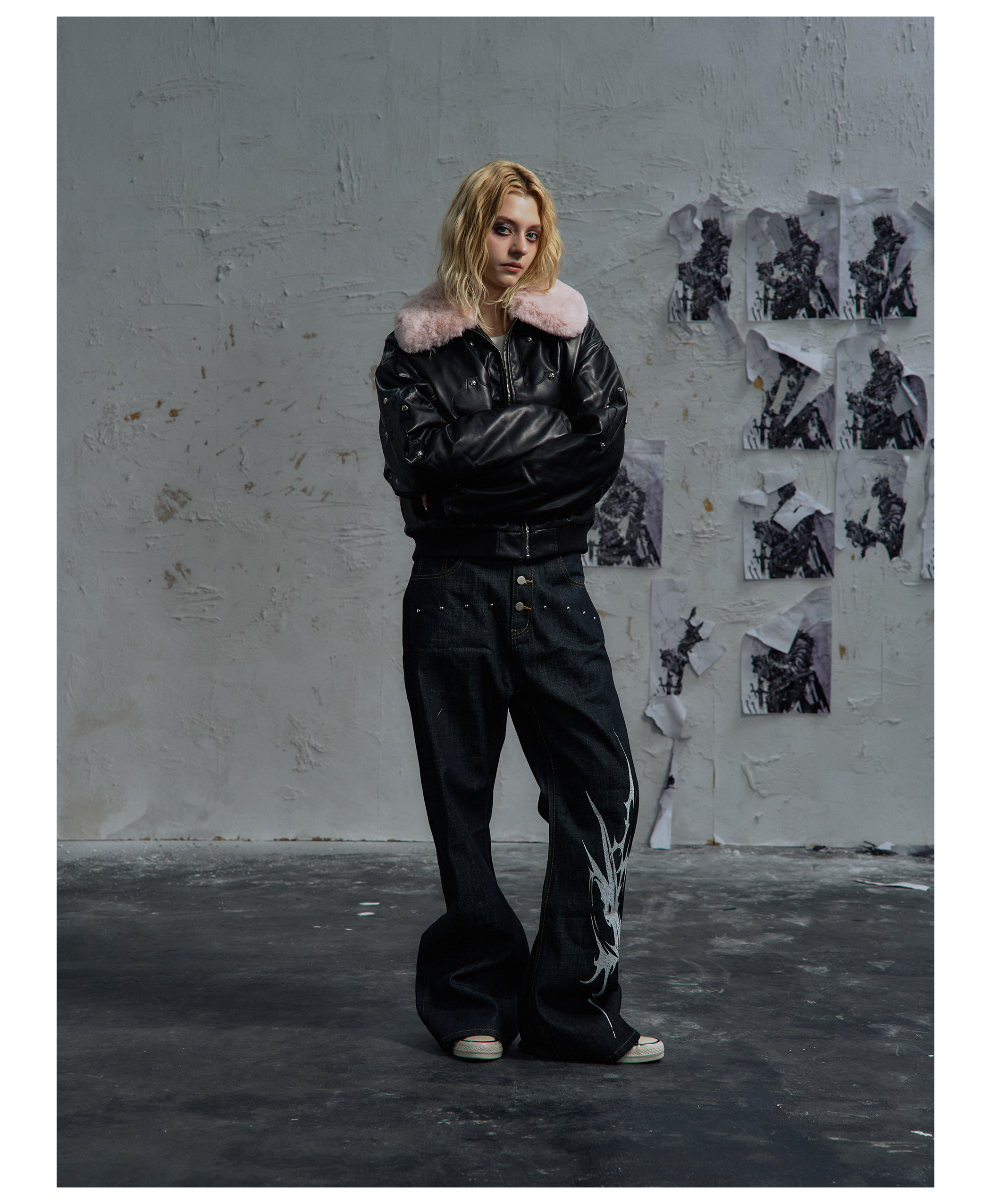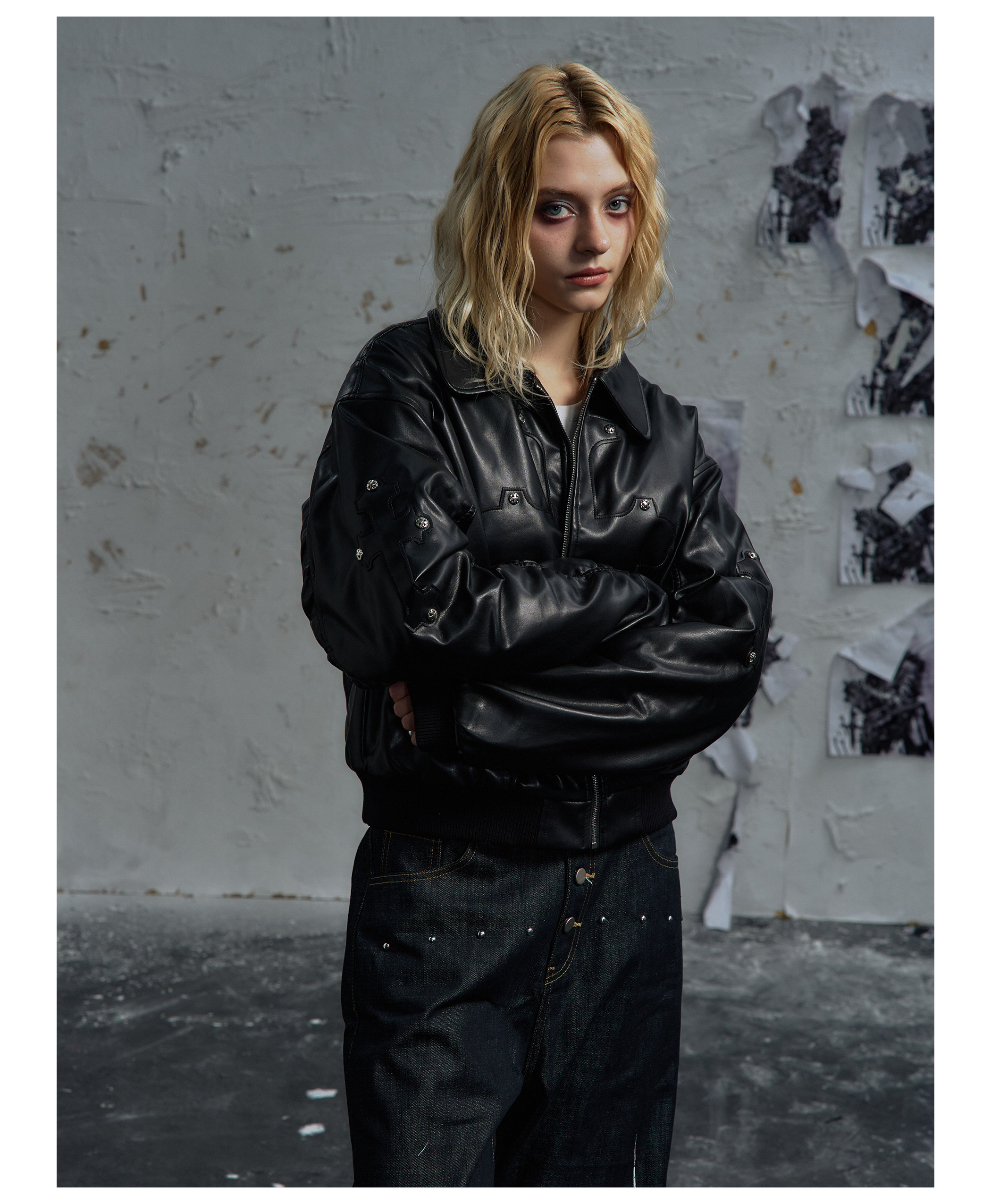 Paiki'Cyrus Empire' Holy Cross Fur Collar Patch Leather Bomber Jacket Air Force Jacket Cotton Coat