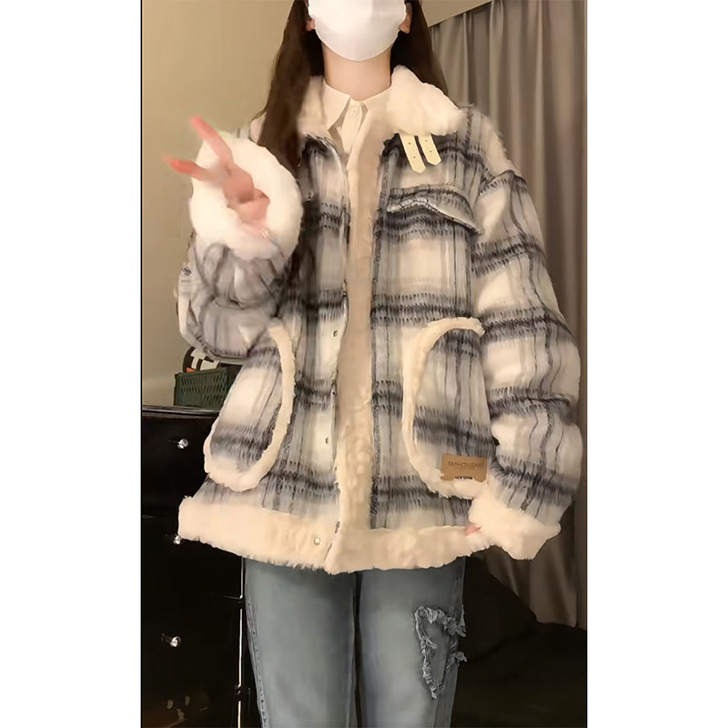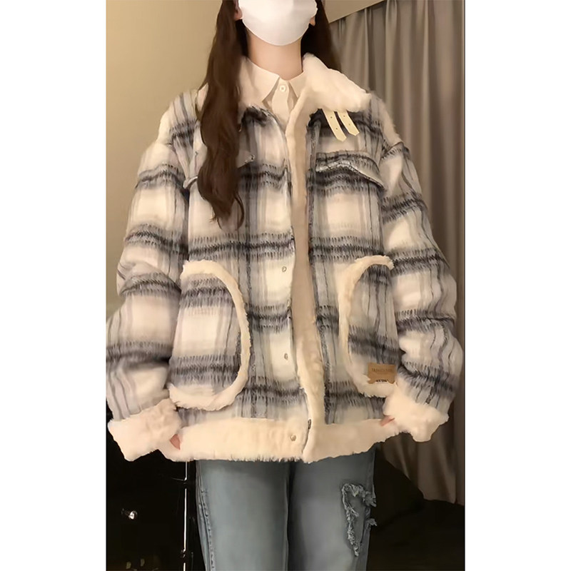 American Retro Plaid Lapel Lamb Wool Cotton Jacket for Women, Autumn and Winter Loose College Style Thickened Warm Cotton Coat
