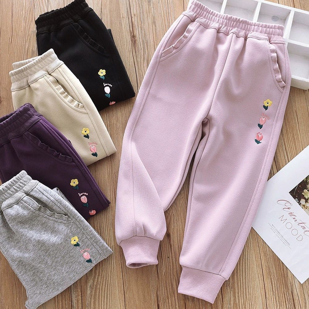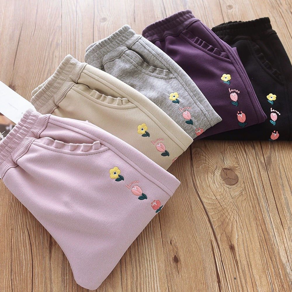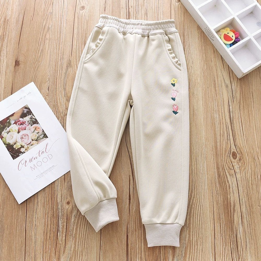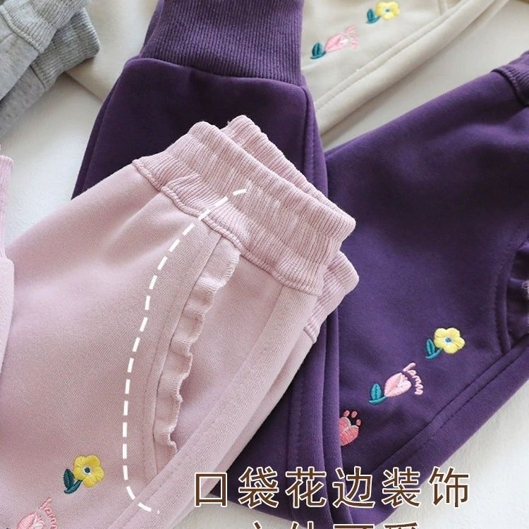 Trendy Girls' Casual Pants for Autumn and Winter, Simple Embroidered Sweatpants for Children, Versatile Pure Cotton Fleece-Lined Joggers for Girls and Toddlers