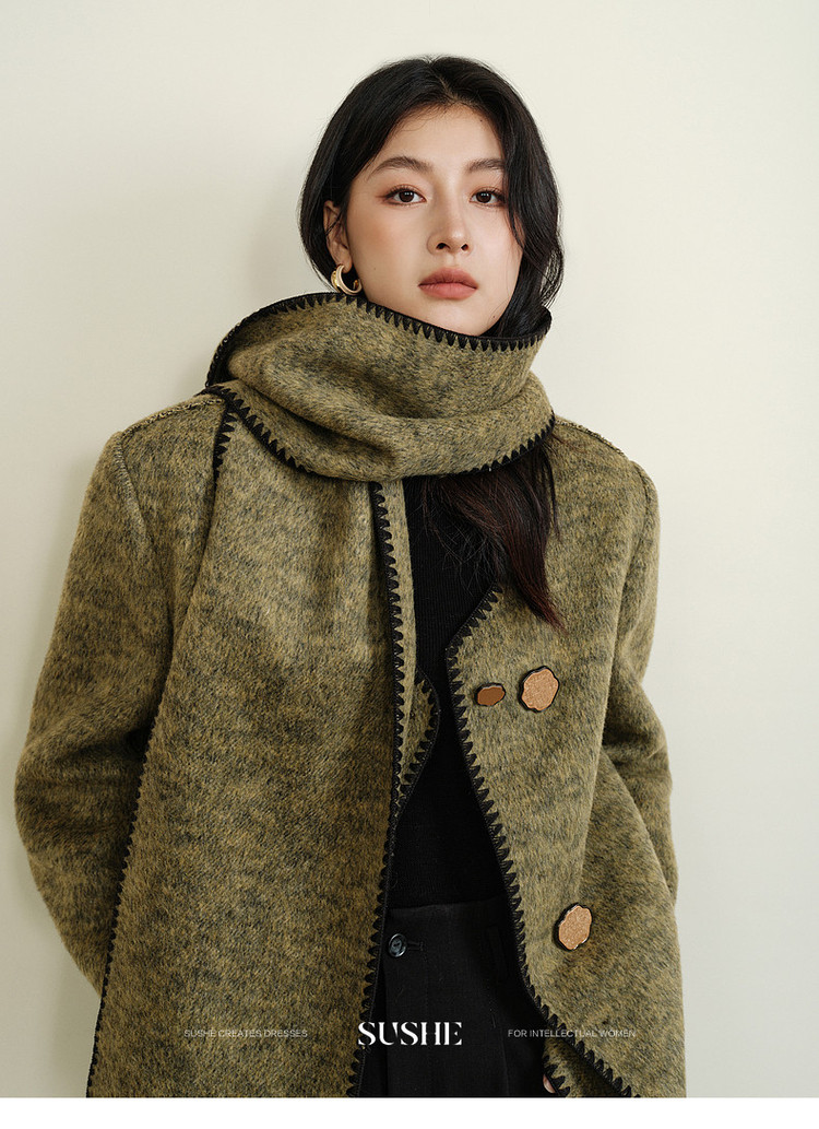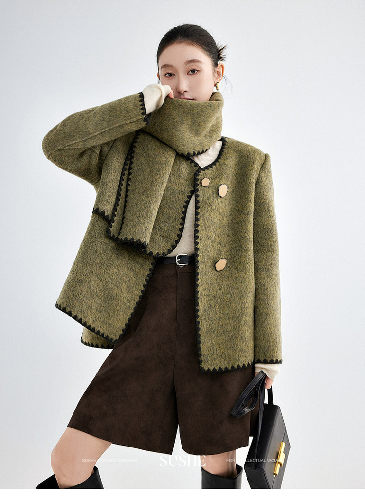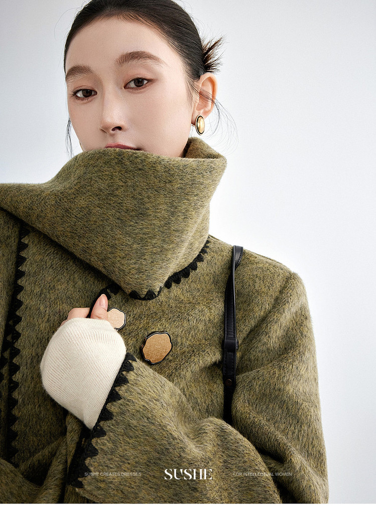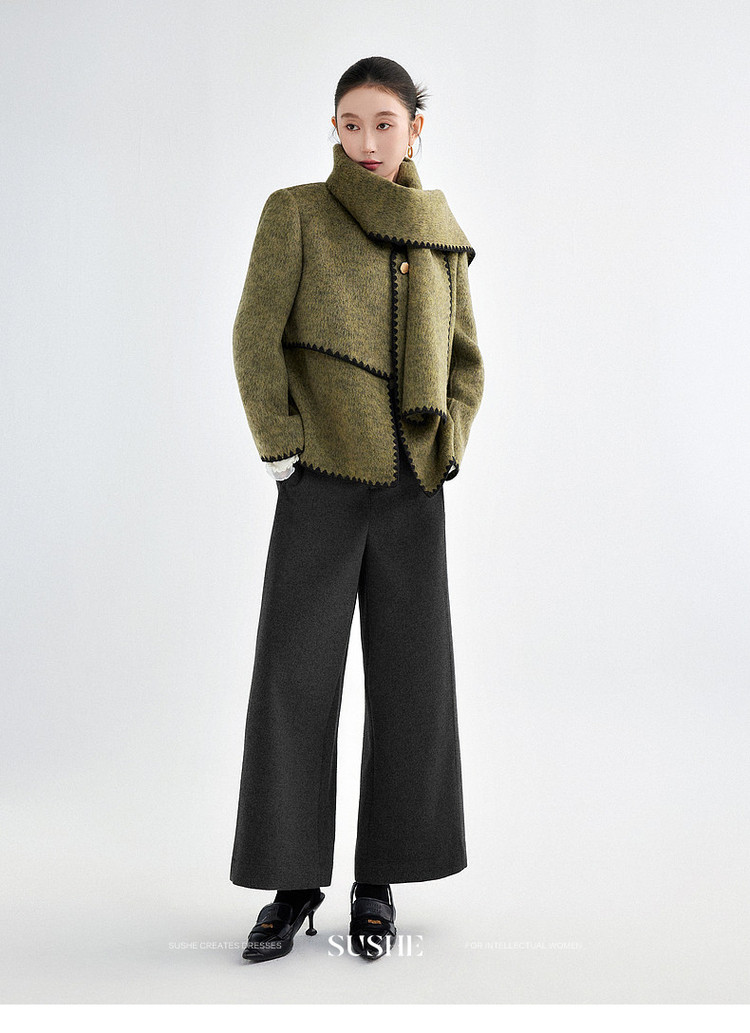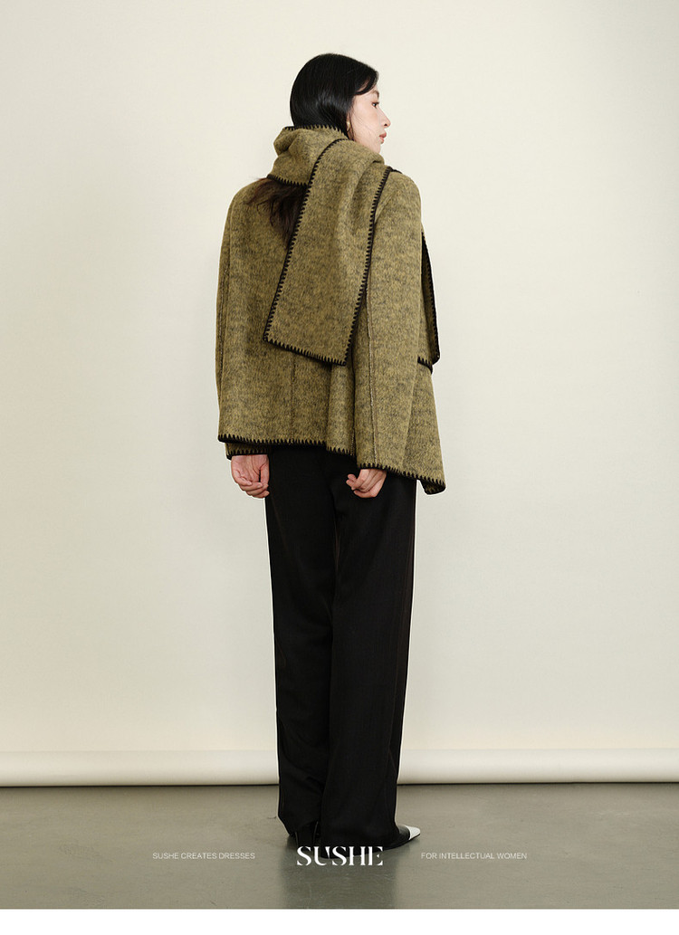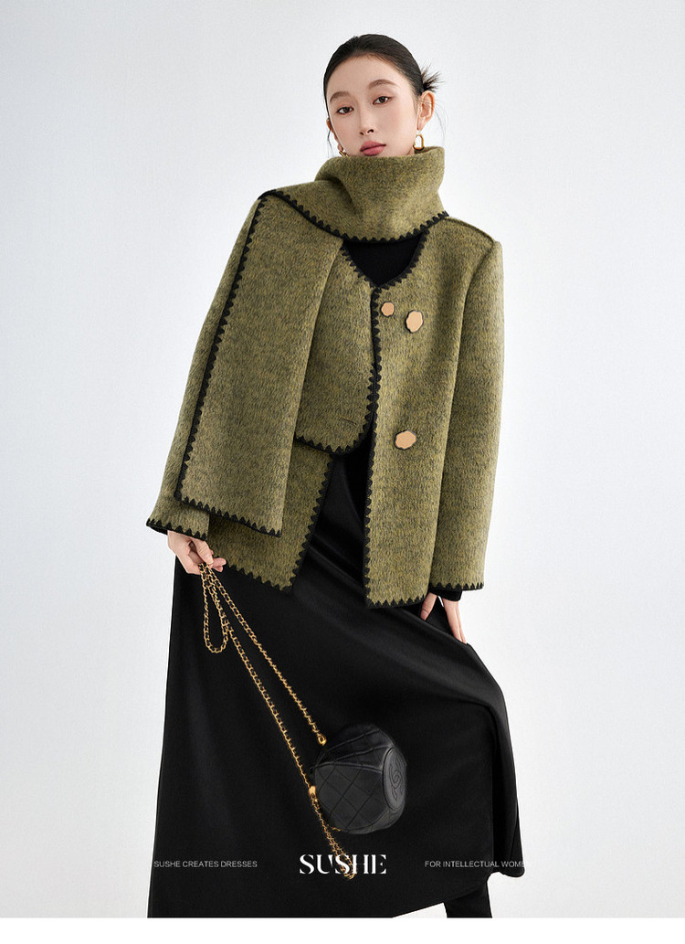 Sushe Deconstructed Niche Design Green Scarf Double-Sided Wool Coat for Women Winter