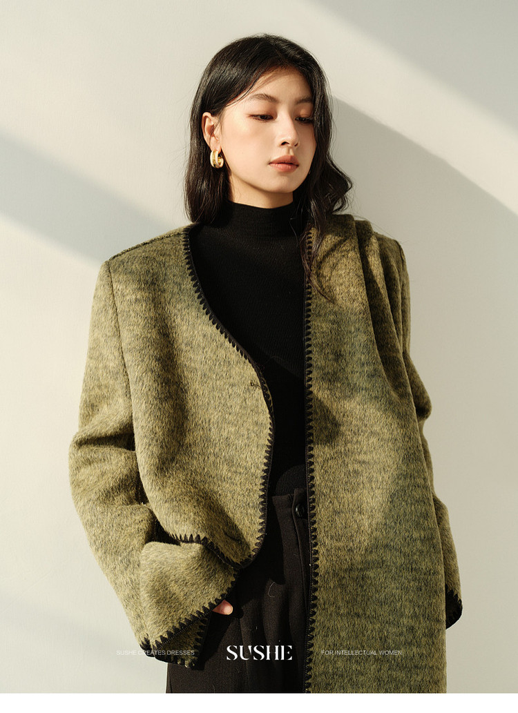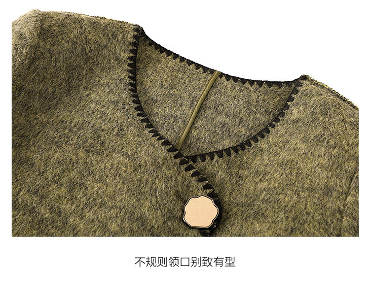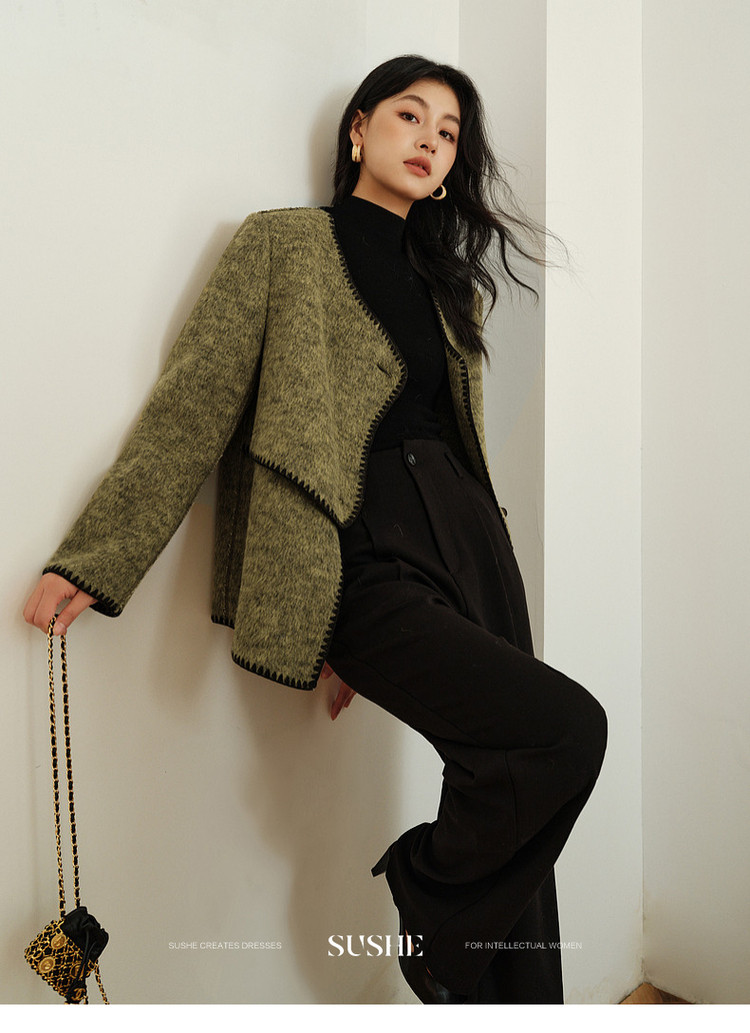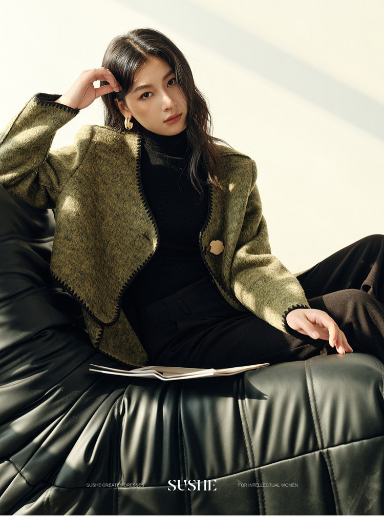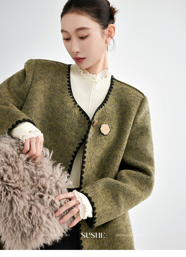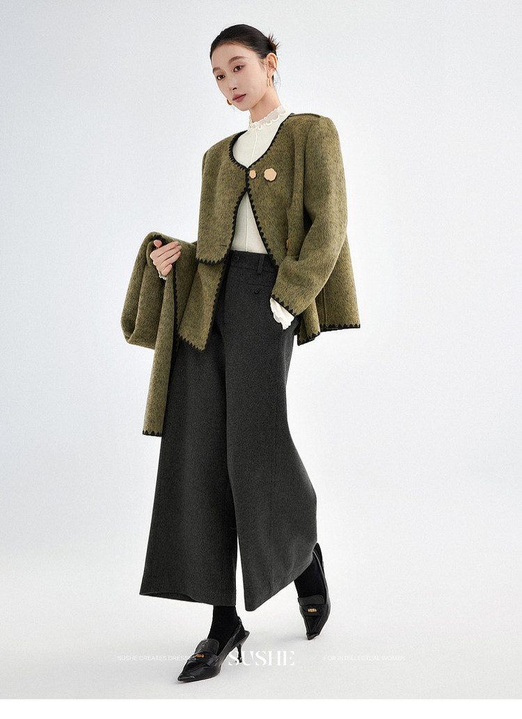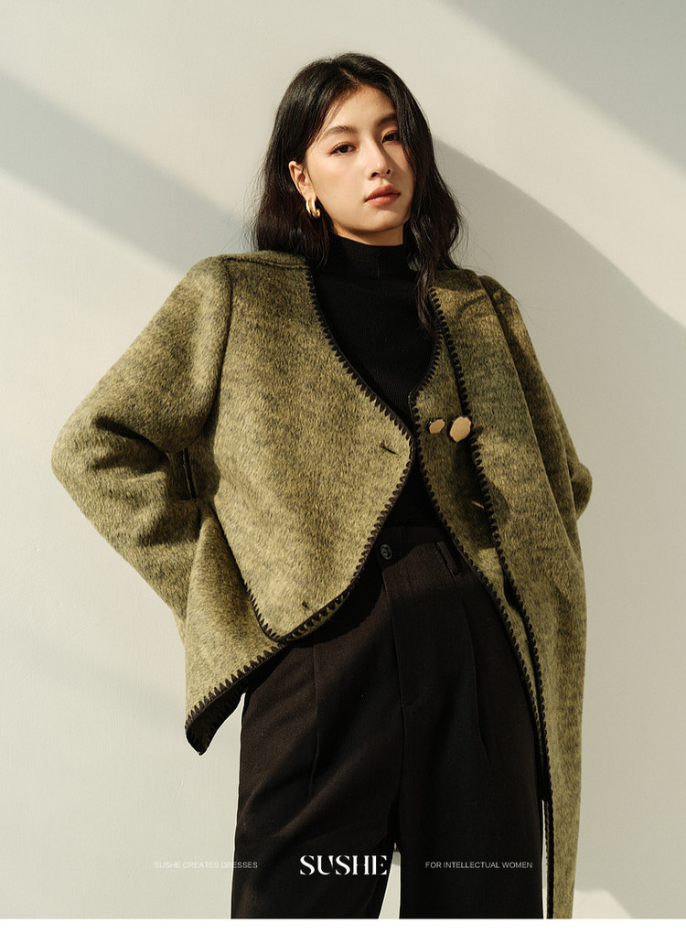 Sushe Deconstructed Niche Design Green Scarf Double-Sided Wool Coat for Women Winter