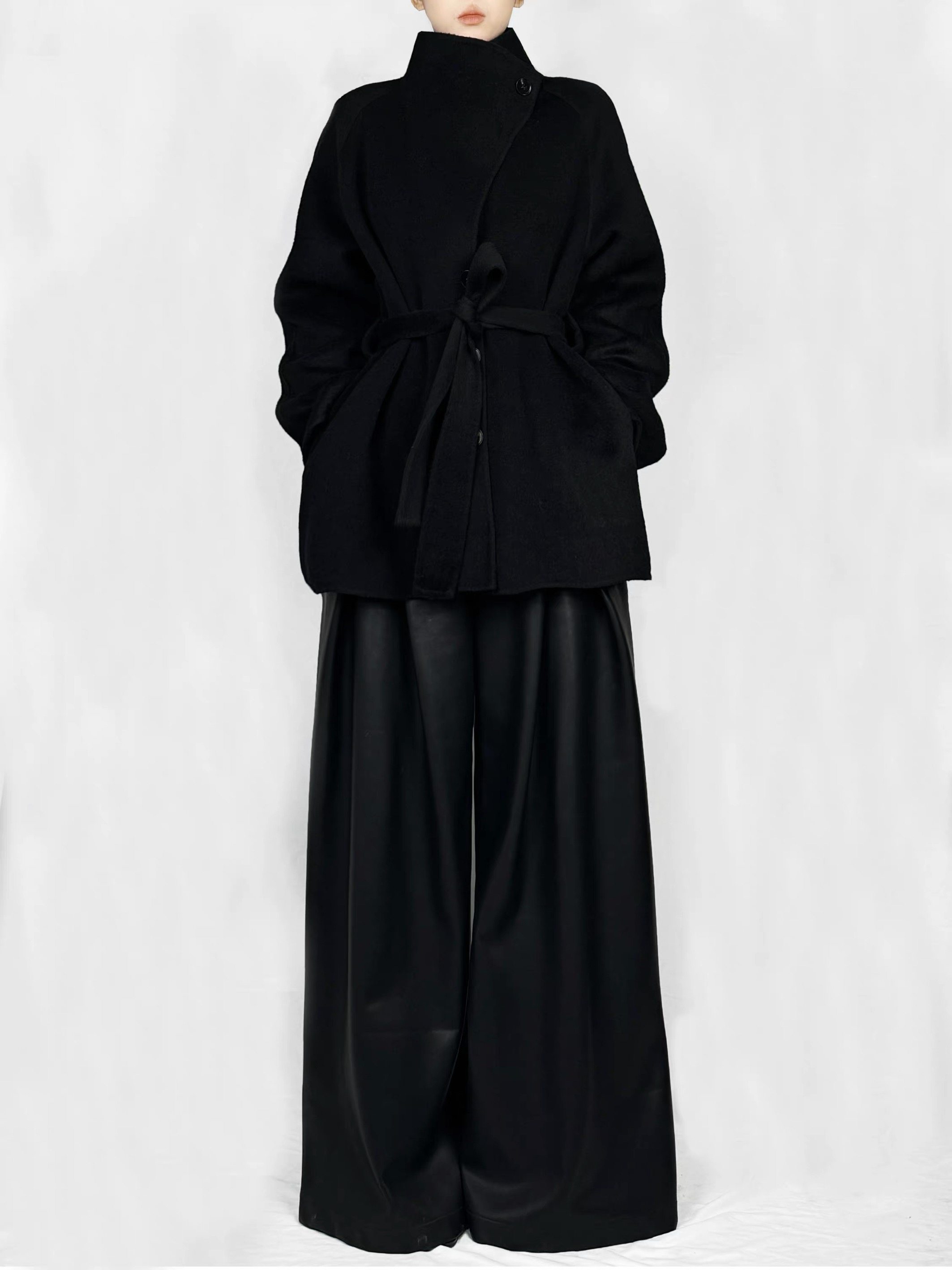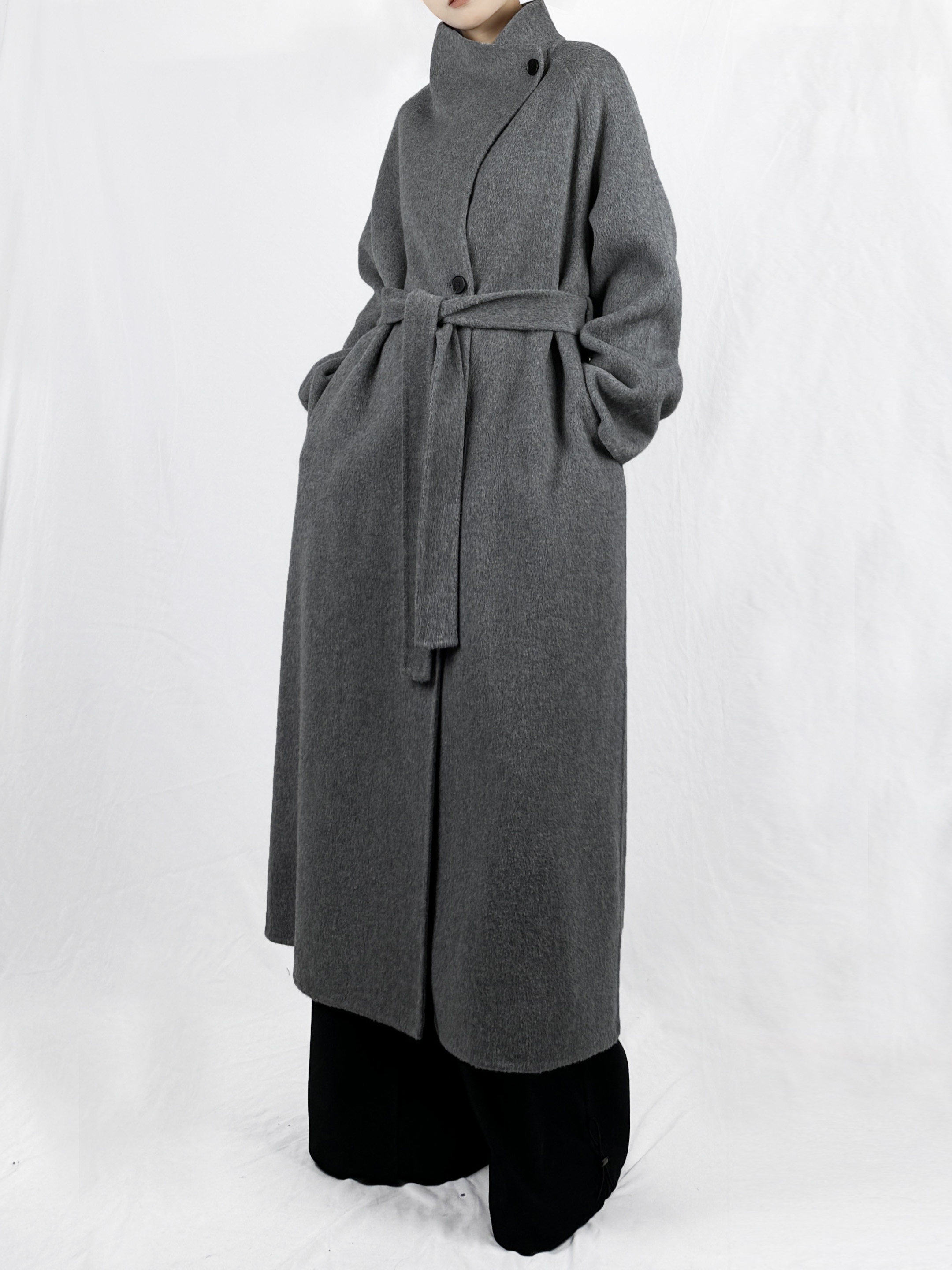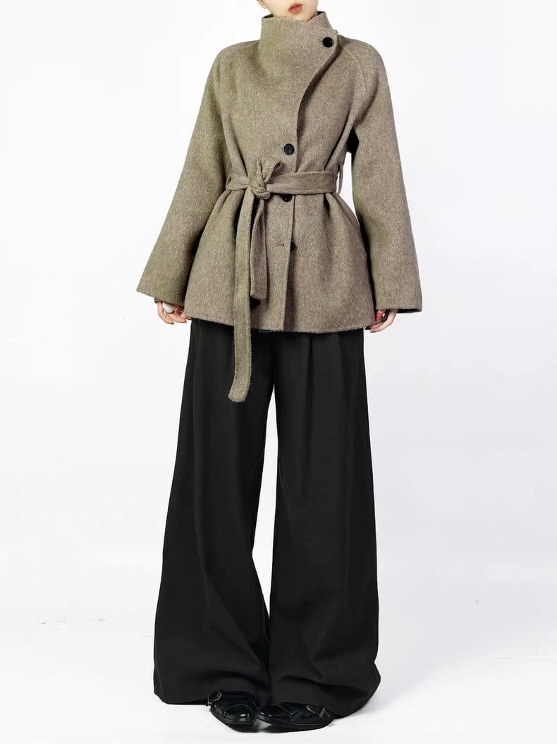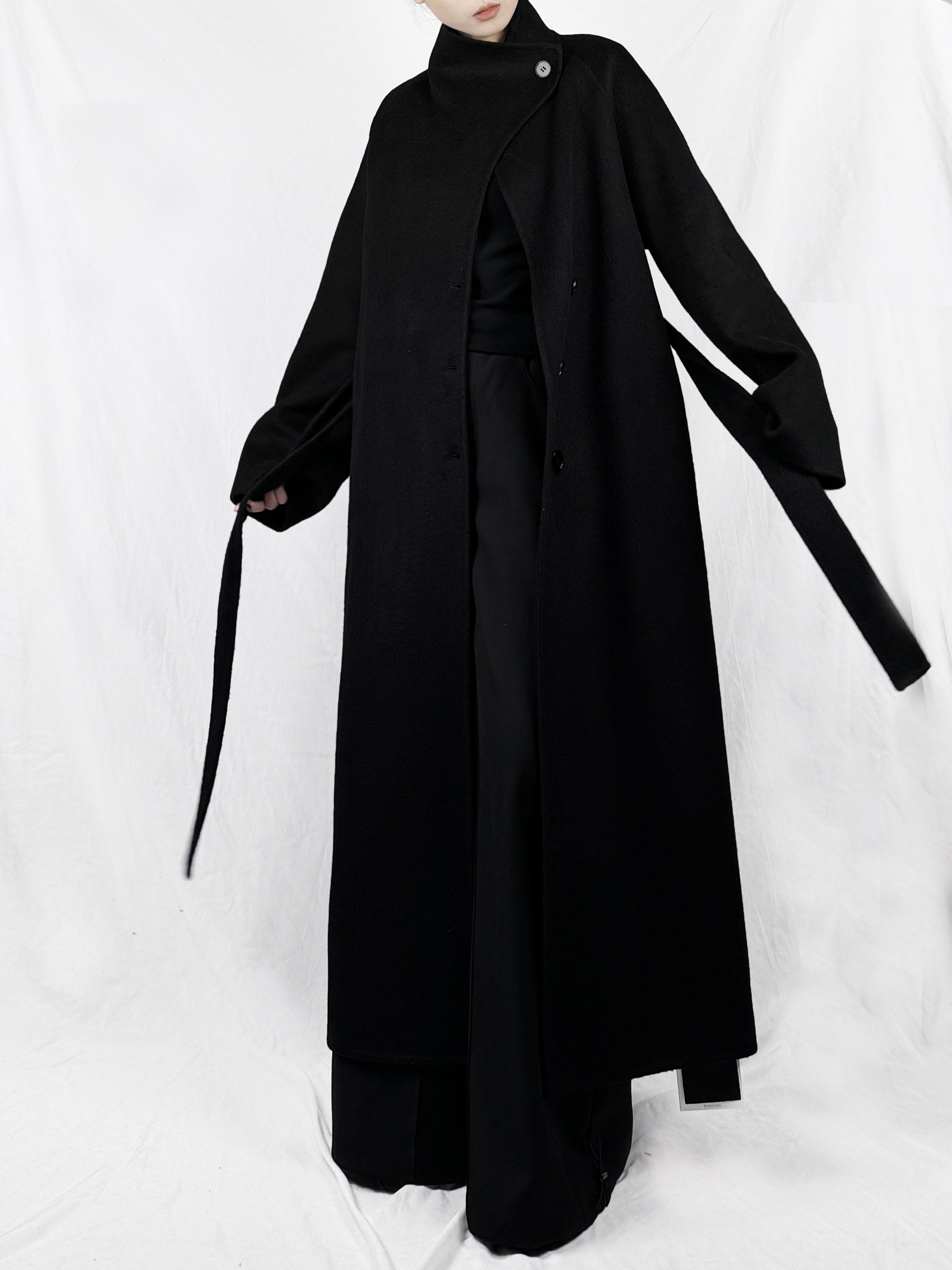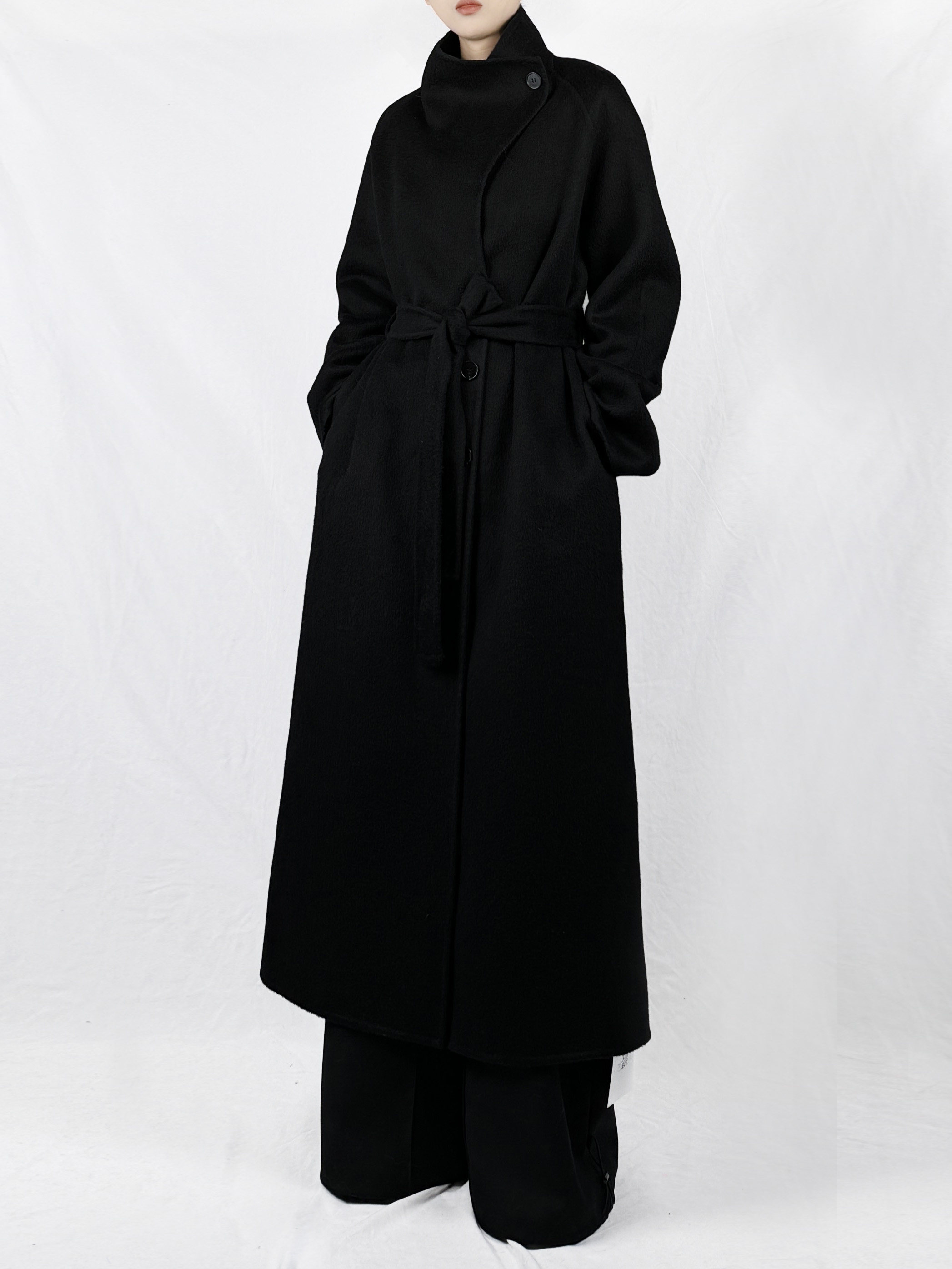 Jieyu High-Neck Tie Double-Sided Wool Long Coat
