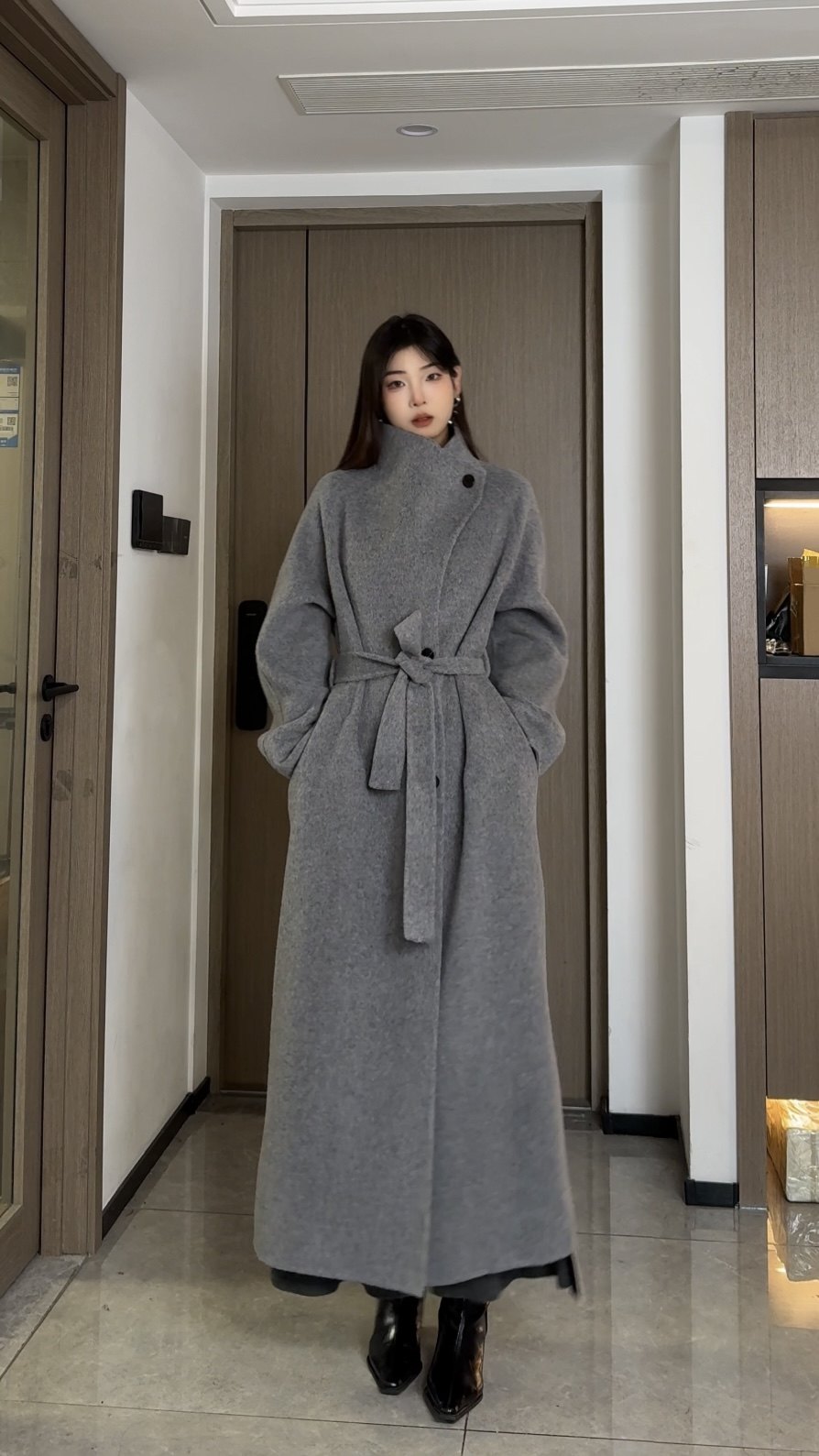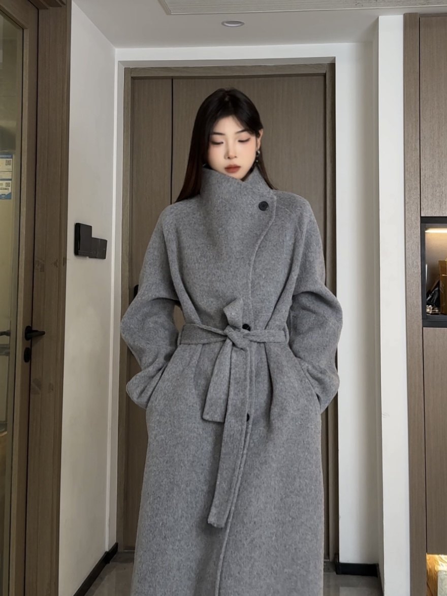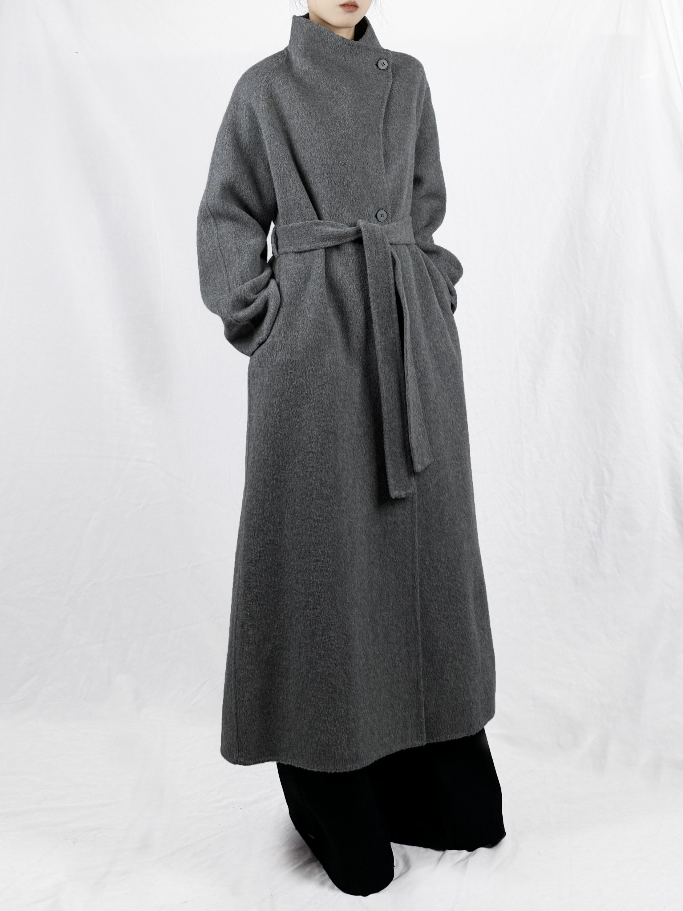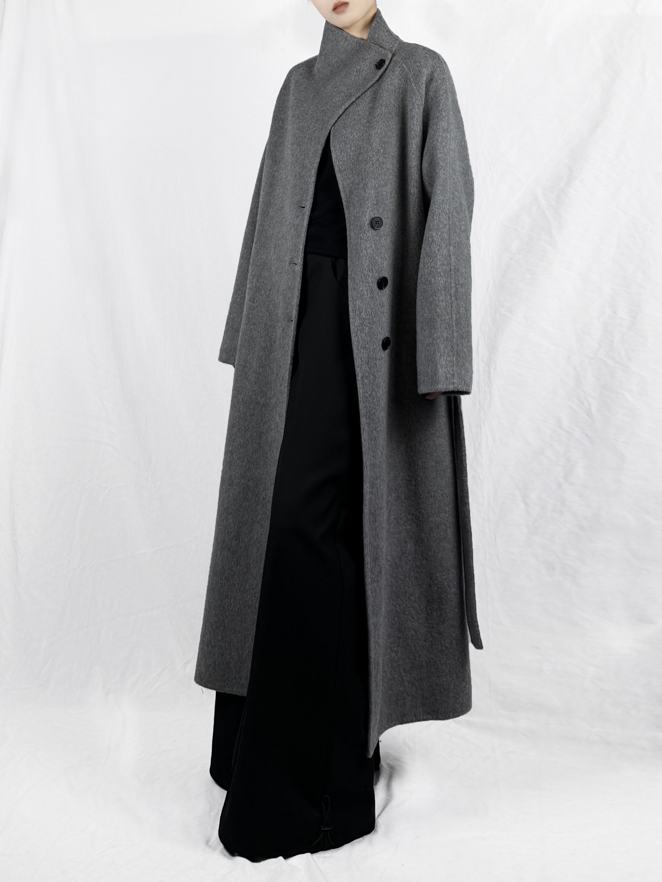 Jieyu High-Neck Tie Double-Sided Wool Long Coat