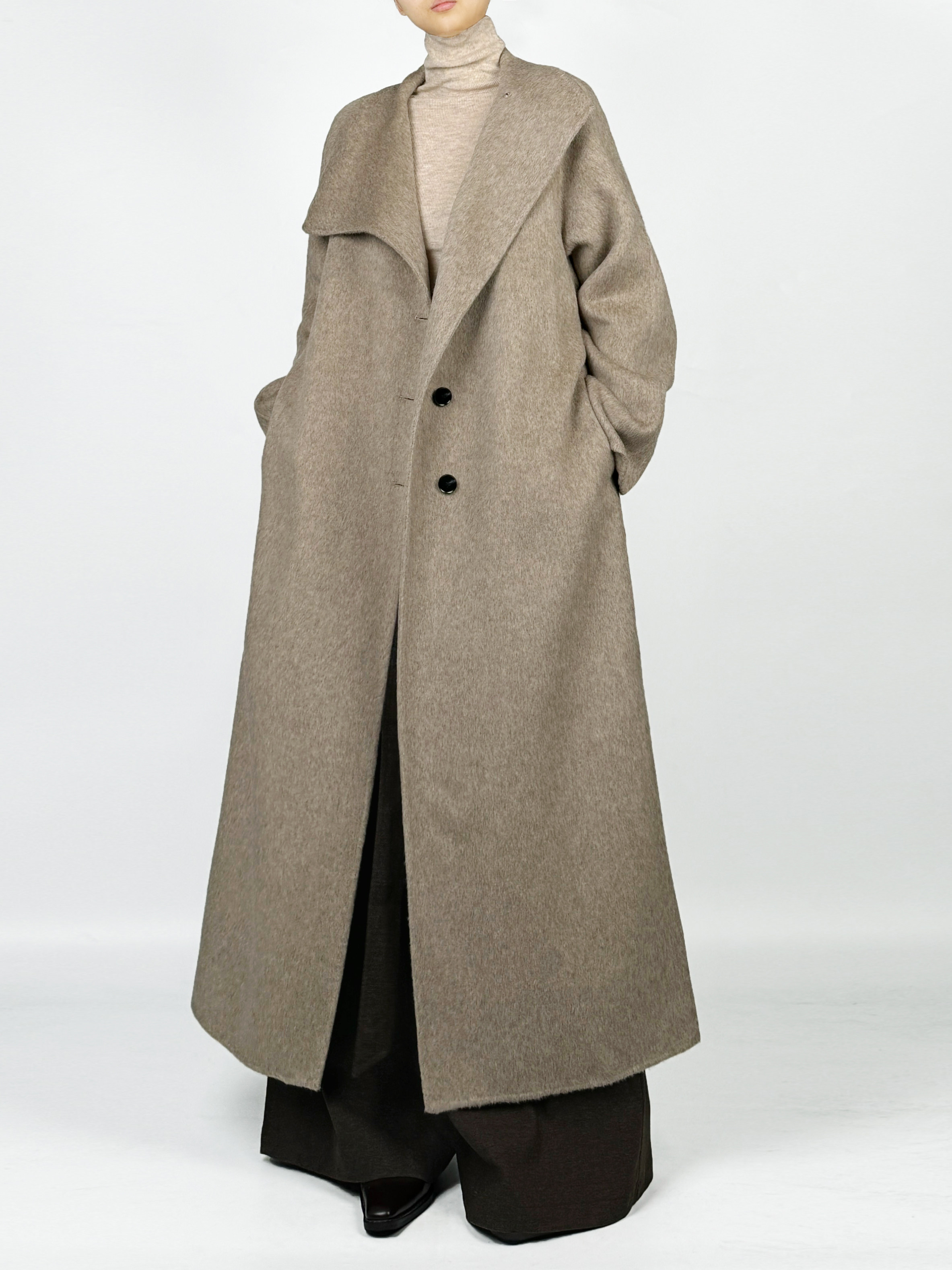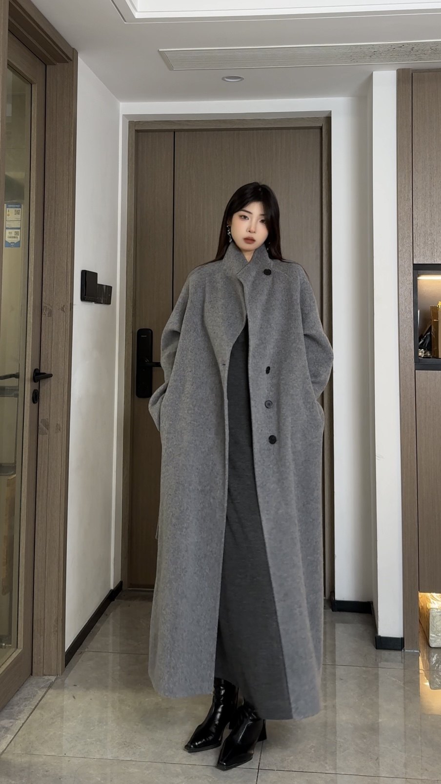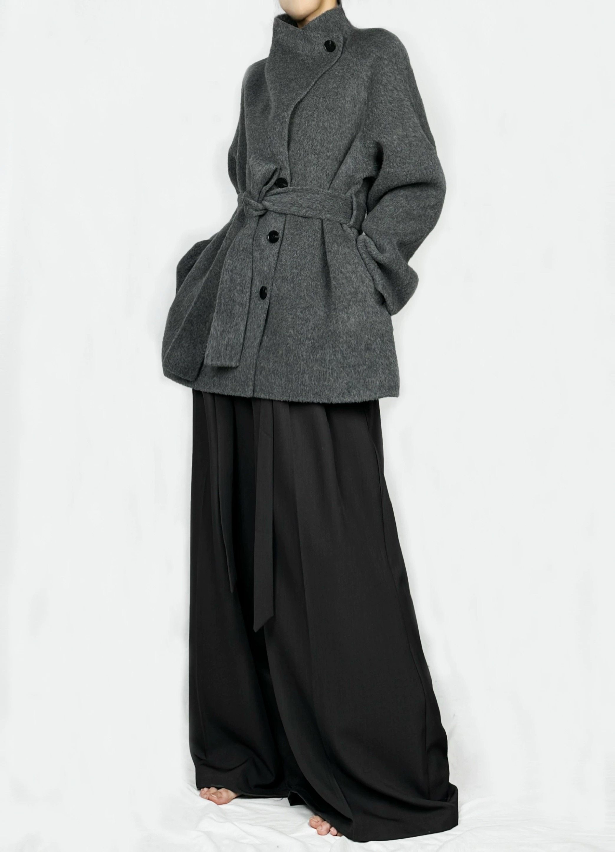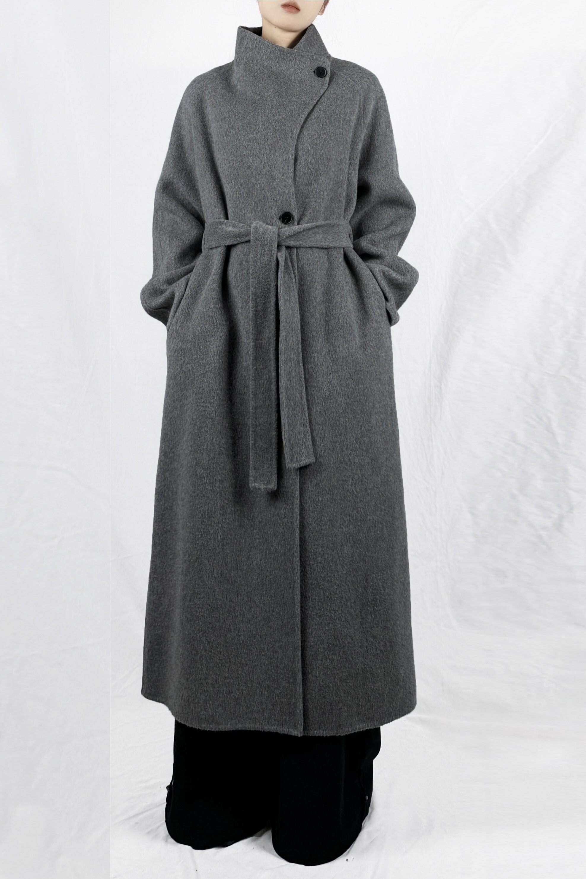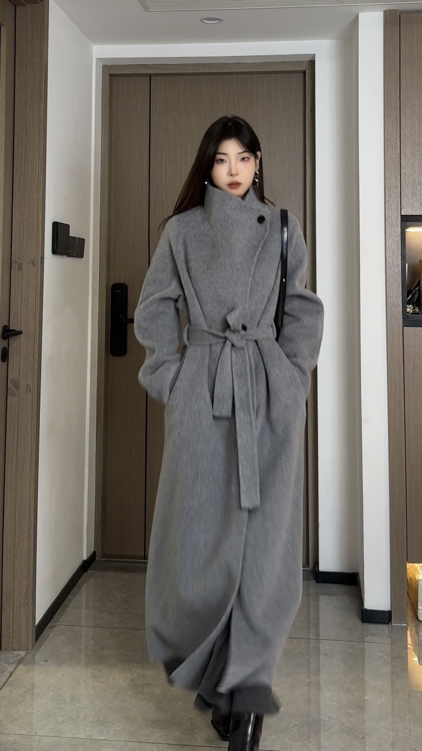 Jieyu High-Neck Tie Double-Sided Wool Long Coat