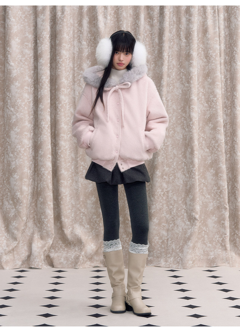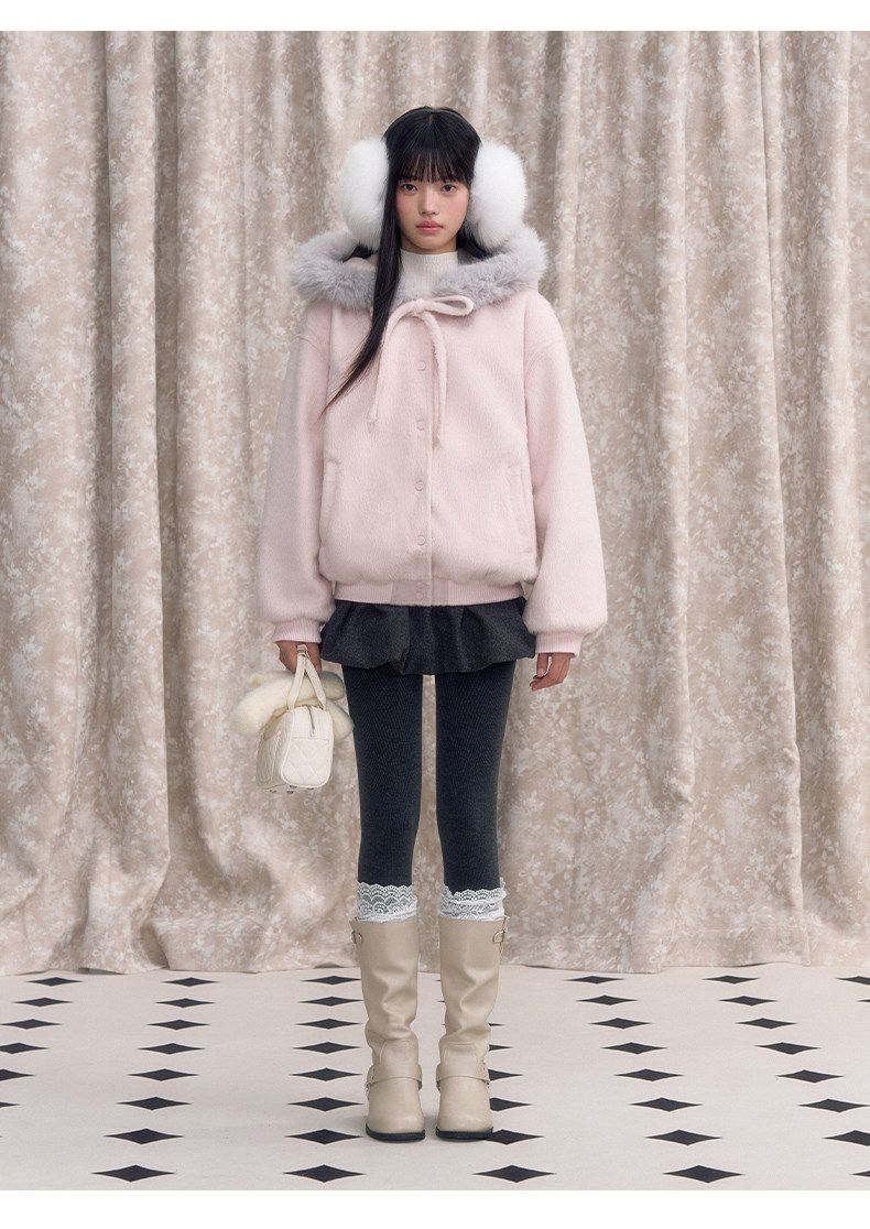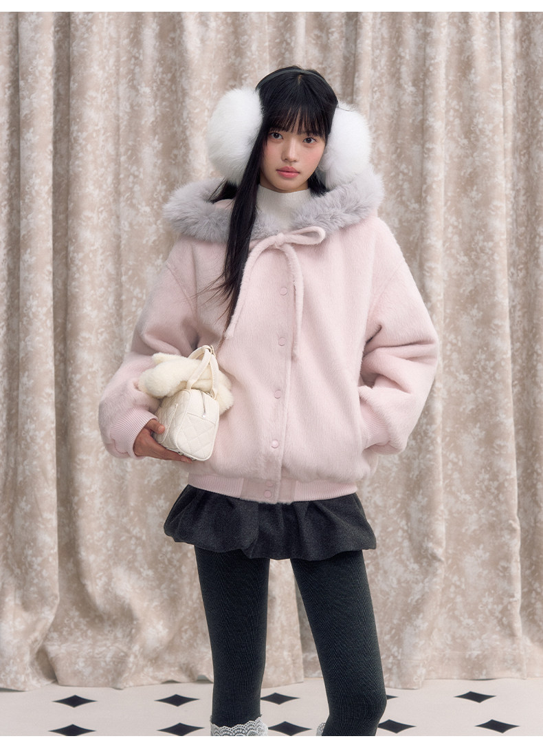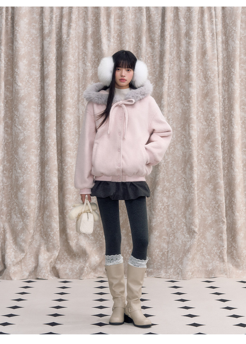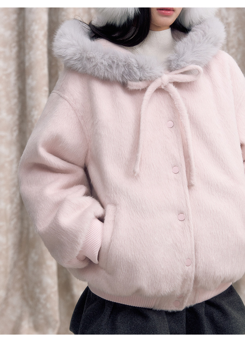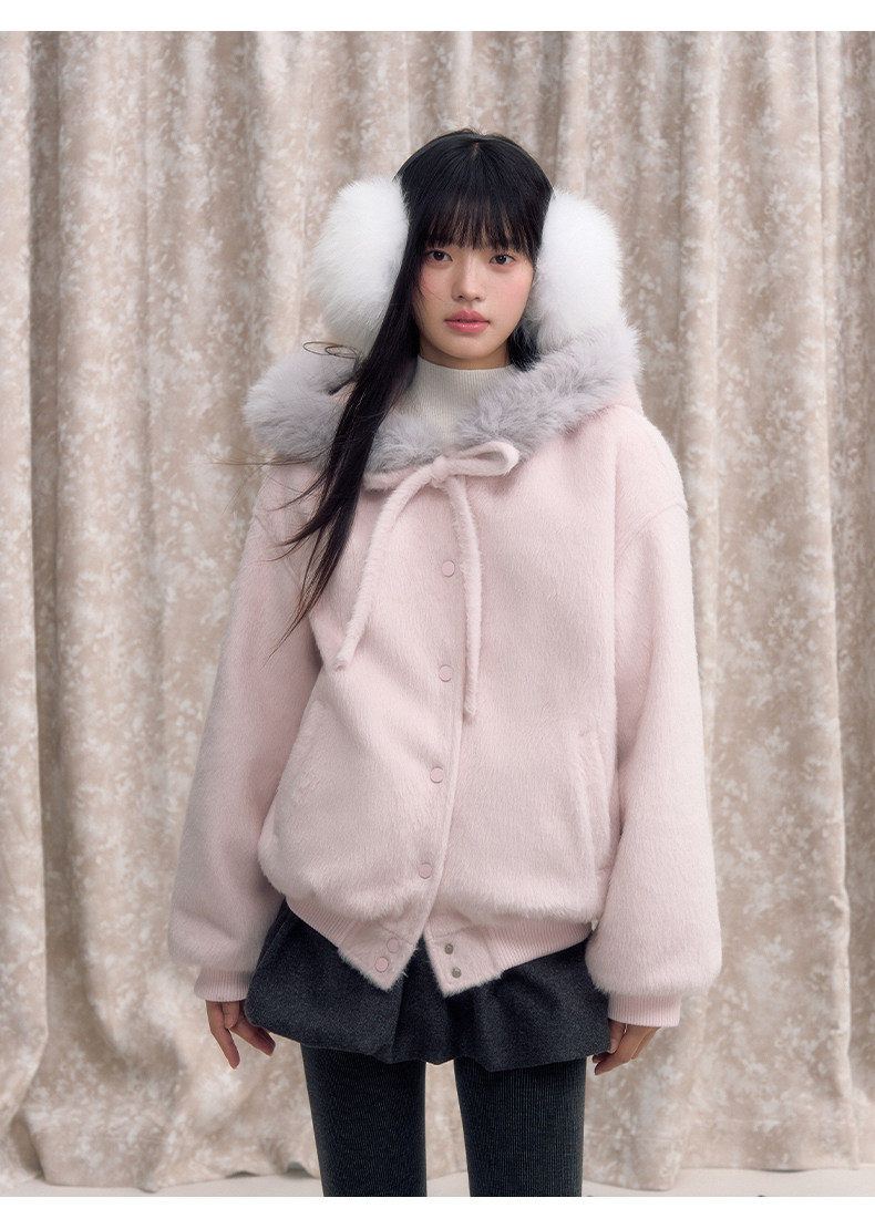 Soote Season Original Korean-Style Pink Bow Hooded Fur-Lined Padded Baseball Jacket