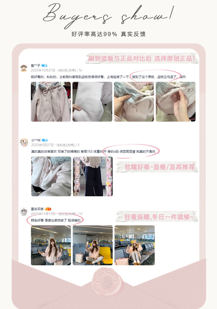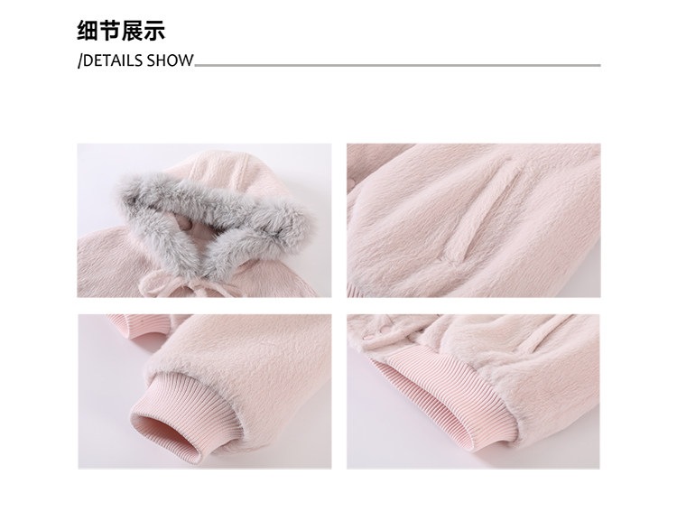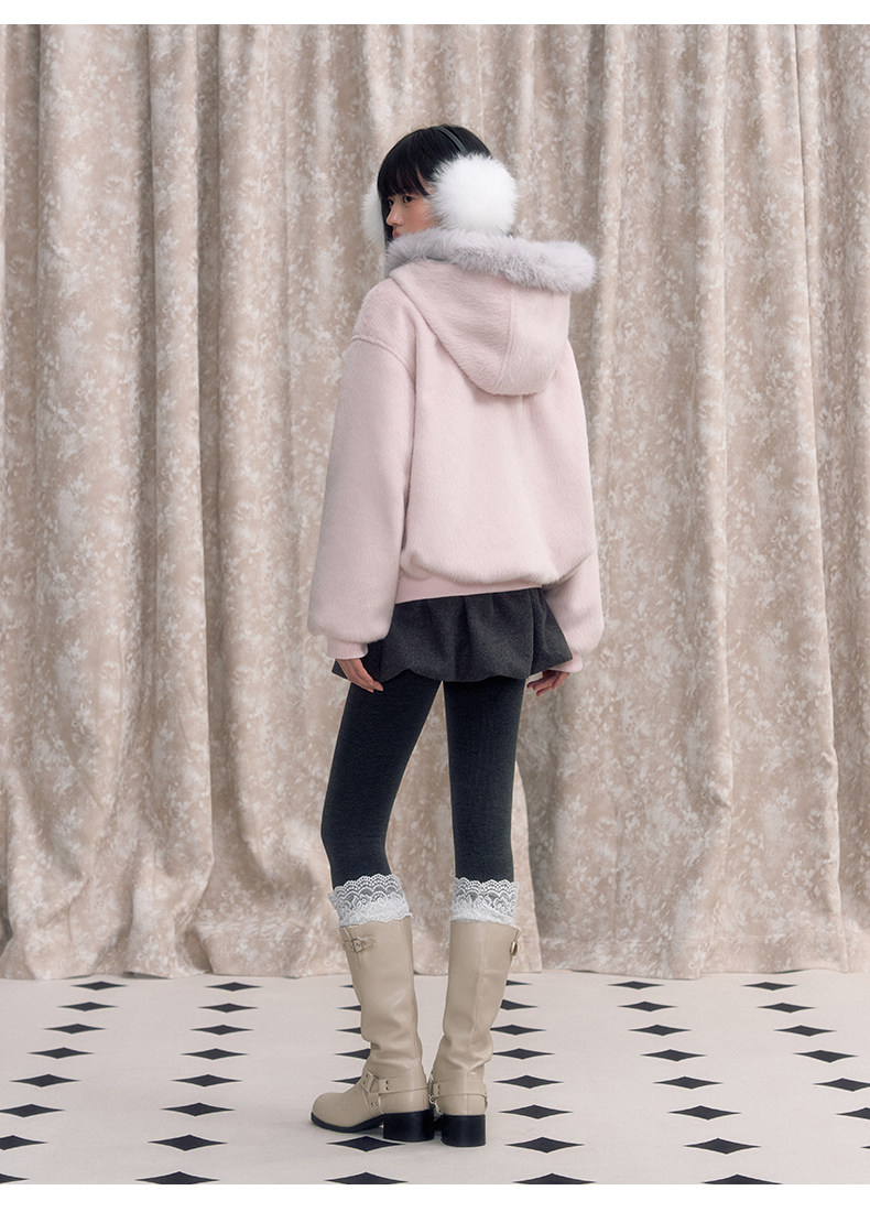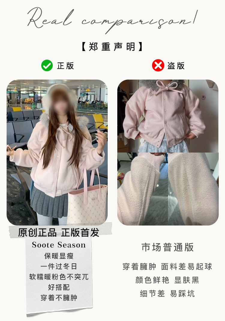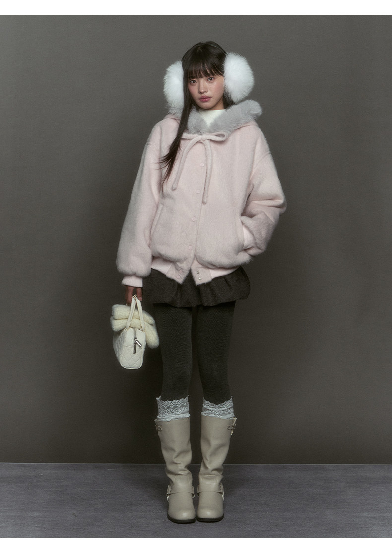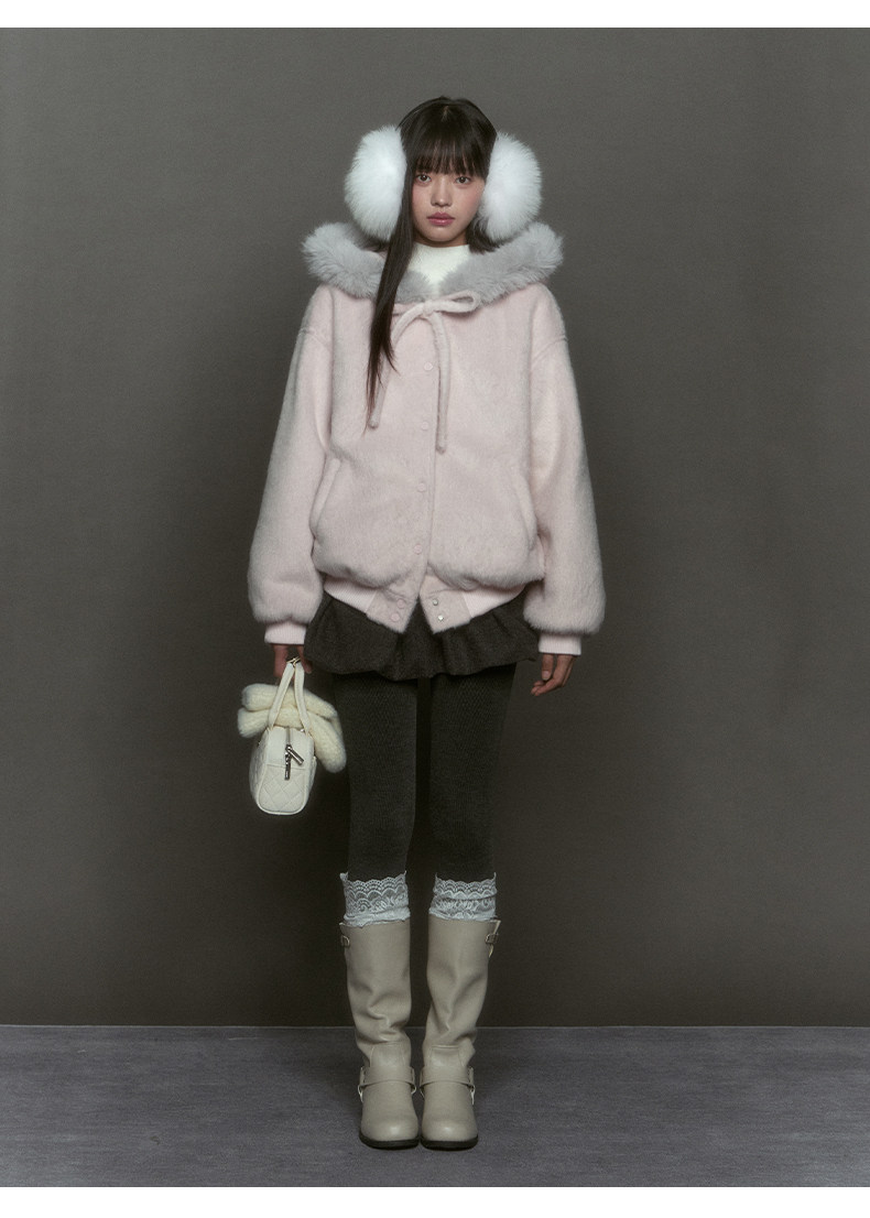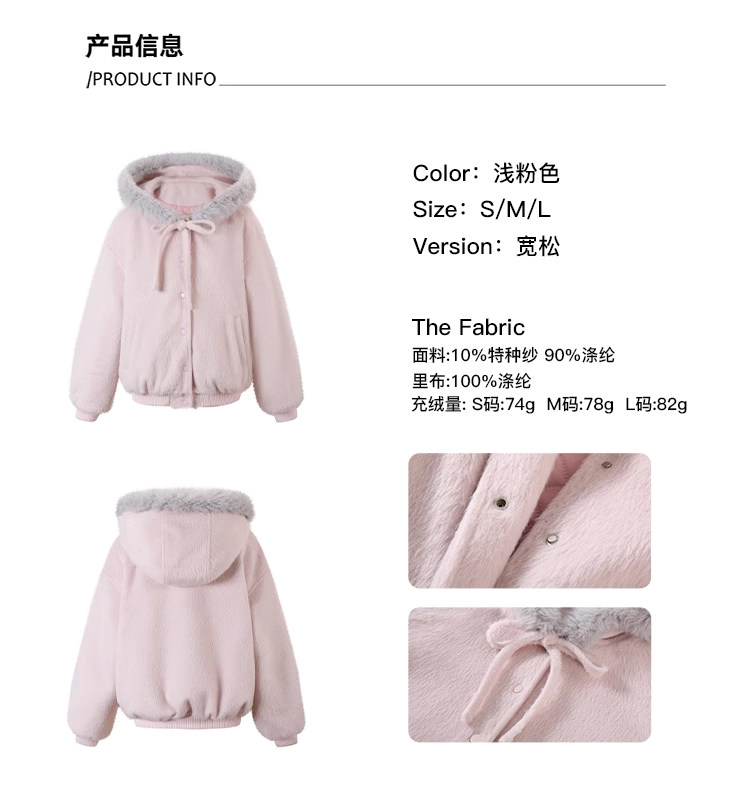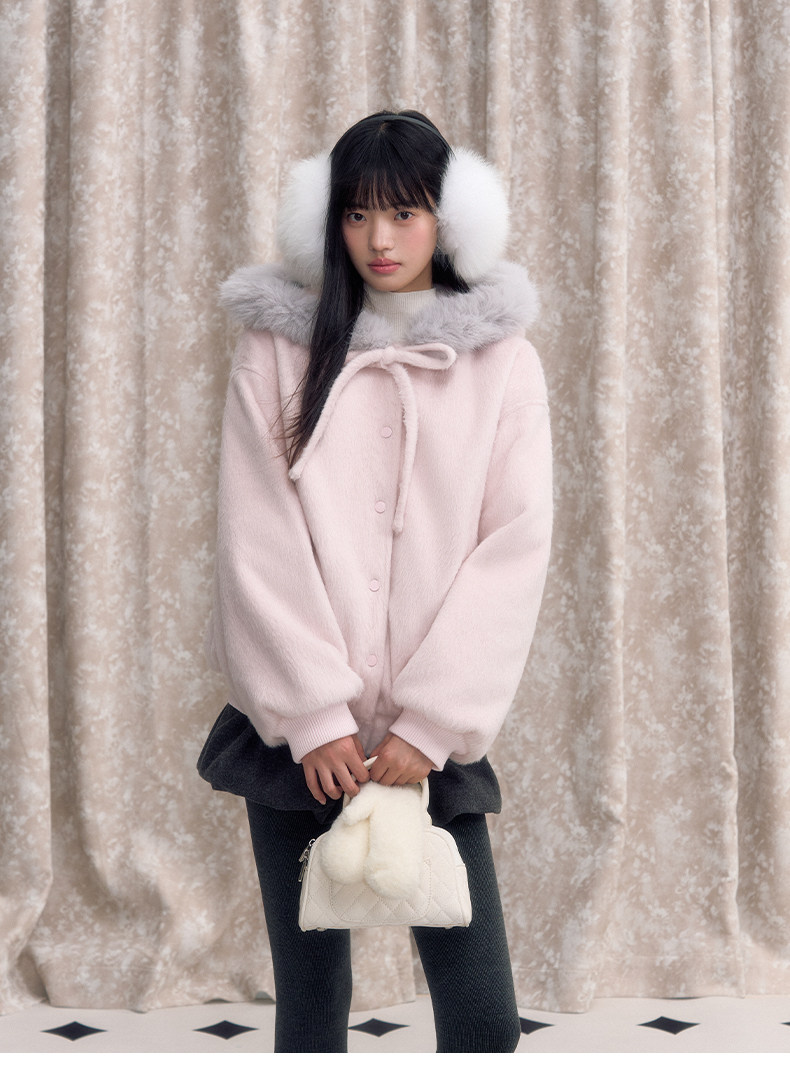 Soote Season Original Korean-Style Pink Bow Hooded Fur-Lined Padded Baseball Jacket