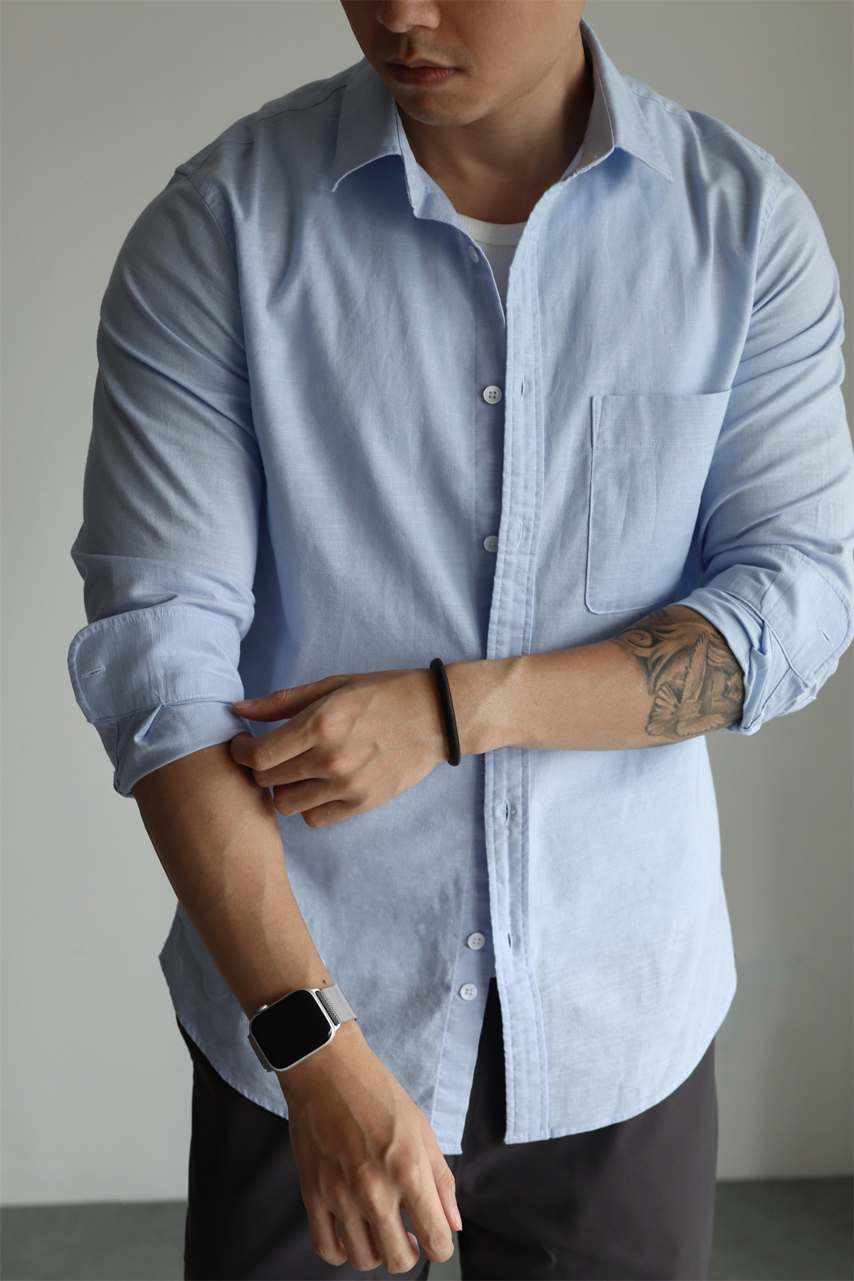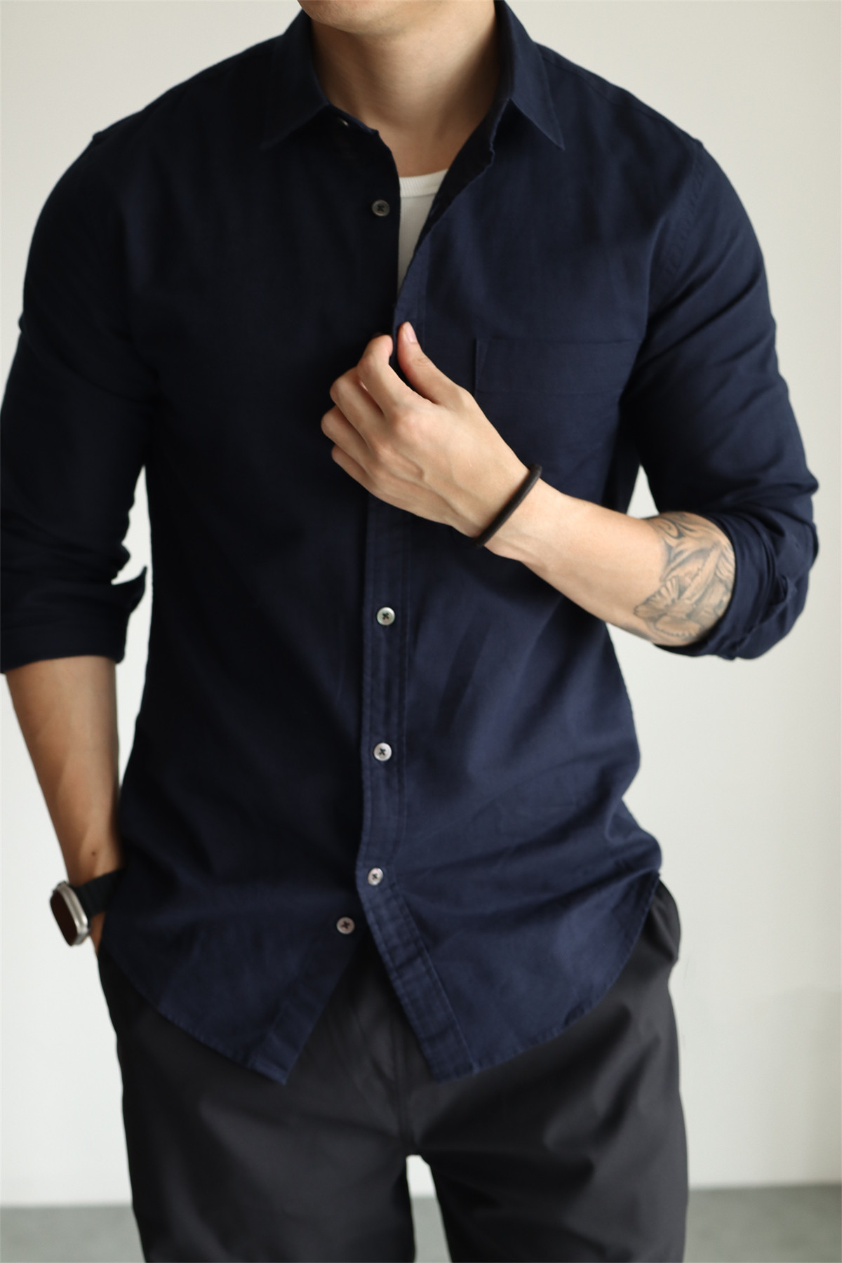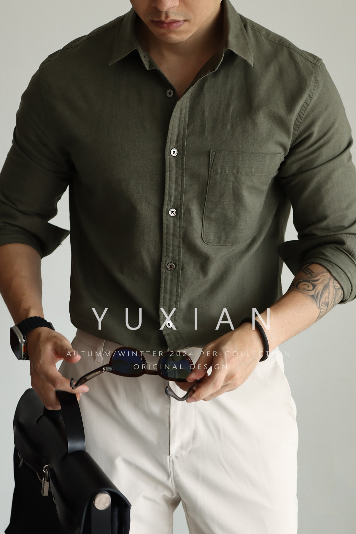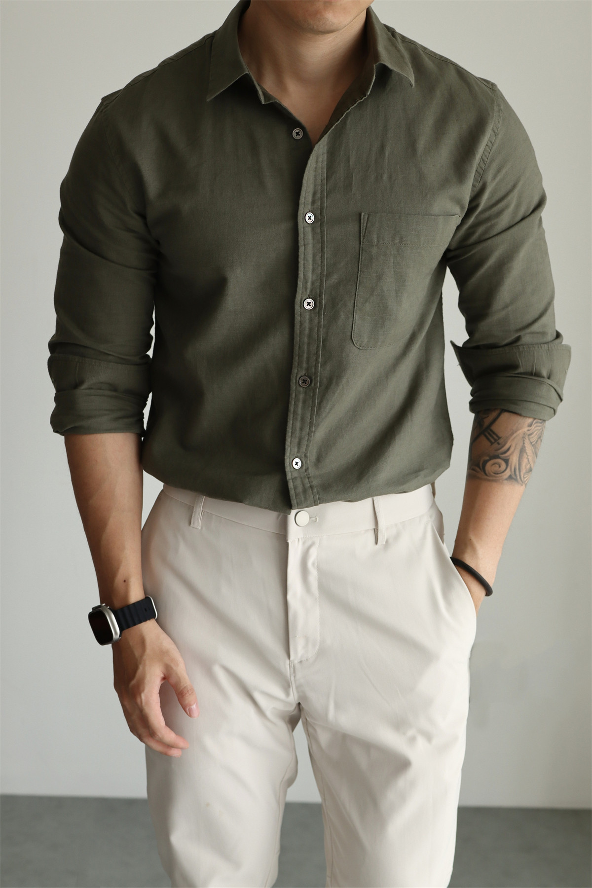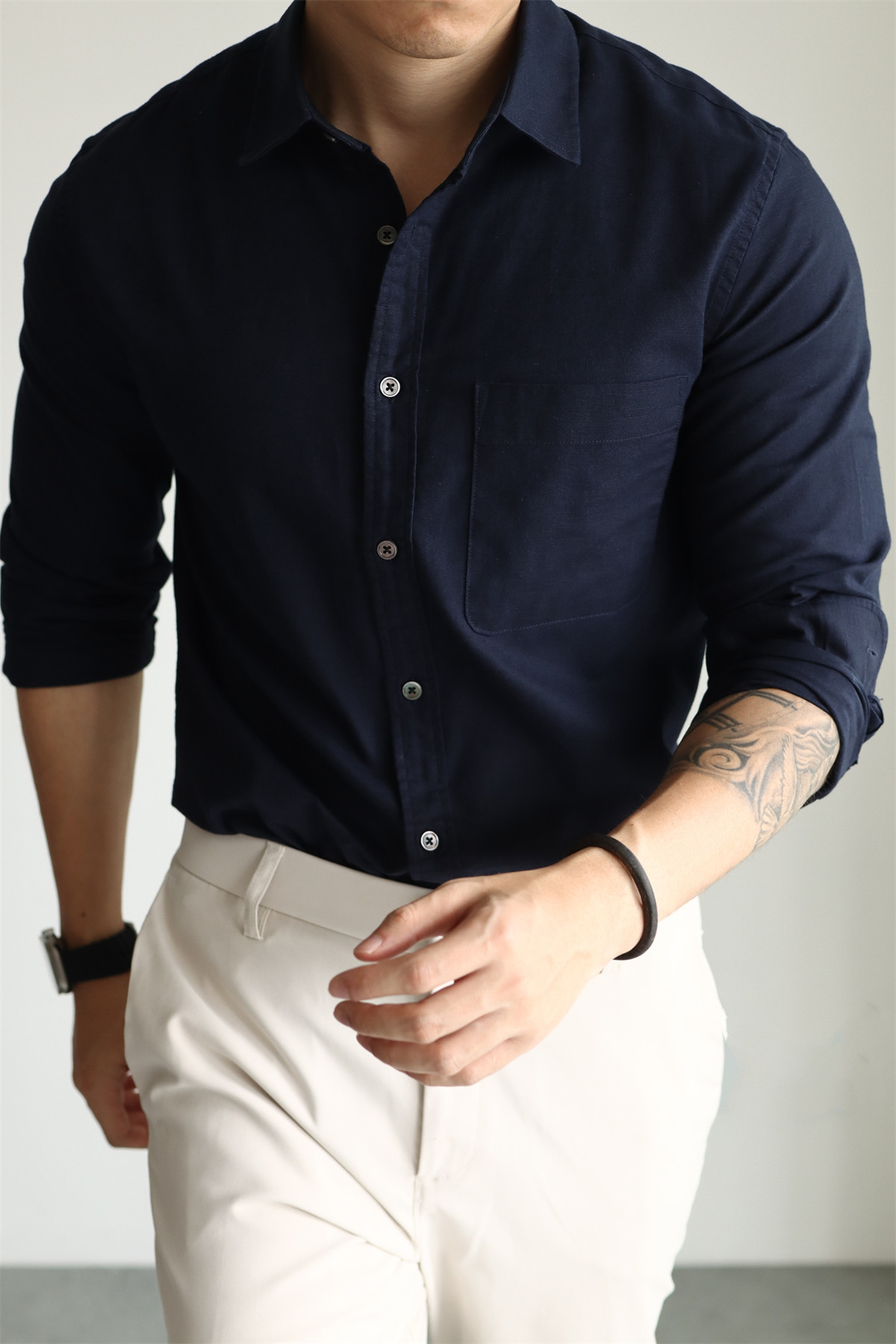 Yuxian High-End Linen Cotton Long-Sleeve Shirt with Pockets, Casual Business Lapel, Slim Fit for Commuting, Spring, Autumn and Summer for Men