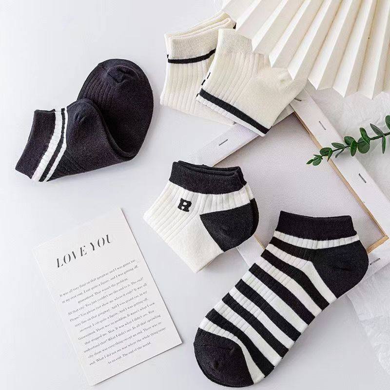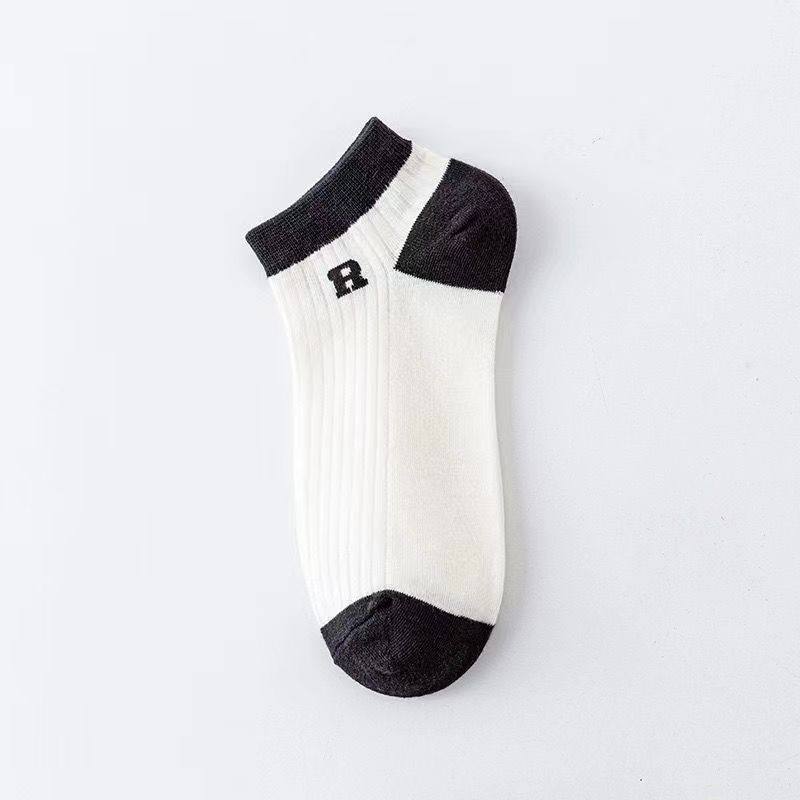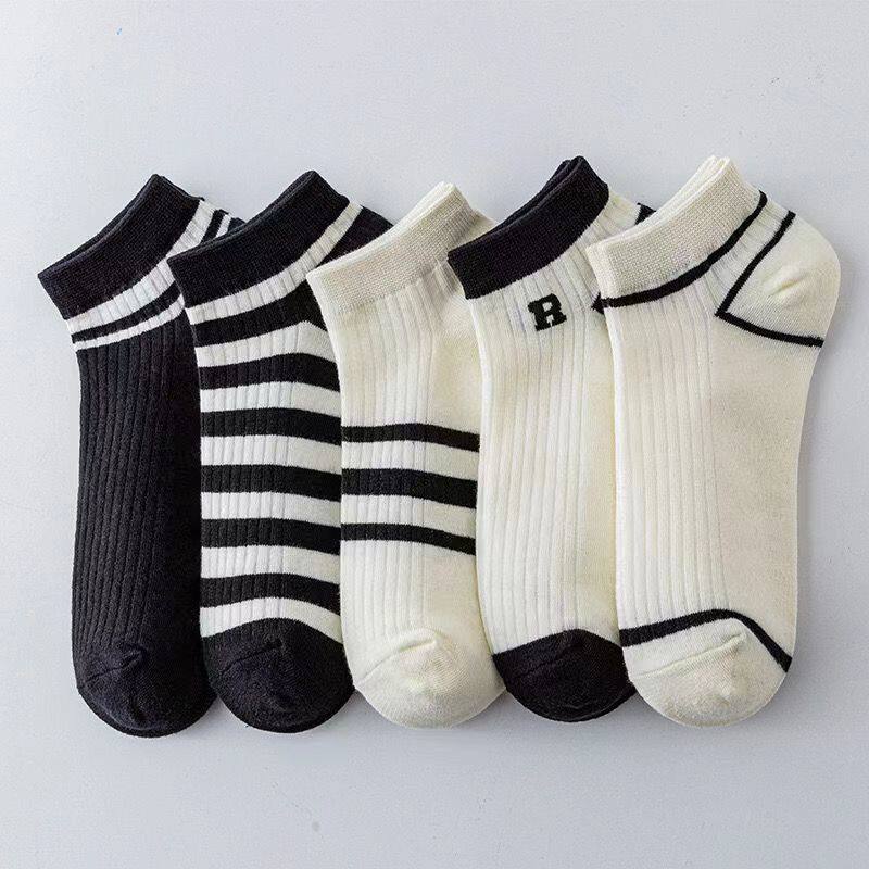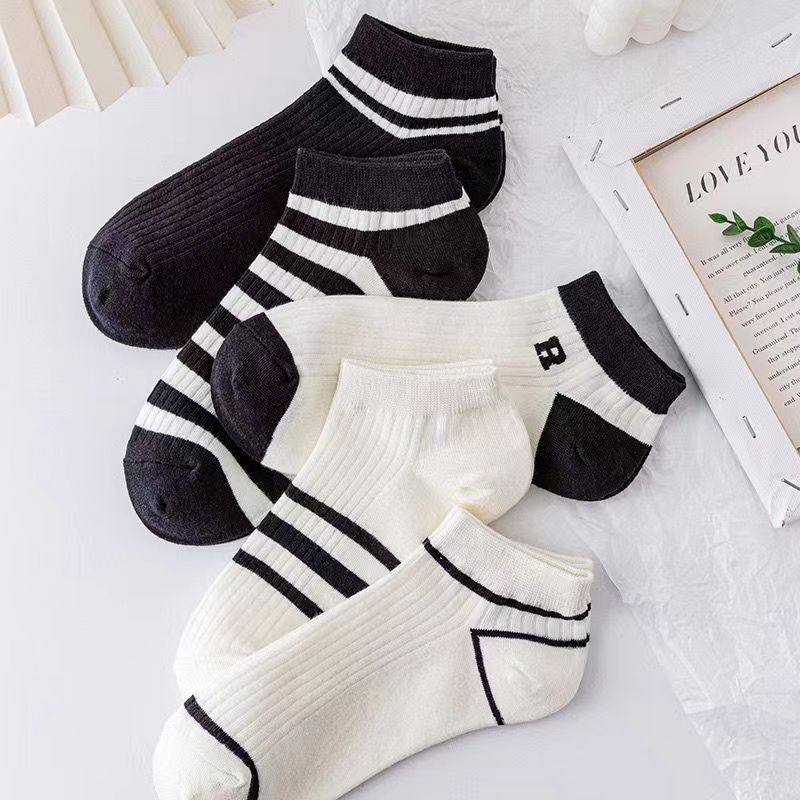 Black and White Striped Socks for Women, Short Socks, Thin Summer Style, Trendy and Versatile, High Aesthetic Value, Sporty, Simple Letter R Boat Socks for Women