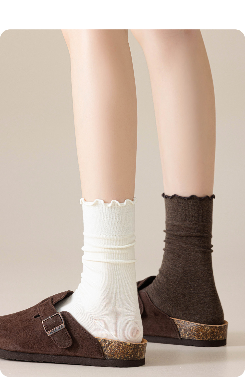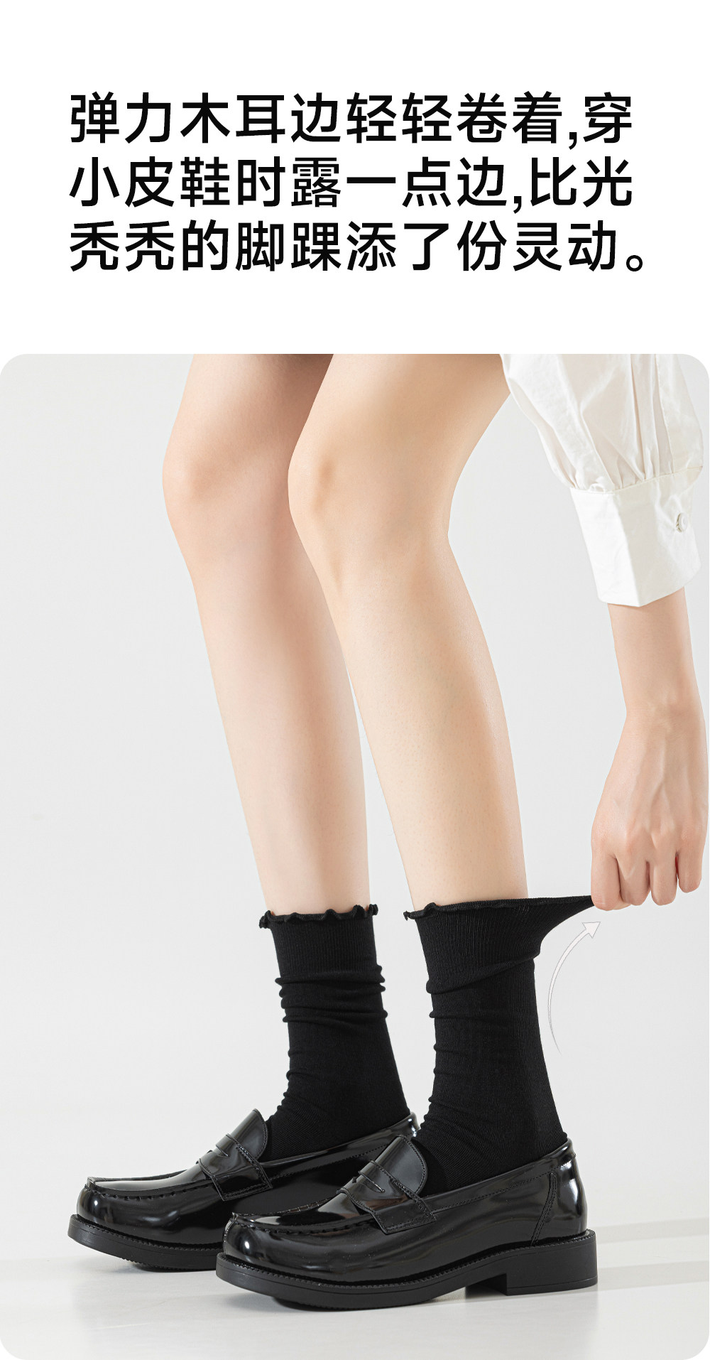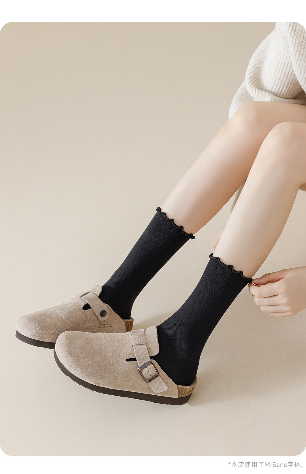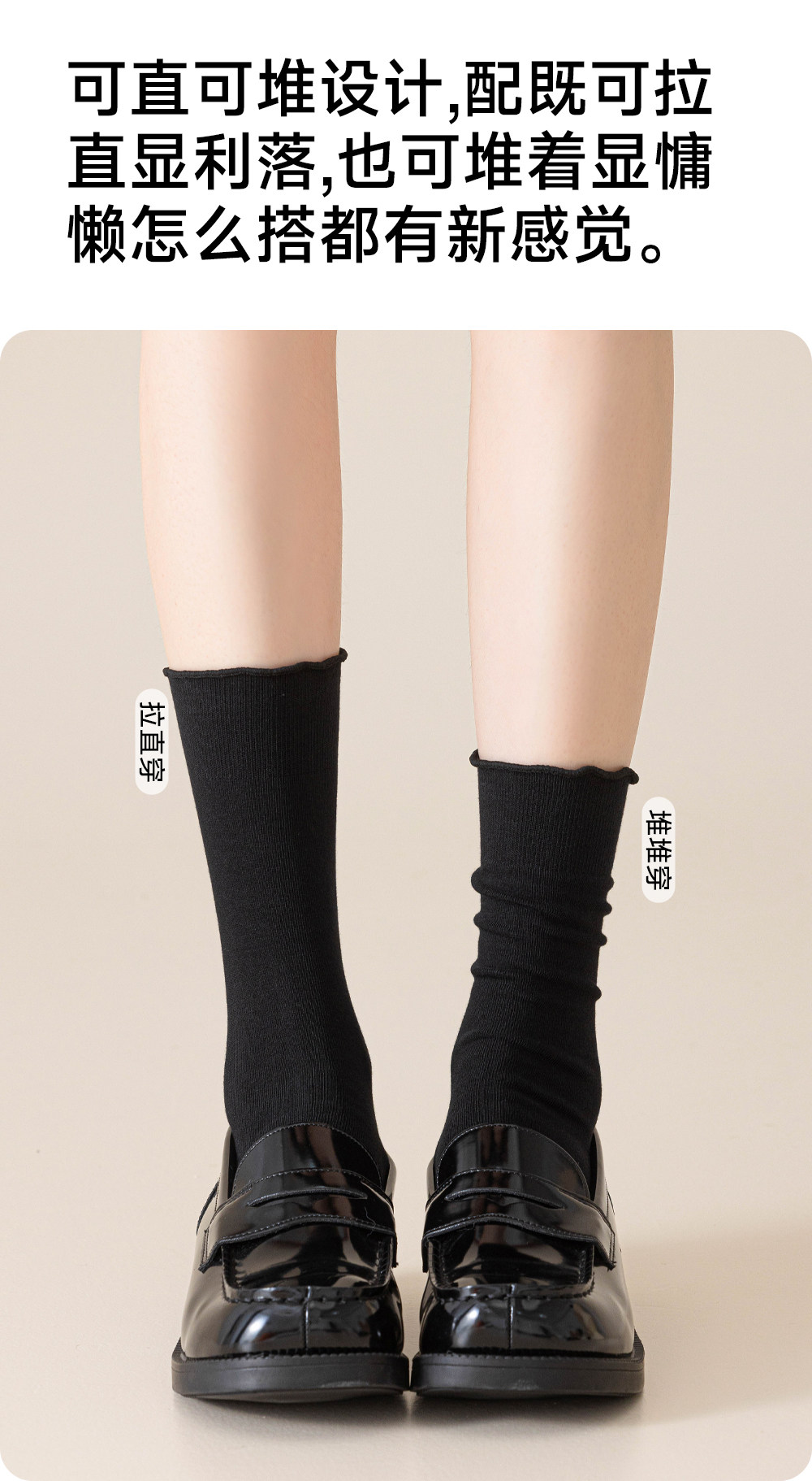 Black Pure Cotton Mid-Calf Socks with Ruffled Edges for Women, Suitable for Autumn and Winter, to Pair with Loafers or Casual Shoes, Maternity Long Socks
