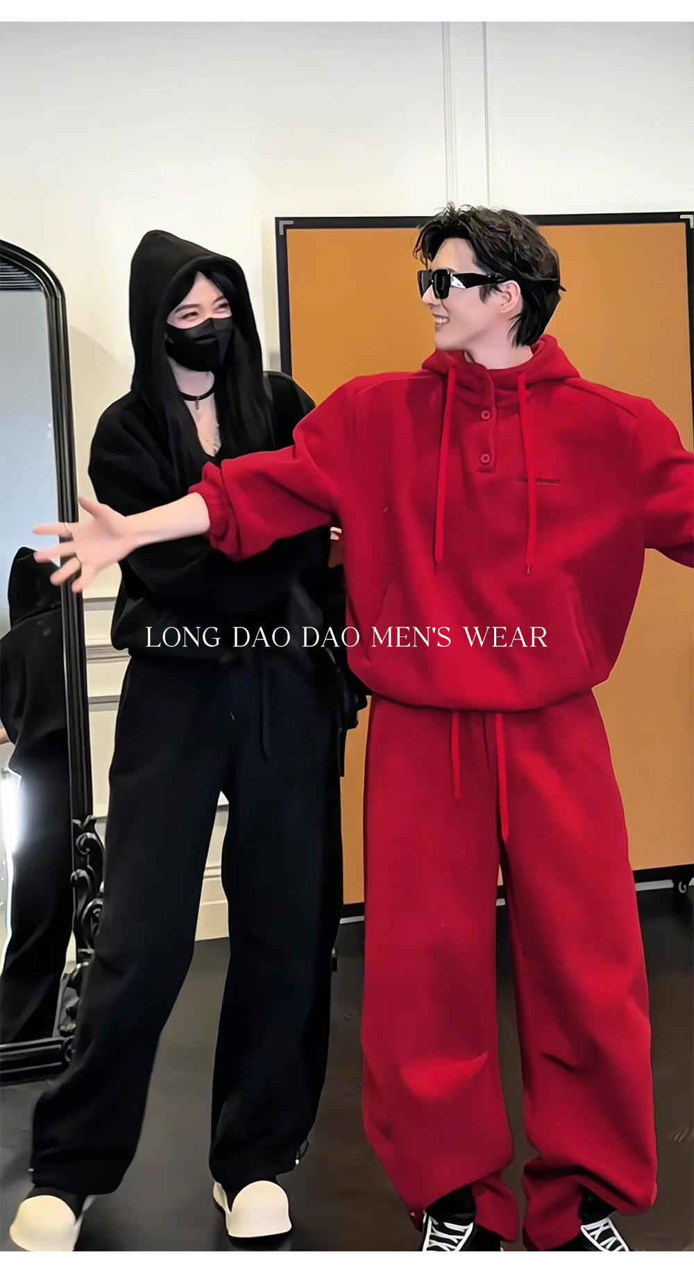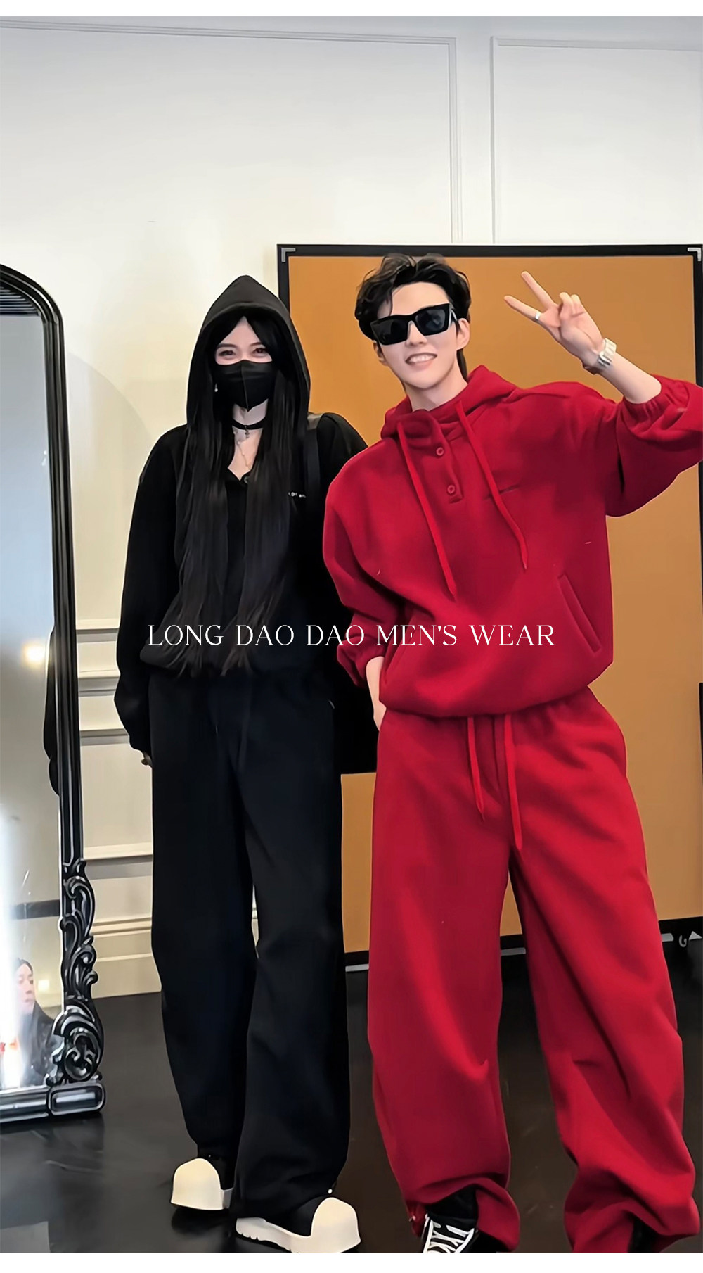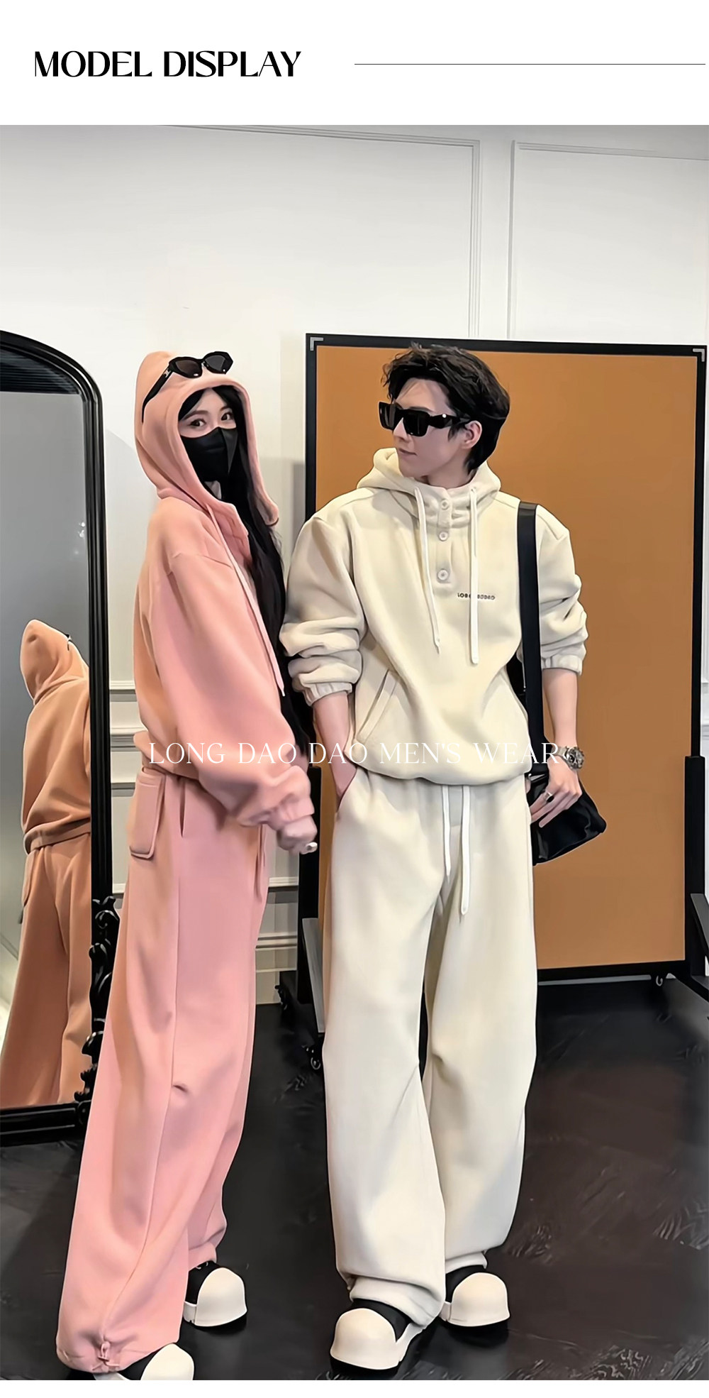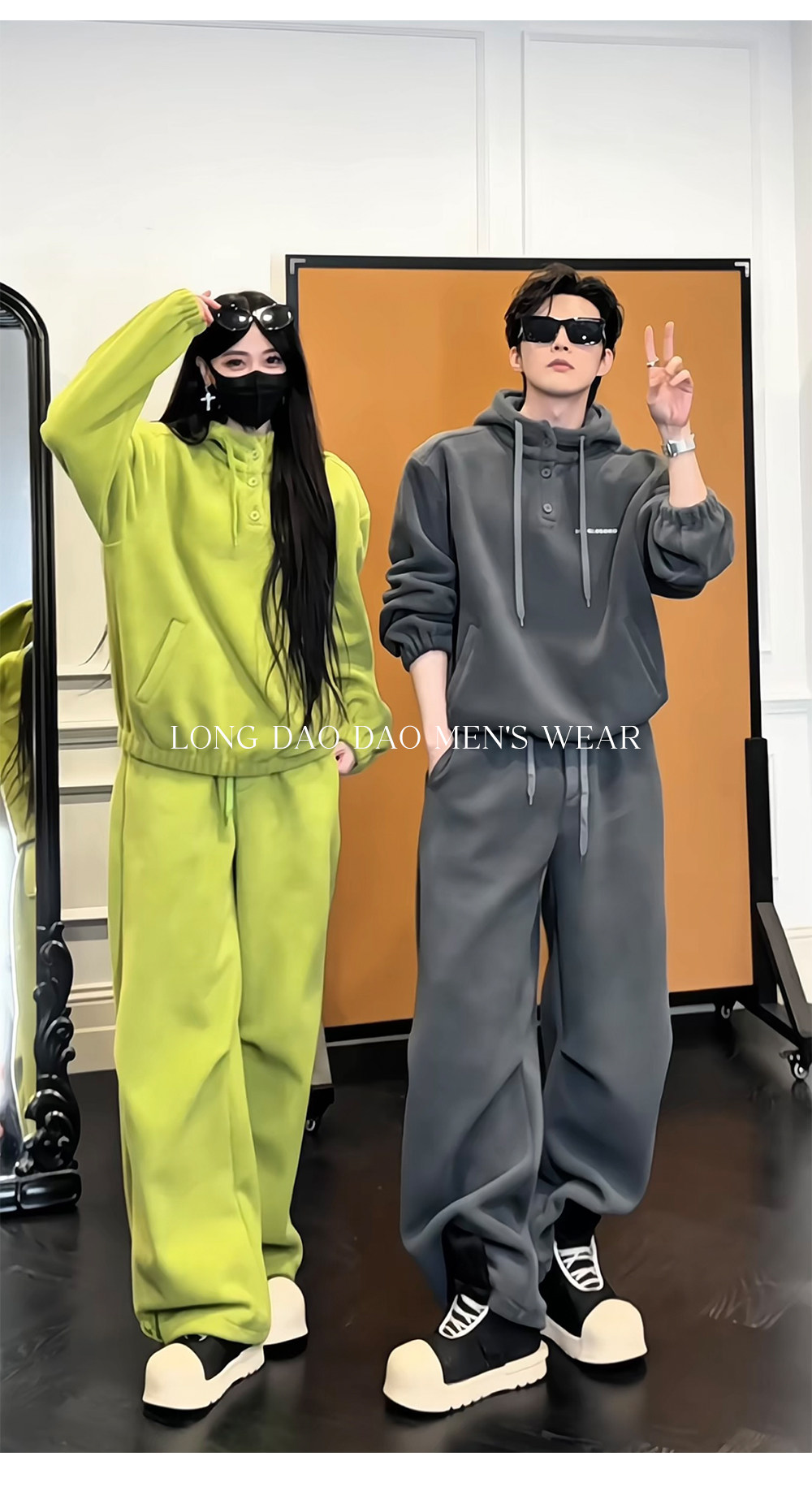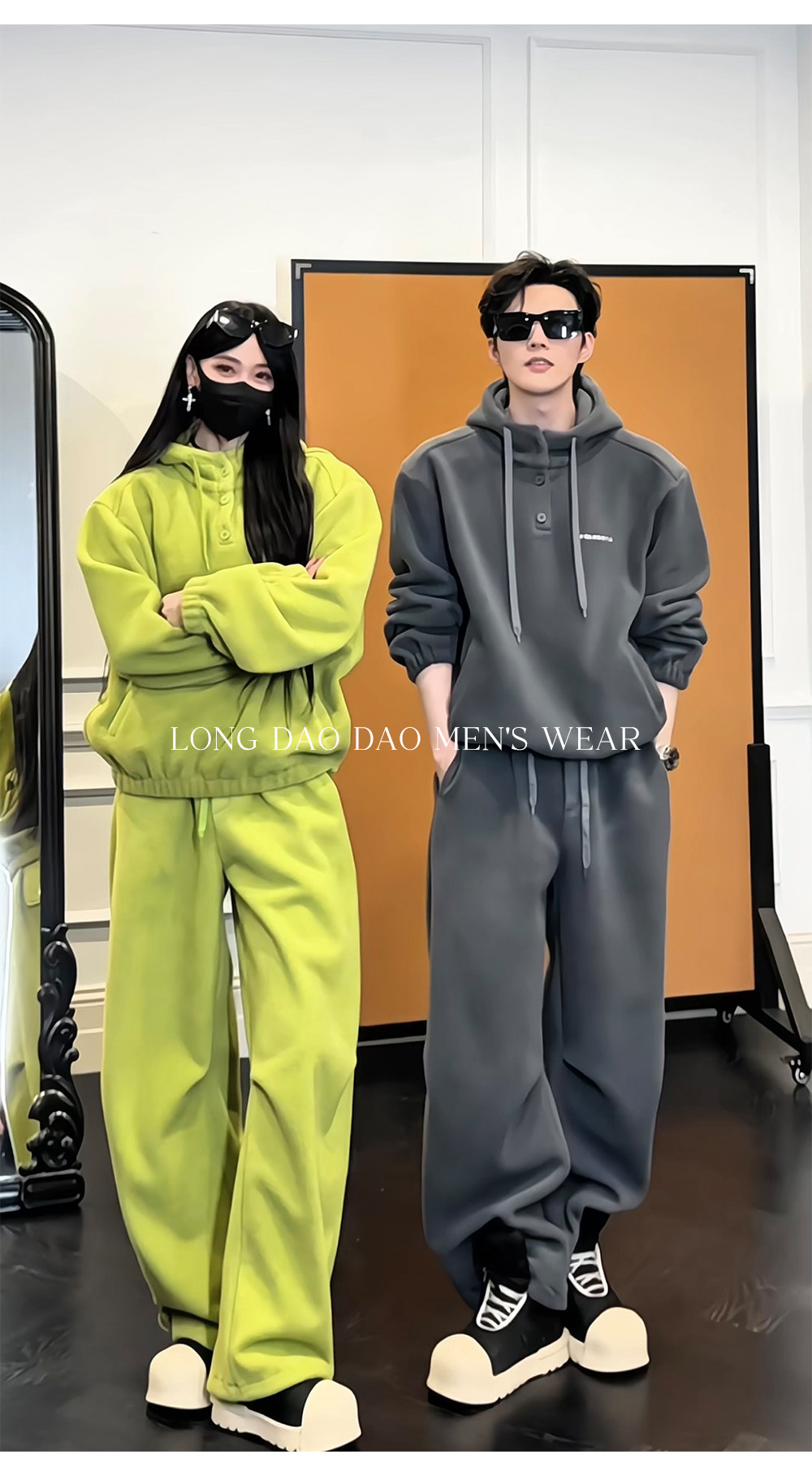 Longdodao's New Winter Style Casual and Thickened Sportswear Set for Couples, Trendy Solid Color Simple Sweatshirt and Long Pants