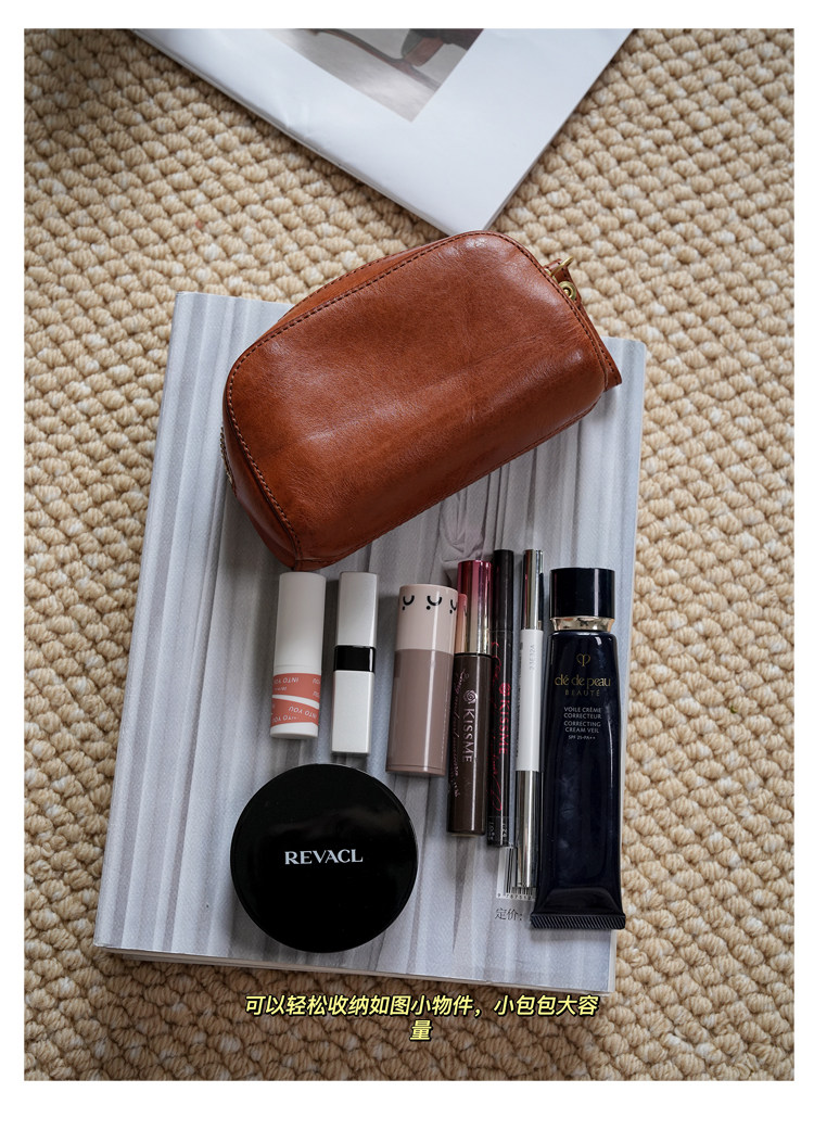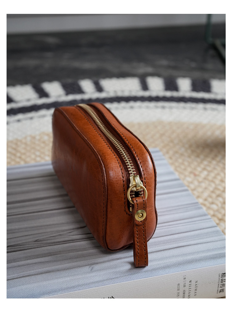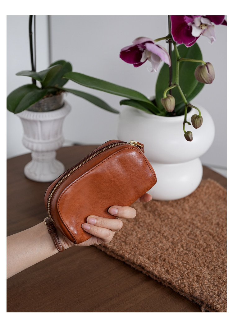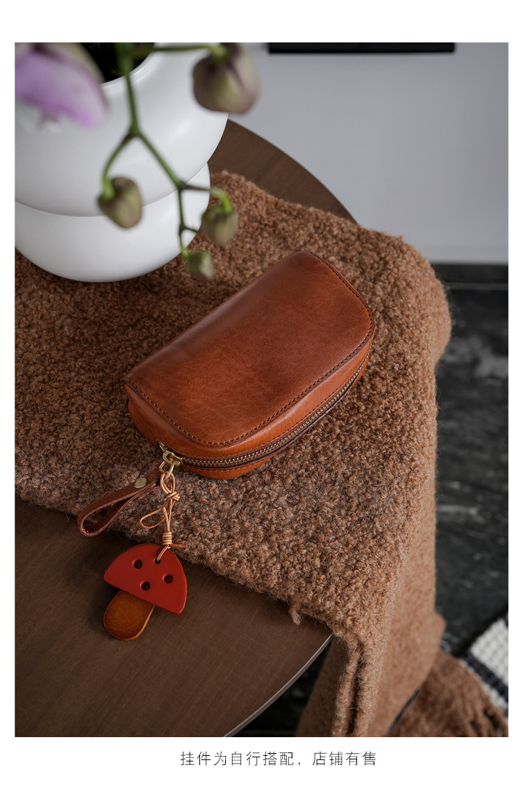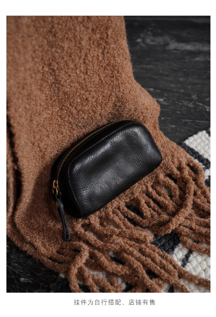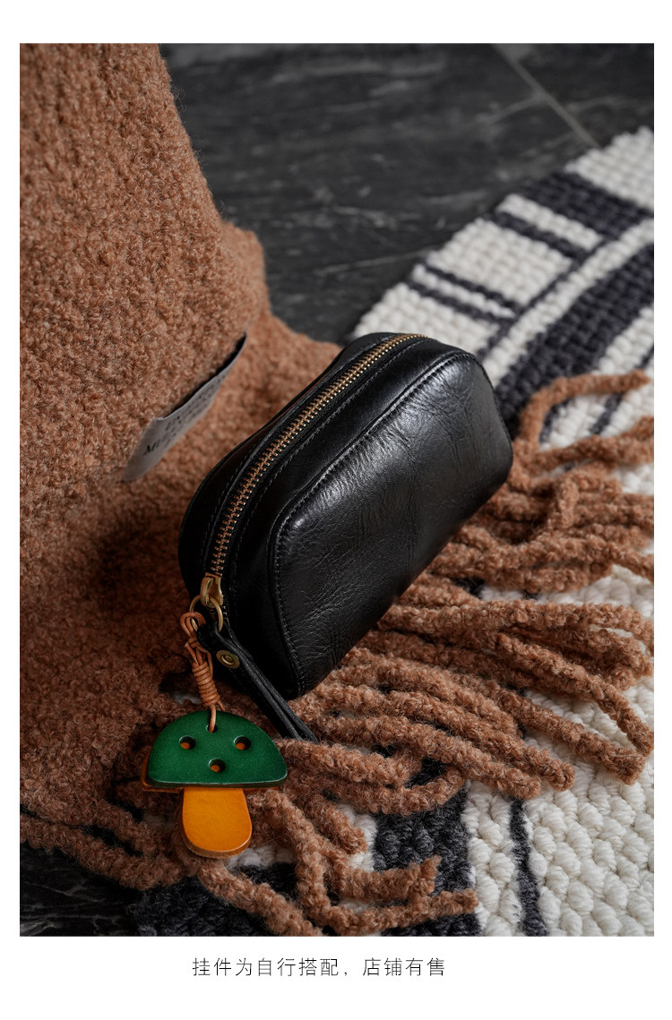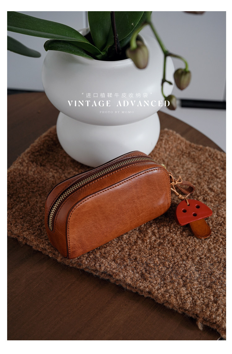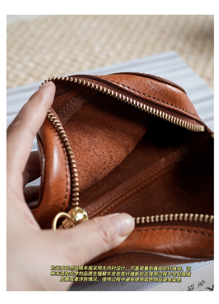 Genuine Leather Vintage Vegetable-Tanned First-Layer Cowhide Women's Compact Coin Key Earphone Makeup Storage Zipper Clutch Bag for Women