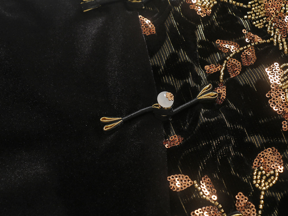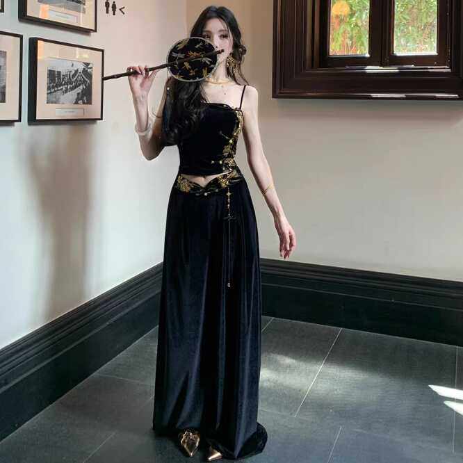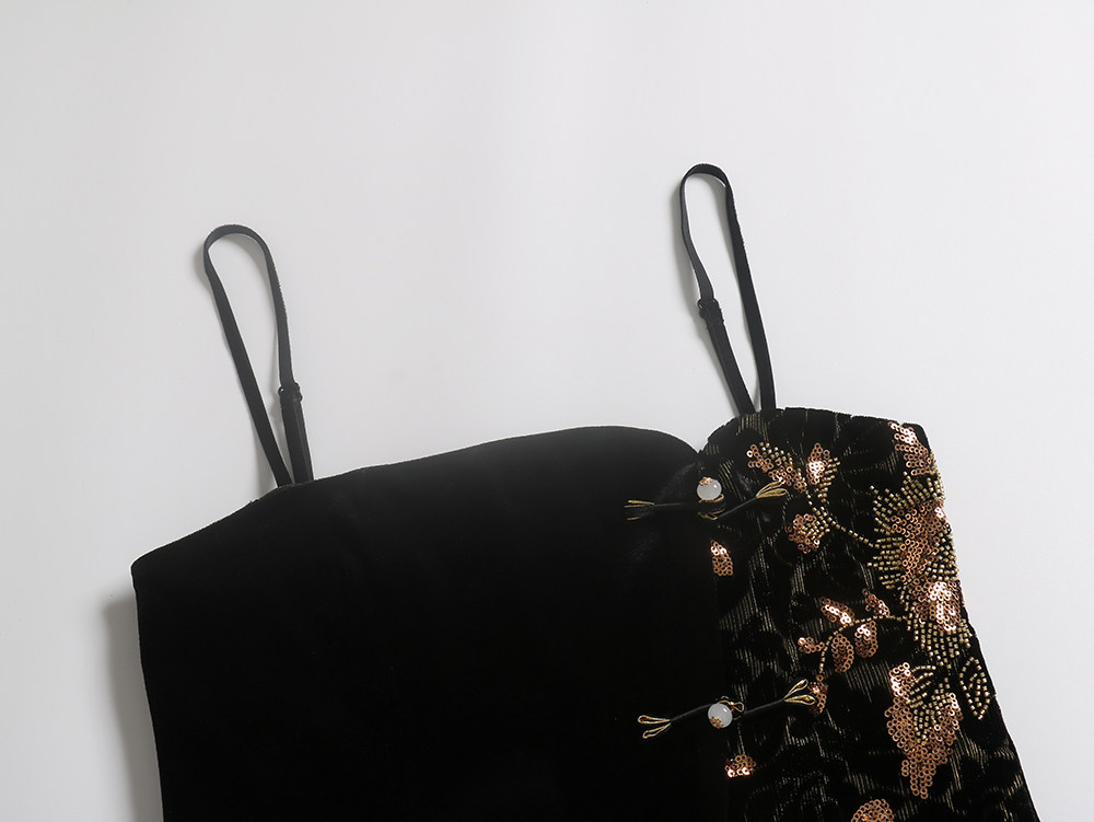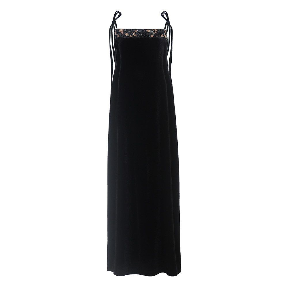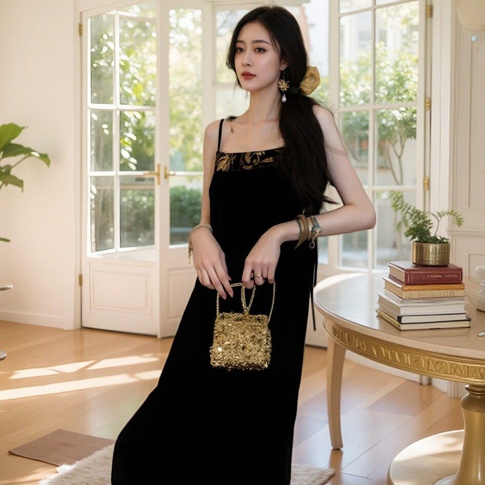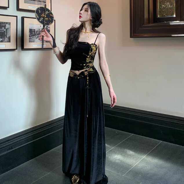 Avlinva【Golden Jade Robe】National Style New Chinese Embroidery Color-Block Fitted Autumn Velvet Camisole Women's Long Dress