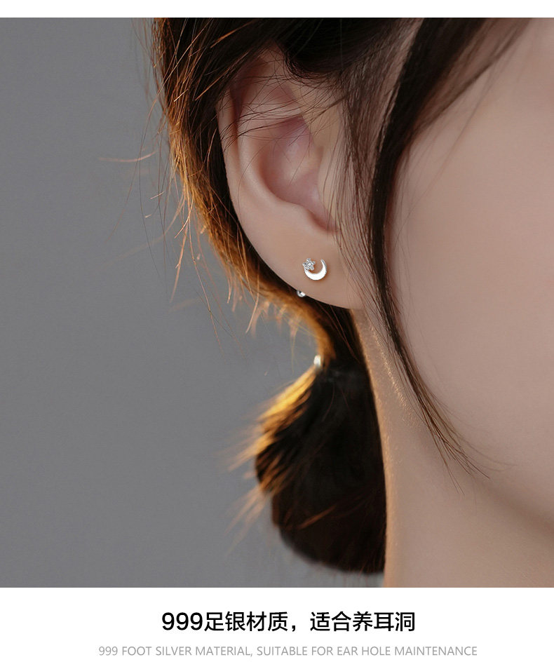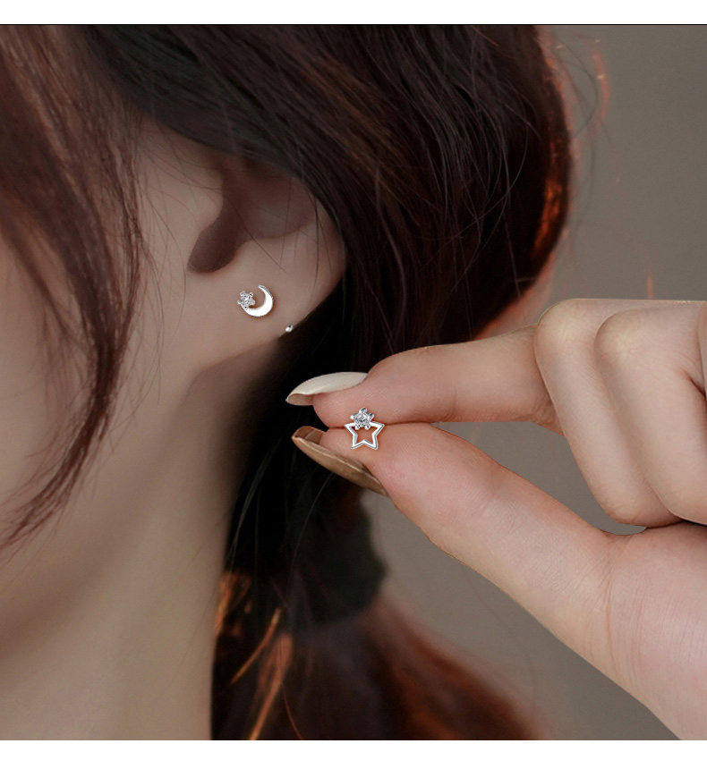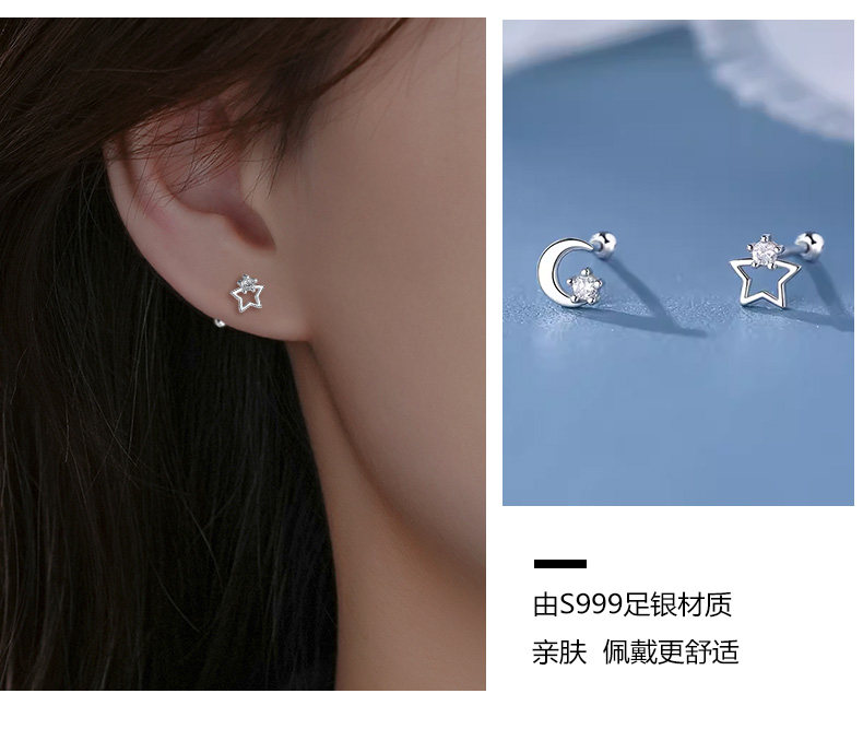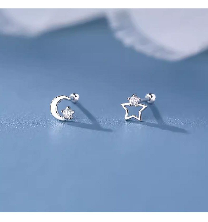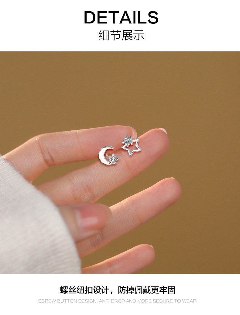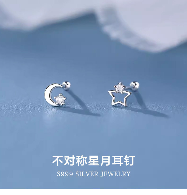 S999 Pure Silver Asymmetrical Star and Moon Screw Earrings for Women, Niche Design, Twist-Lock, Children's Ear Piercing, No Need to Remove Ear Bone Studs