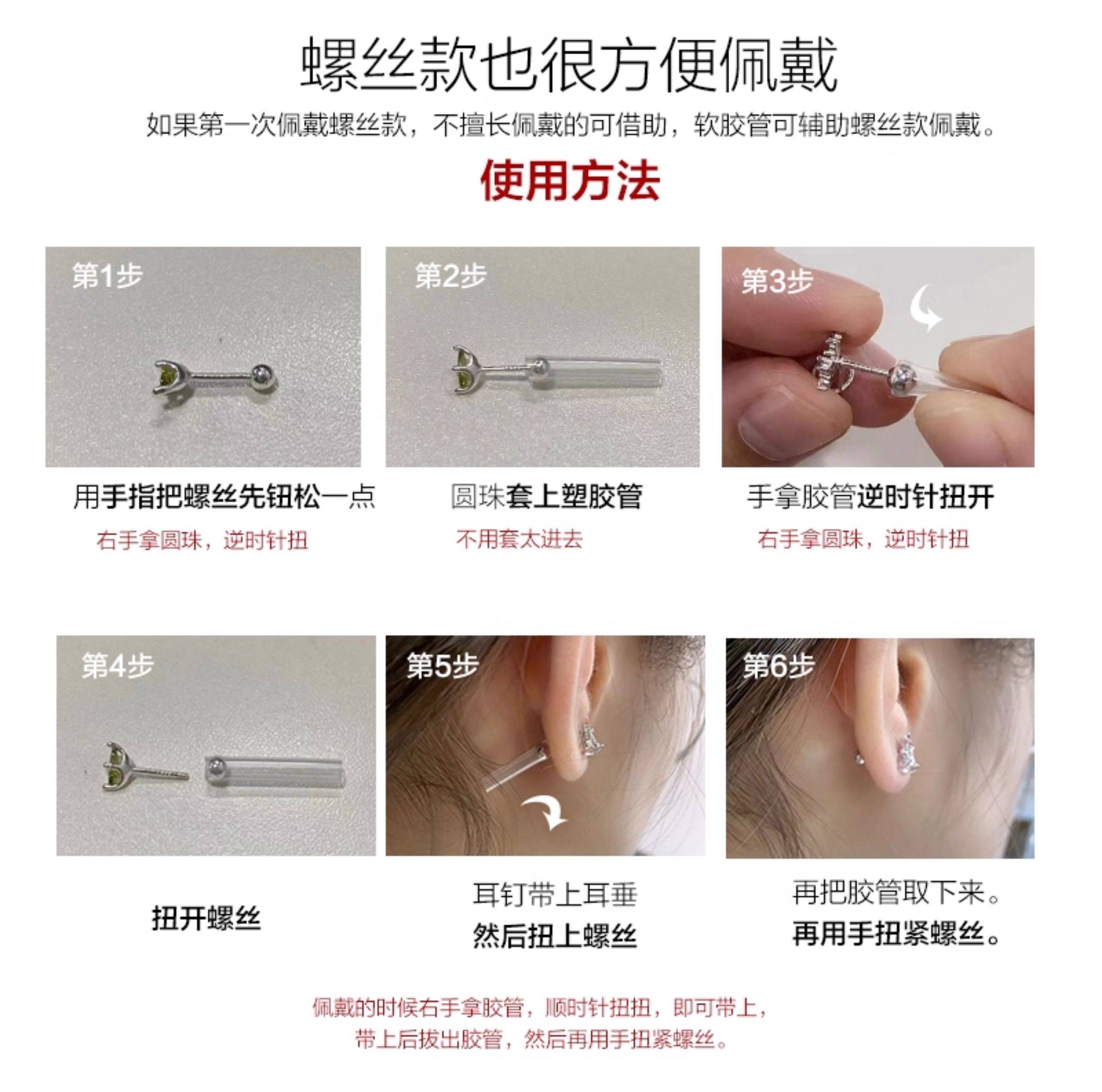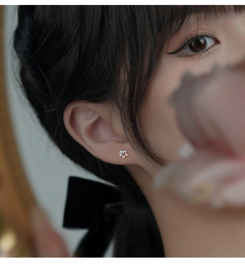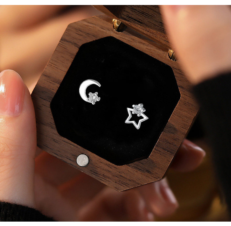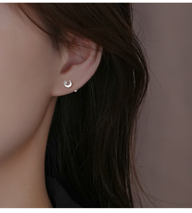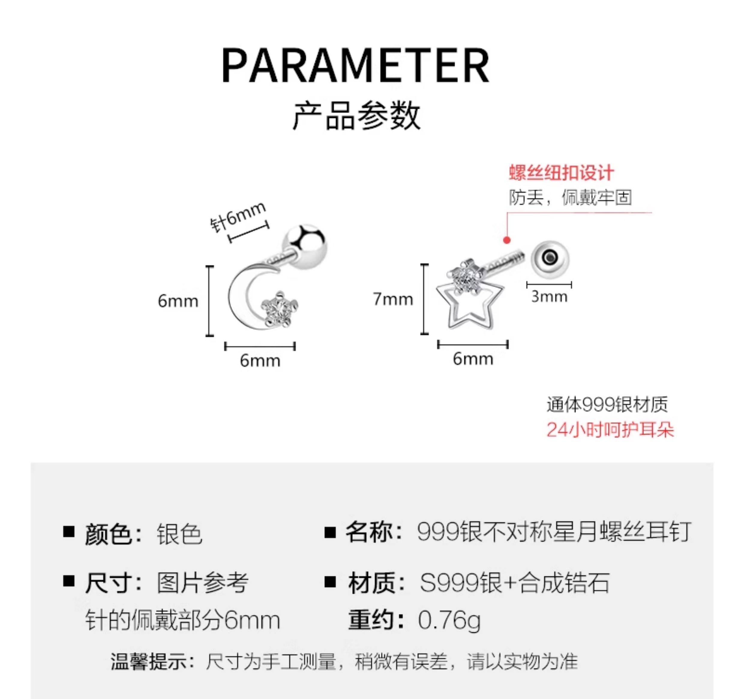 S999 Pure Silver Asymmetrical Star and Moon Screw Earrings for Women, Niche Design, Twist-Lock, Children's Ear Piercing, No Need to Remove Ear Bone Studs