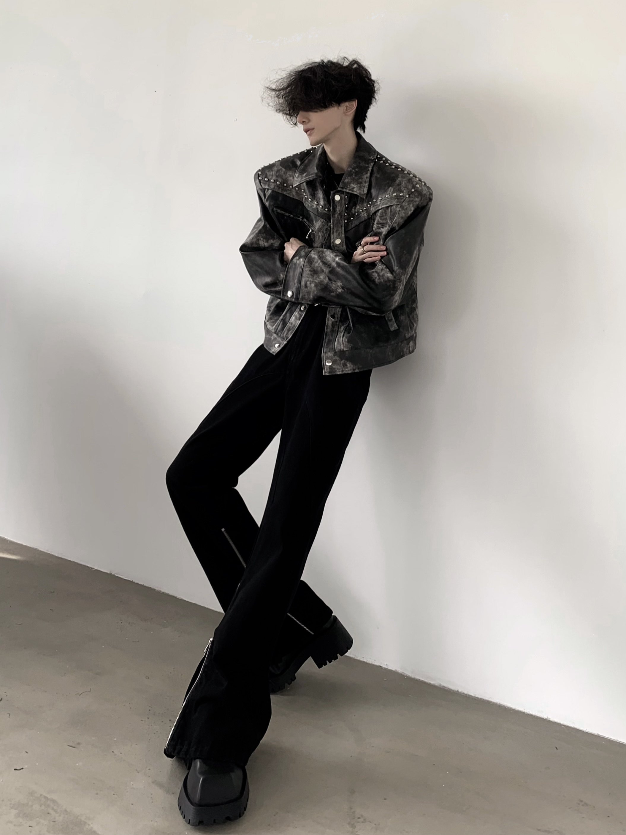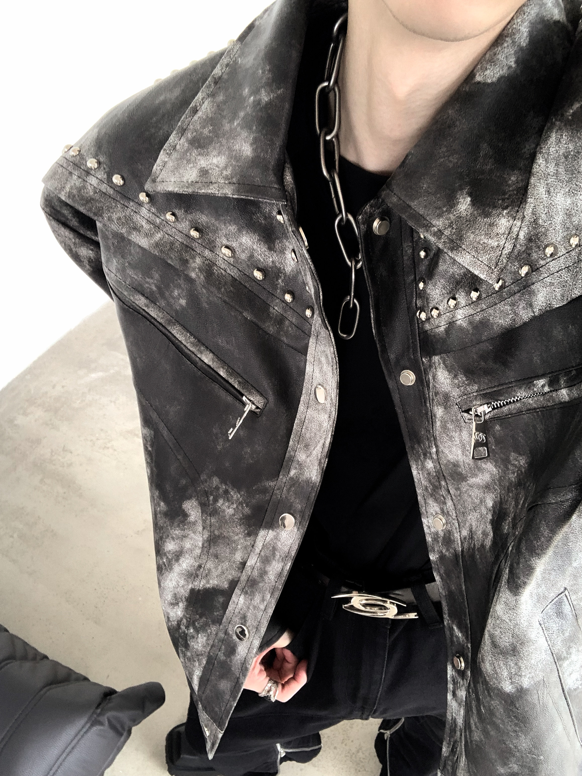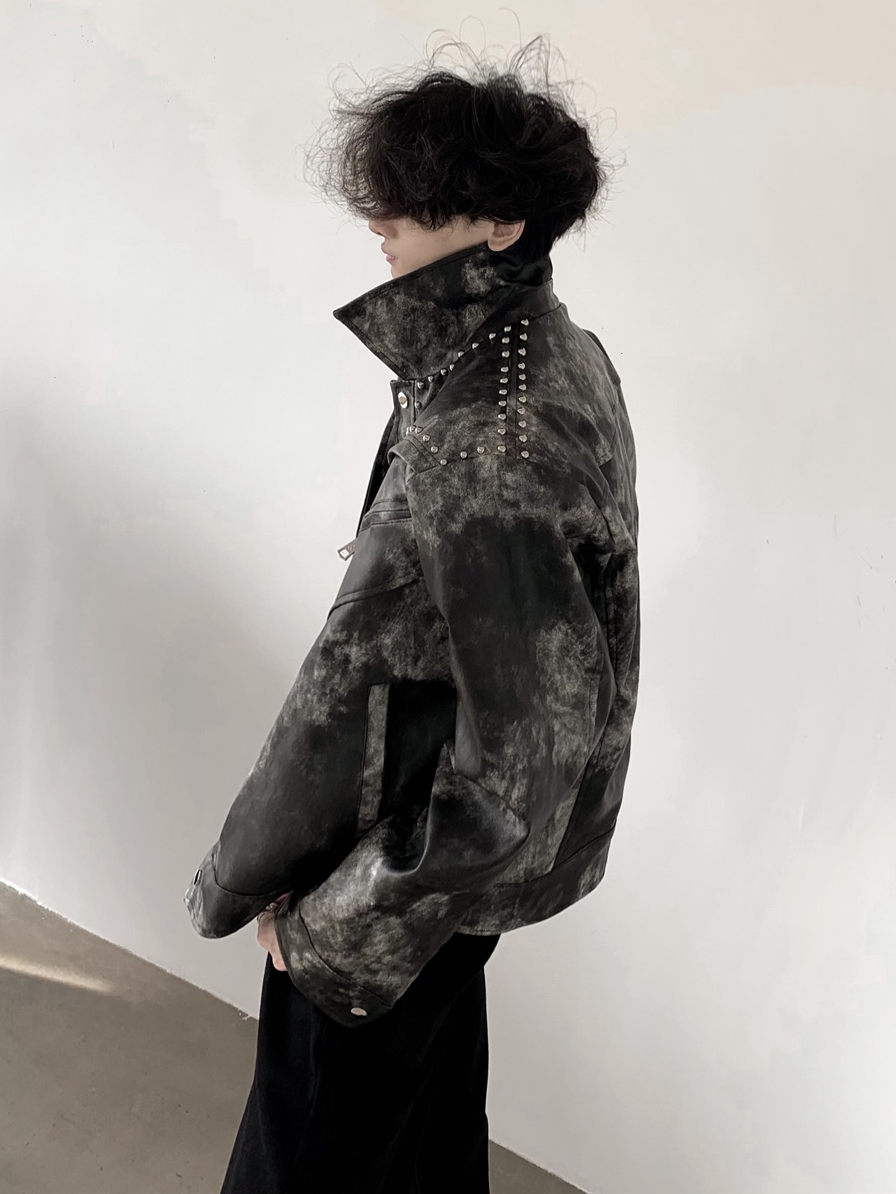 Autumn Mountain Style/Unique Punk Rivet Design Motorcycle Leather Jacket for Men, American Retro Distressed Padded Shoulder Jacket
