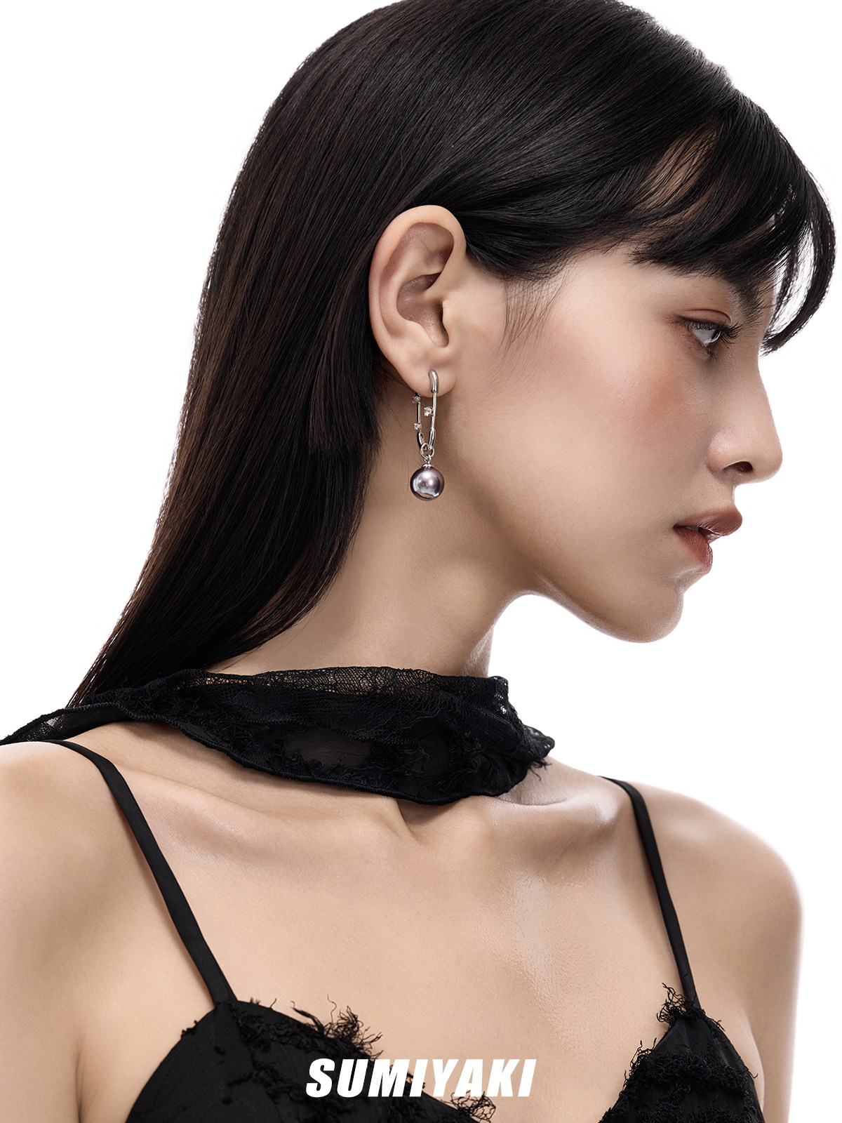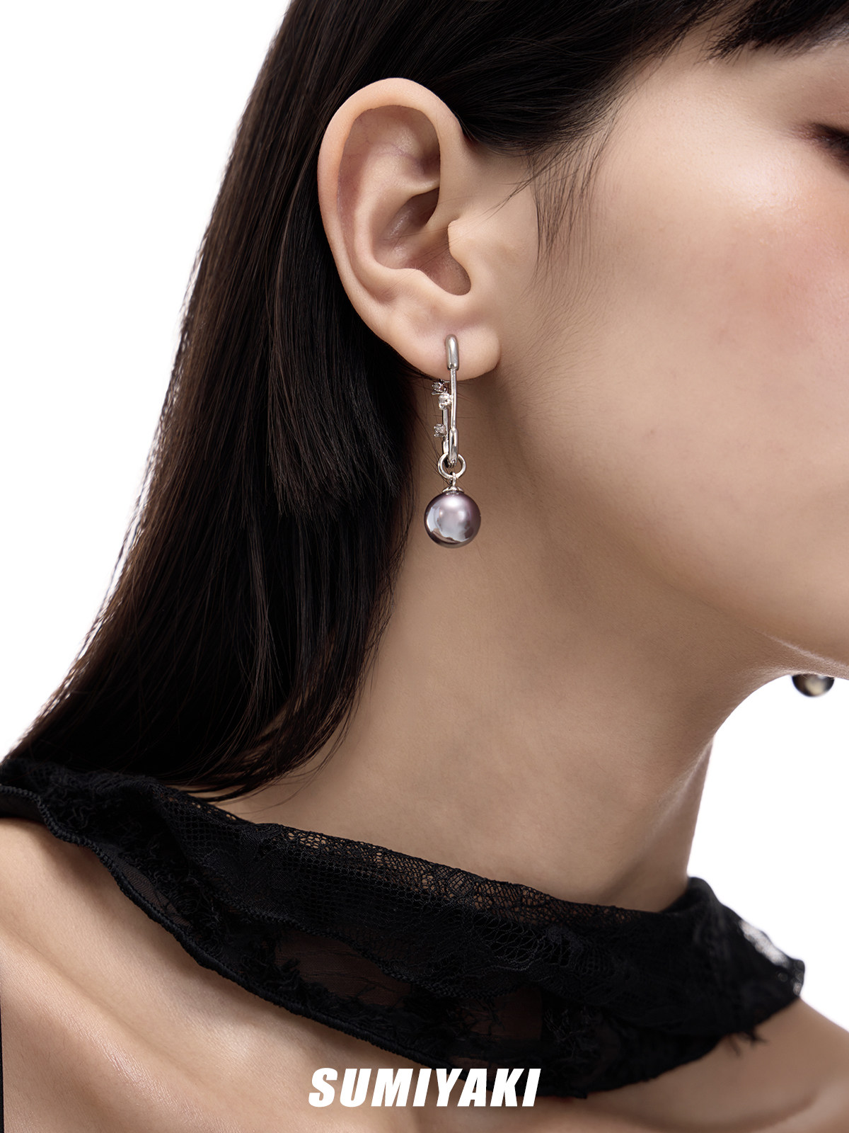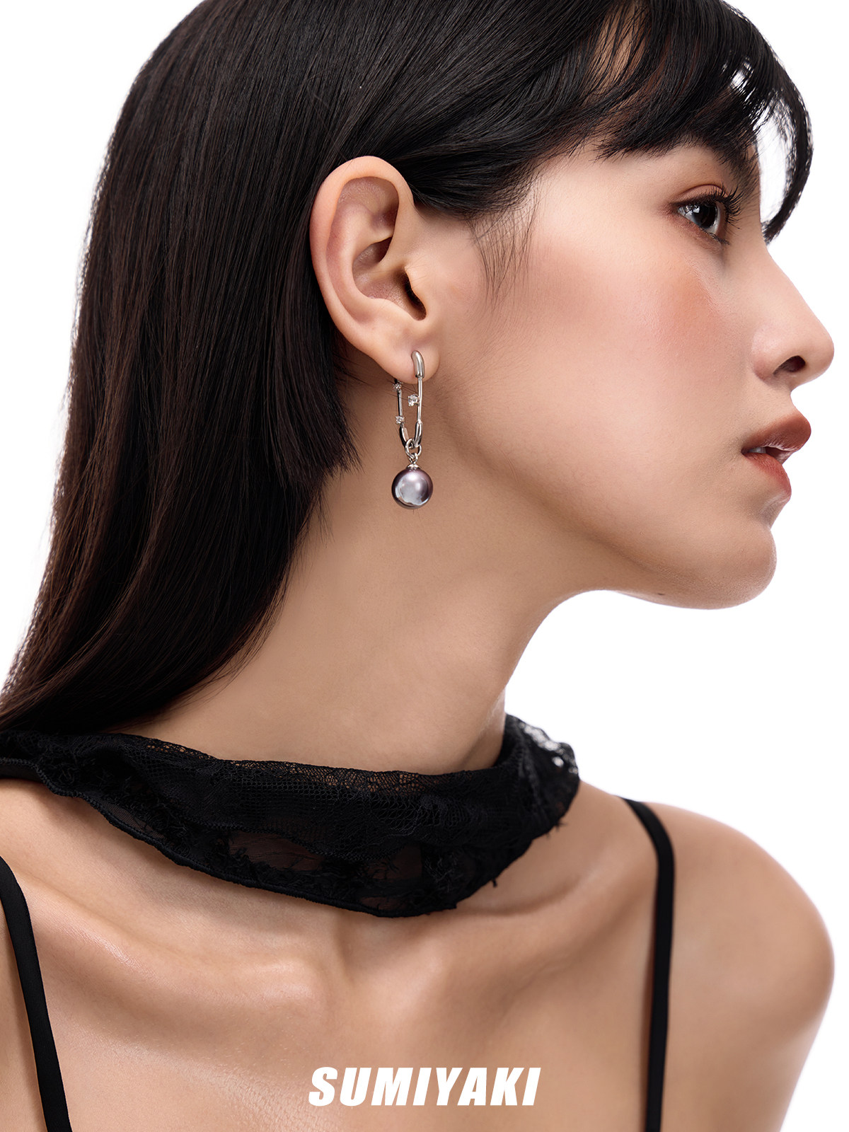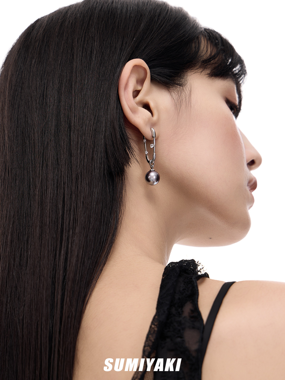 Sumiyaki Diamond-Encrusted Paperclip Round Black Pearl Earrings, Ear Drops, Ear Studs