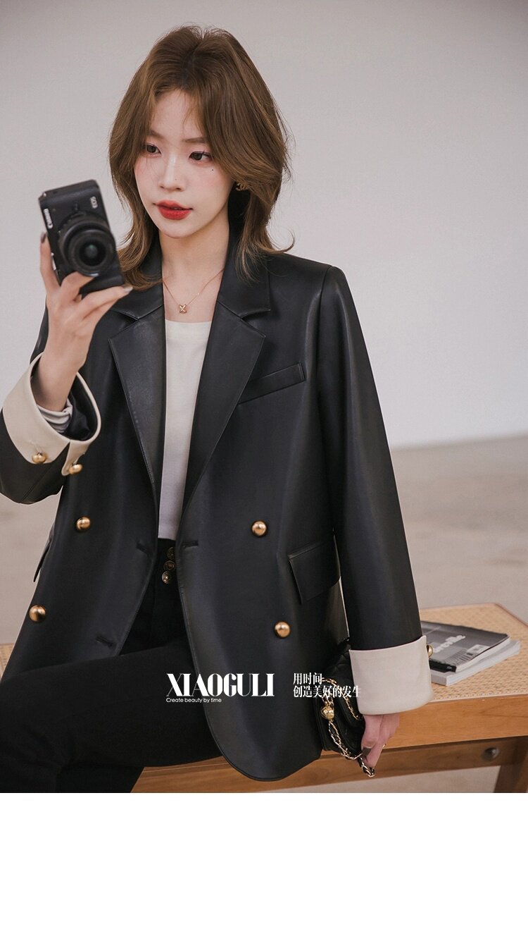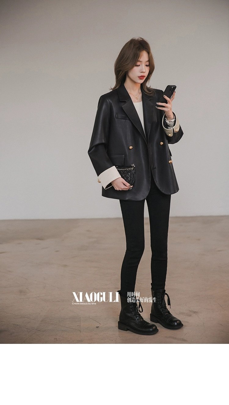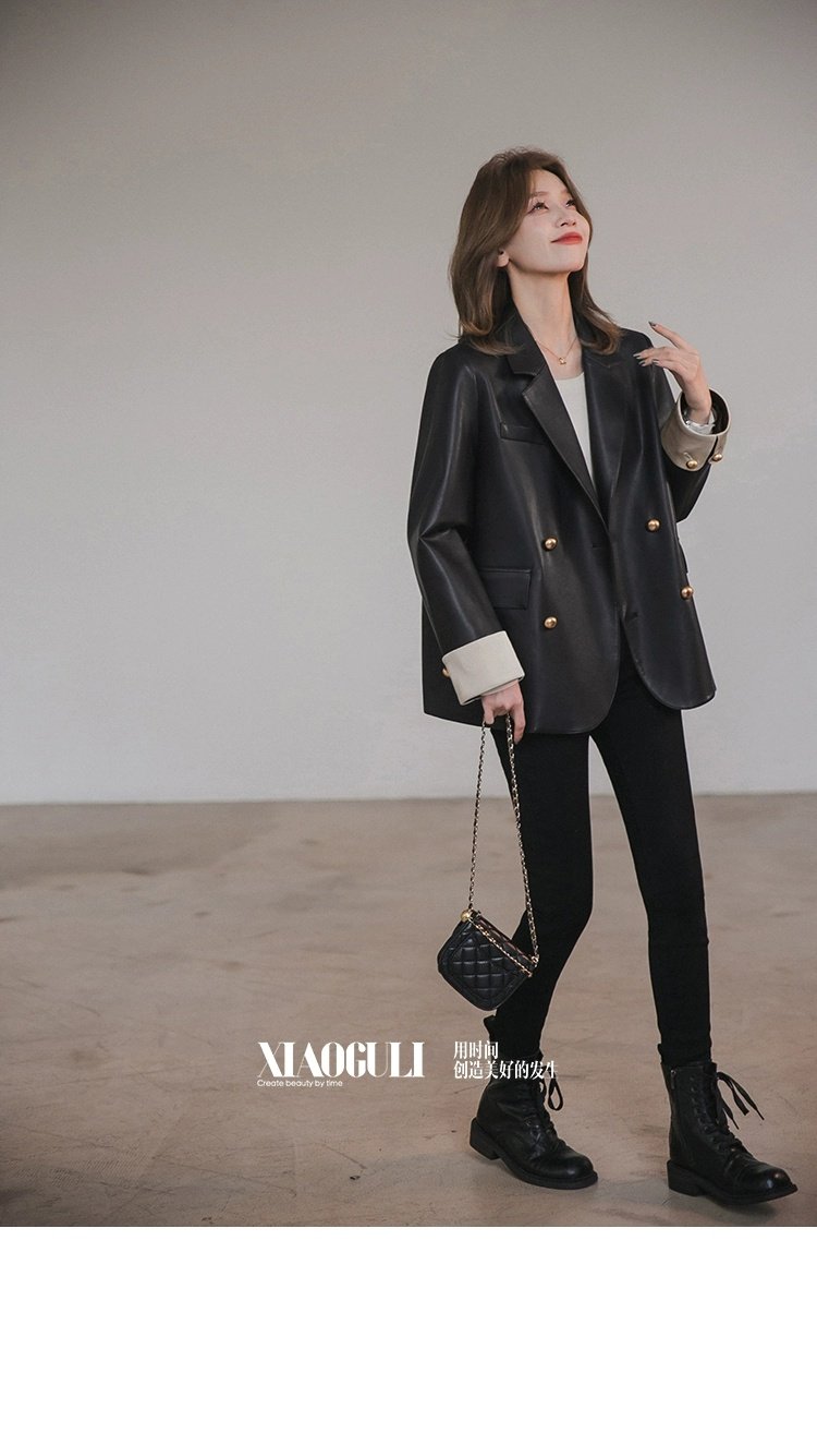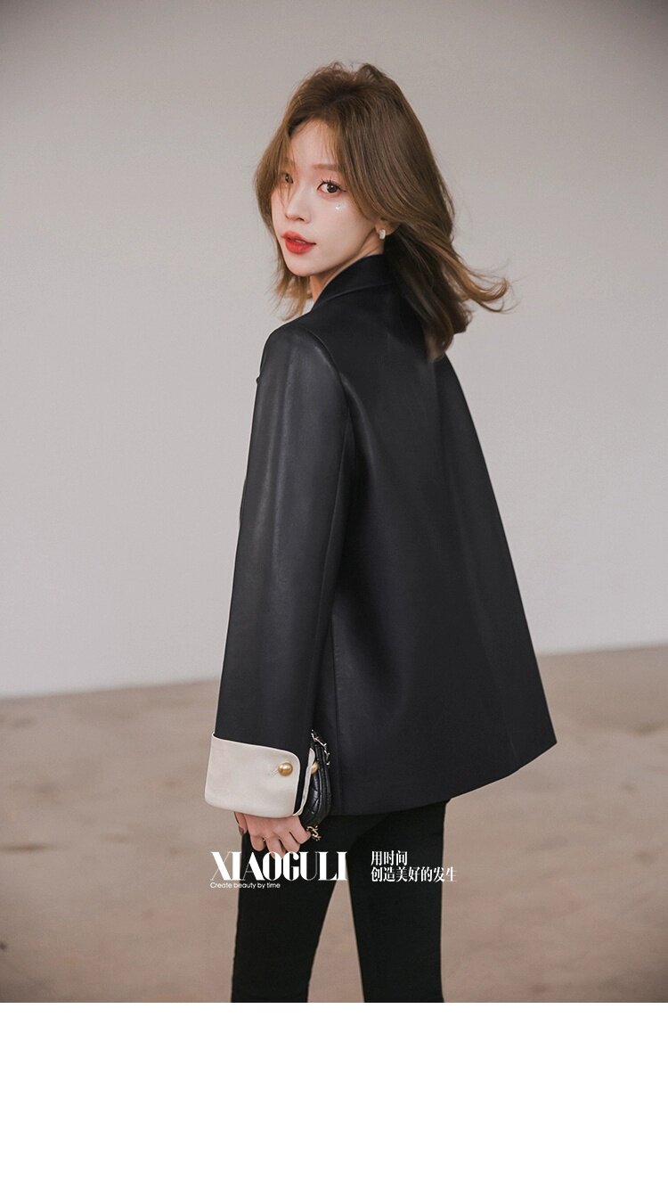Xiaoguli Rose Leather Jacket, High-End Black Pu Leather Jacket for Women, Autumn Korean Style Design, Color-Blocked Suit