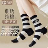 条纹袜子女春秋季中筒袜纯棉底吸汗抑菌防臭ins潮韩版刺绣长袜夏