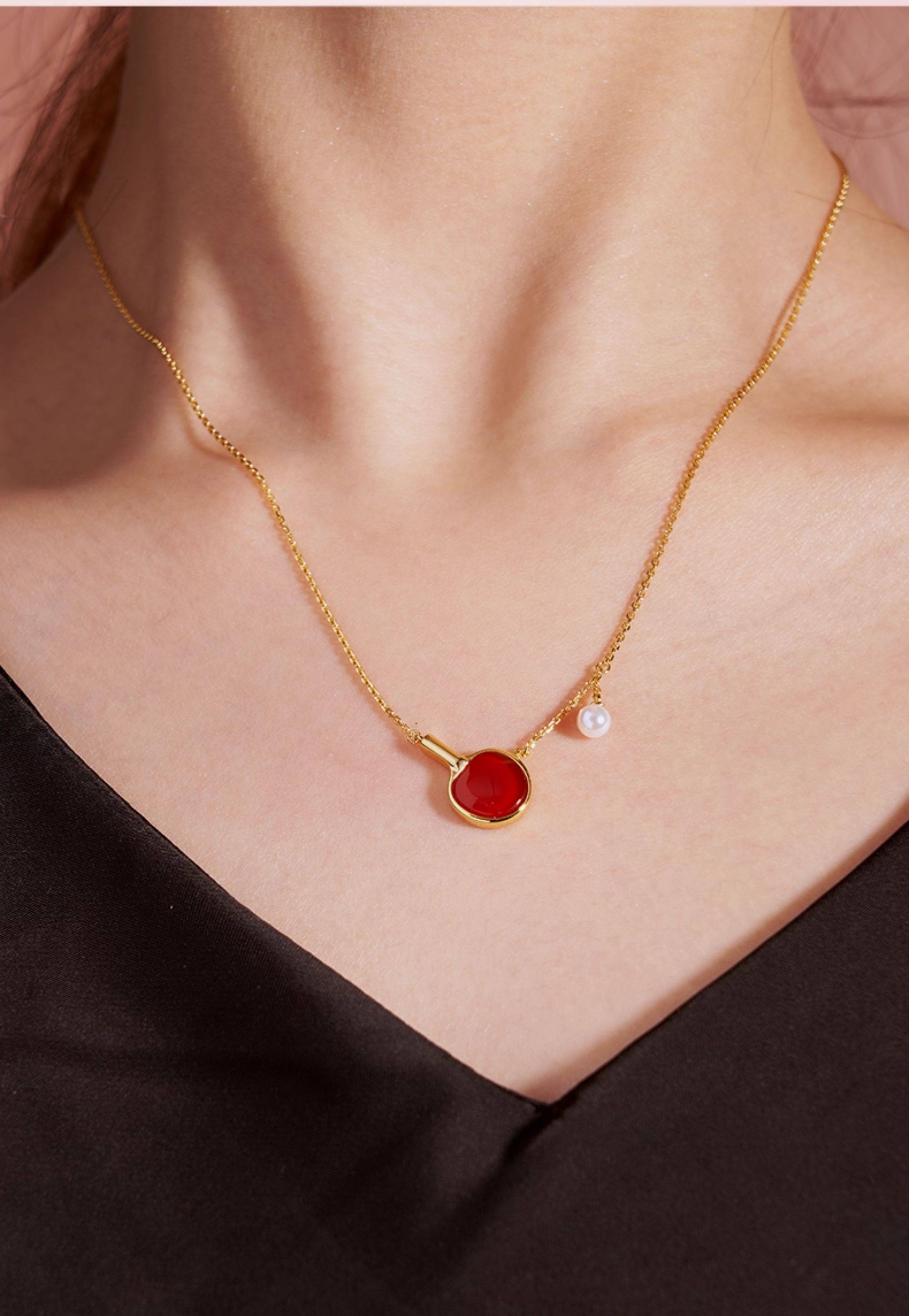Red Chalcedony Ping Pong Ball Necklace for Women, Light and Niche Design Pendant Gift, High-End Accessory Jewelry