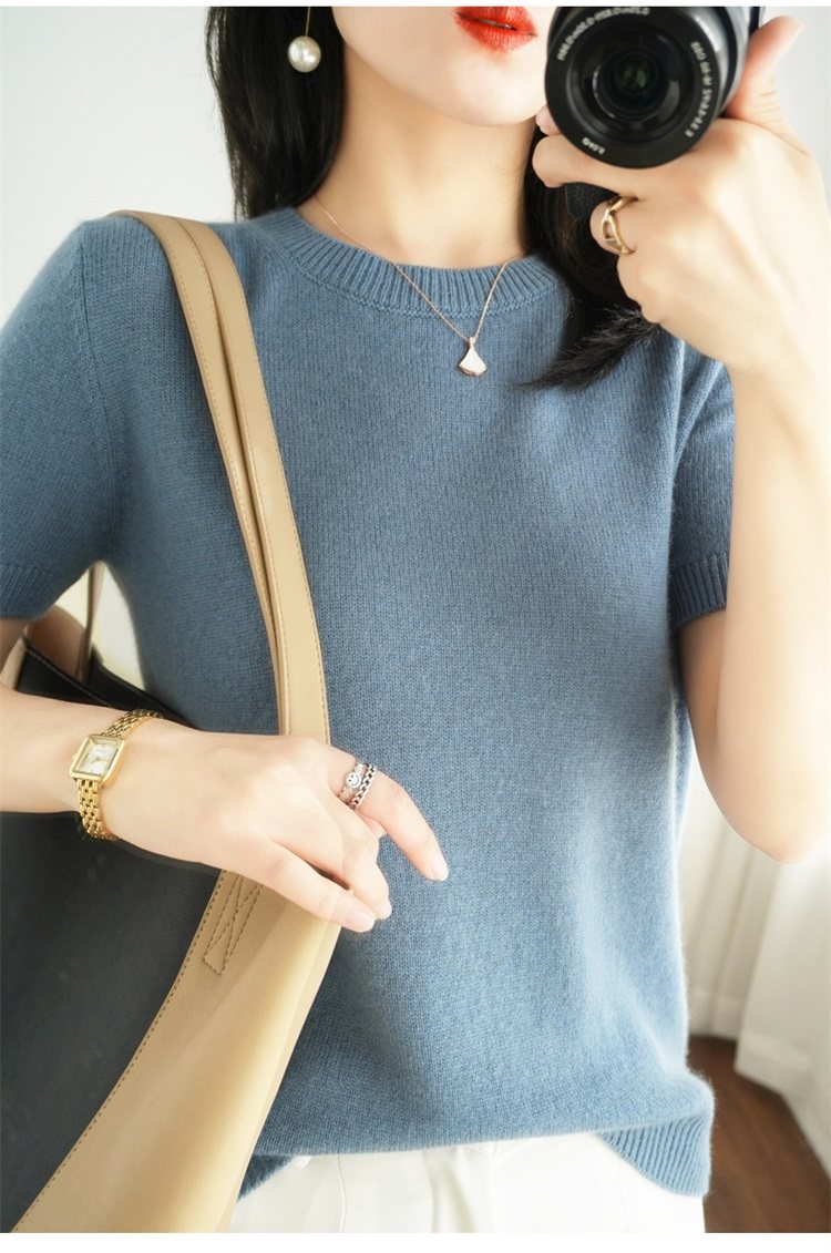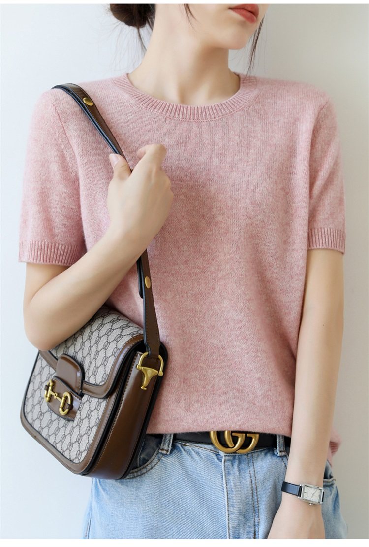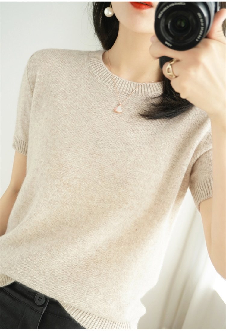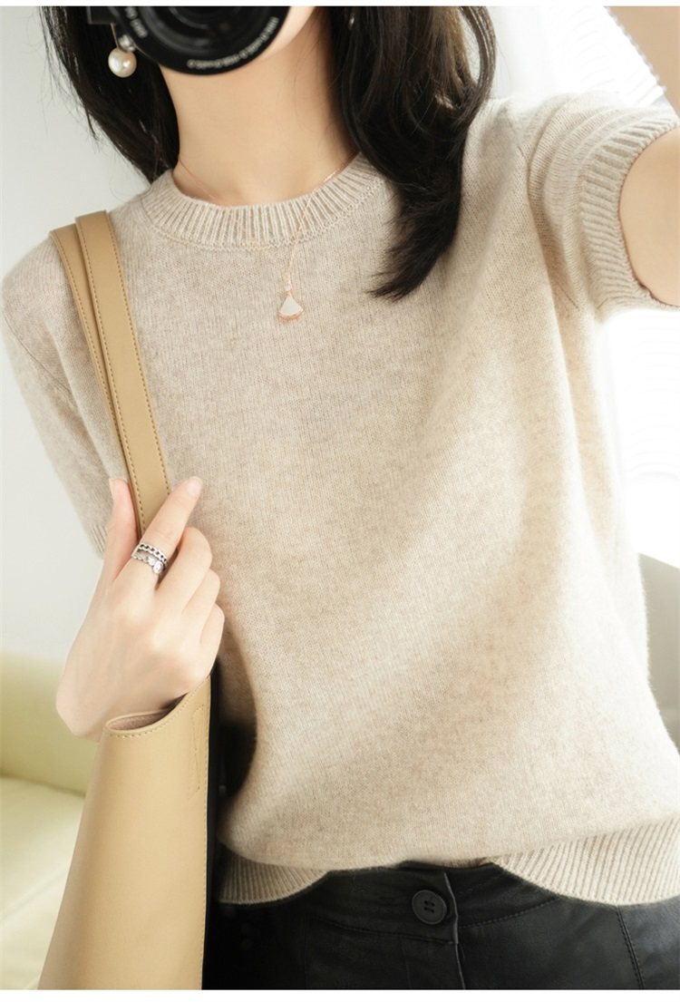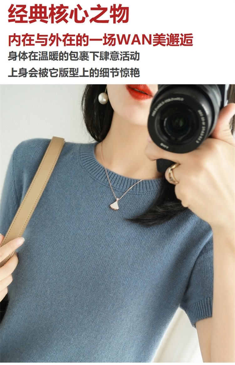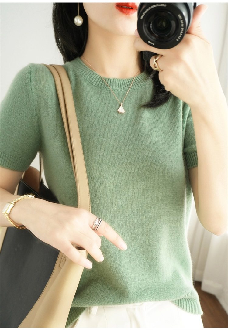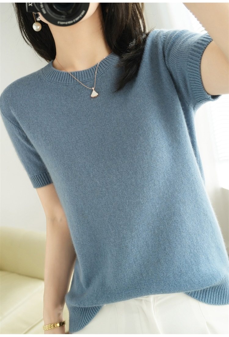 Thin Wool Knitted Short-Sleeved T-Shirt for Women 23 Summer New Style Round Neck Loose Short Cashmere Half-Sleeved Top for Outer Wear