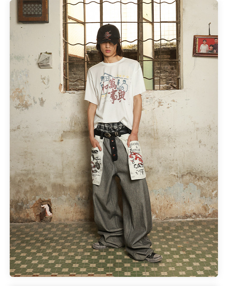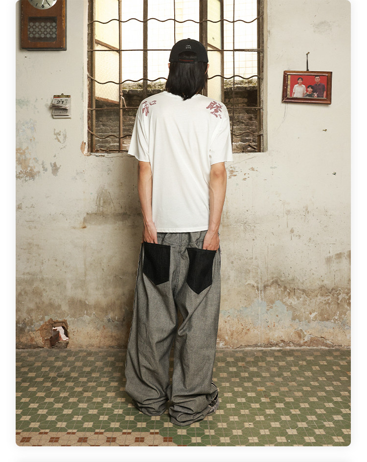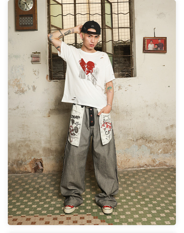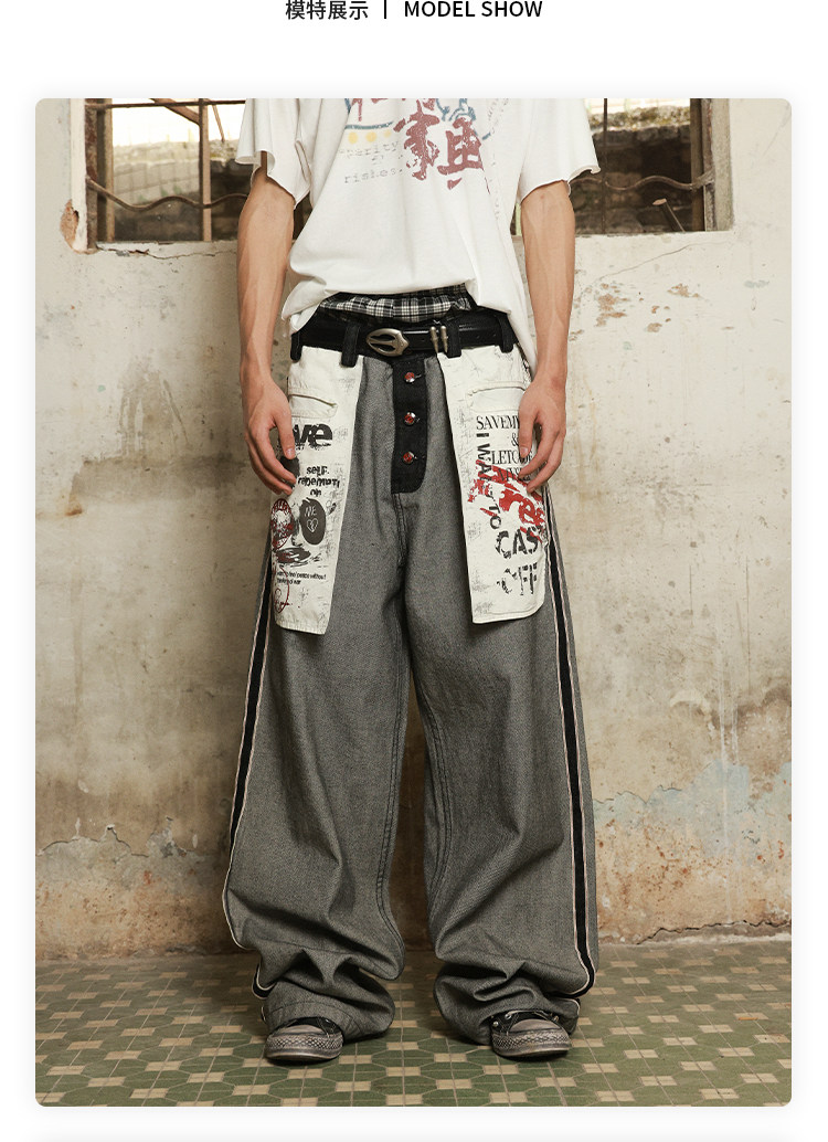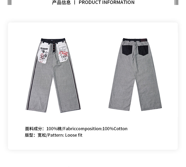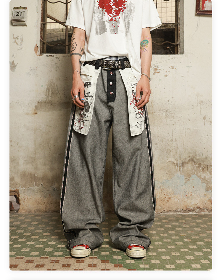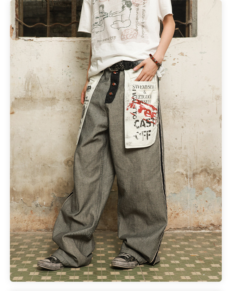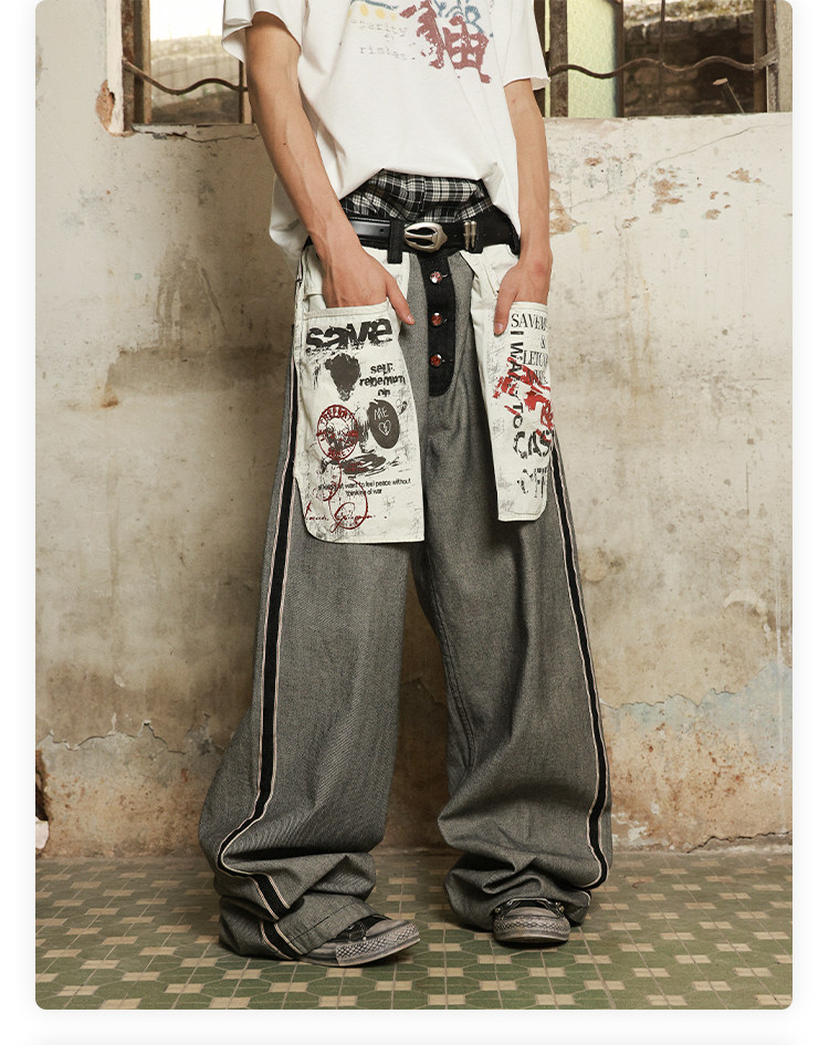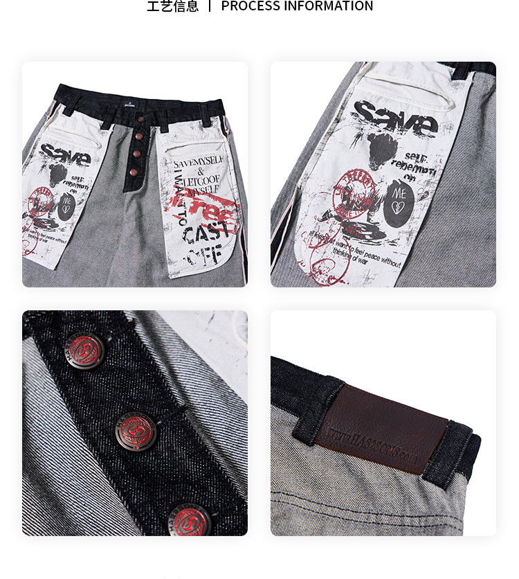 Has2Sons Red-Edged Raw Denim Reverse-Washed Large Pocket Theme Print A-Line Straight-Leg Jeans