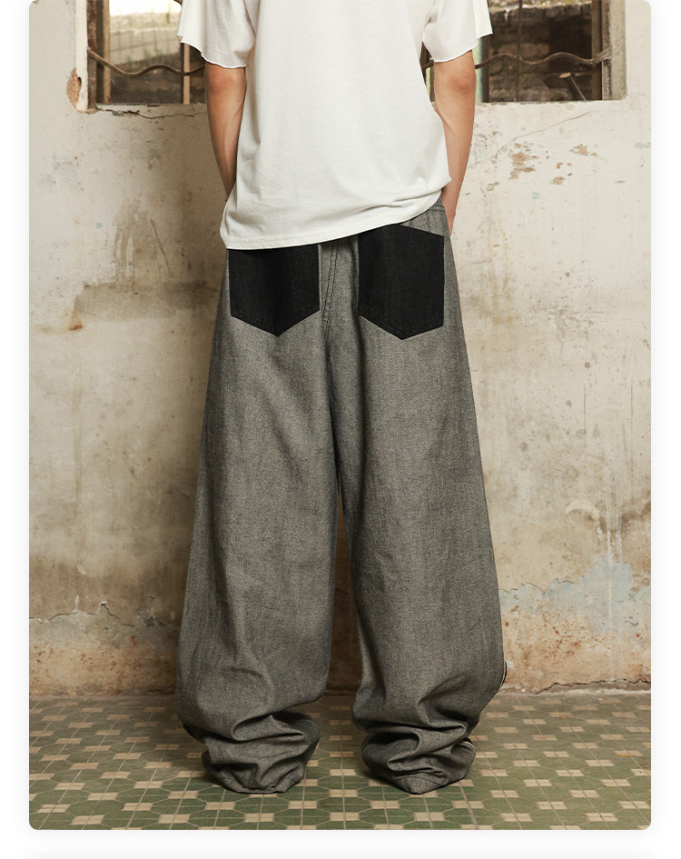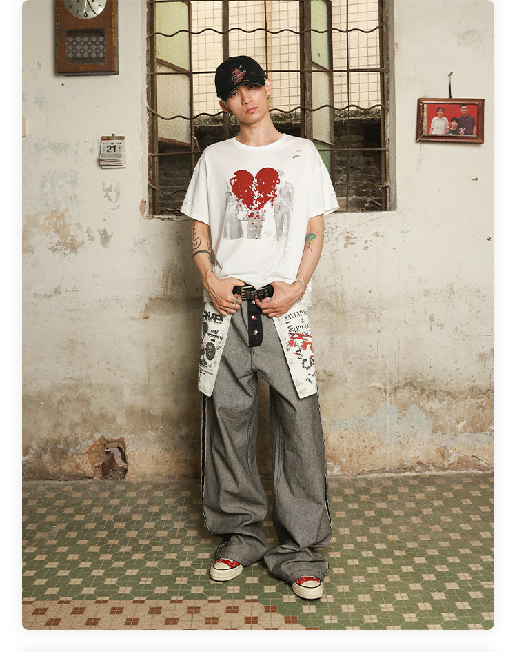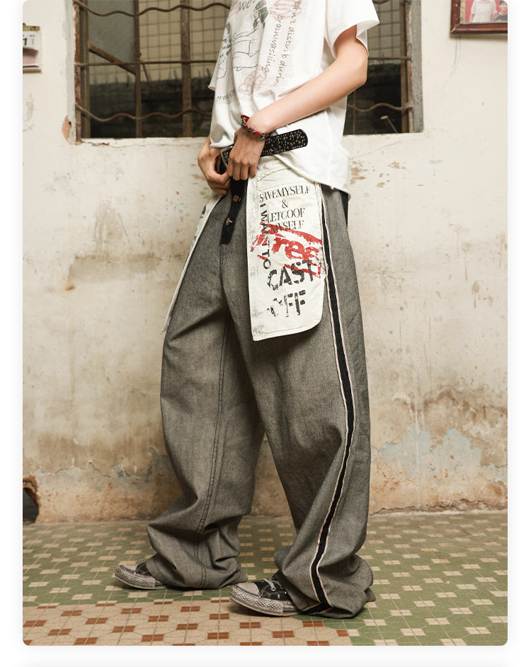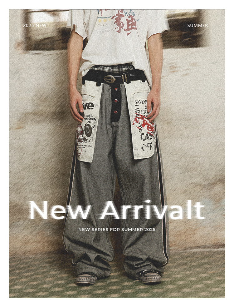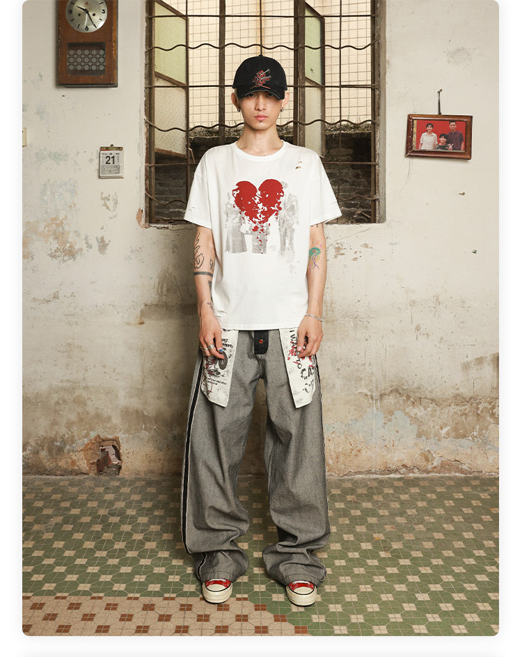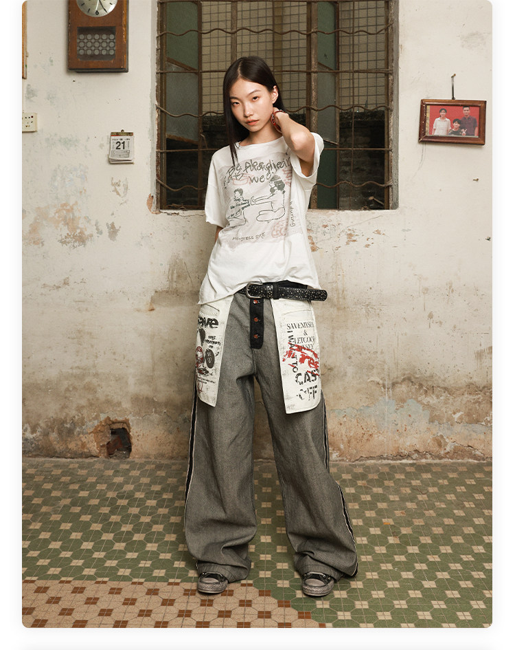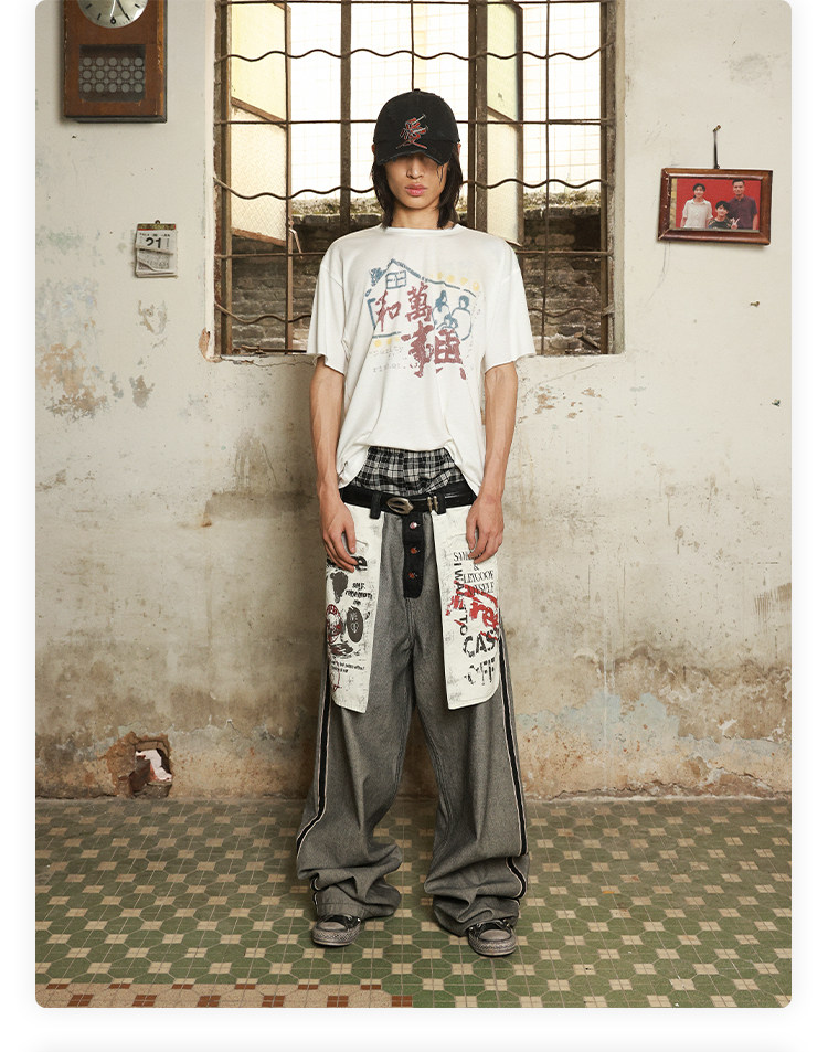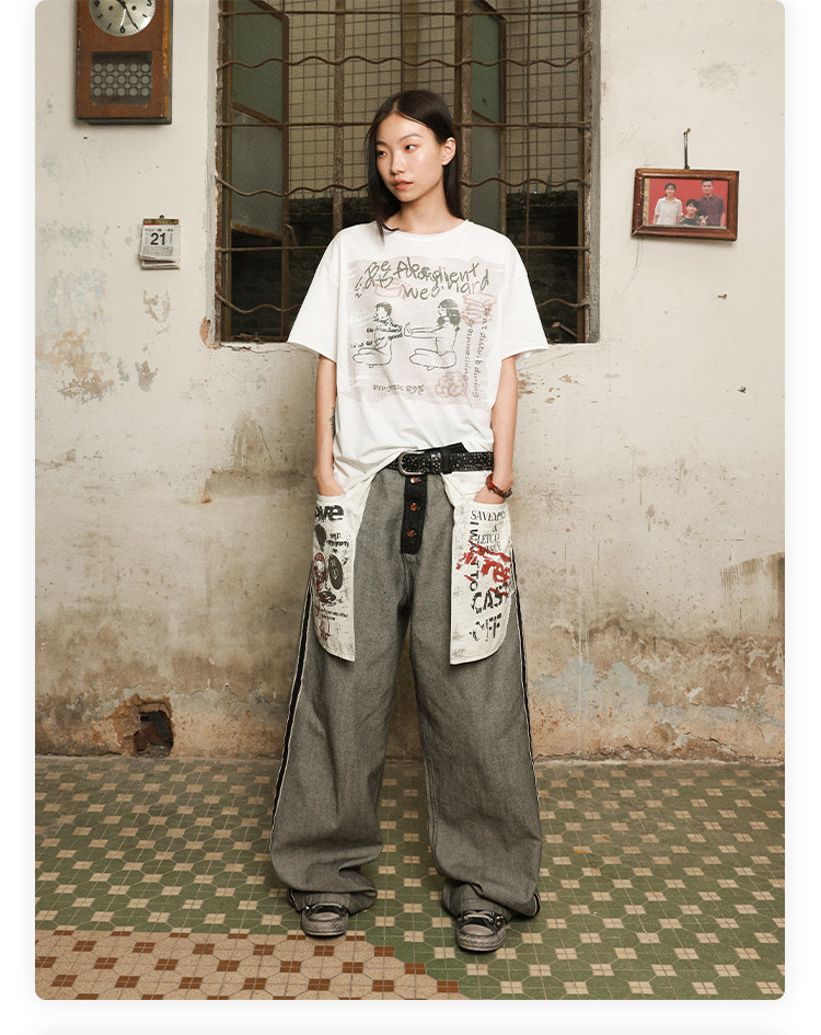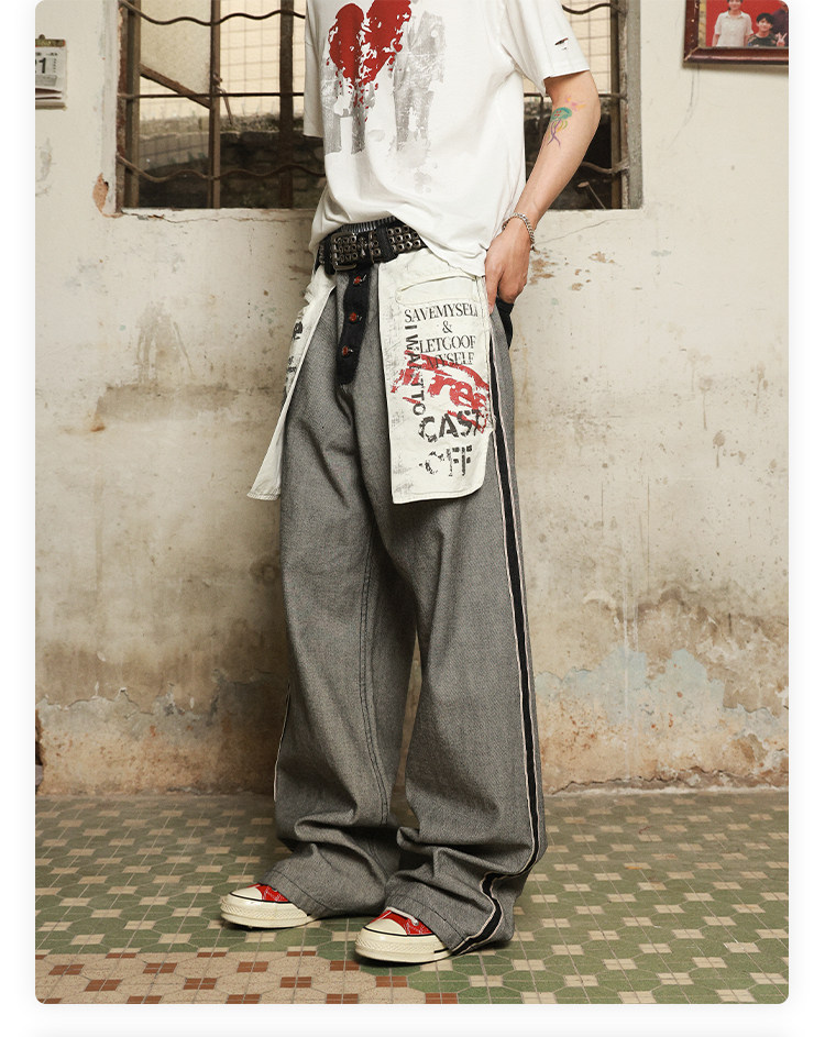 Has2Sons Red-Edged Raw Denim Reverse-Washed Large Pocket Theme Print A-Line Straight-Leg Jeans