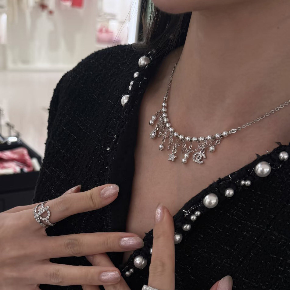 High-End 26C New Three-In-One Silver Star Necklace, Vintage Five-Pointed Star Tassel Water Drop Diamond Pearl Choker