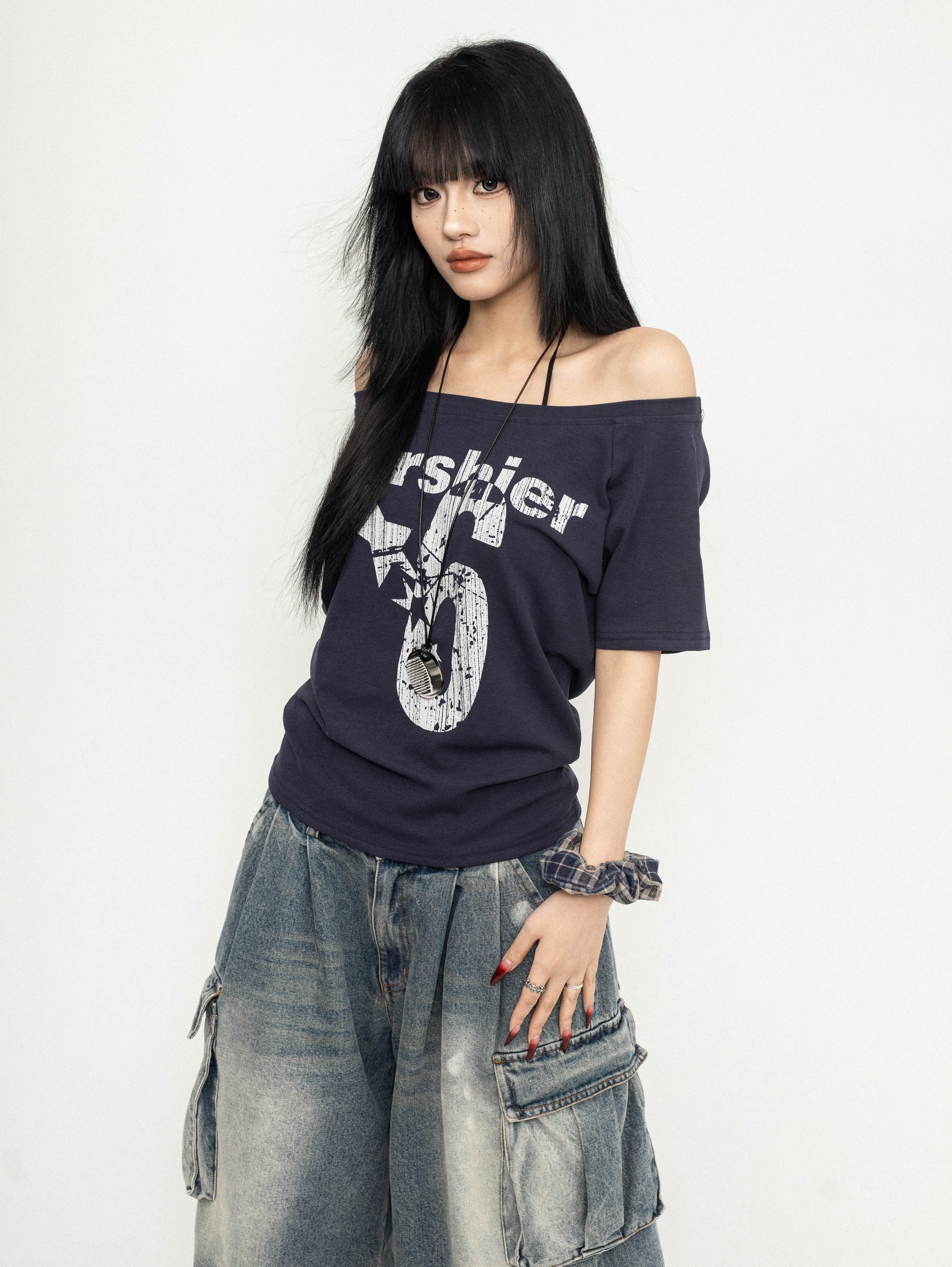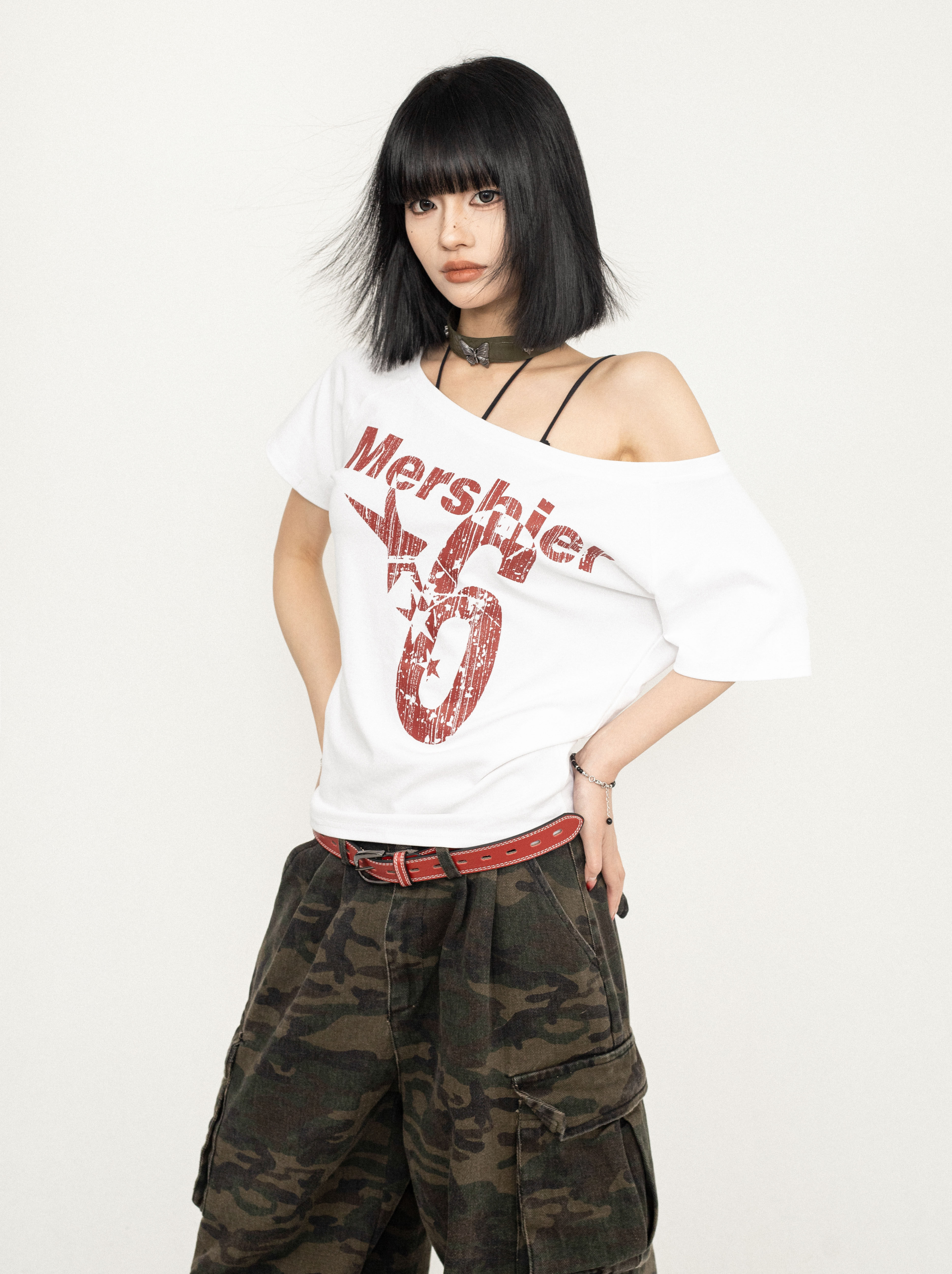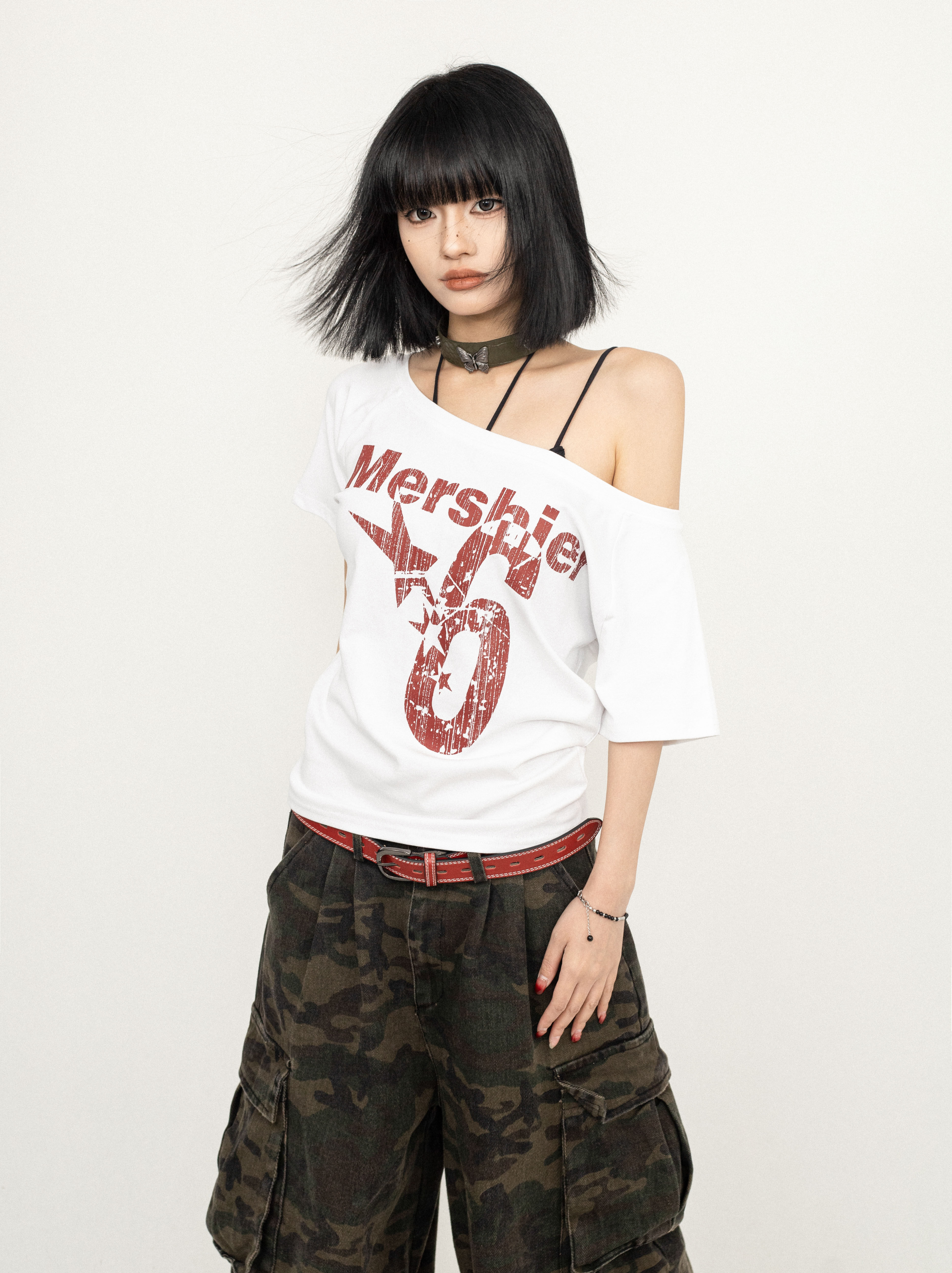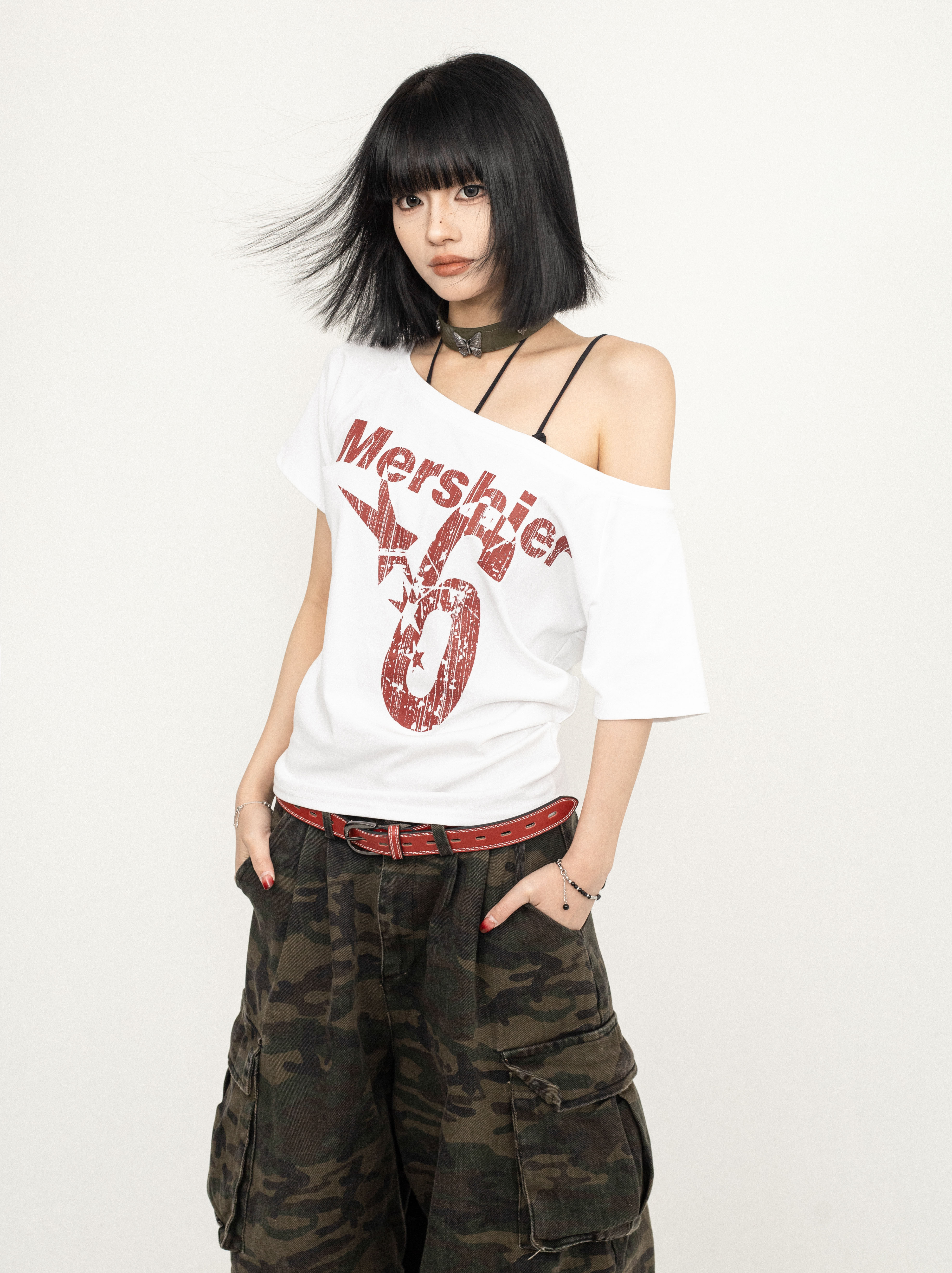 Octtflab/American Retro One-Shoulder Off-Shoulder Top Loose Sexy Short T-Shirt for Women 2025 New Short-Sleeve